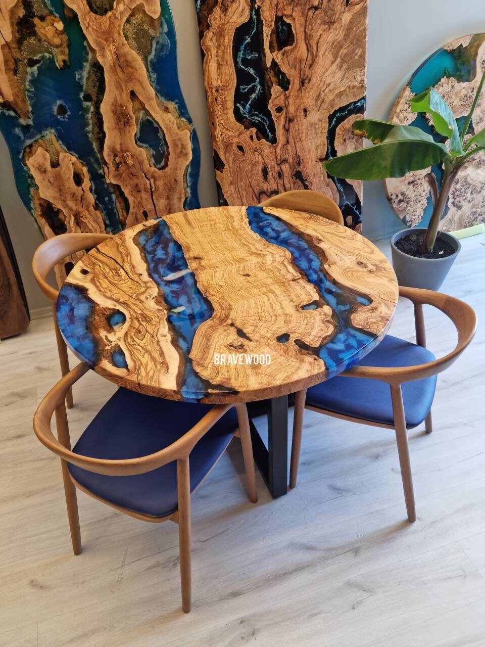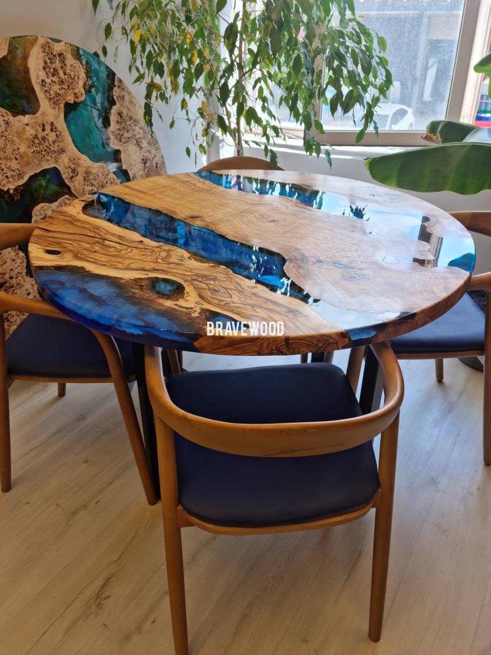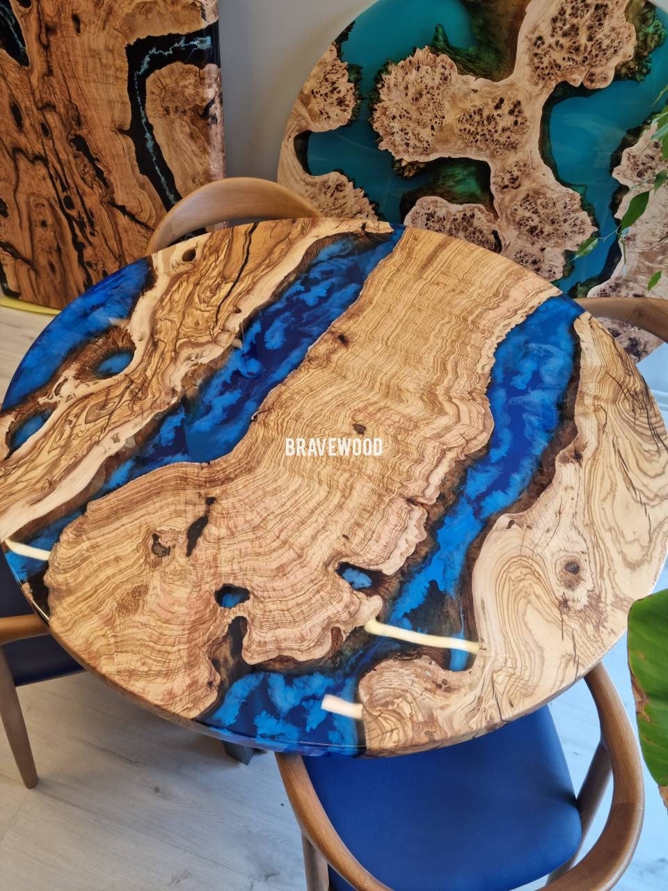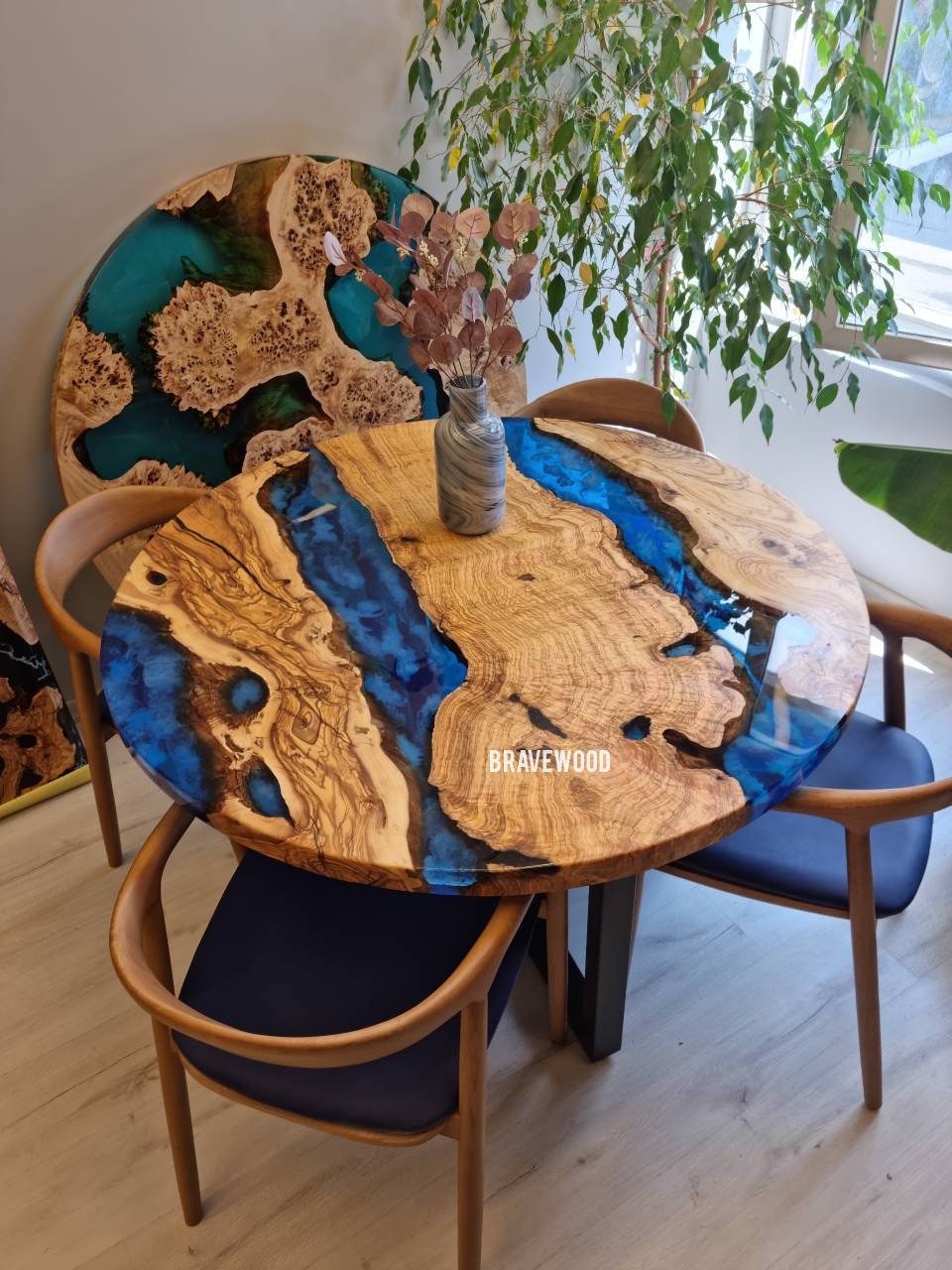 Custom round epoxy resin dining table was made of burl olive wood