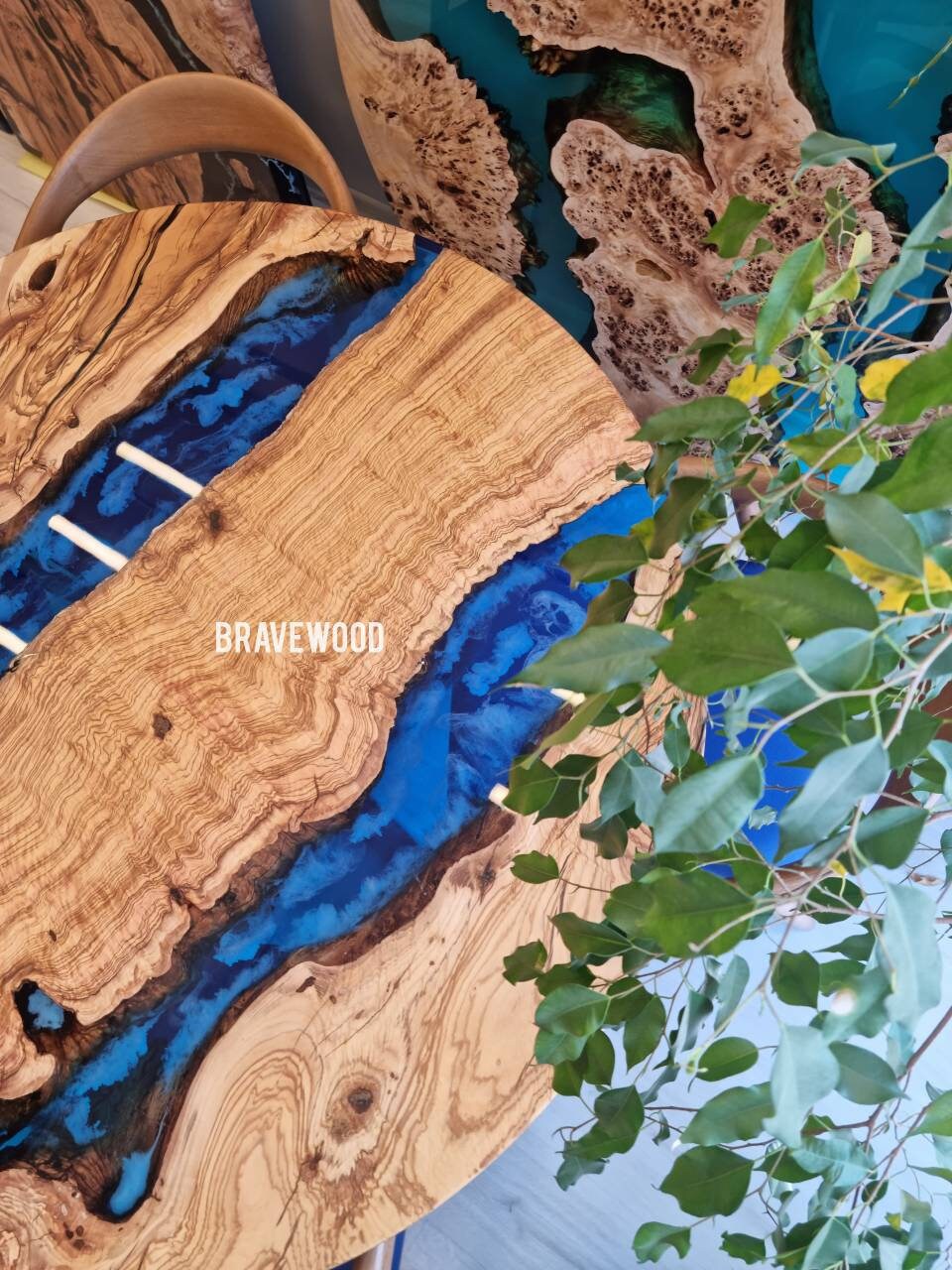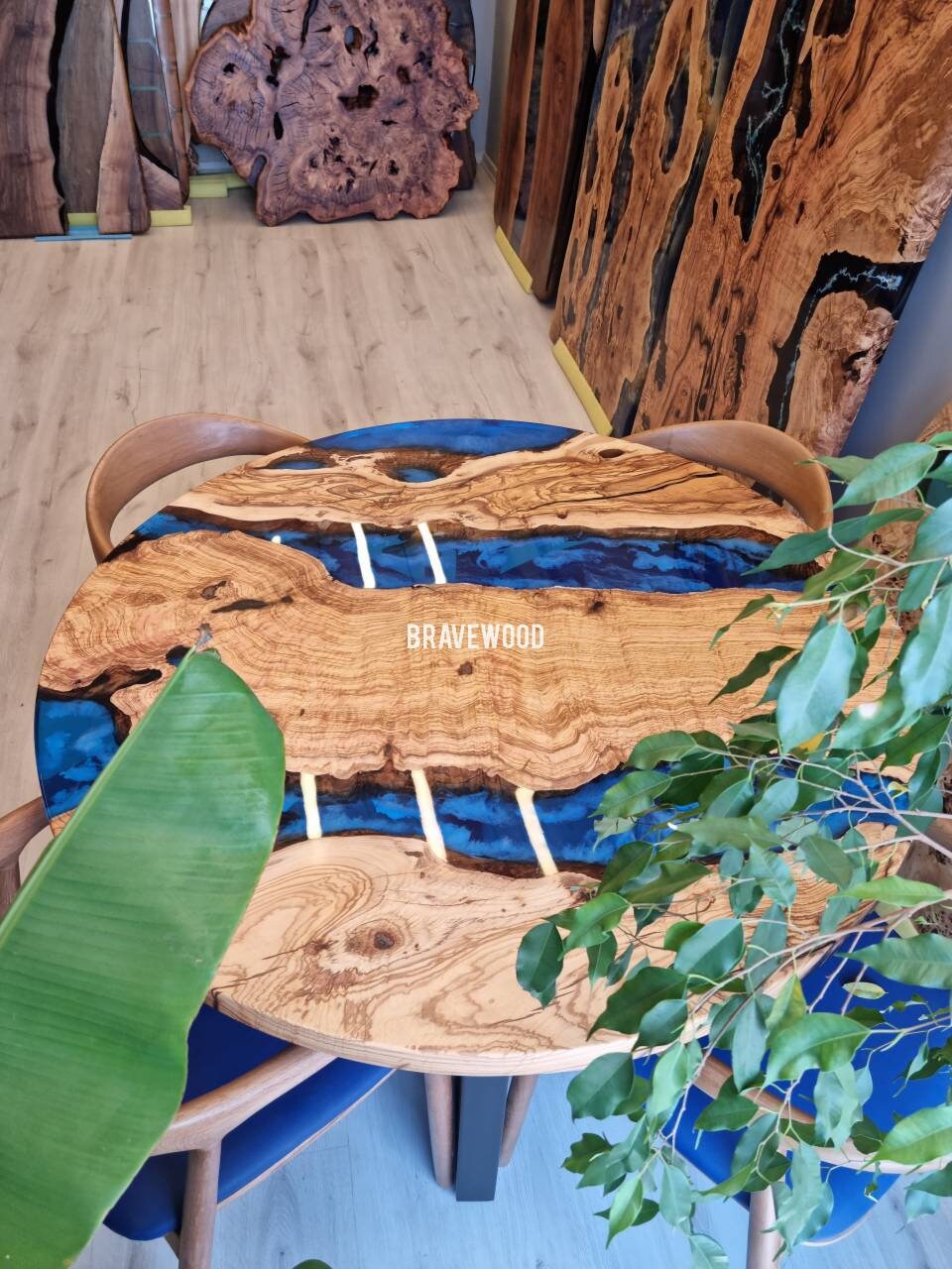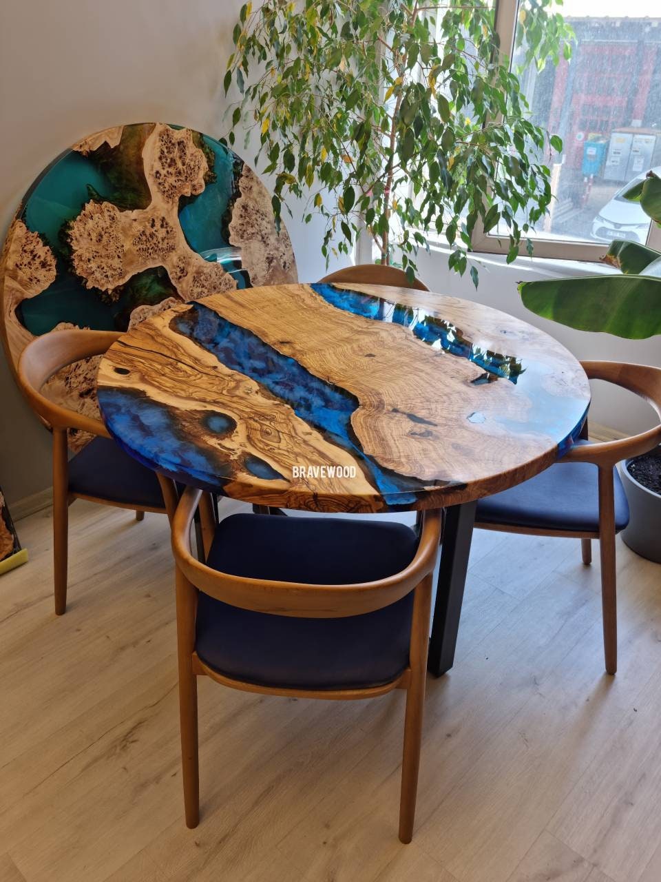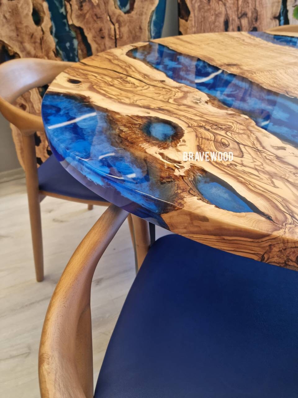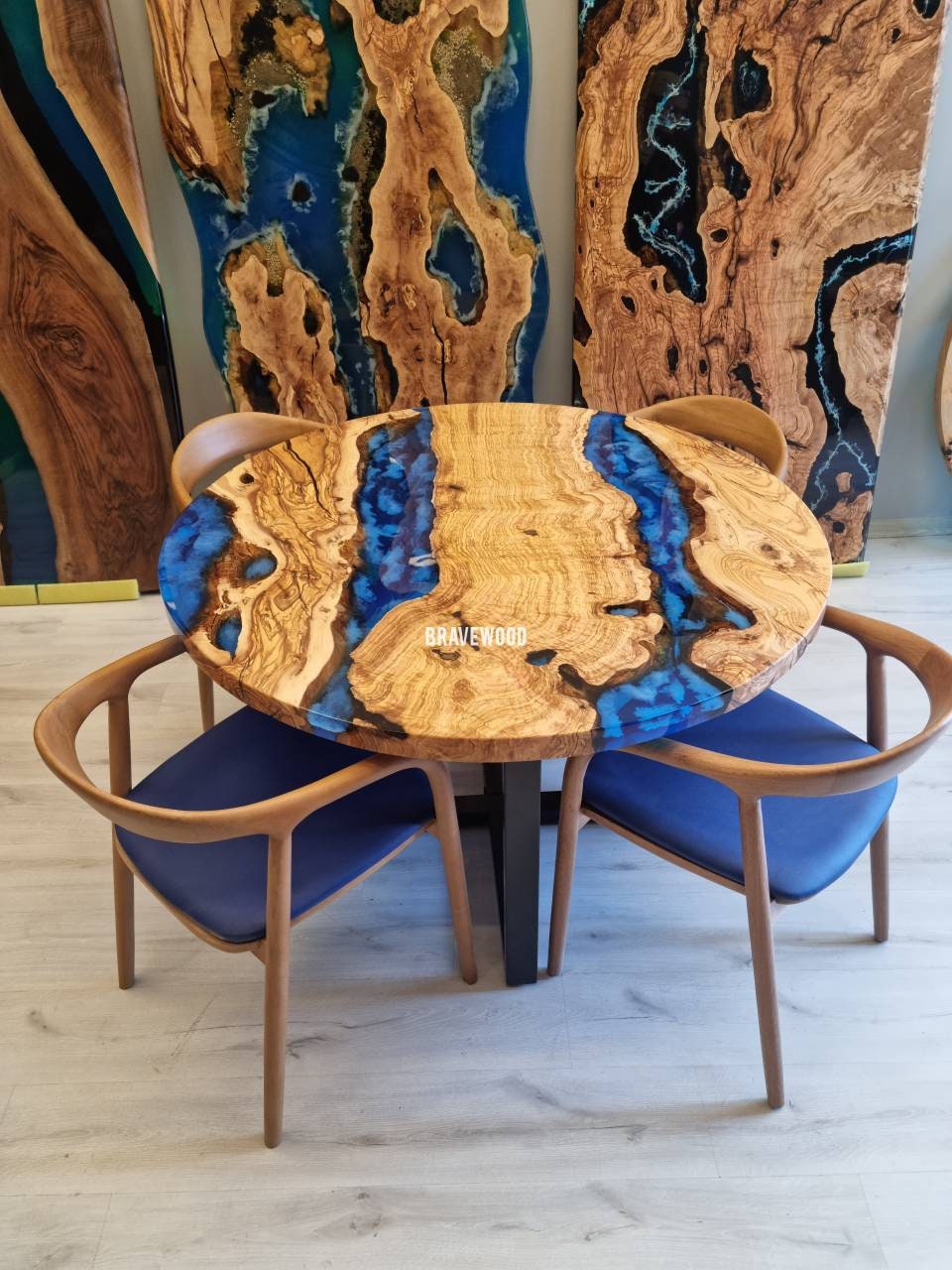 Custom round epoxy resin dining table was made of burl olive wood