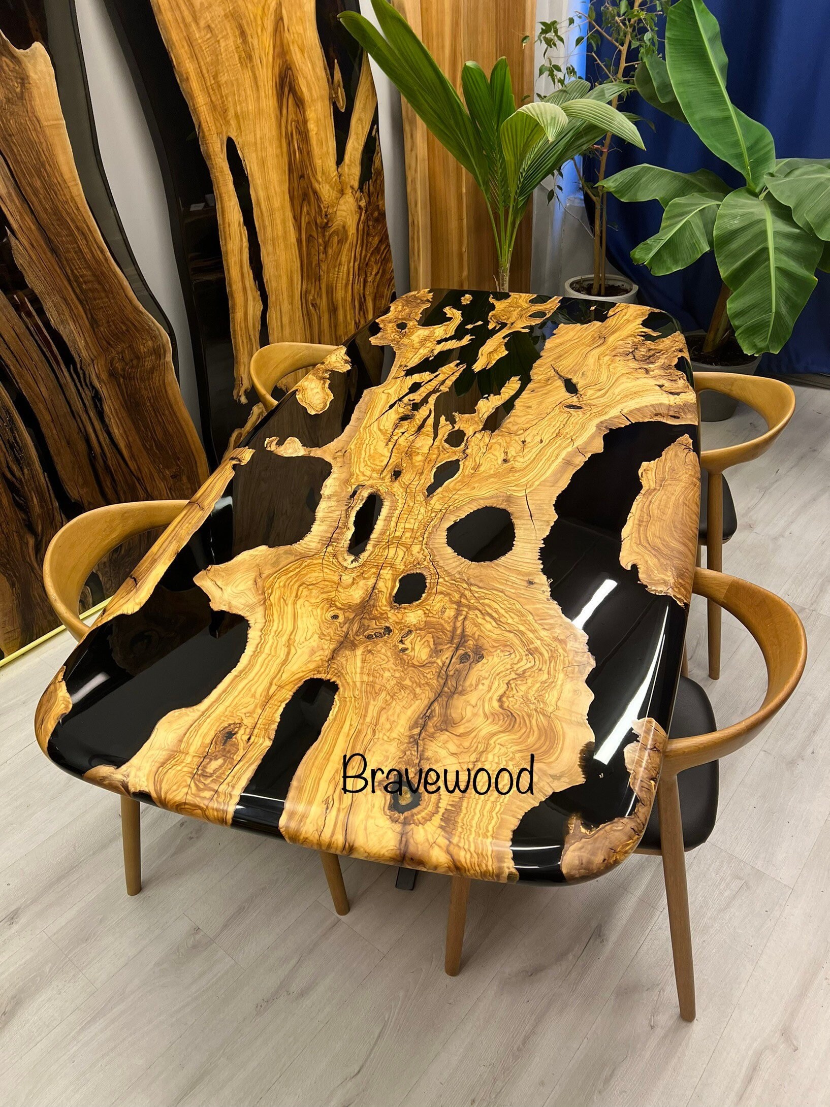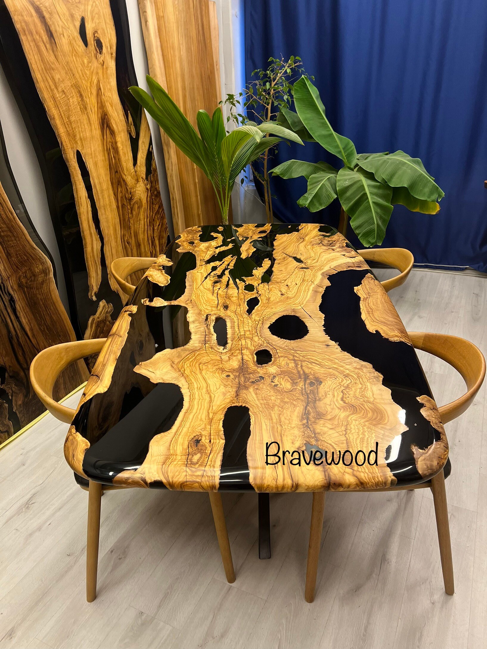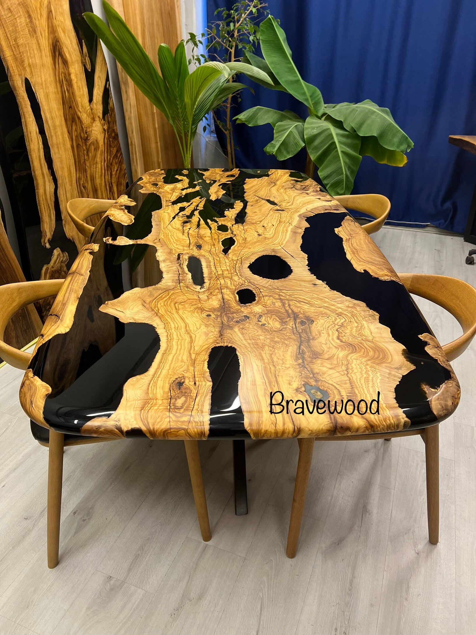 Olive Dining Table for your living room or kitchen. Custom made olive wood dining table with blue or green epoxy like river pattern. Unique, special design with soft edges and handmade production just for you, your home and your kitchen.