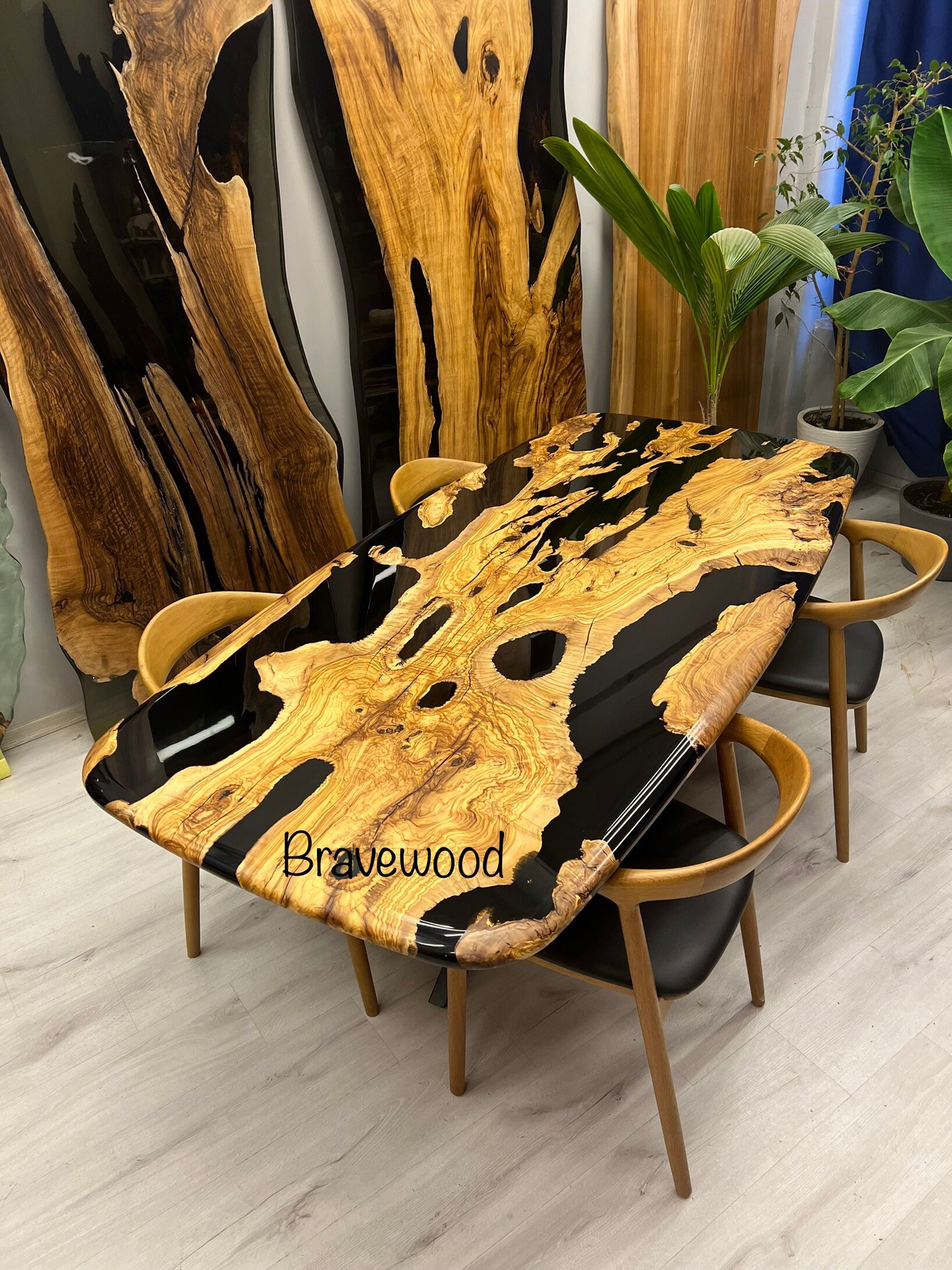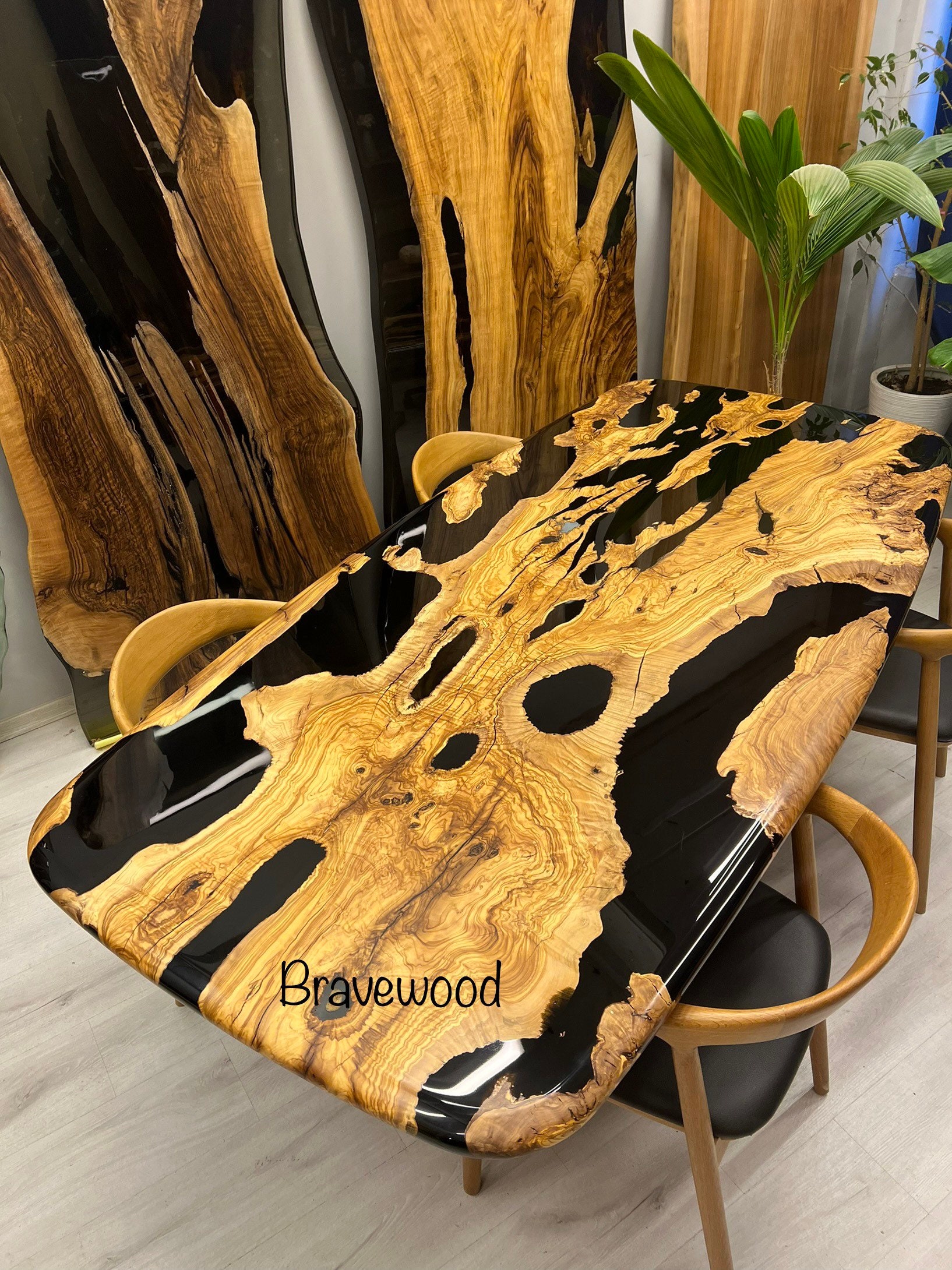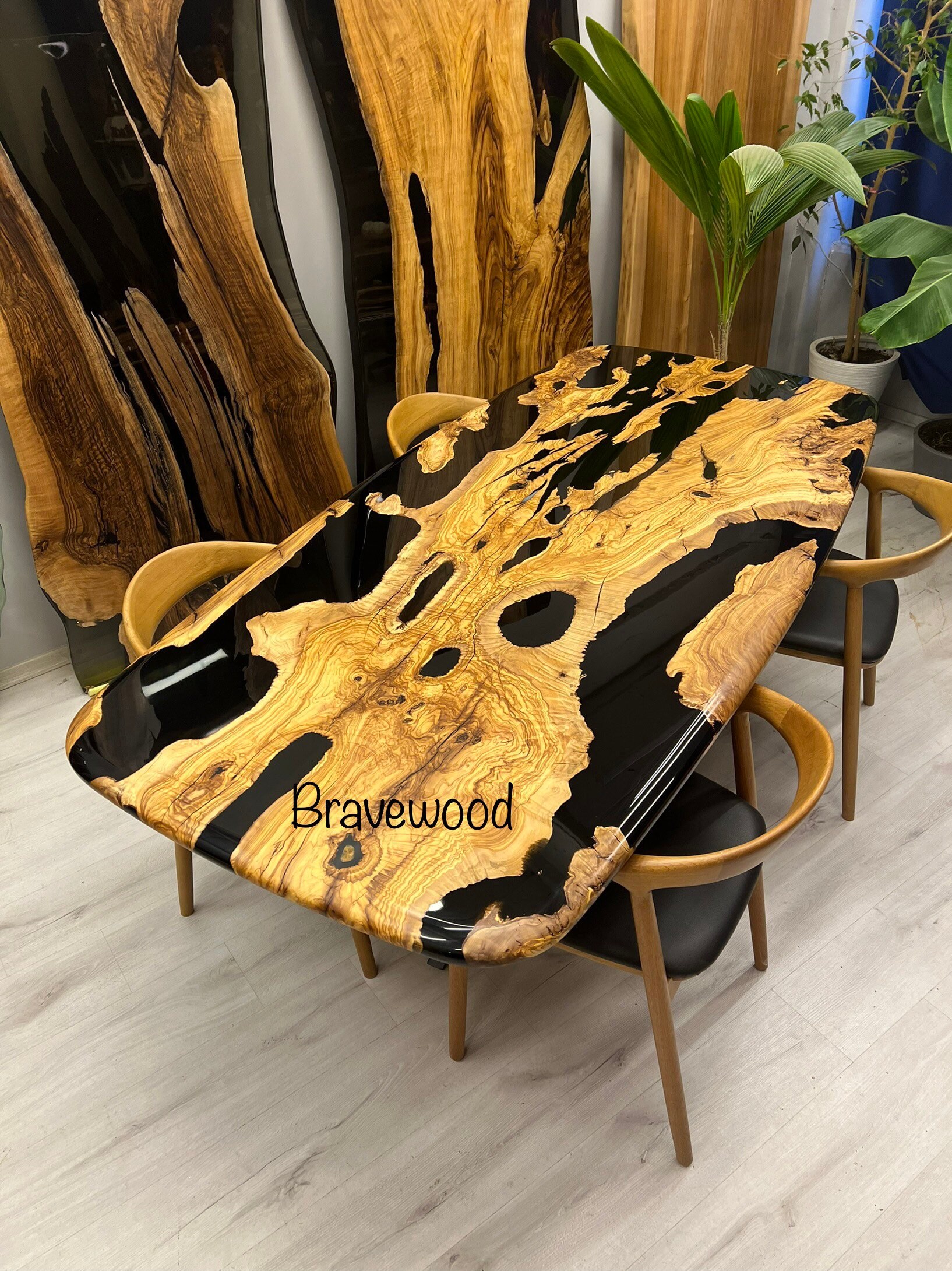 Olive Dining Table for your living room or kitchen. Custom made olive wood dining table with blue or green epoxy like river pattern. Unique, special design with soft edges and handmade production just for you, your home and your kitchen.