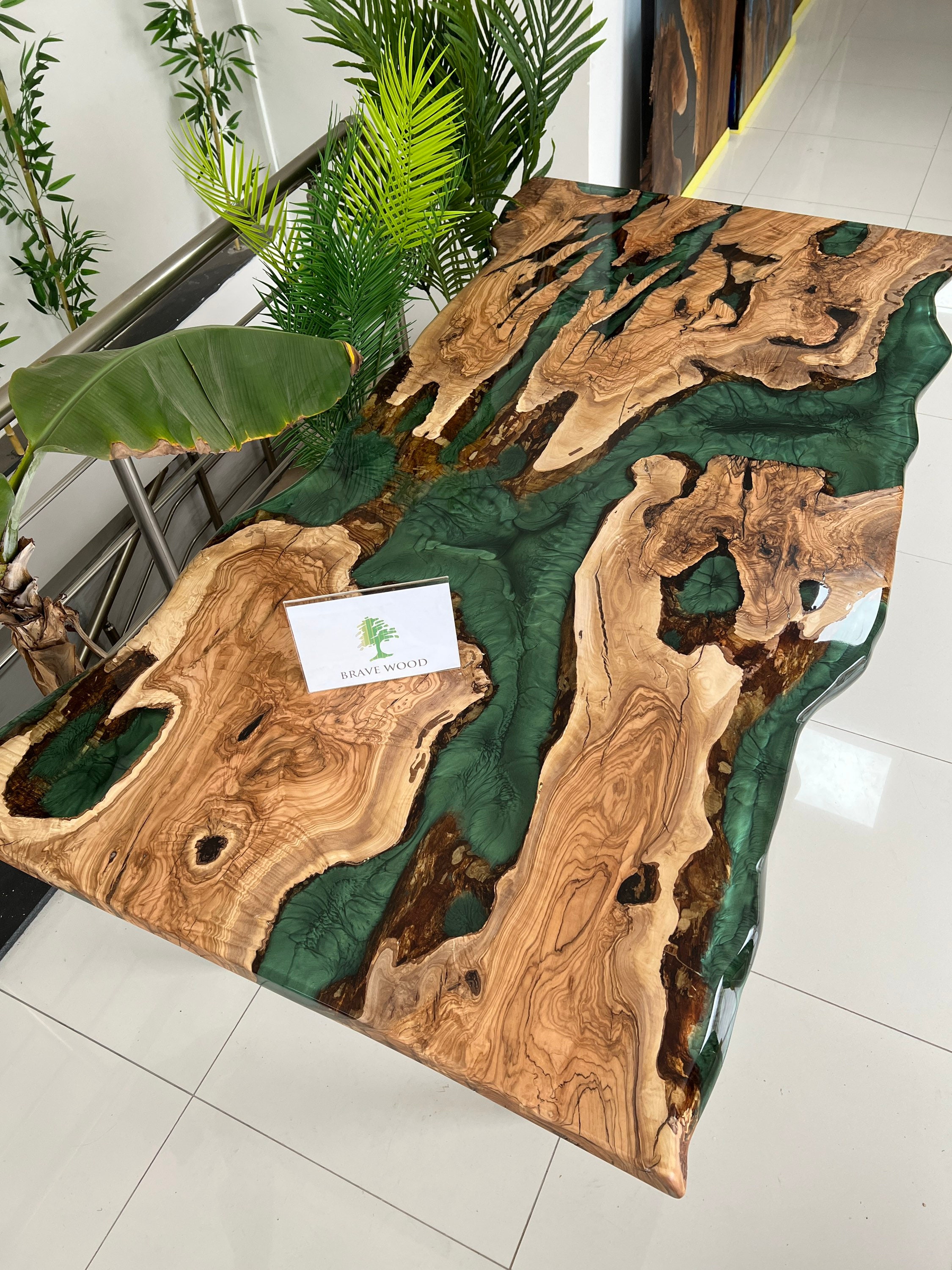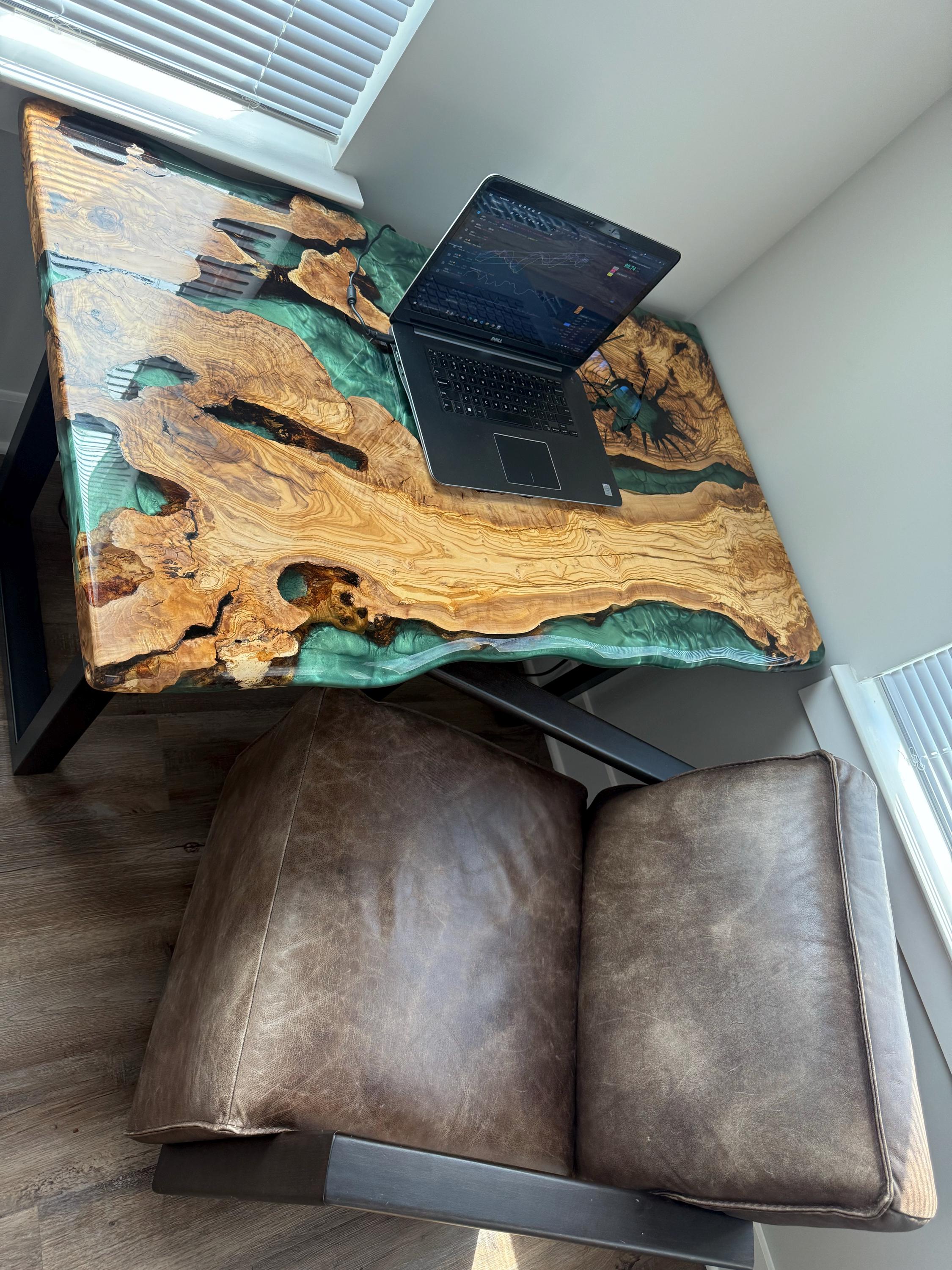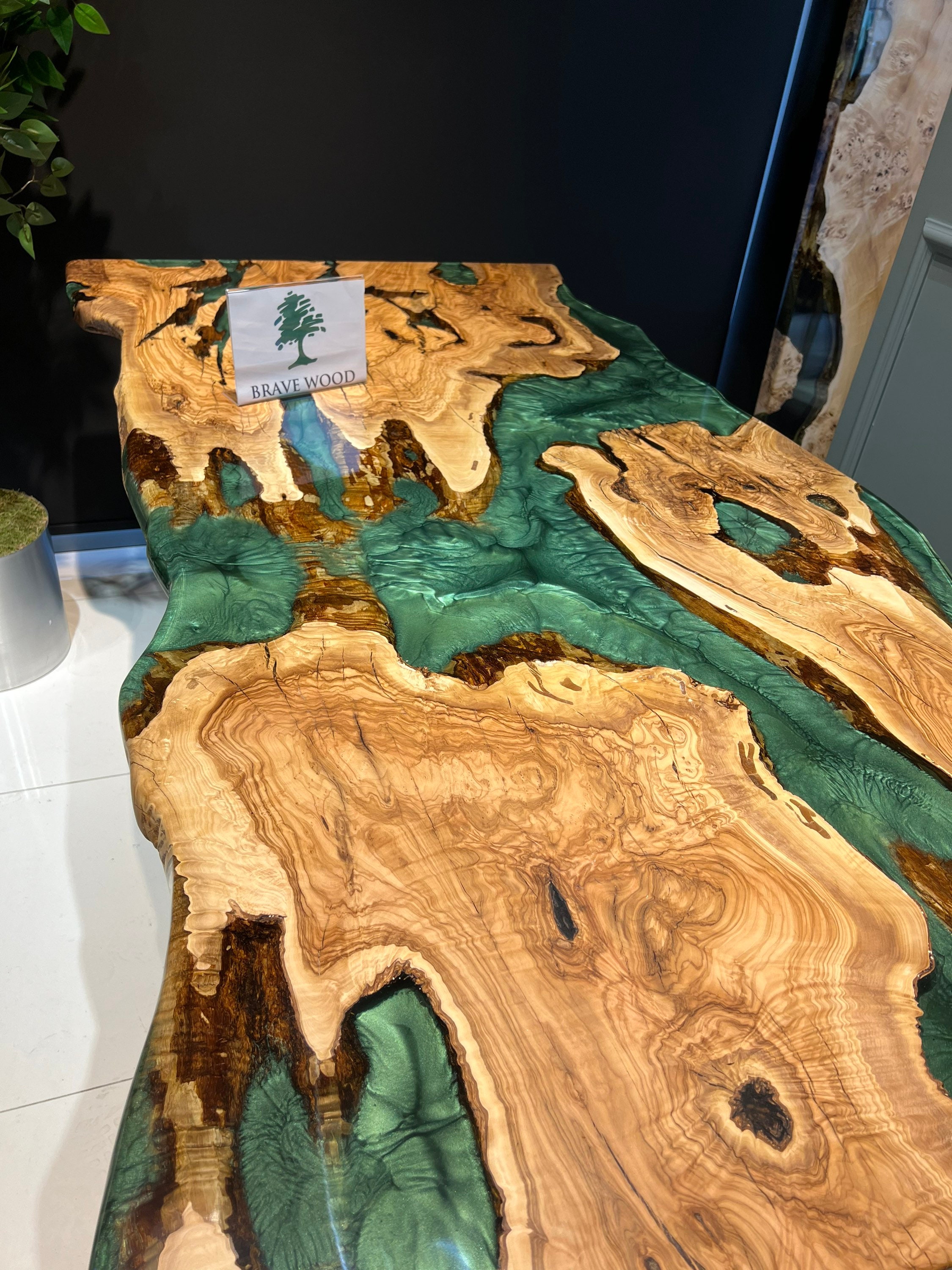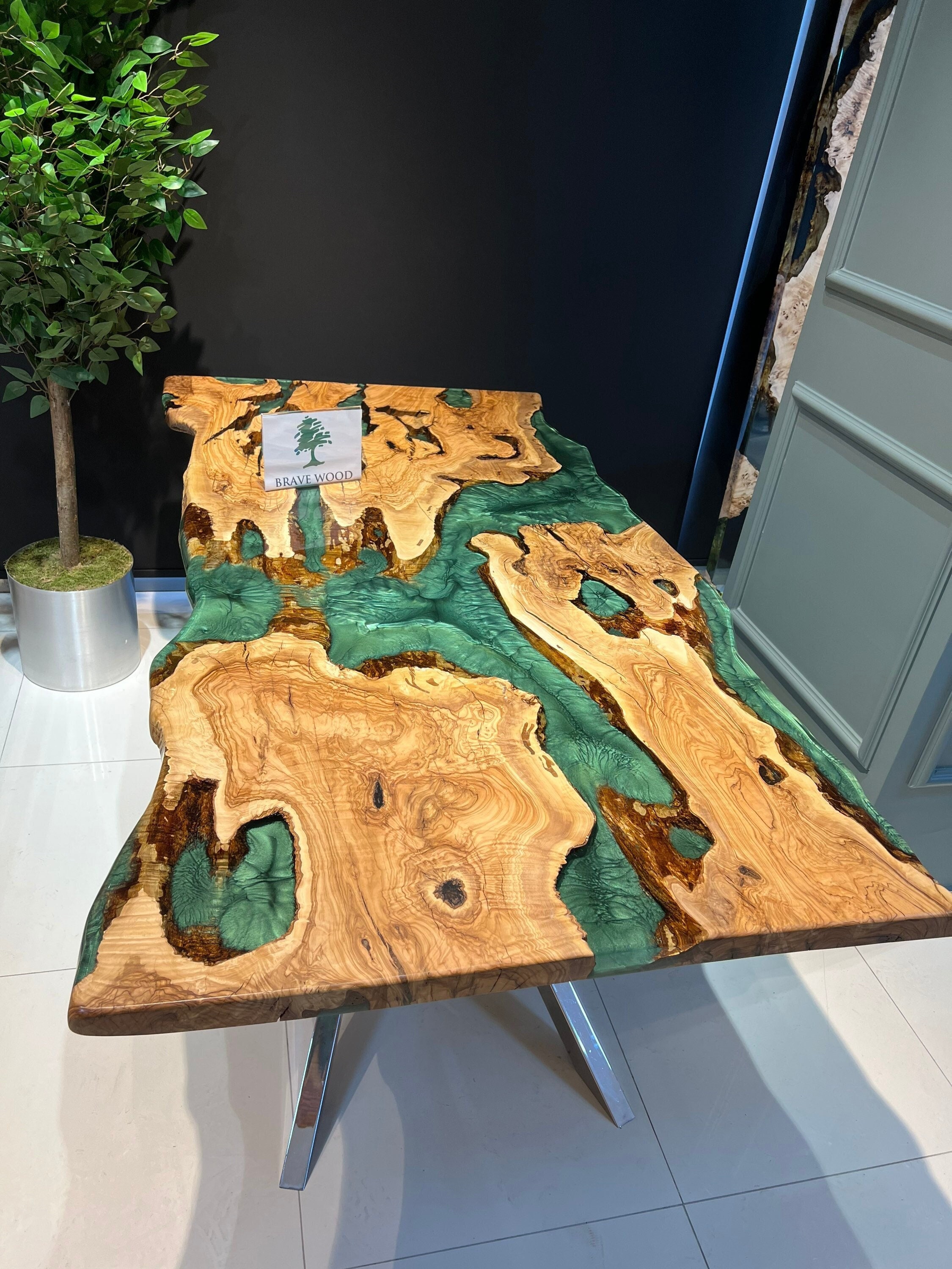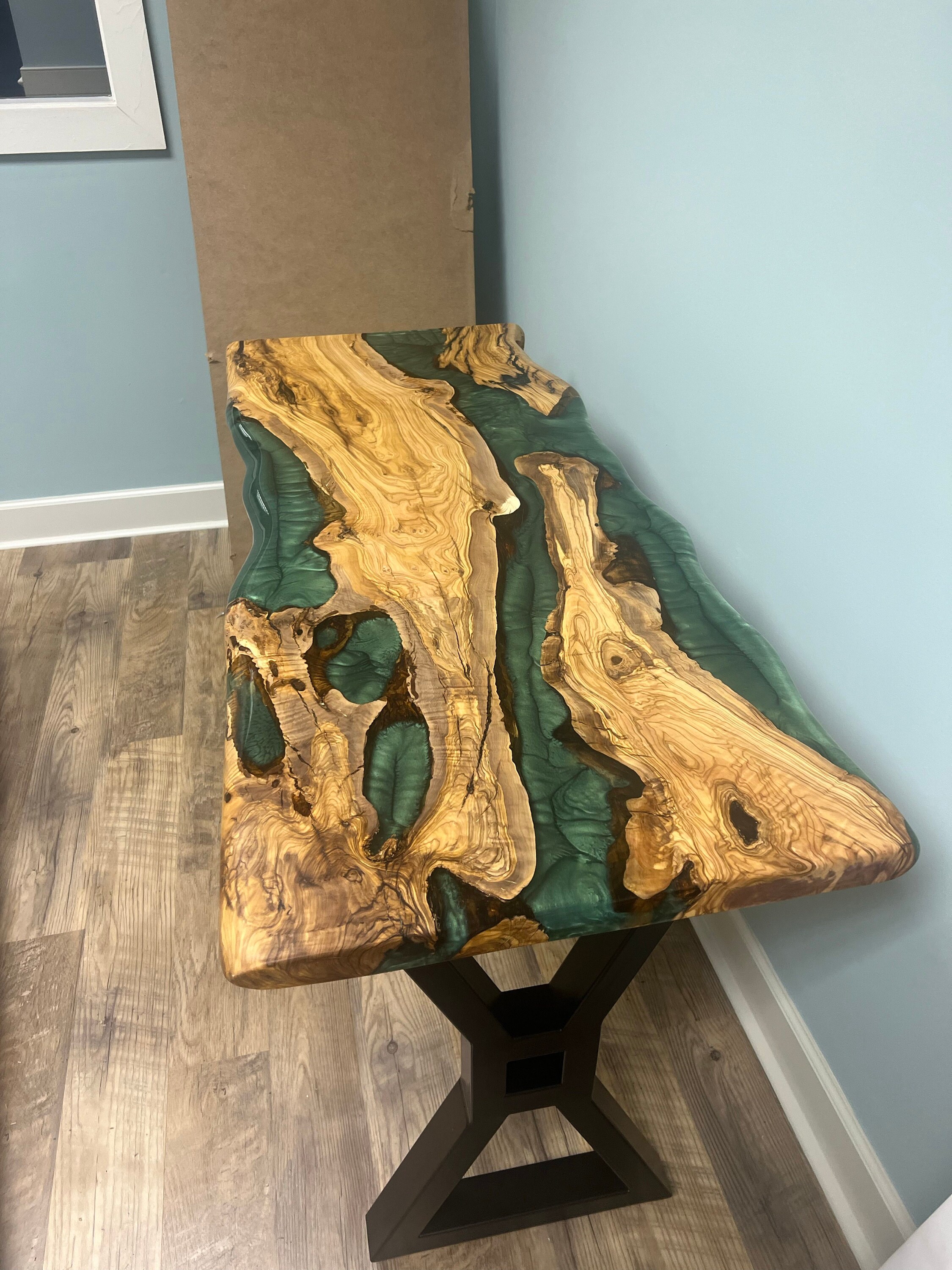 Olive Dining Table for your living room or kitchen. Custom made olive wood dining table with blue or green epoxy like river pattern. Unique, special design with soft edges and handmade production just for you, your home and your kitchen.
