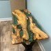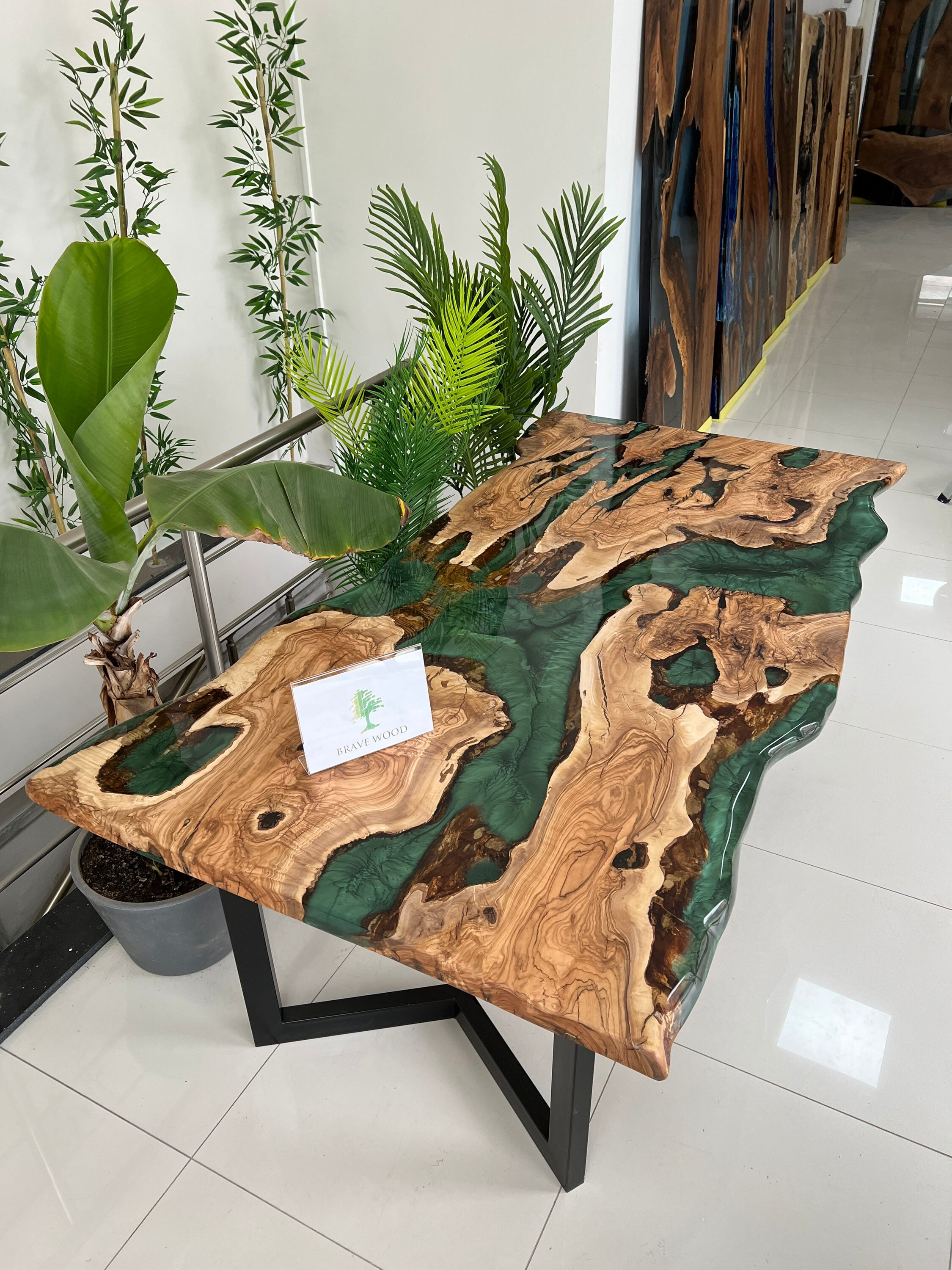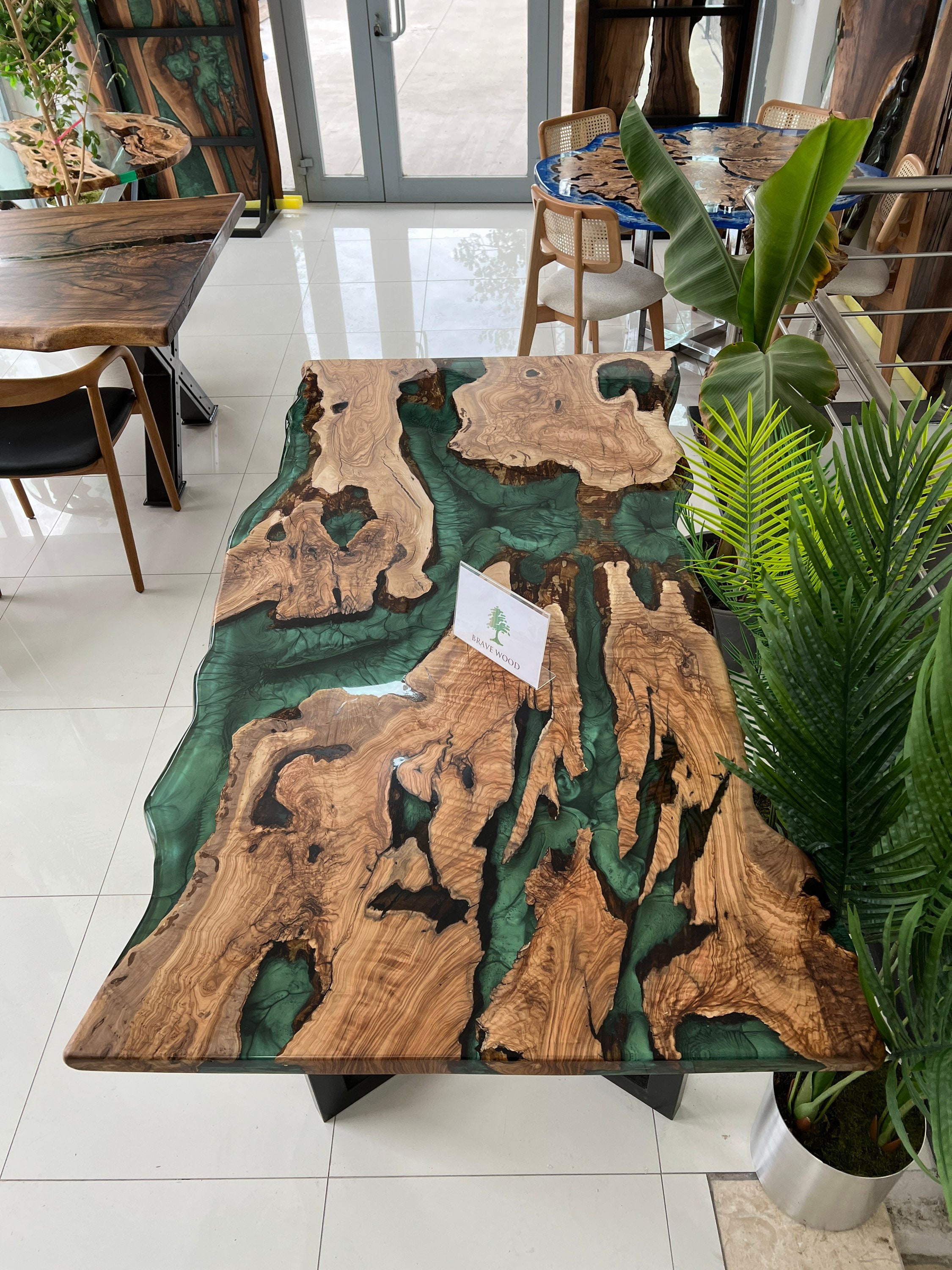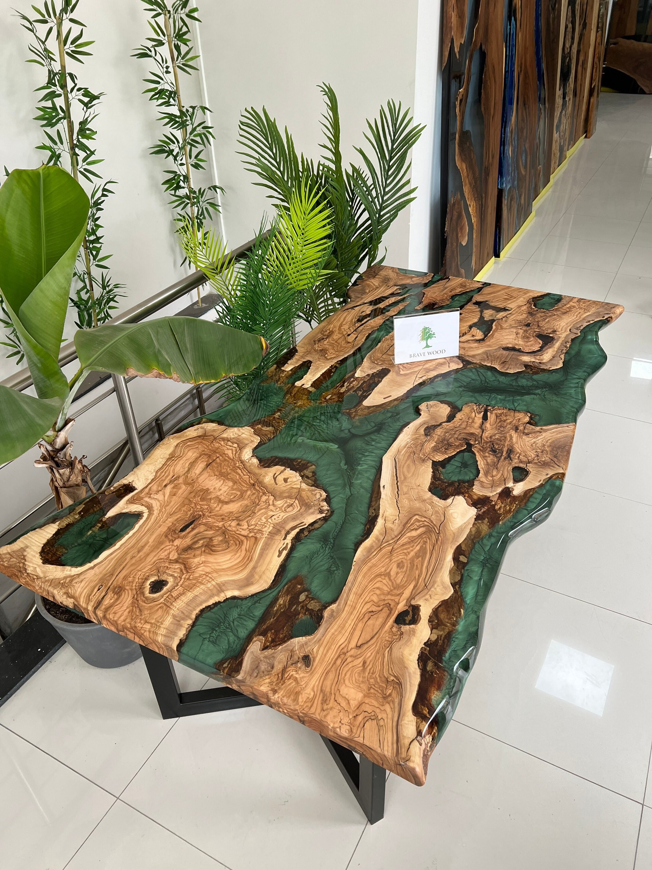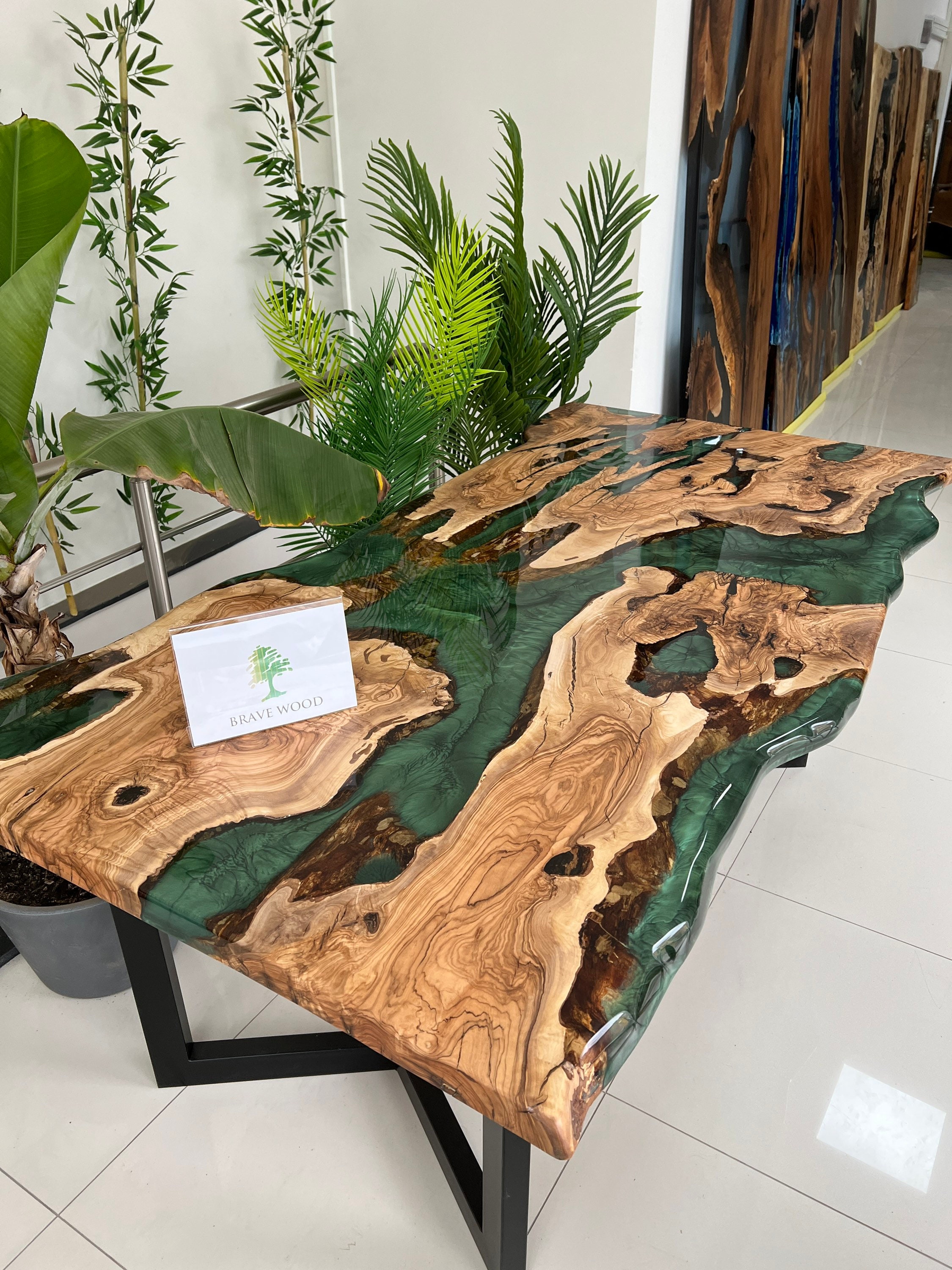 Olive Dining Table for your living room or kitchen. Custom made olive wood dining table with blue or green epoxy like river pattern. Unique, special design with soft edges and handmade production just for you, your home and your kitchen.