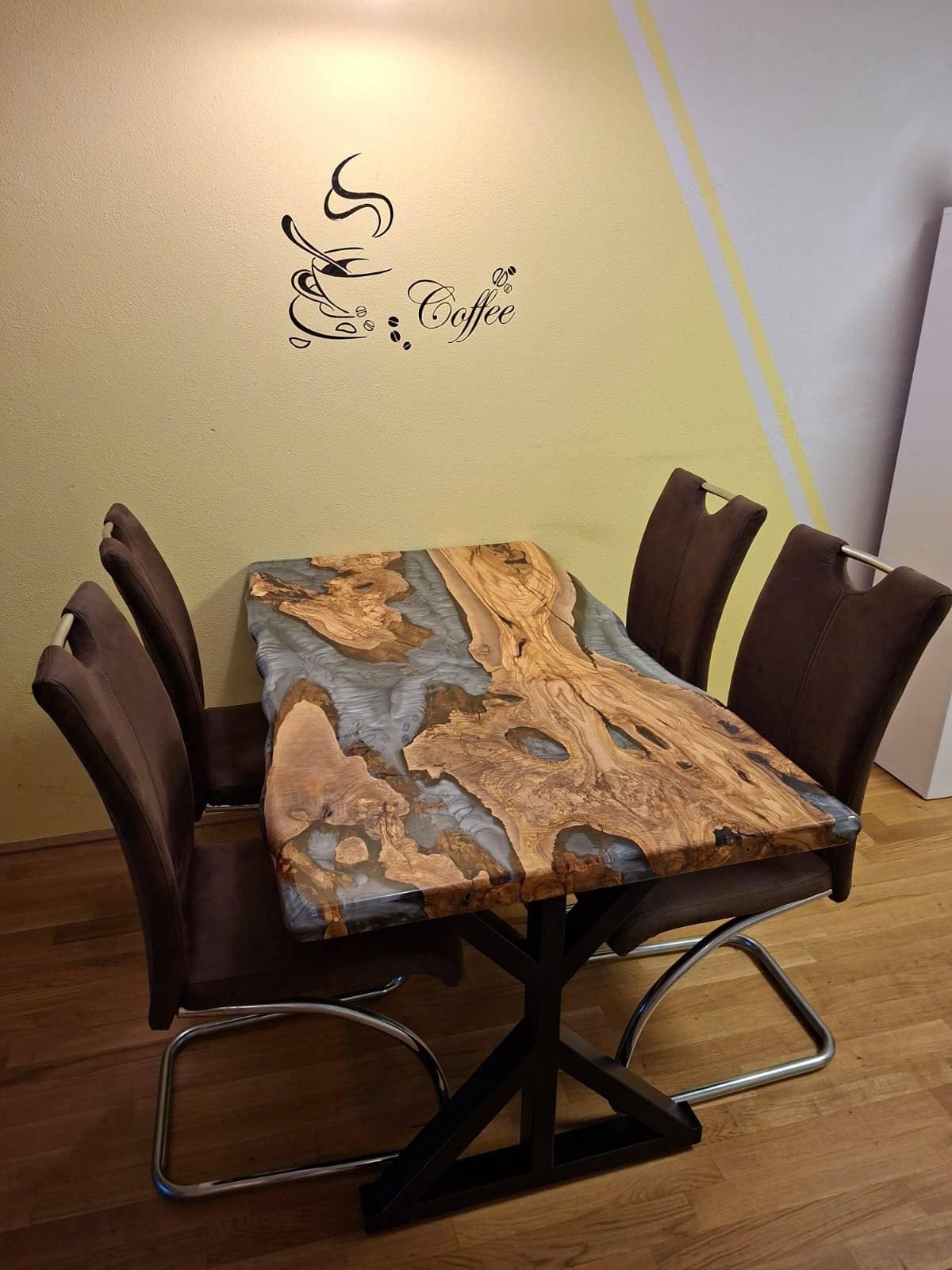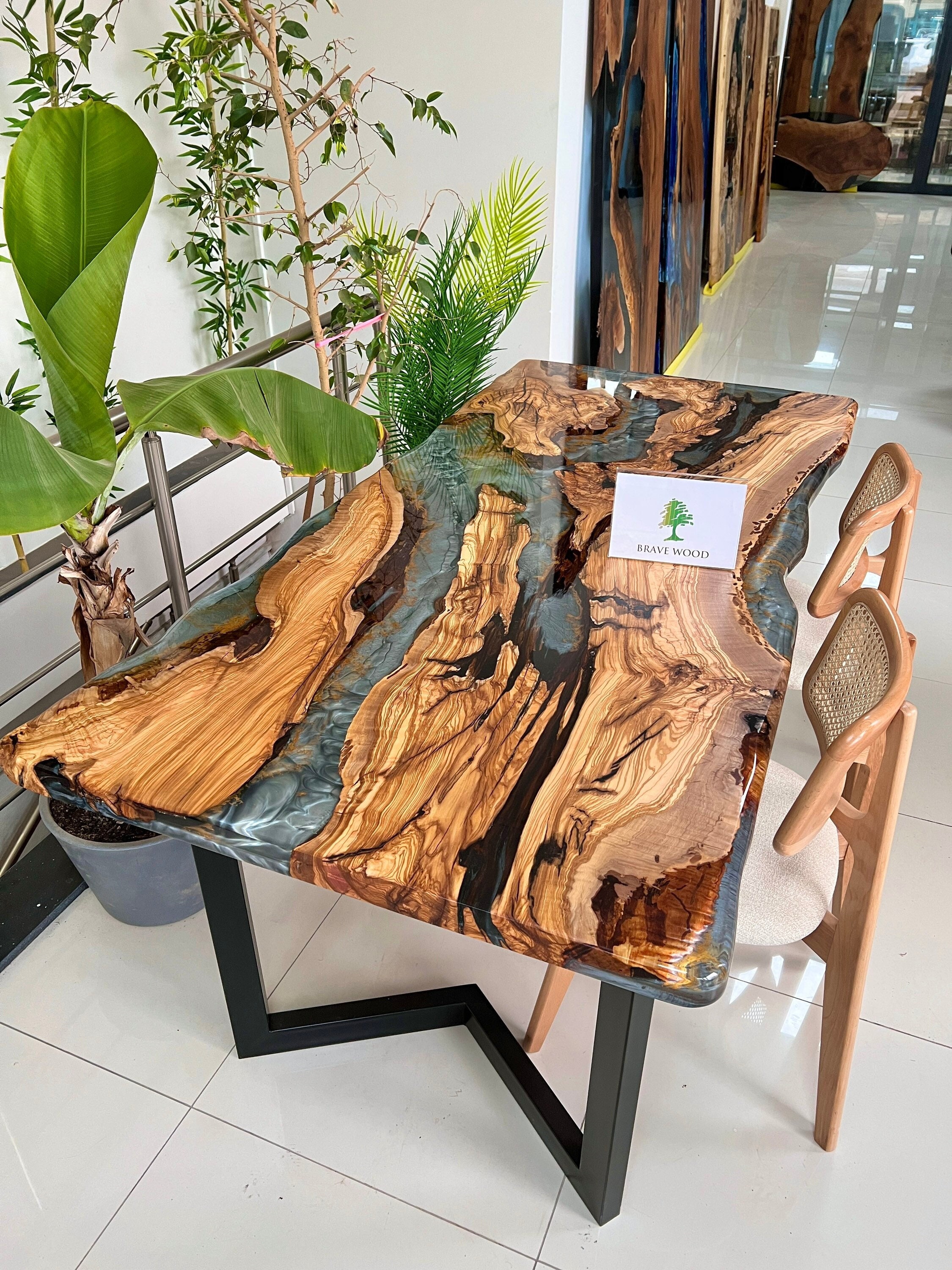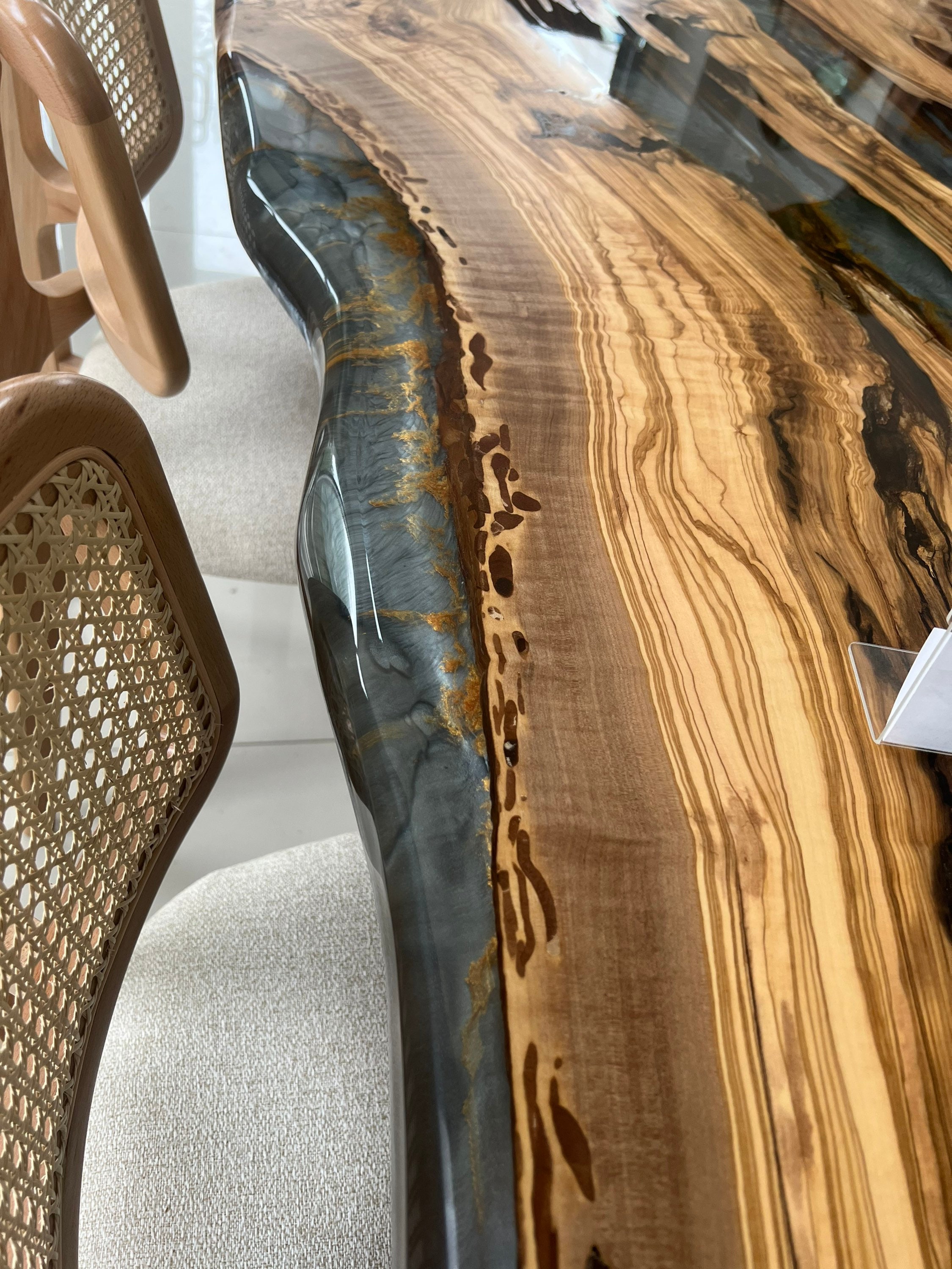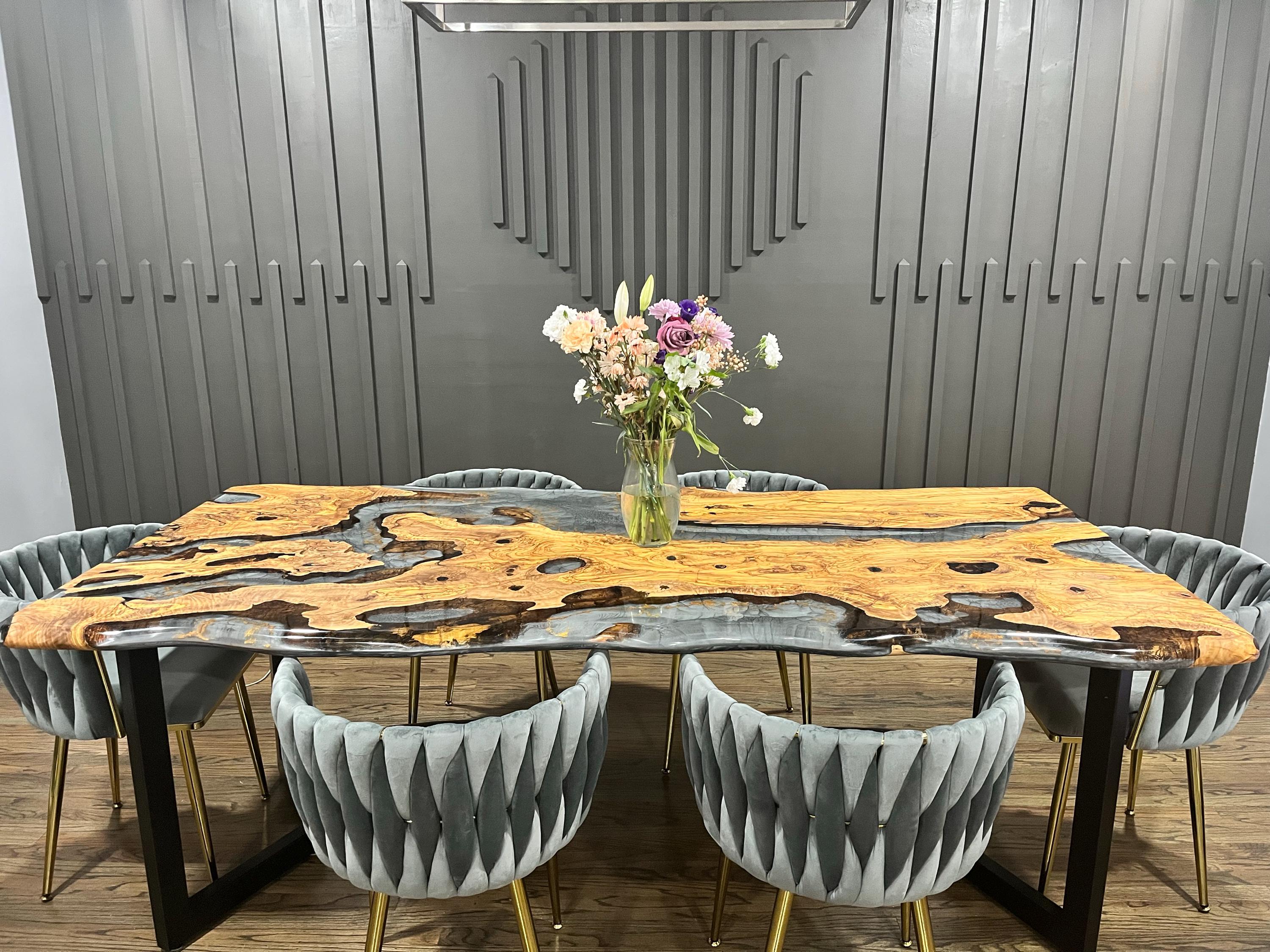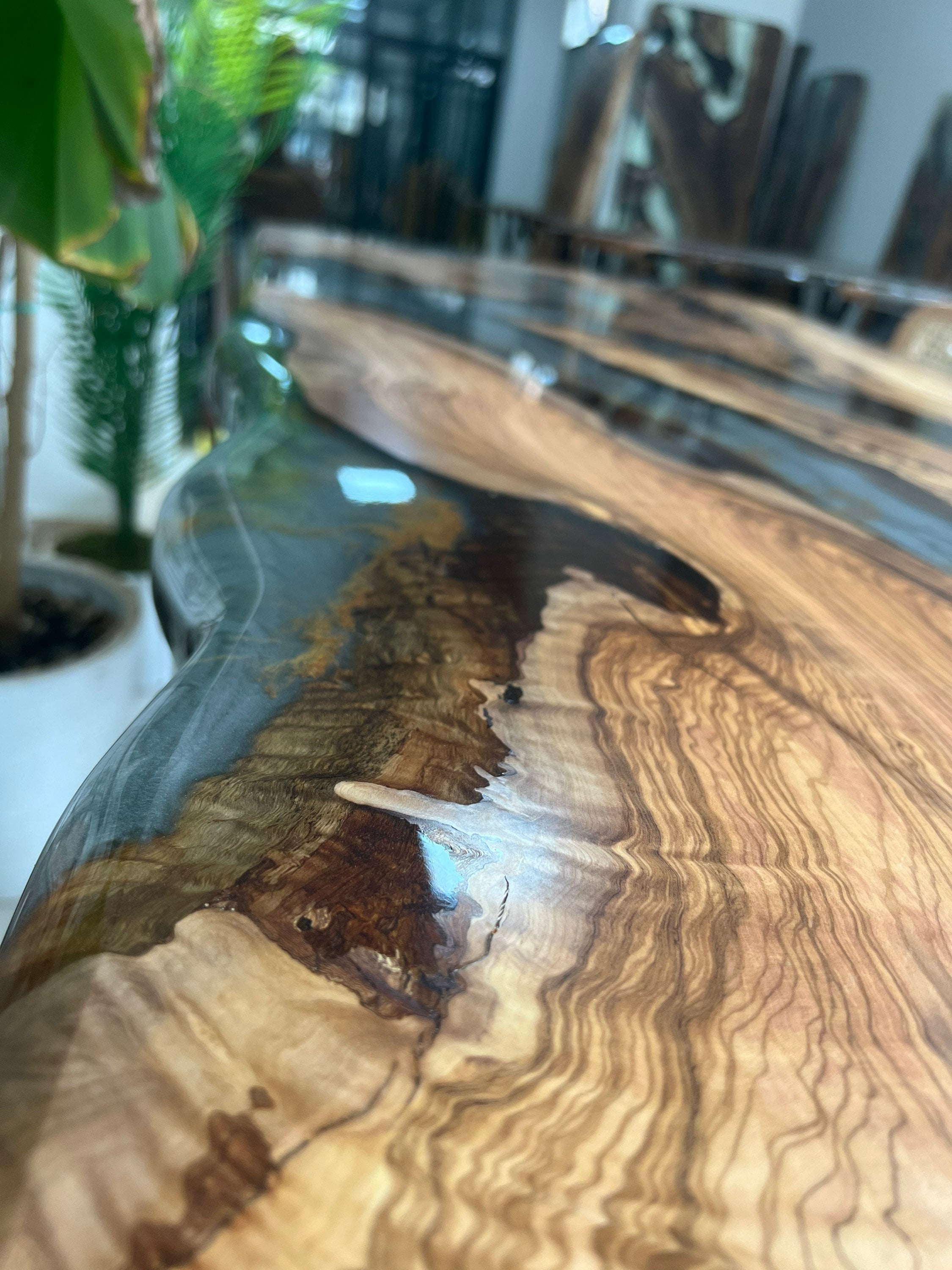 Olive Dining Table for your living room or kitchen. Custom made olive wood dining table with blue or green epoxy like river pattern. Unique, special design with soft edges and handmade production just for you, your home and your kitchen.