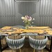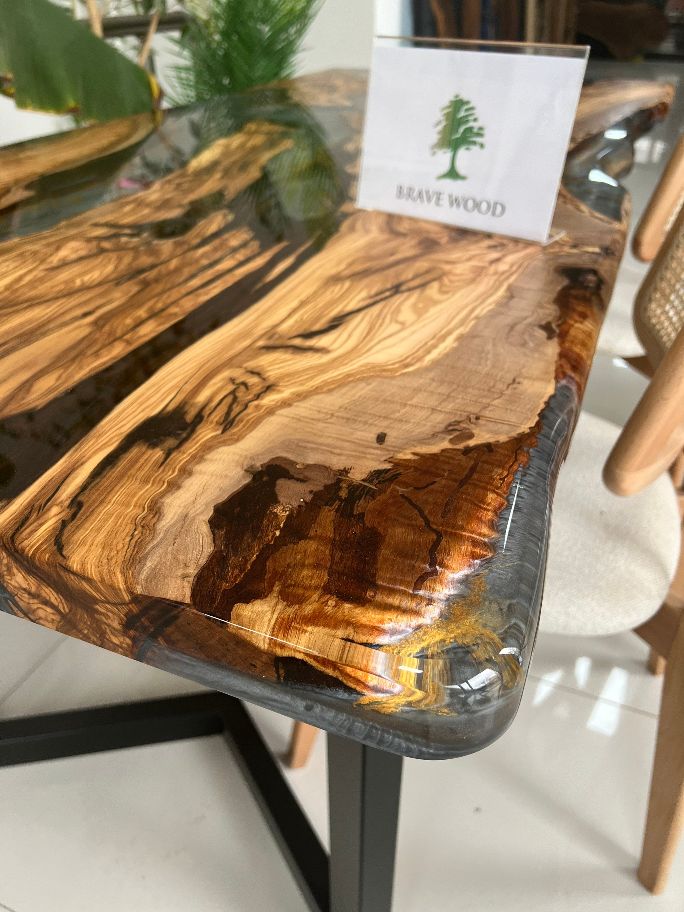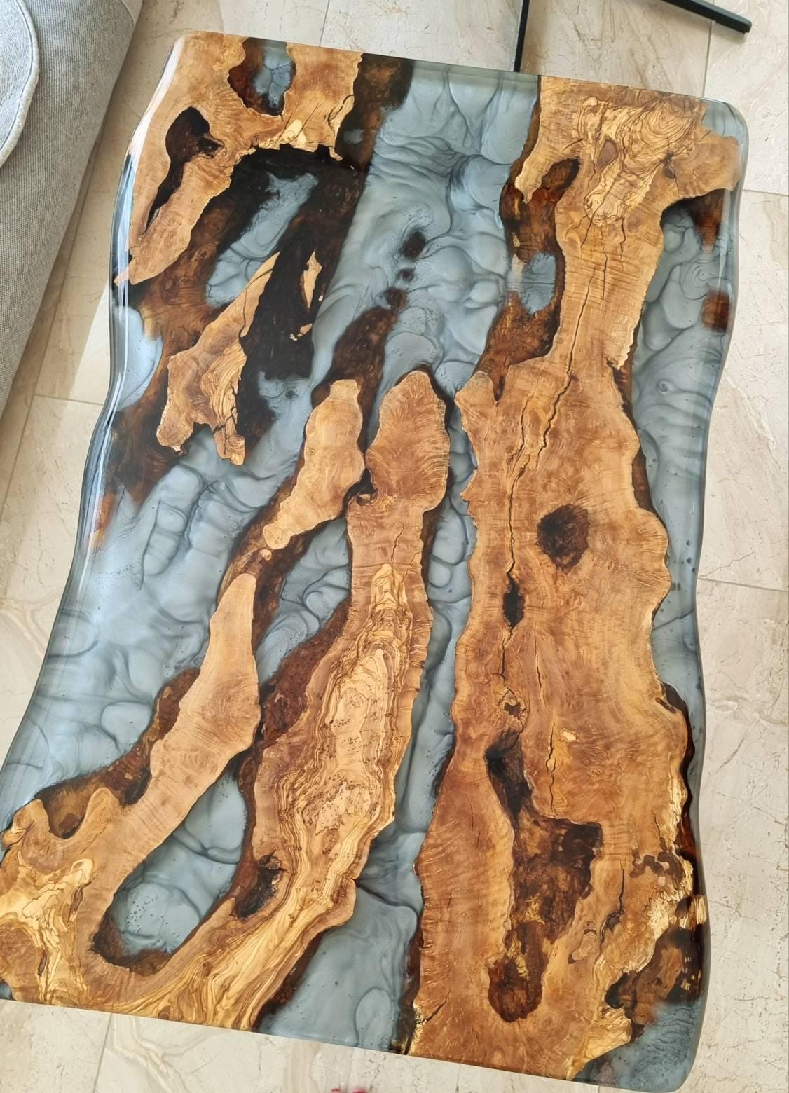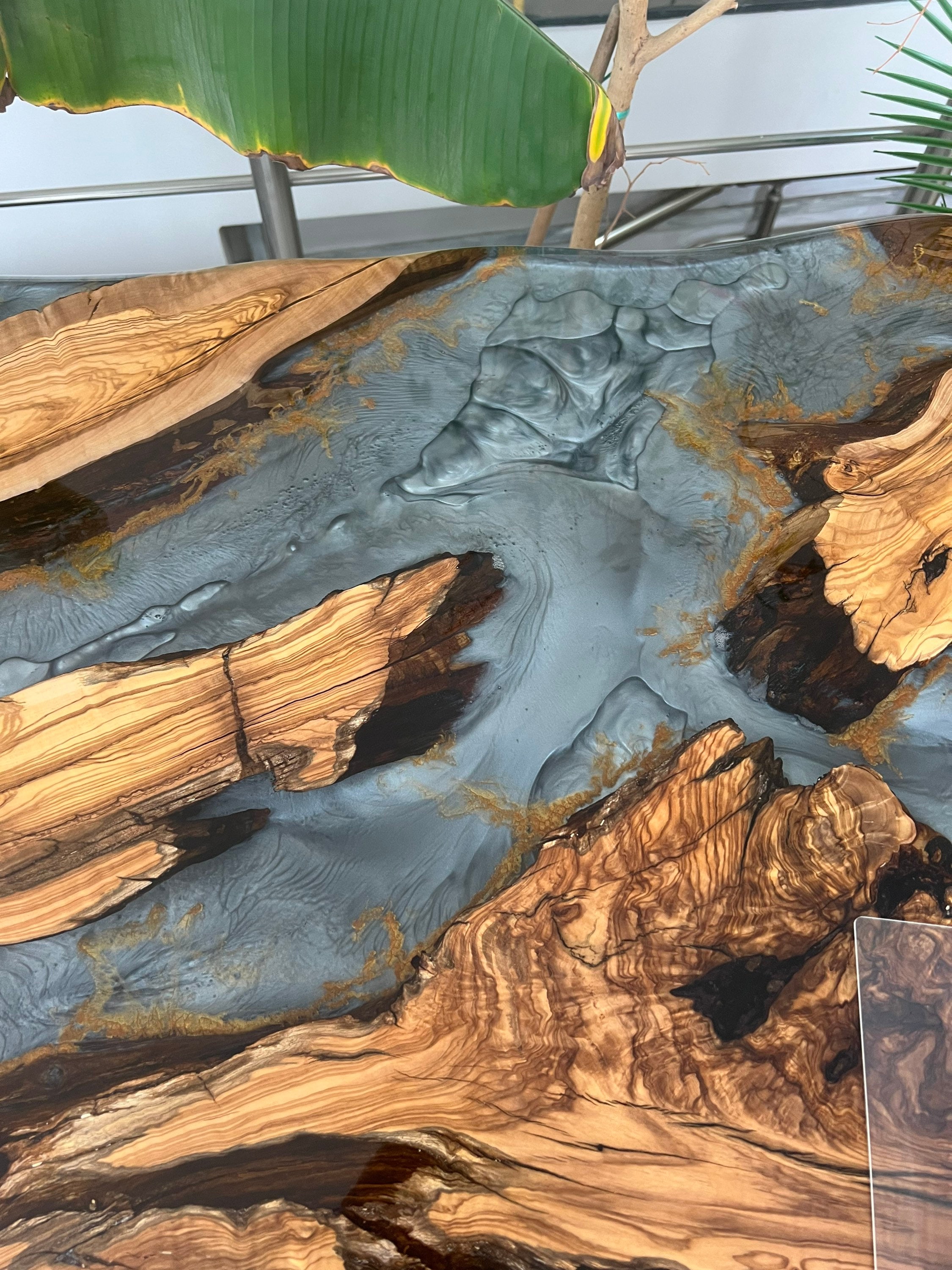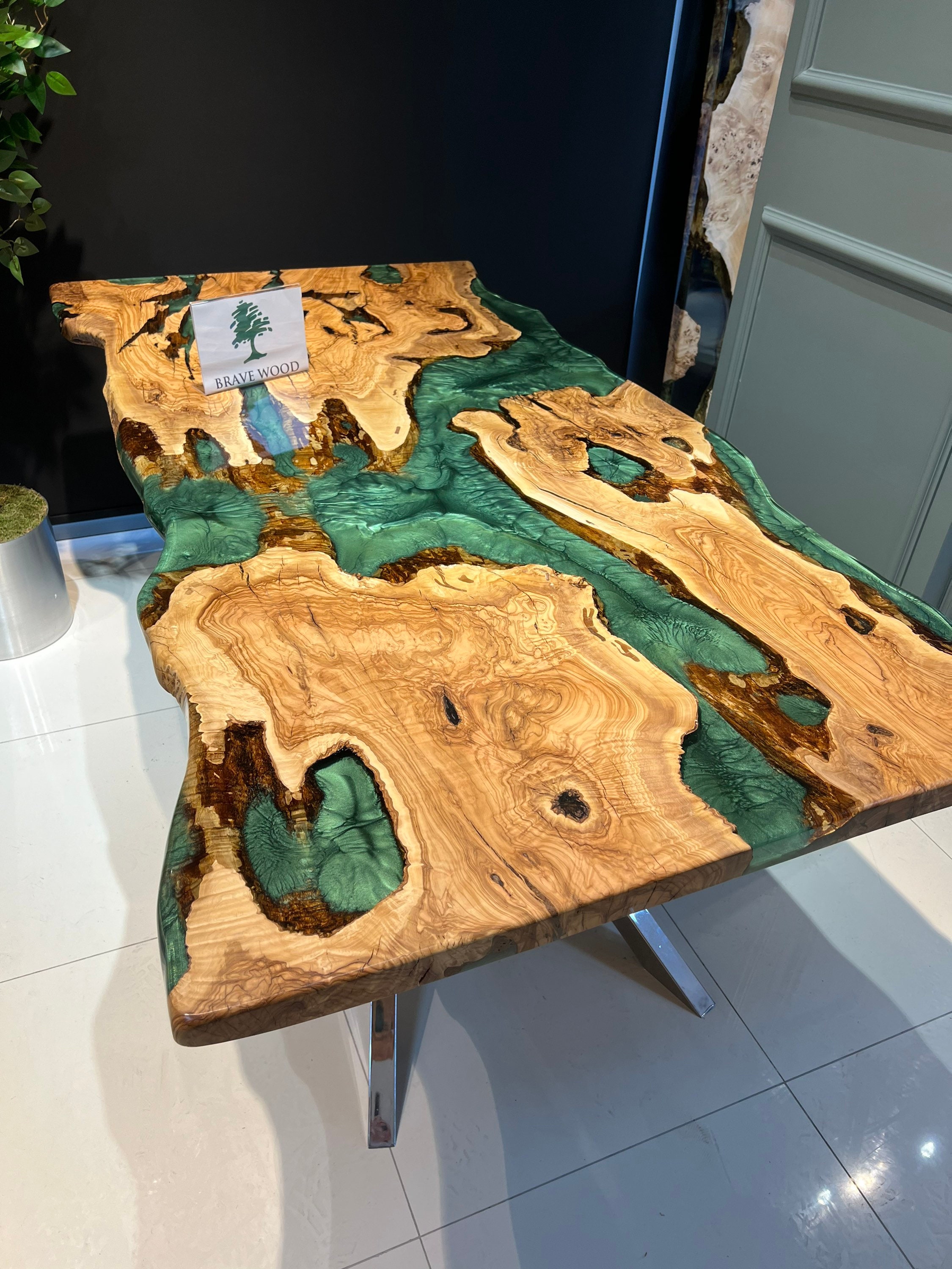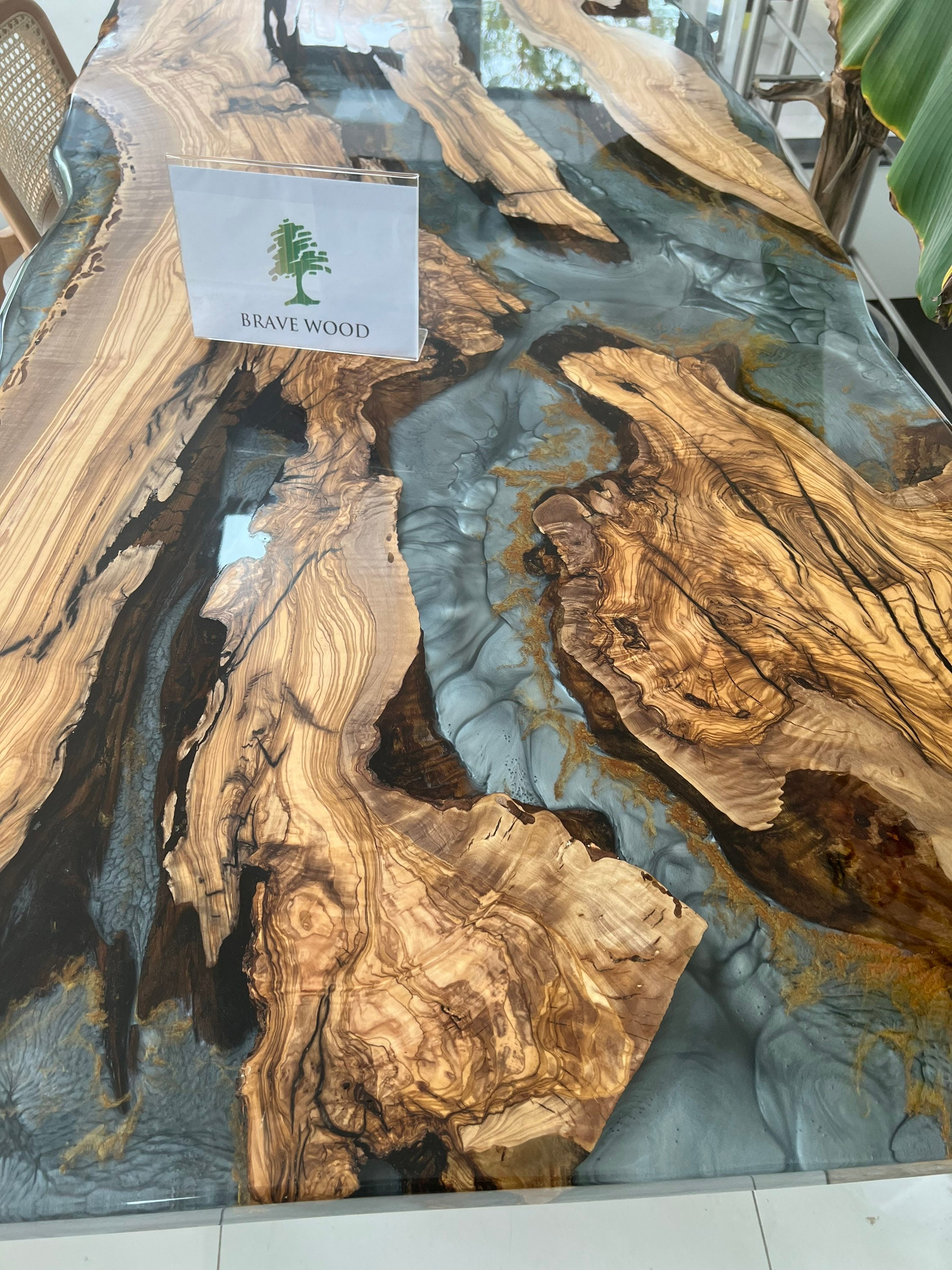 Olive Dining Table for your living room or kitchen. Custom made olive wood dining table with blue or green epoxy like river pattern. Unique, special design with soft edges and handmade production just for you, your home and your kitchen.