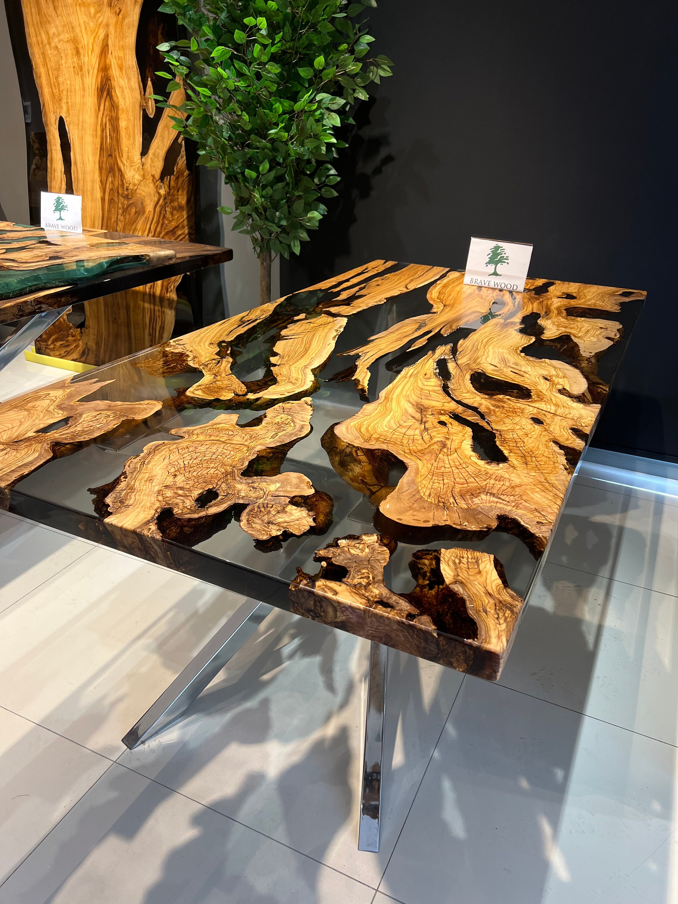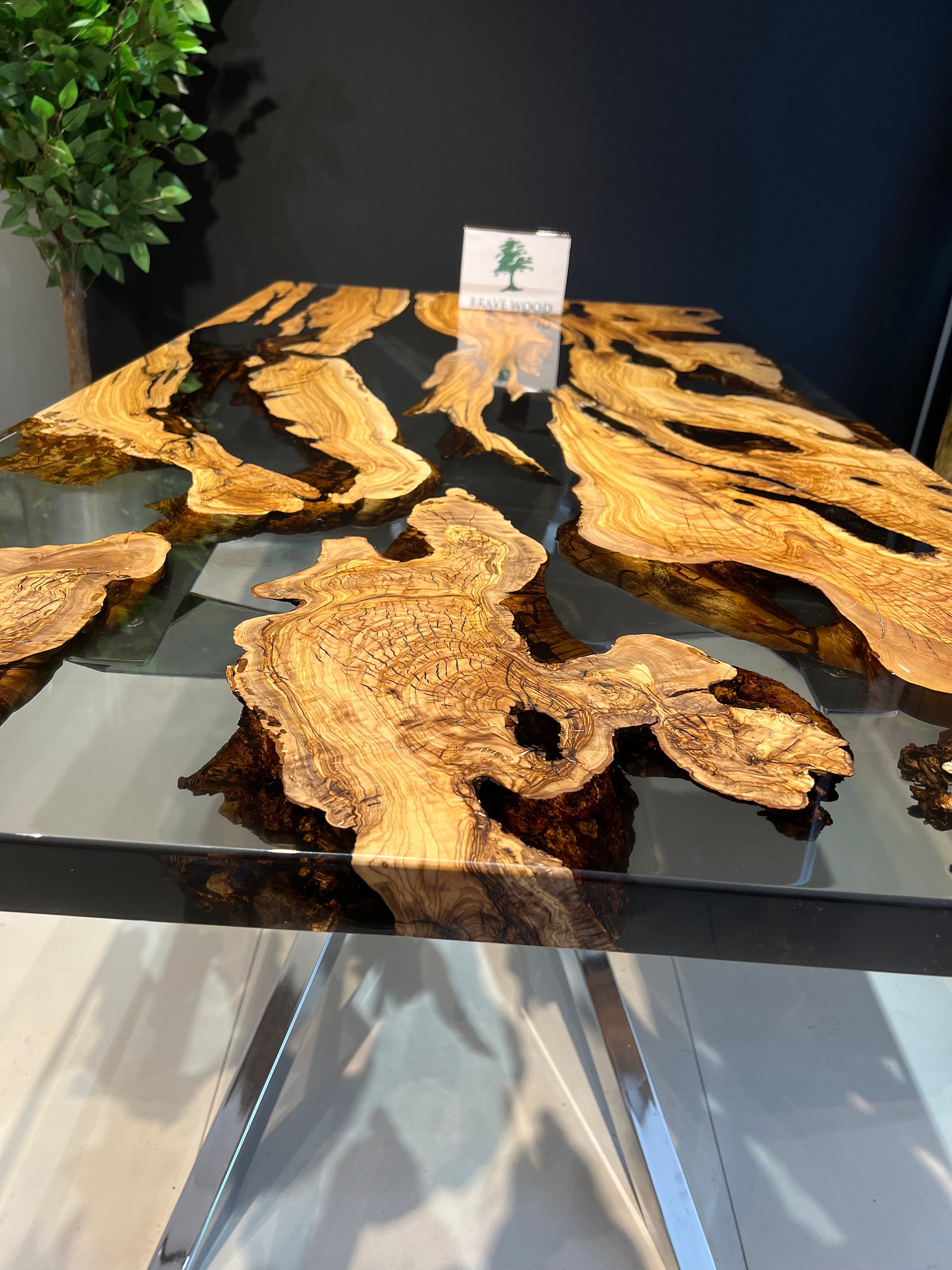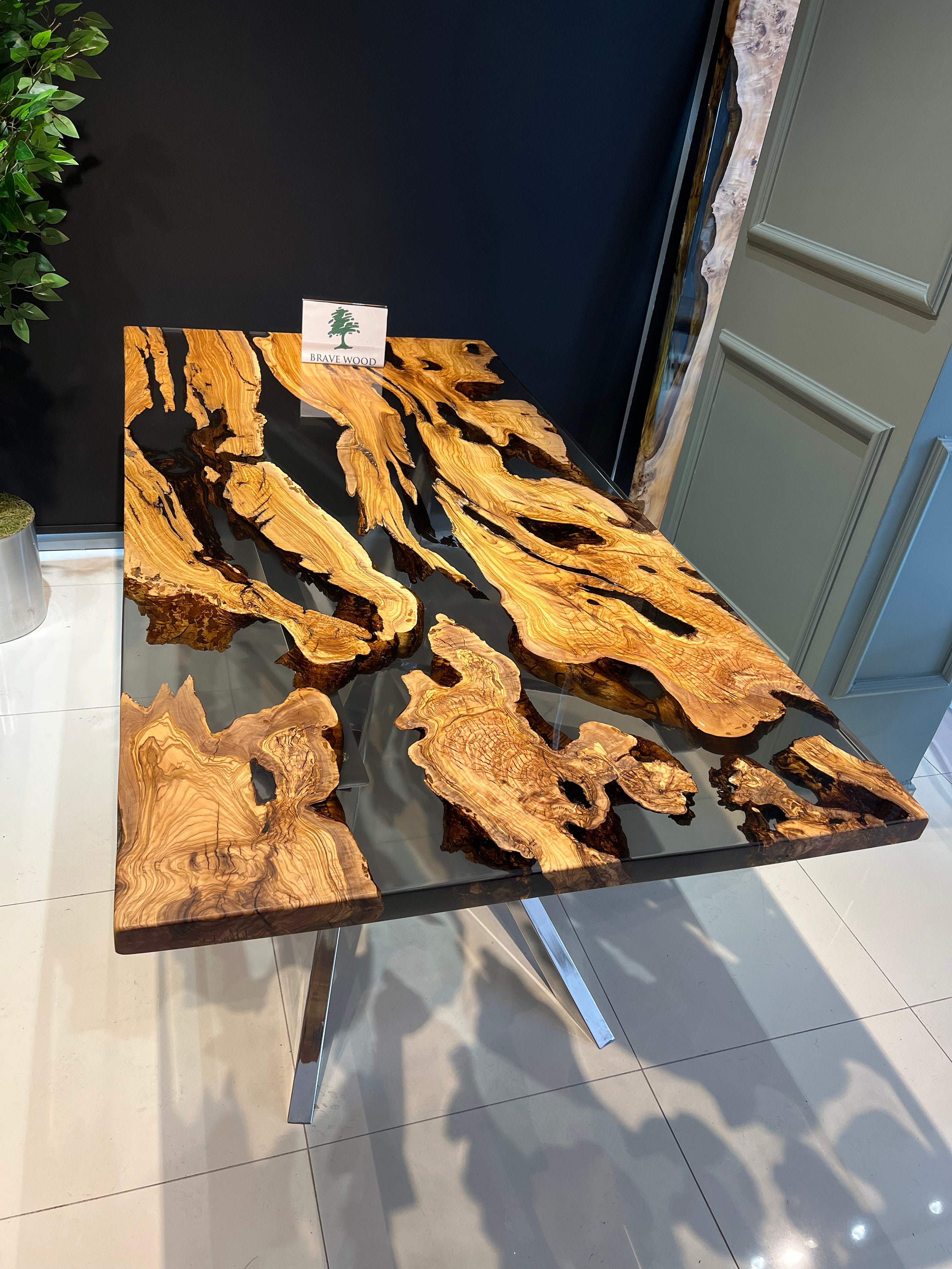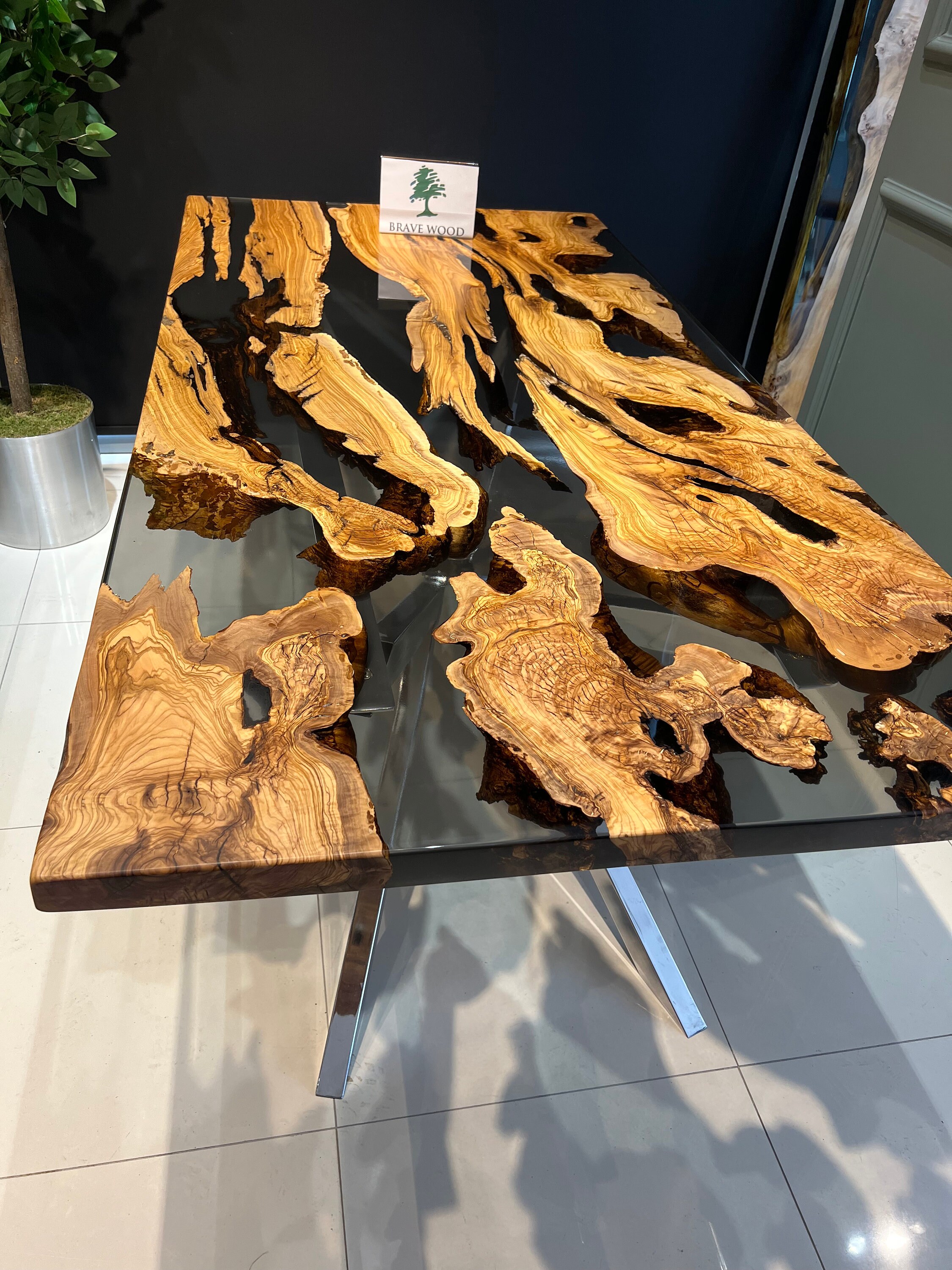 Olive Dining Table for your living room or kitchen. Custom made olive wood dining table with blue or green epoxy like river pattern. Unique, special design with soft edges and handmade production just for you, your home and your kitchen.