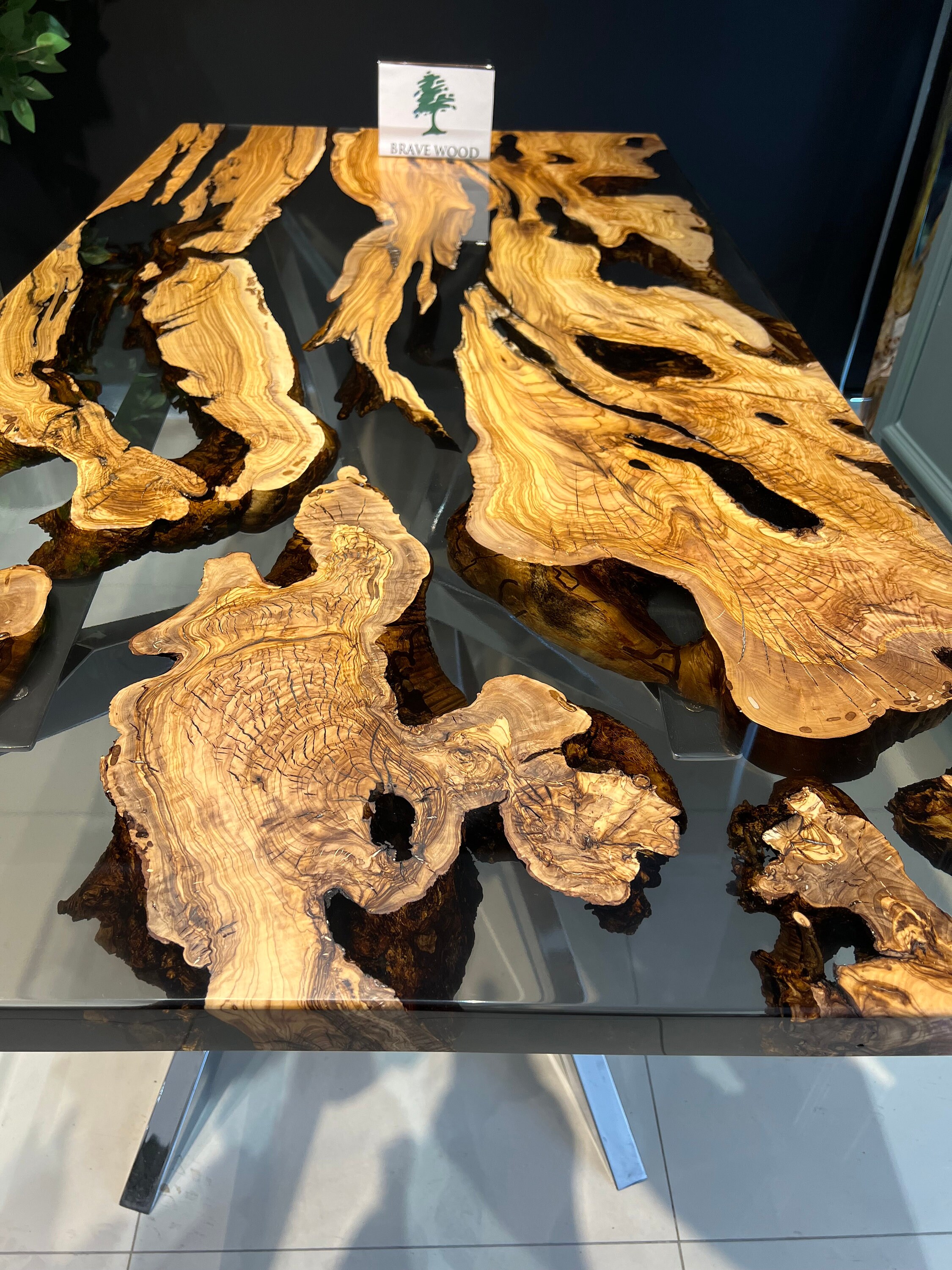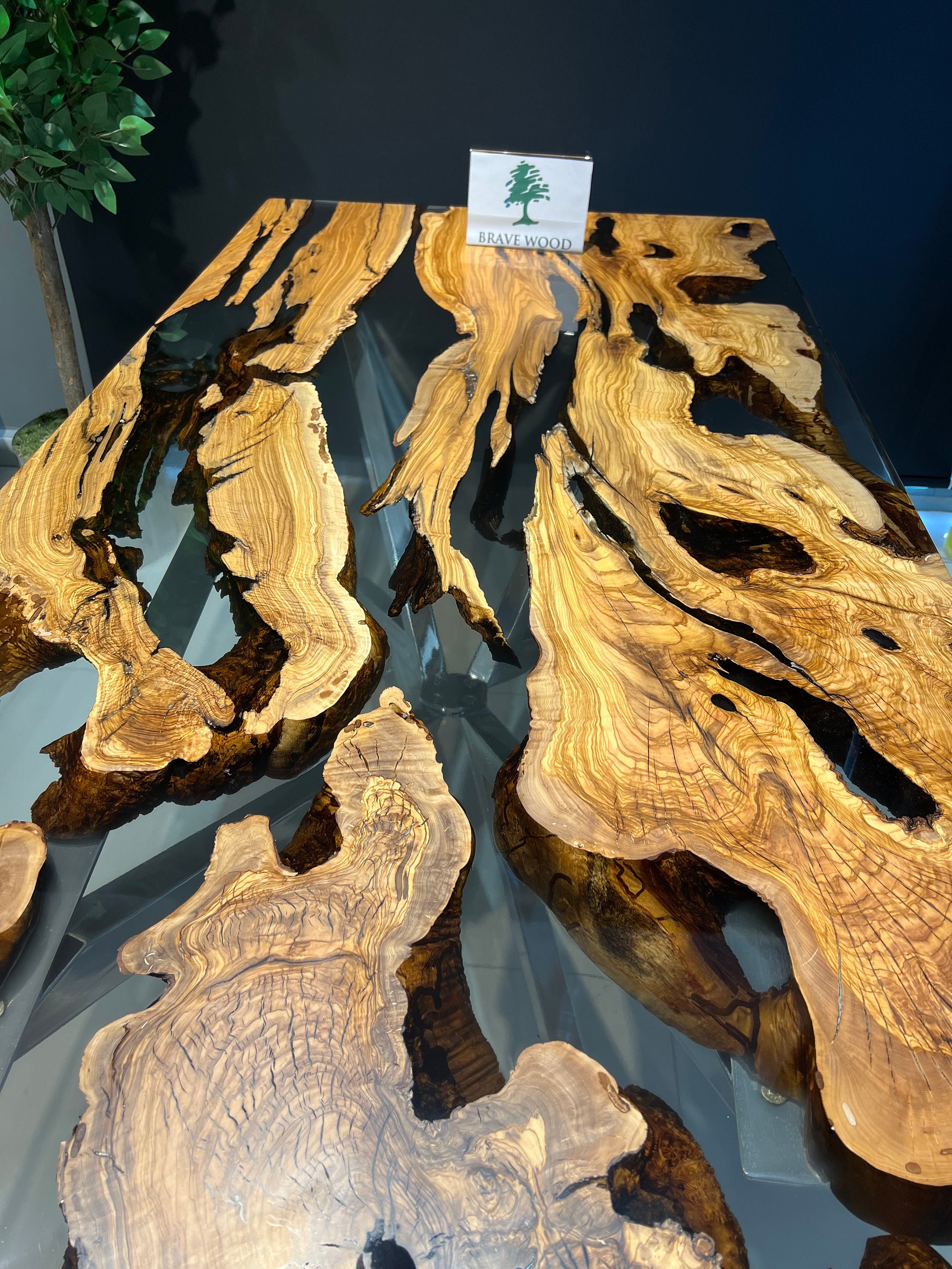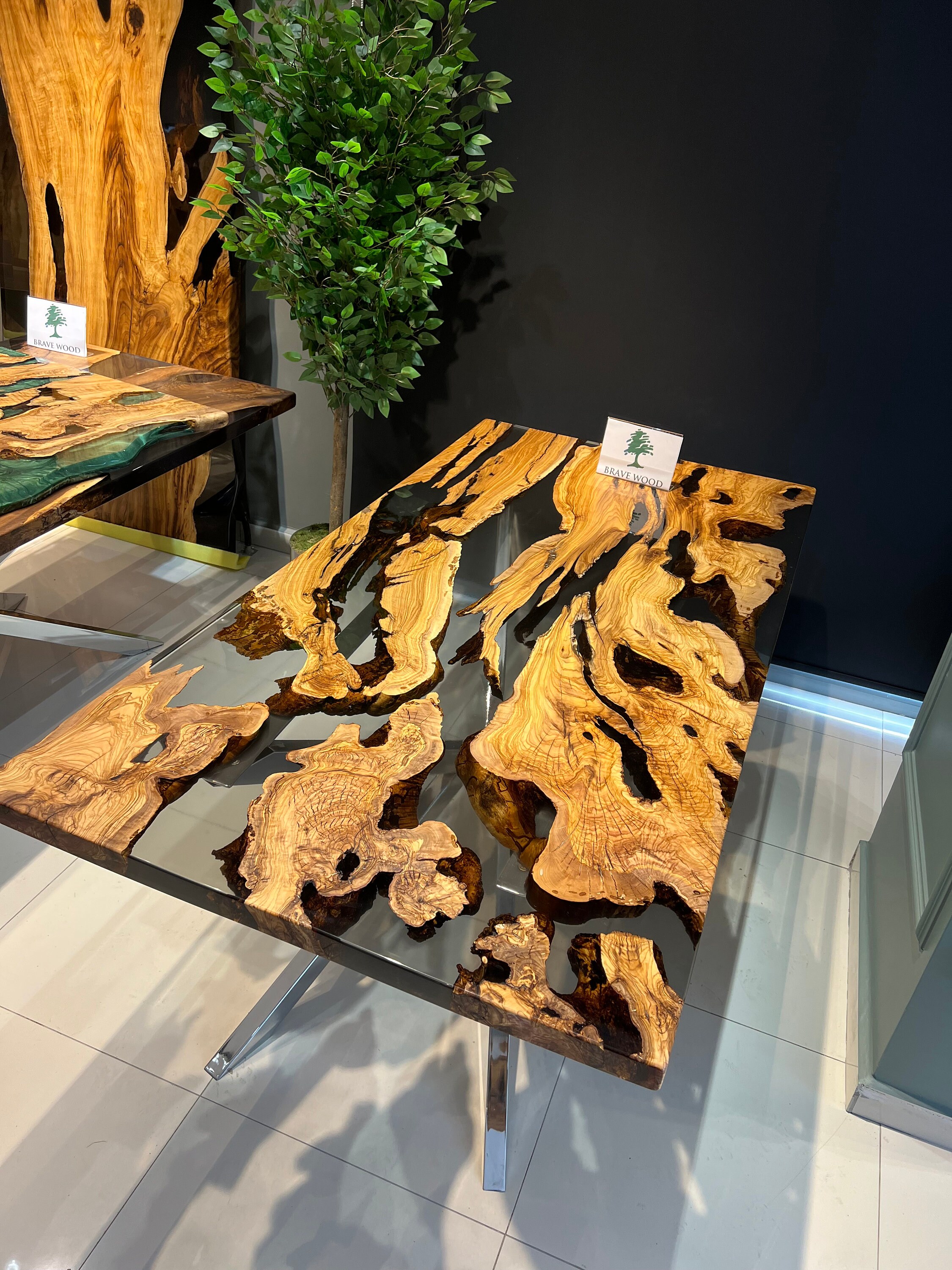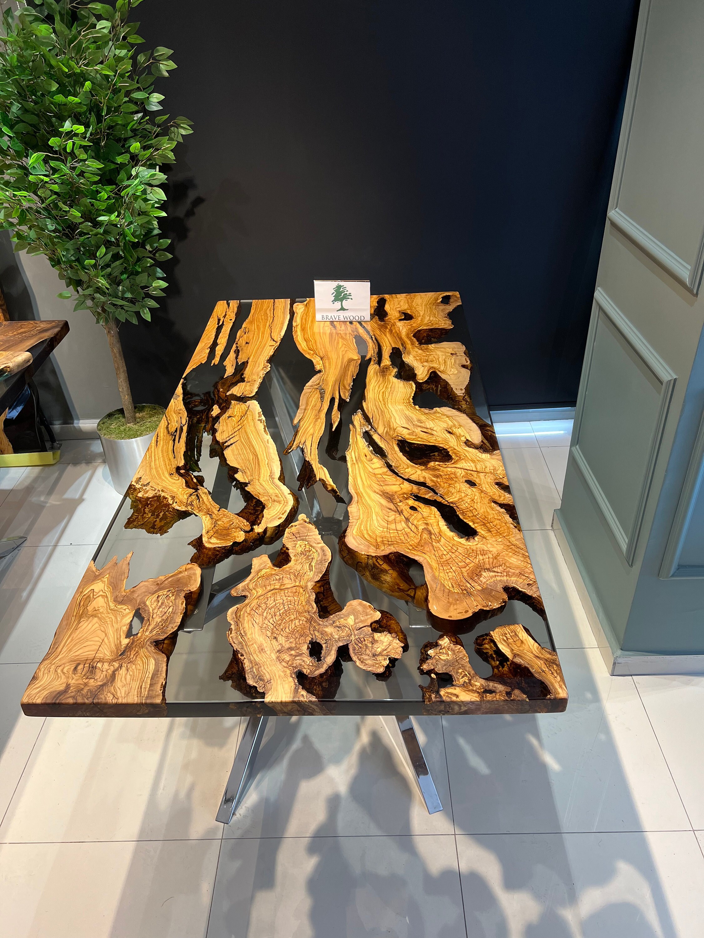 Olive Dining Table for your living room or kitchen. Custom made olive wood dining table with blue or green epoxy like river pattern. Unique, special design with soft edges and handmade production just for you, your home and your kitchen.