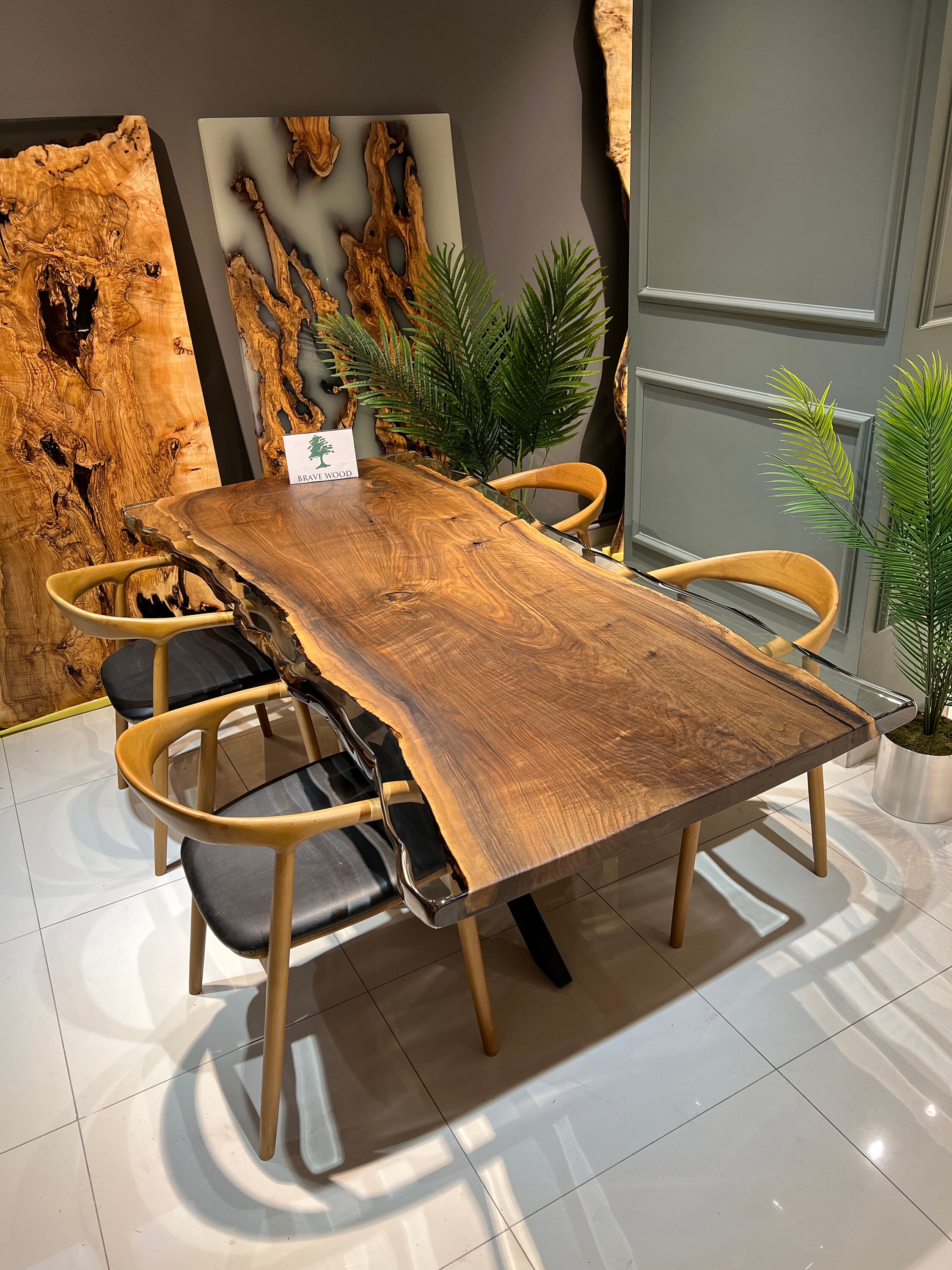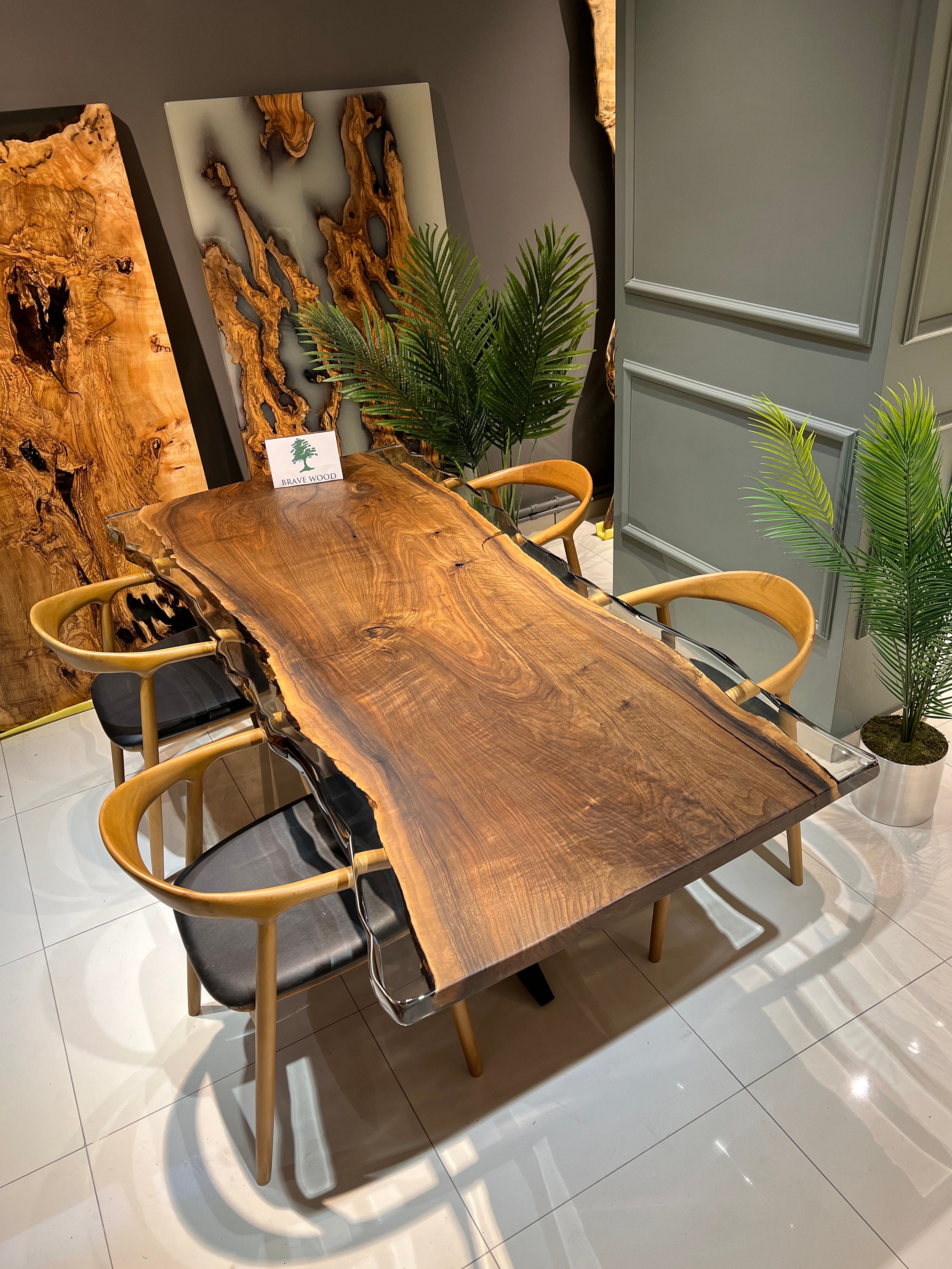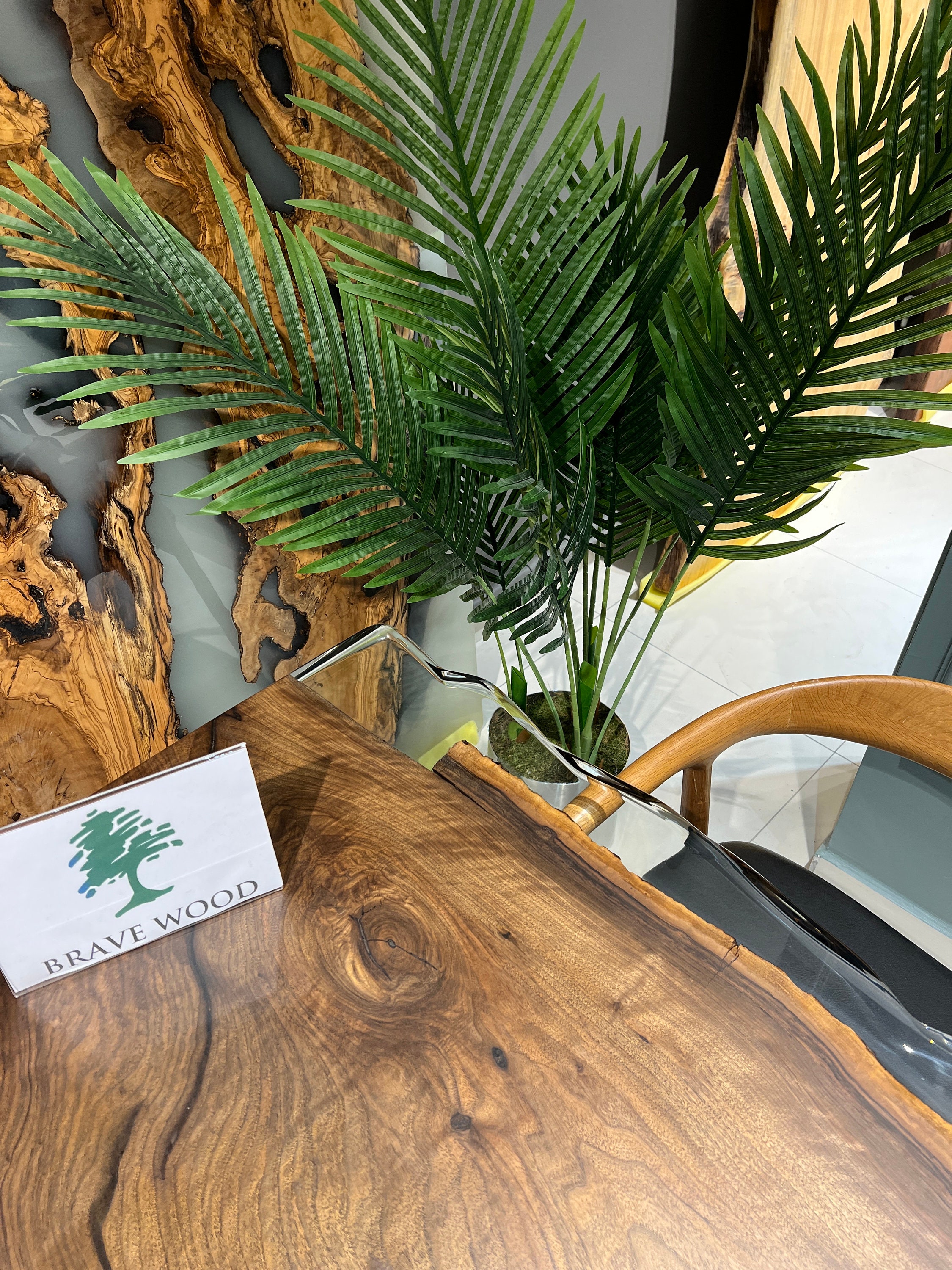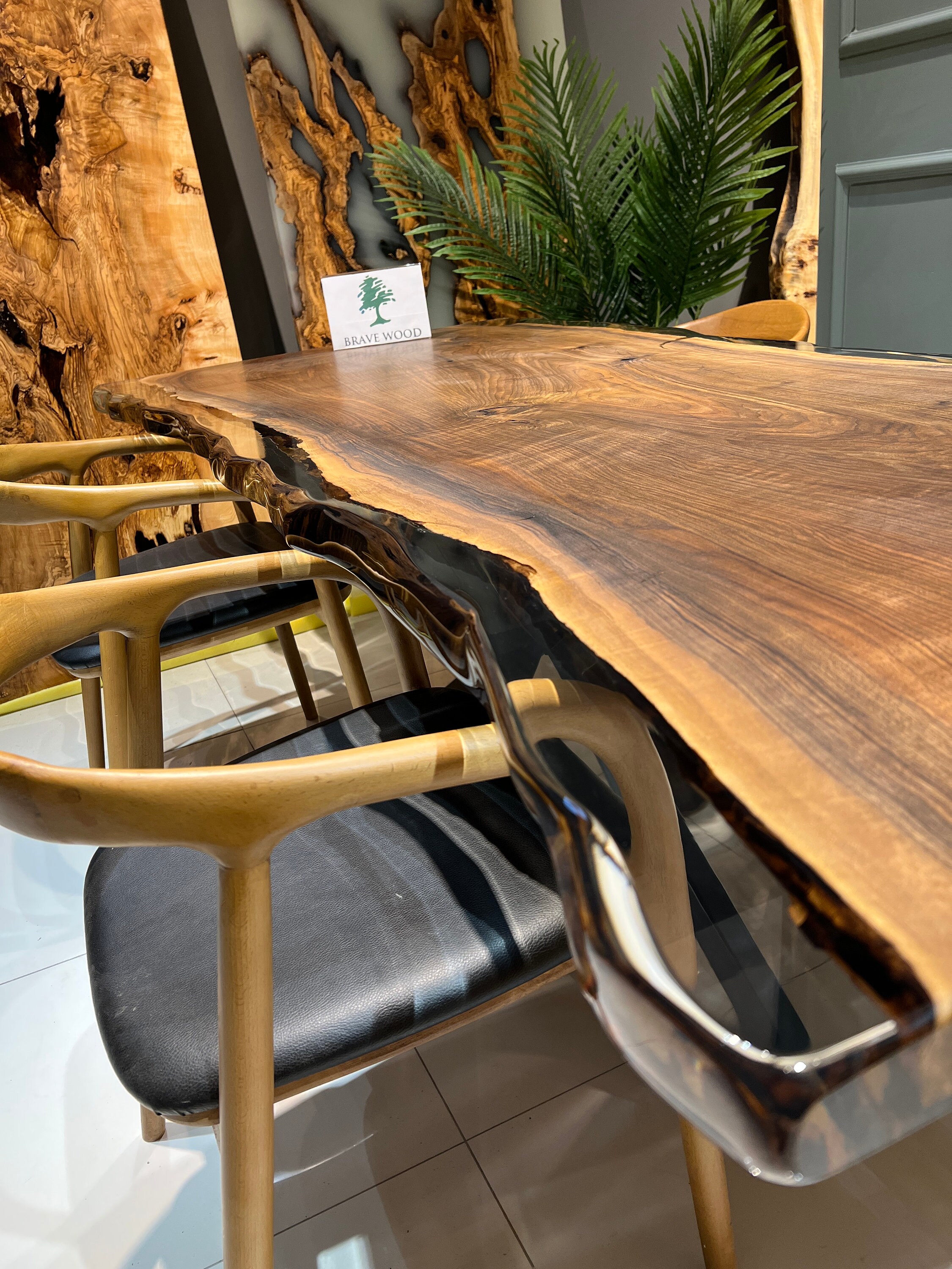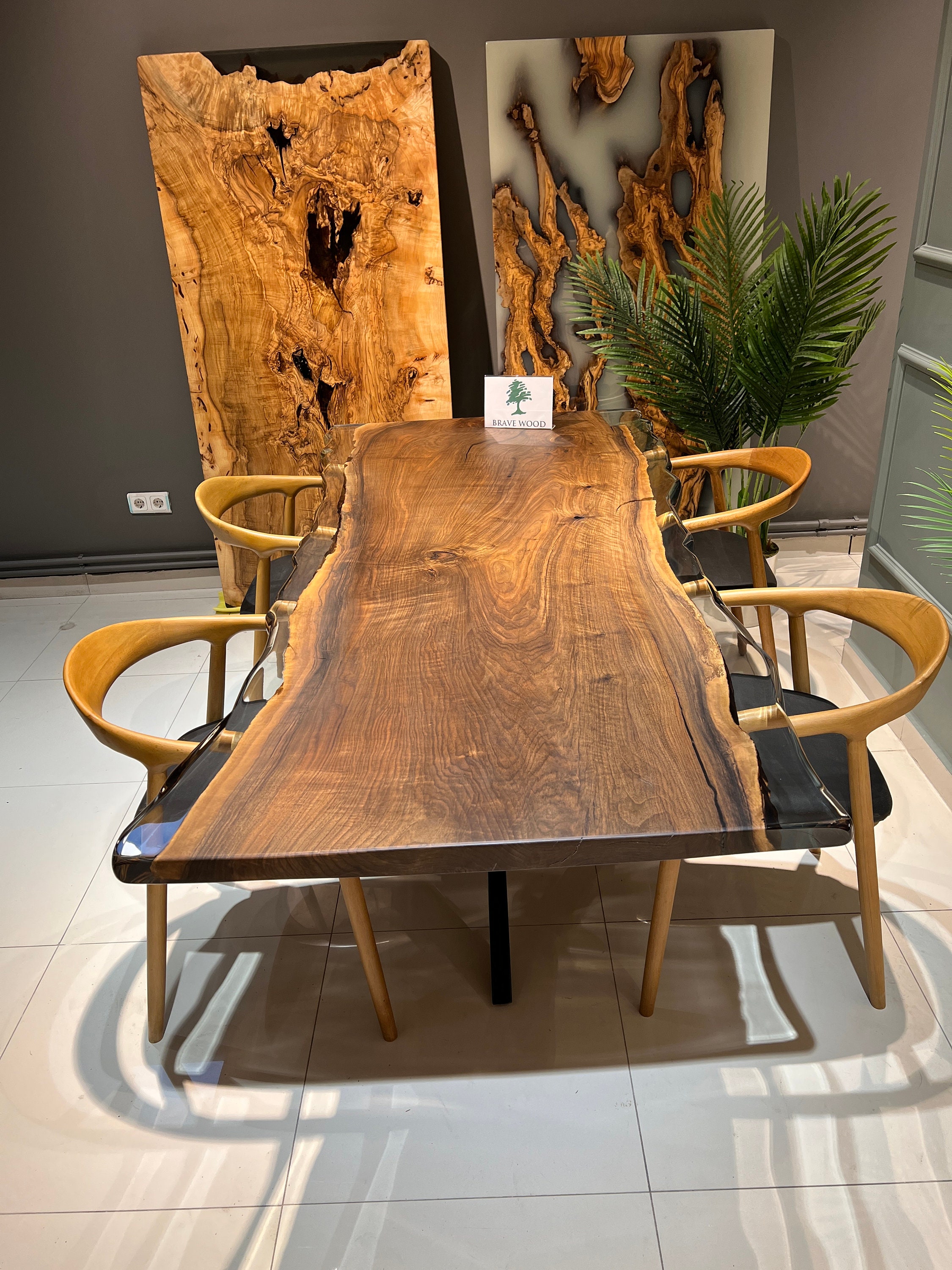 It is a special dark patterned walnut tree. It has been designed by preserving the natural appearance with a transparent epoxy around it.