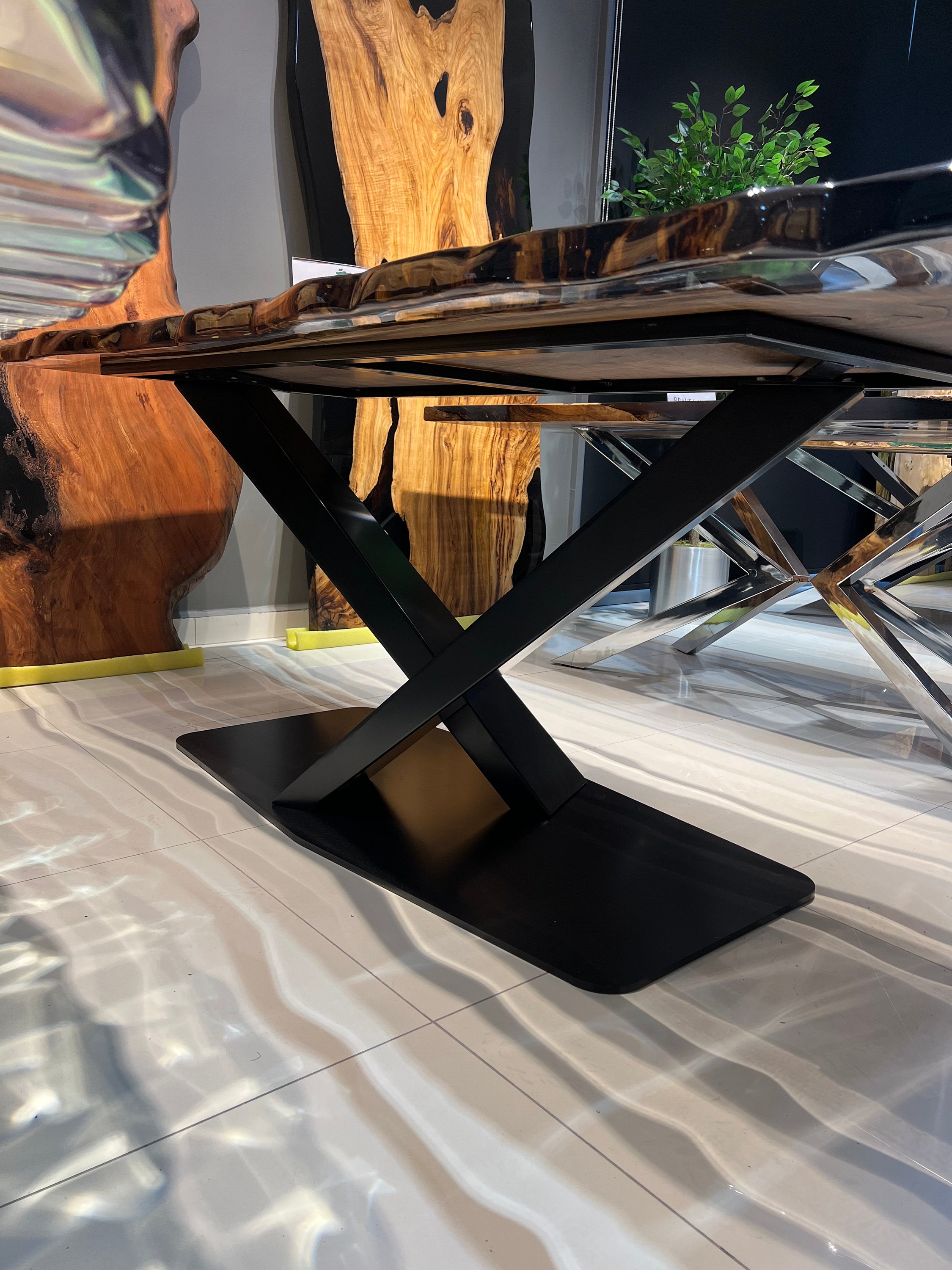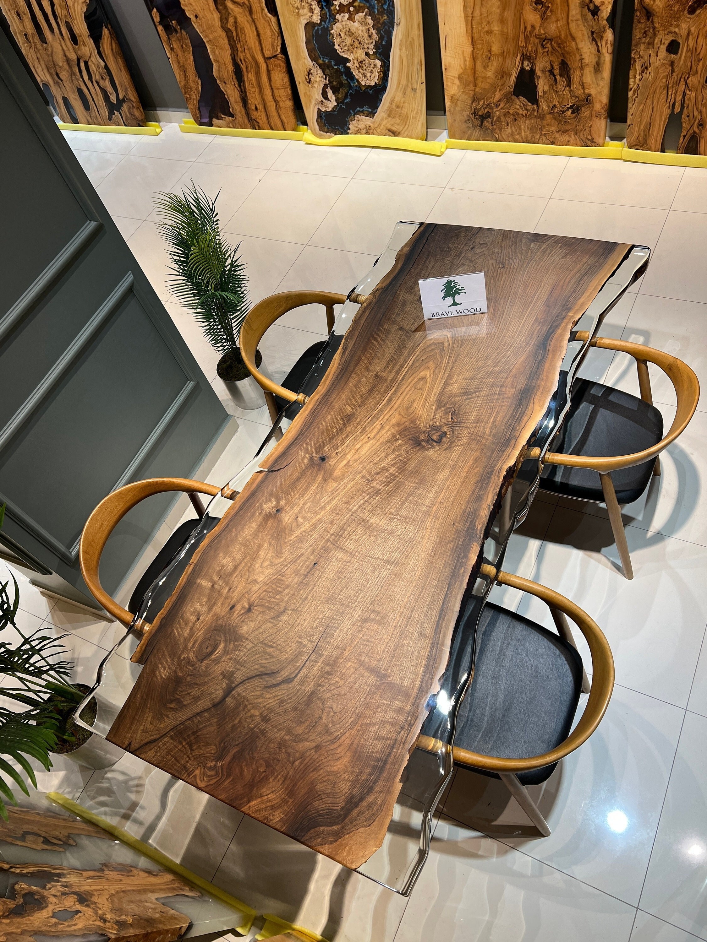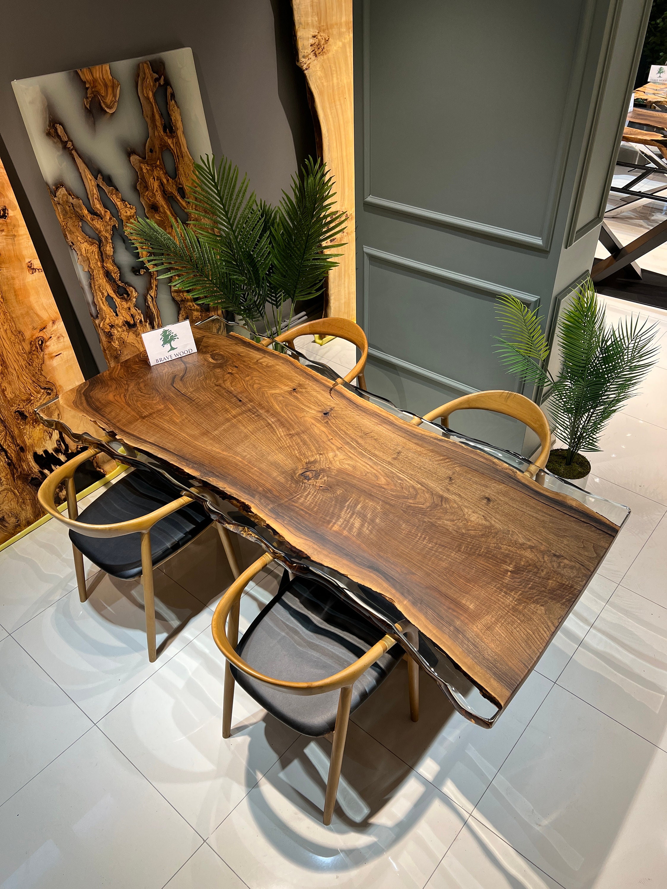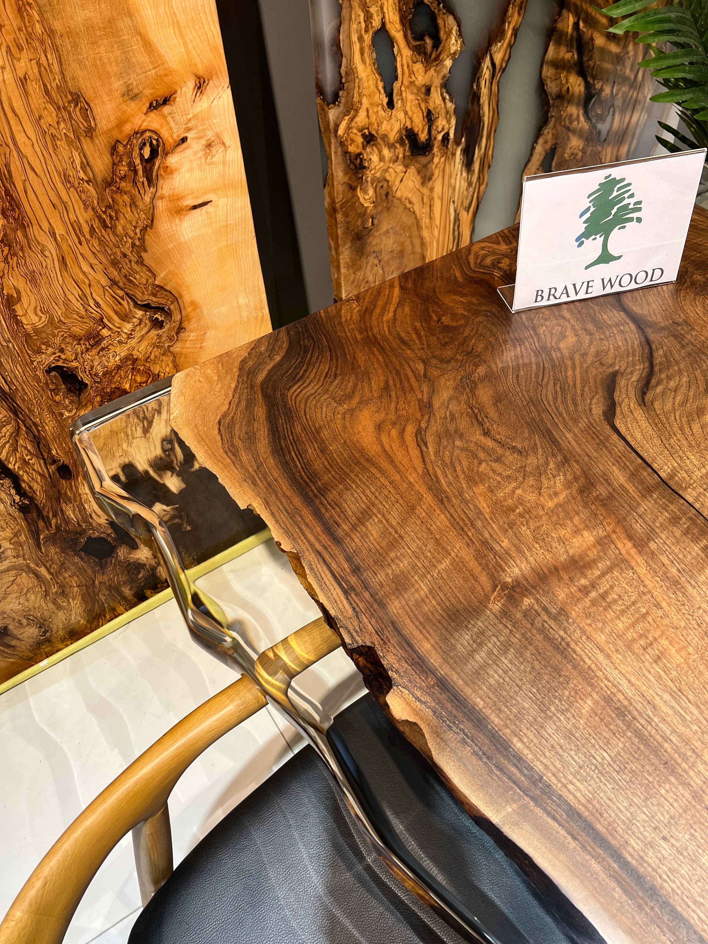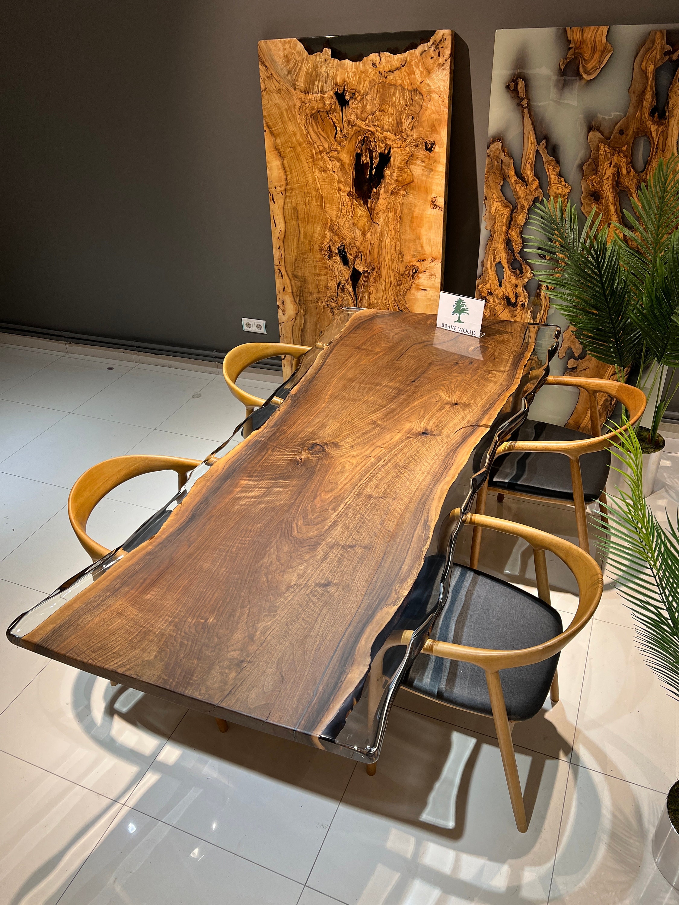 It is a special dark patterned walnut tree. It has been designed by preserving the natural appearance with a transparent epoxy around it.