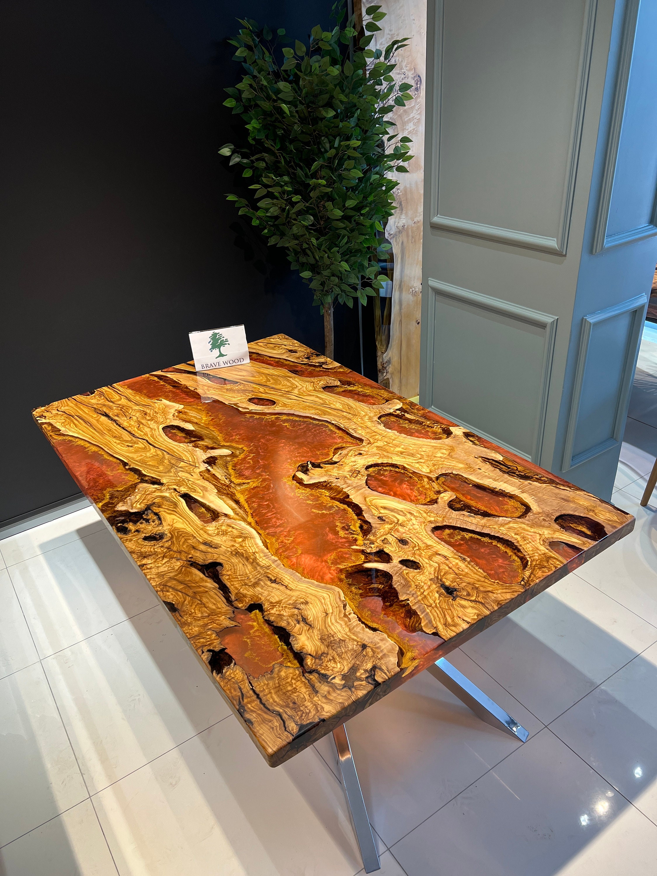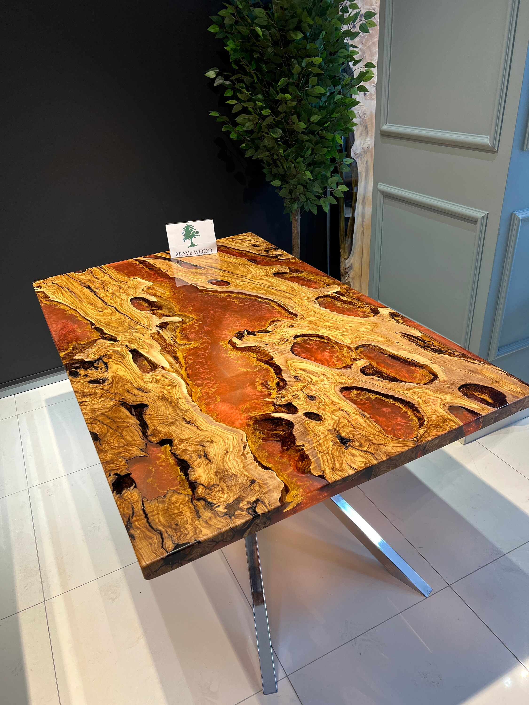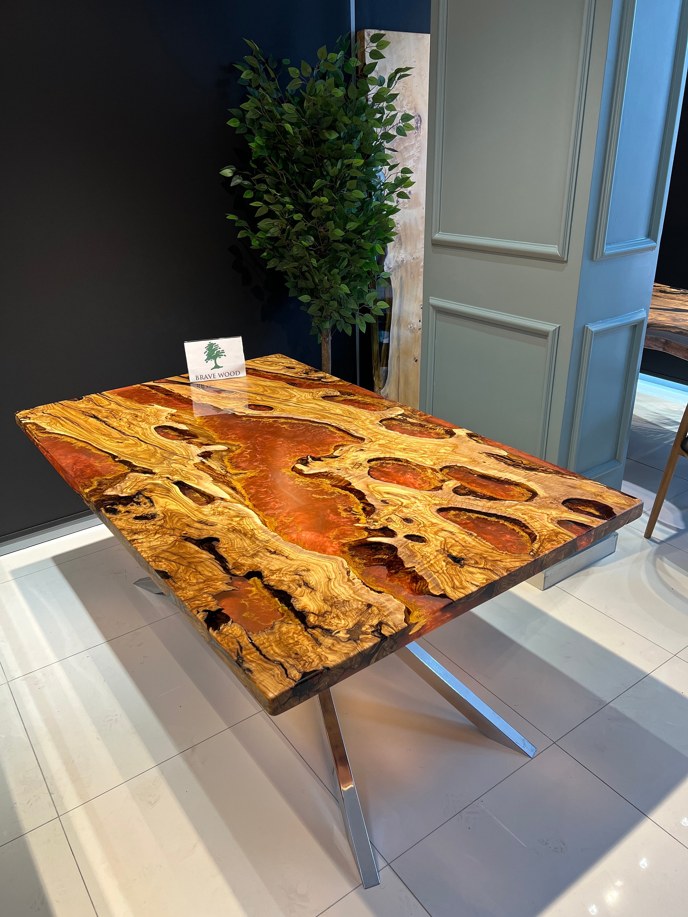 Olive Dining Table for your living room or kitchen. Custom made olive wood dining table with blue or green epoxy like river pattern. Unique, special design with soft edges and handmade production just for you, your home and your kitchen.
