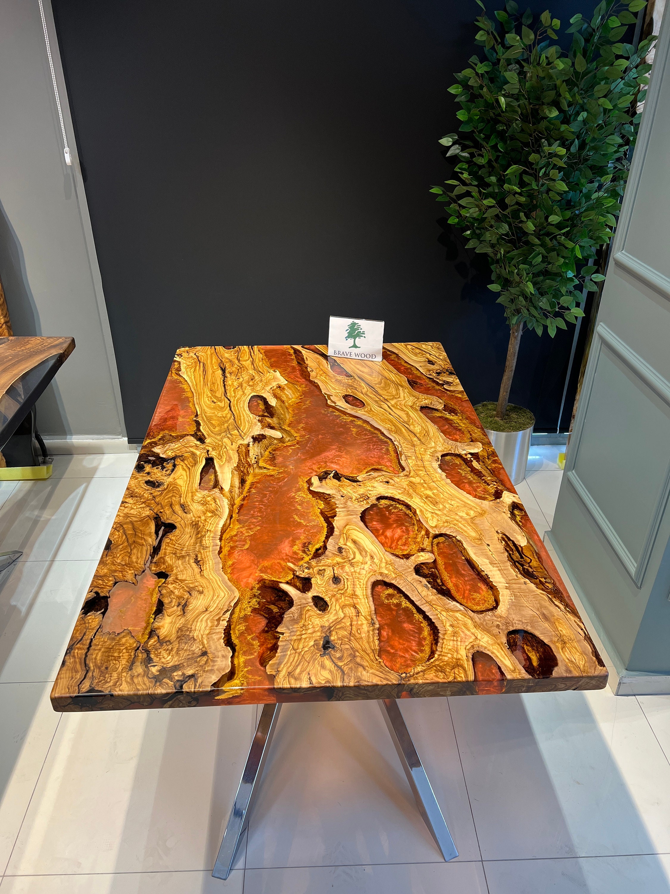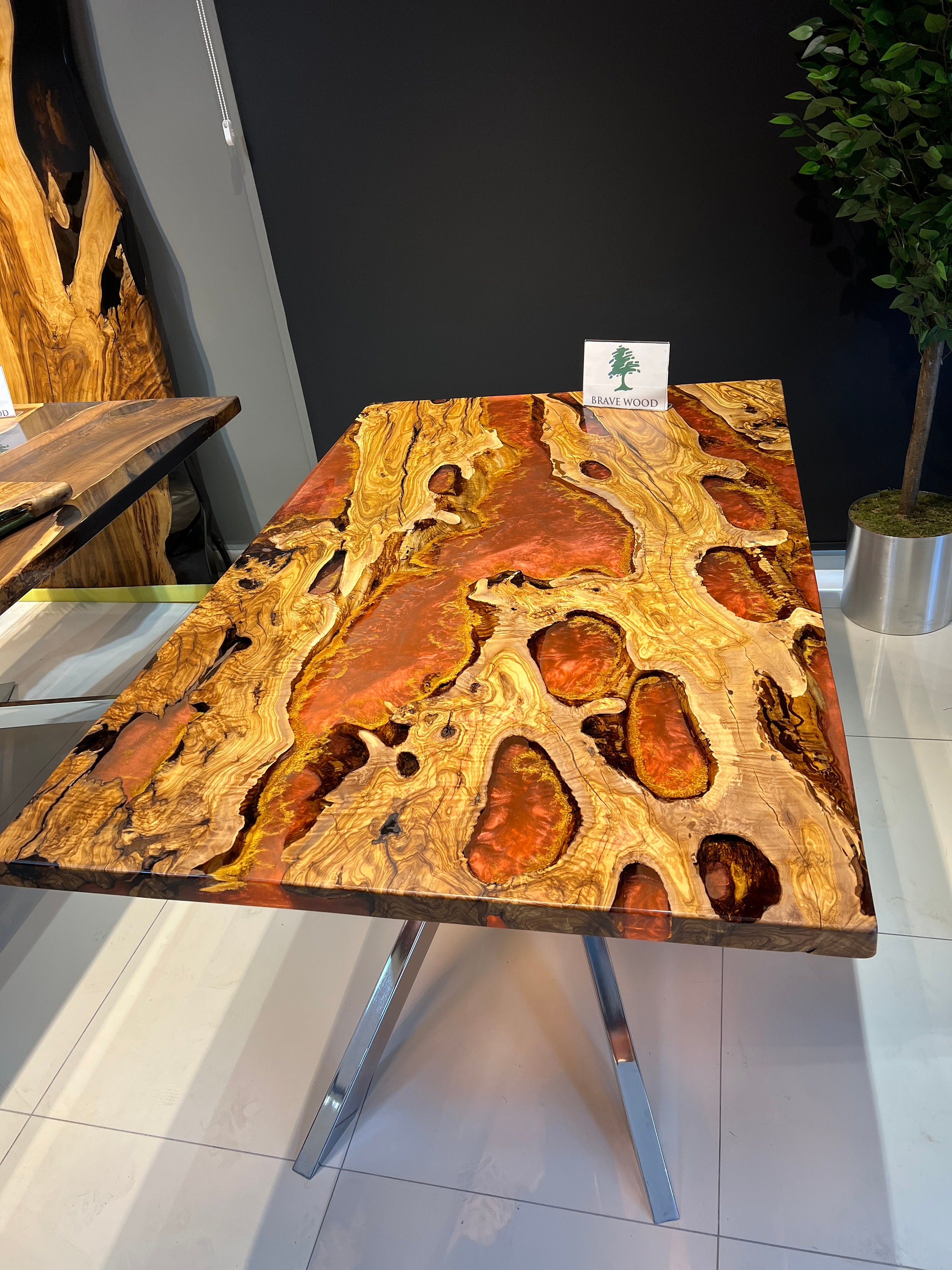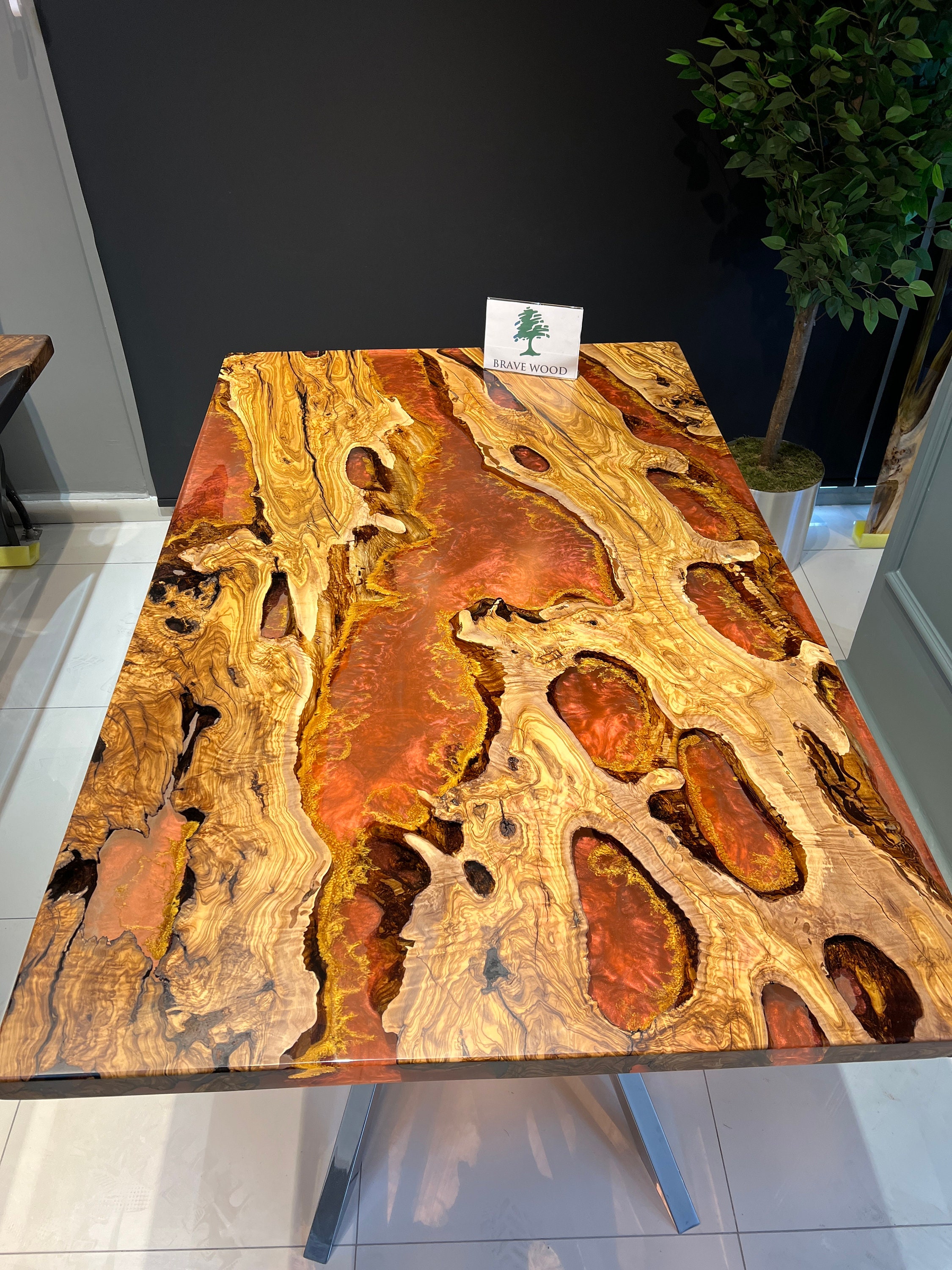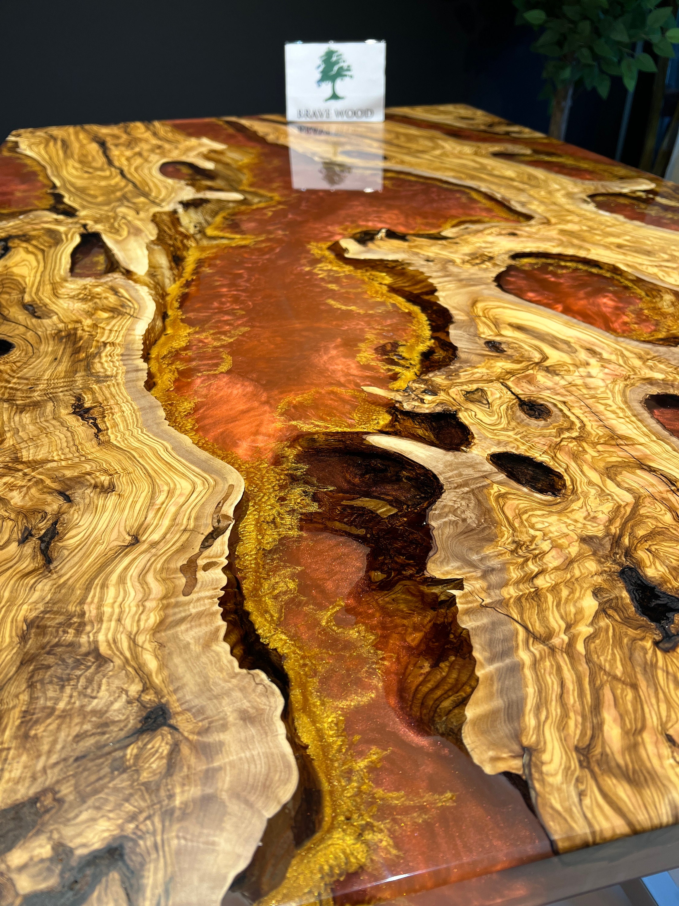Olive Dining Table for your living room or kitchen. Custom made olive wood dining table with blue or green epoxy like river pattern. Unique, special design with soft edges and handmade production just for you, your home and your kitchen.