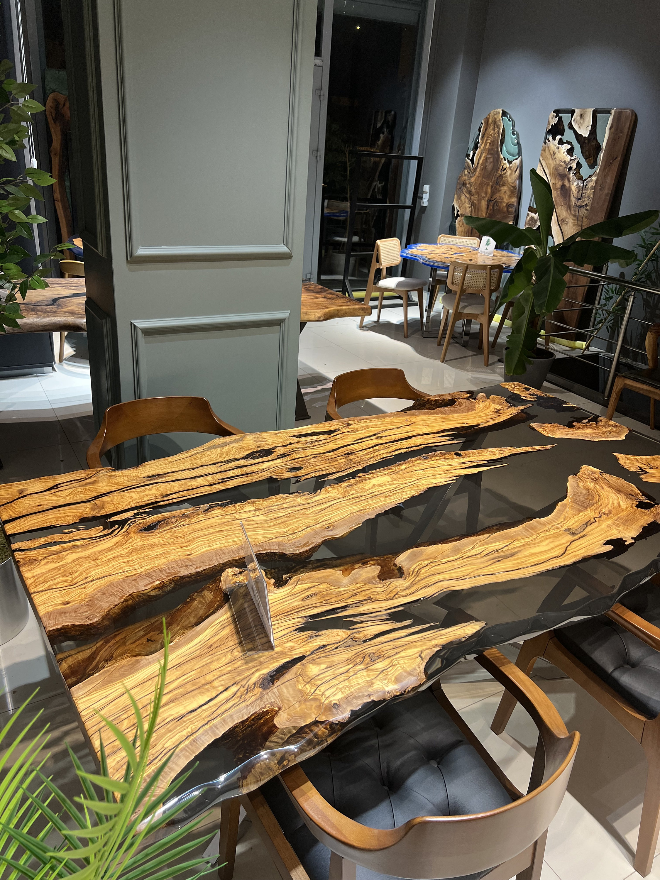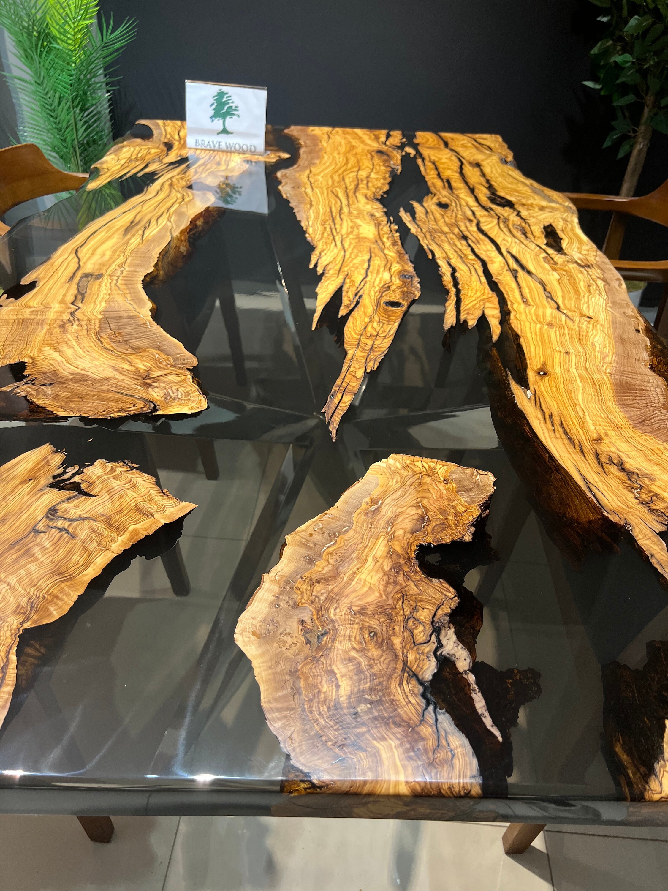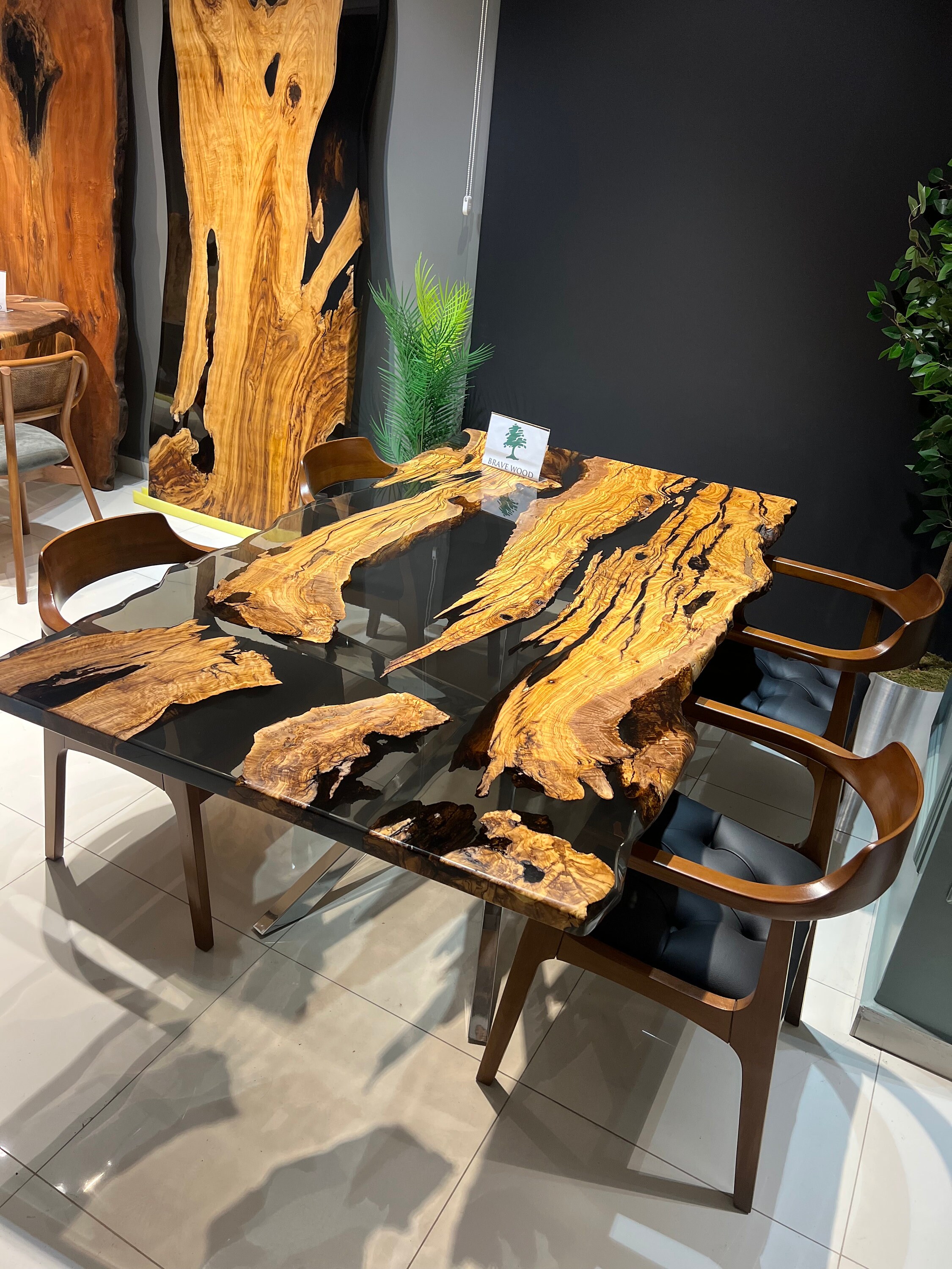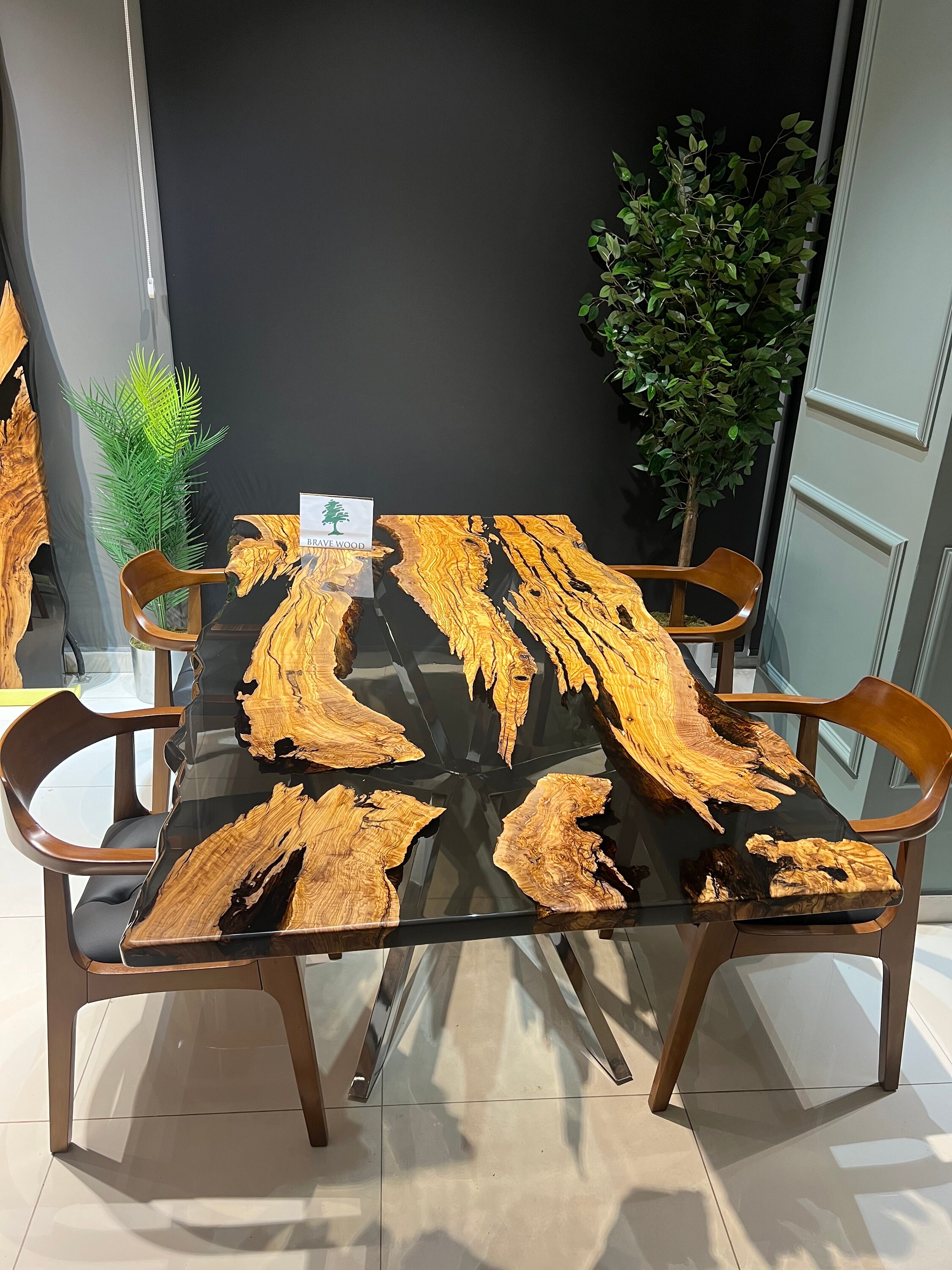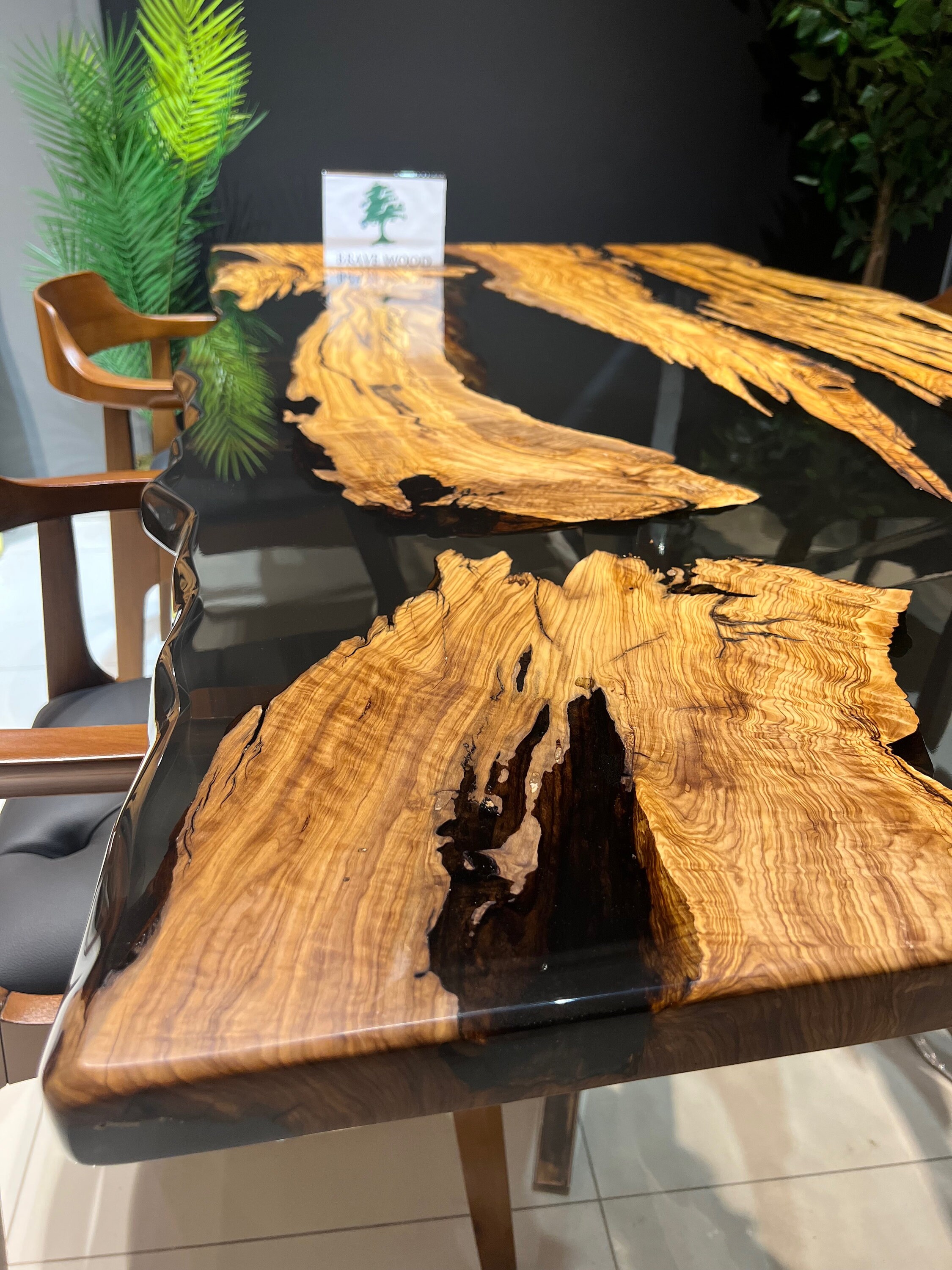 Olive Dining Table for your living room or kitchen. Custom made olive wood dining table with blue or green epoxy like river pattern. Unique, special design with soft edges and handmade production just for you, your home and your kitchen.