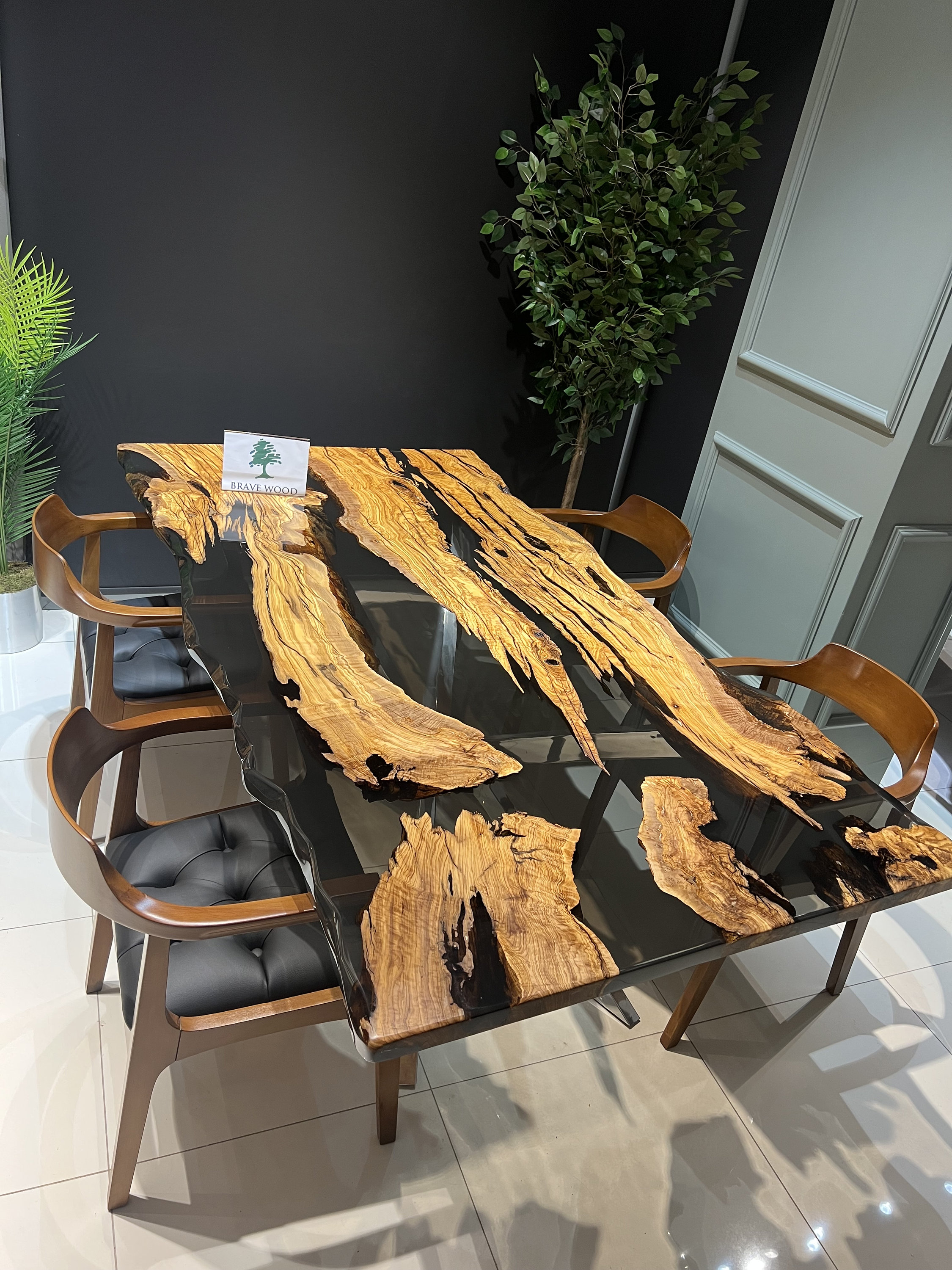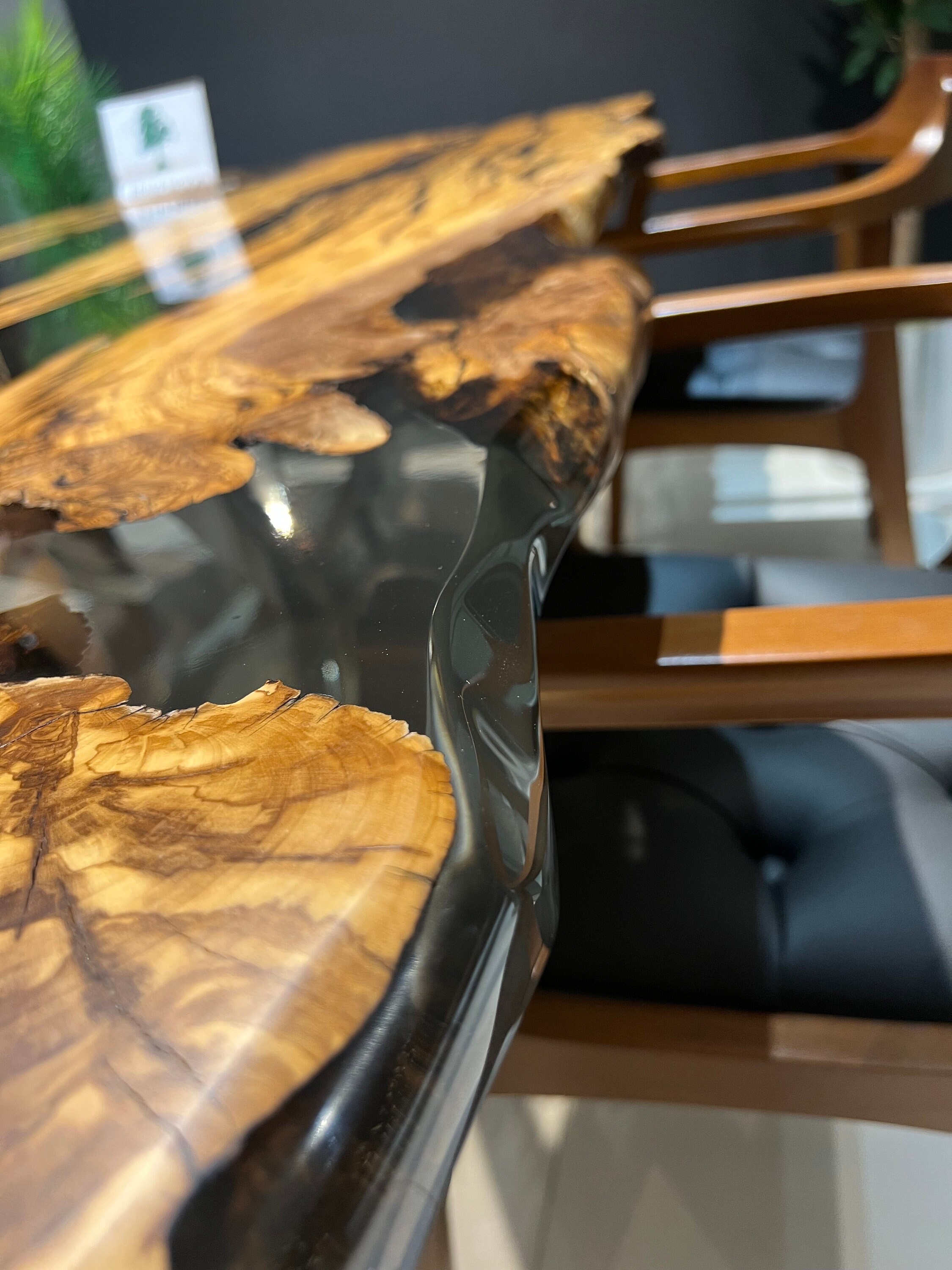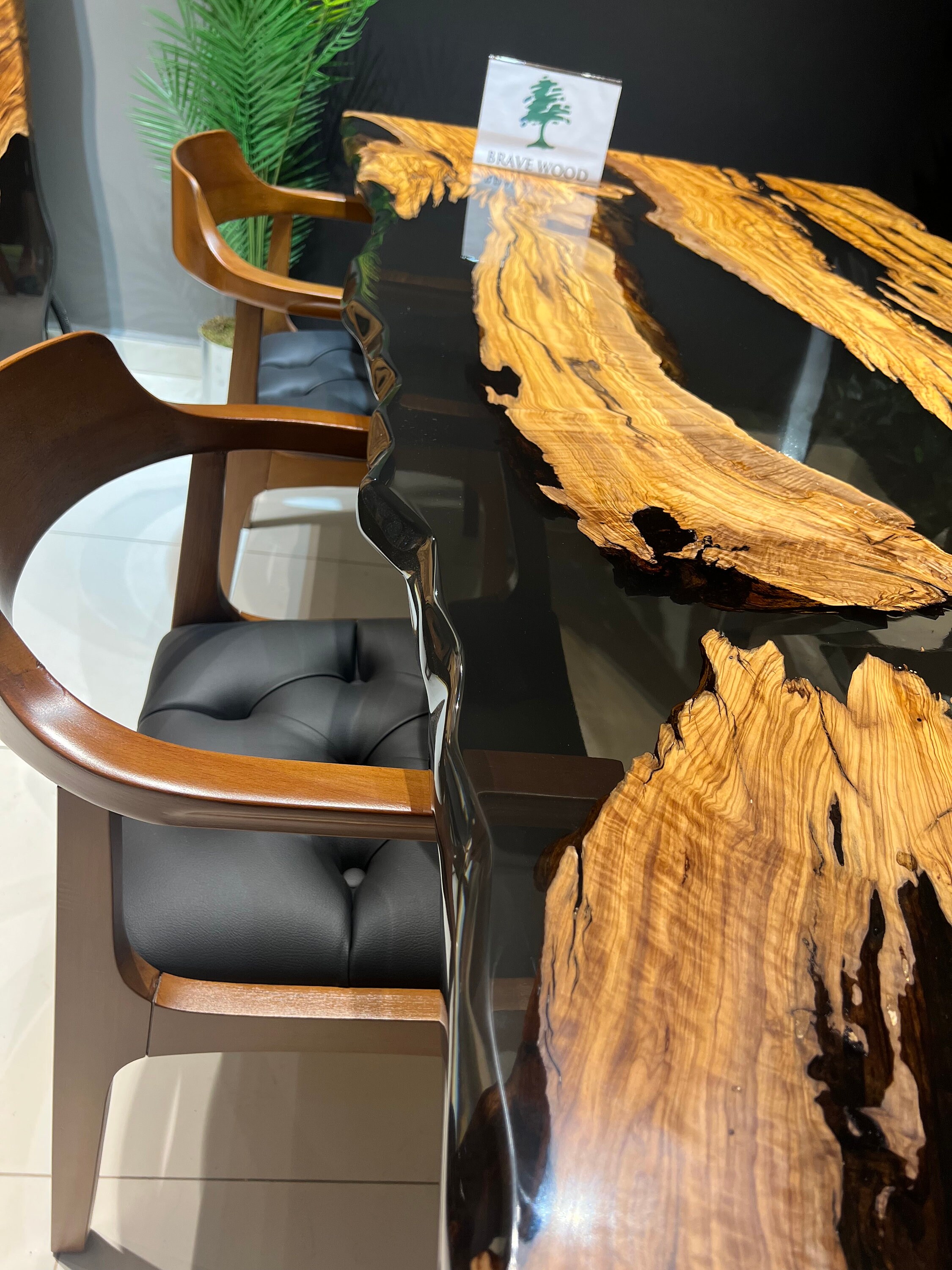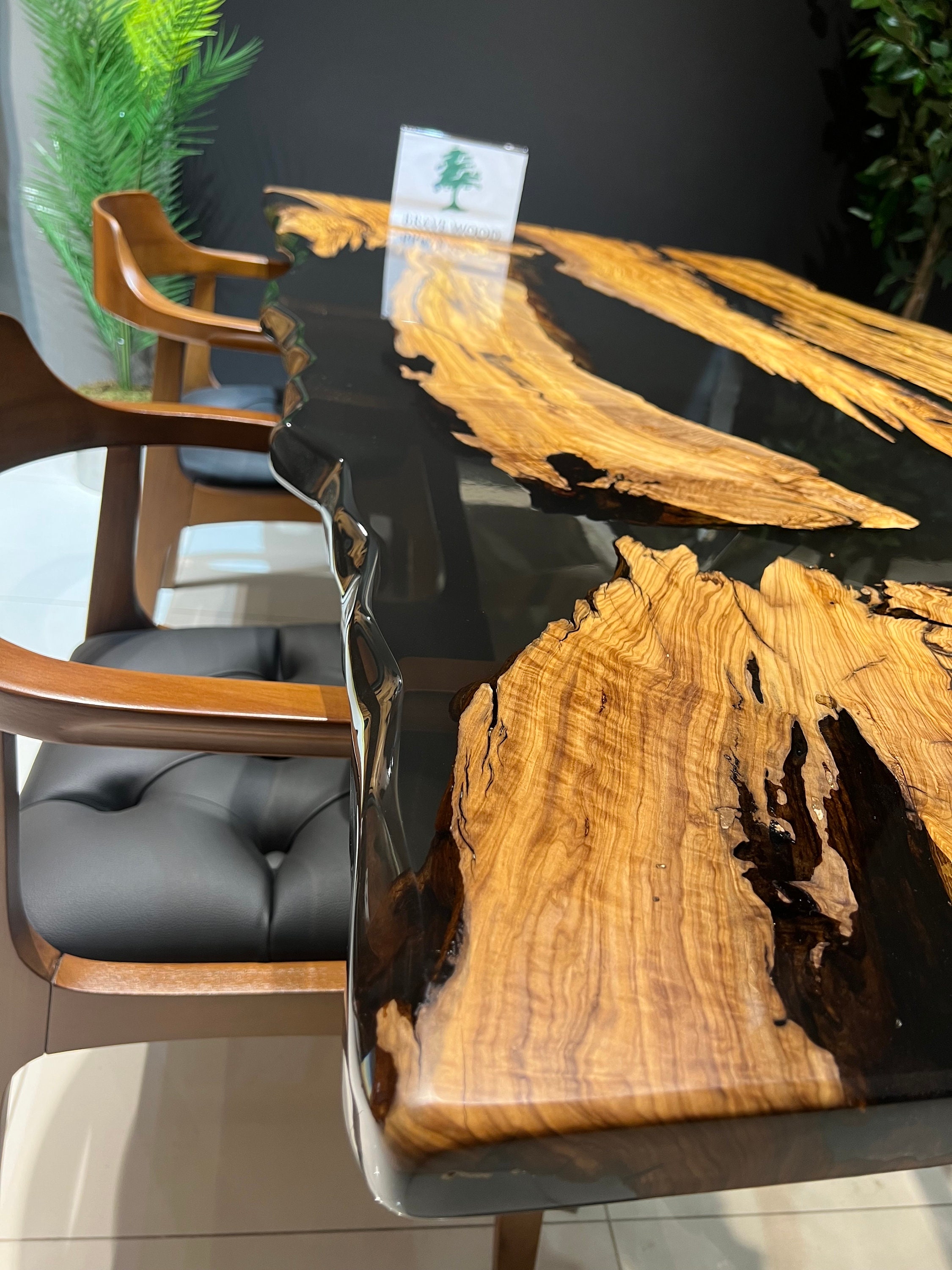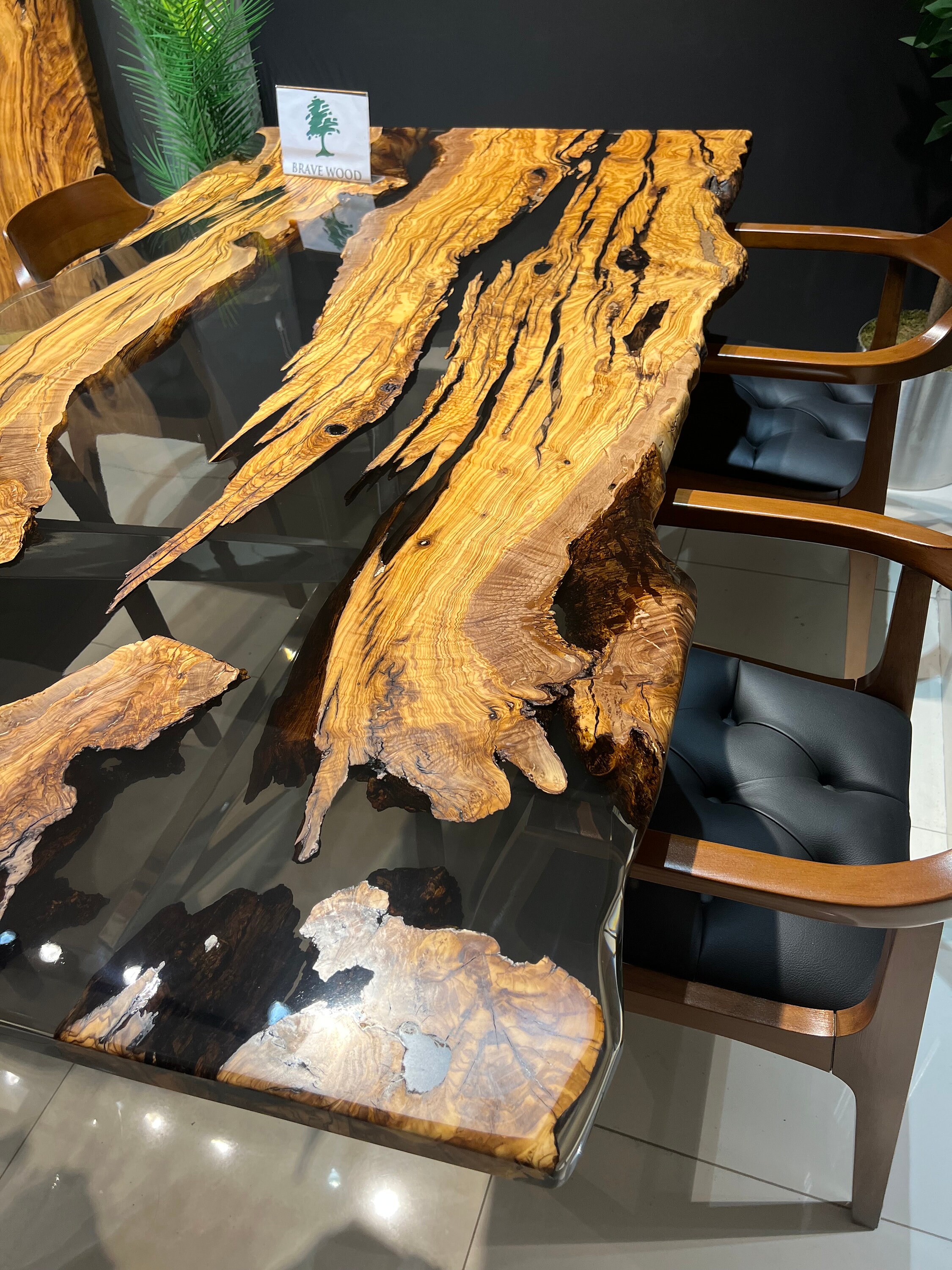 Olive Dining Table for your living room or kitchen. Custom made olive wood dining table with blue or green epoxy like river pattern. Unique, special design with soft edges and handmade production just for you, your home and your kitchen.