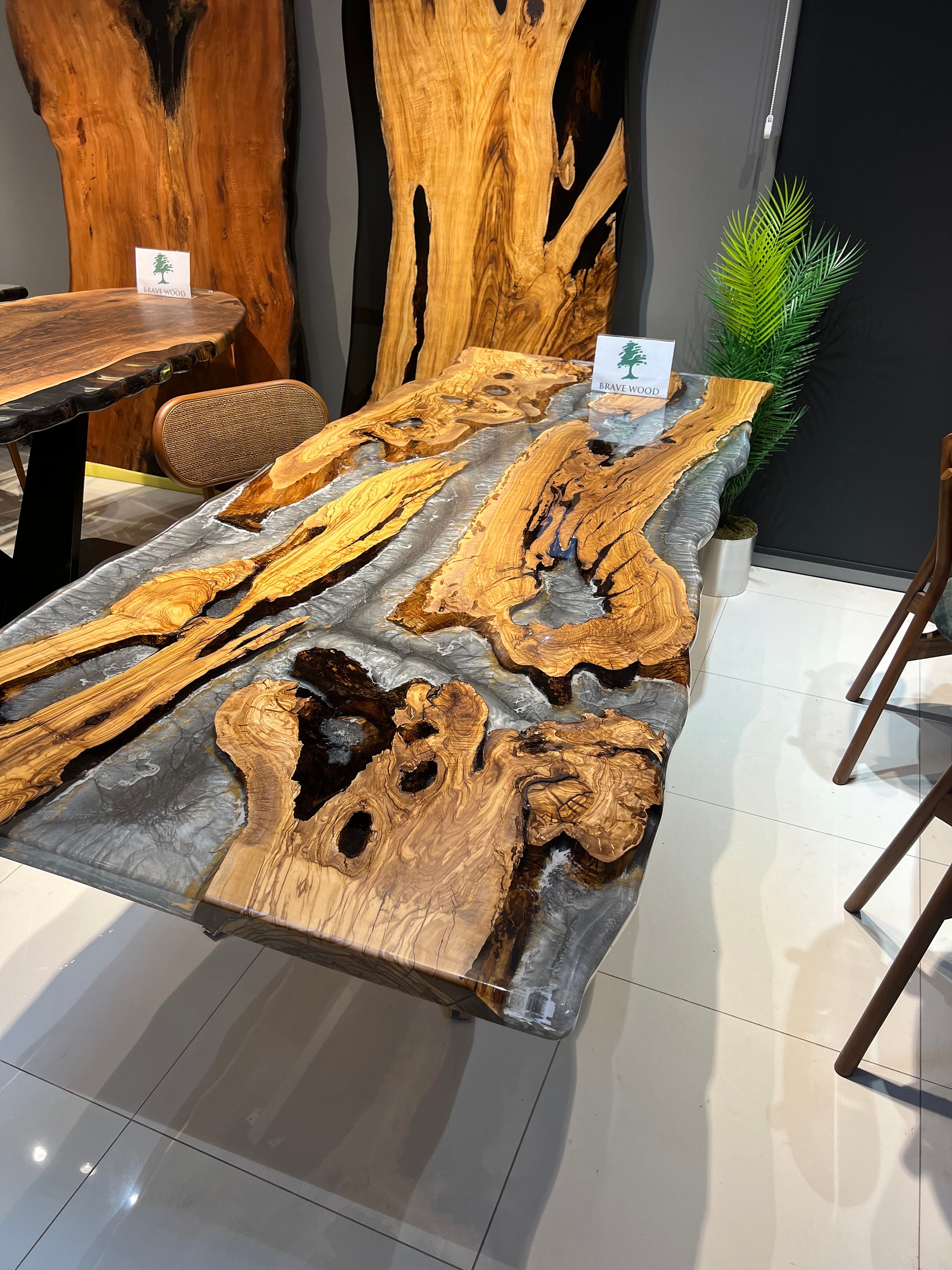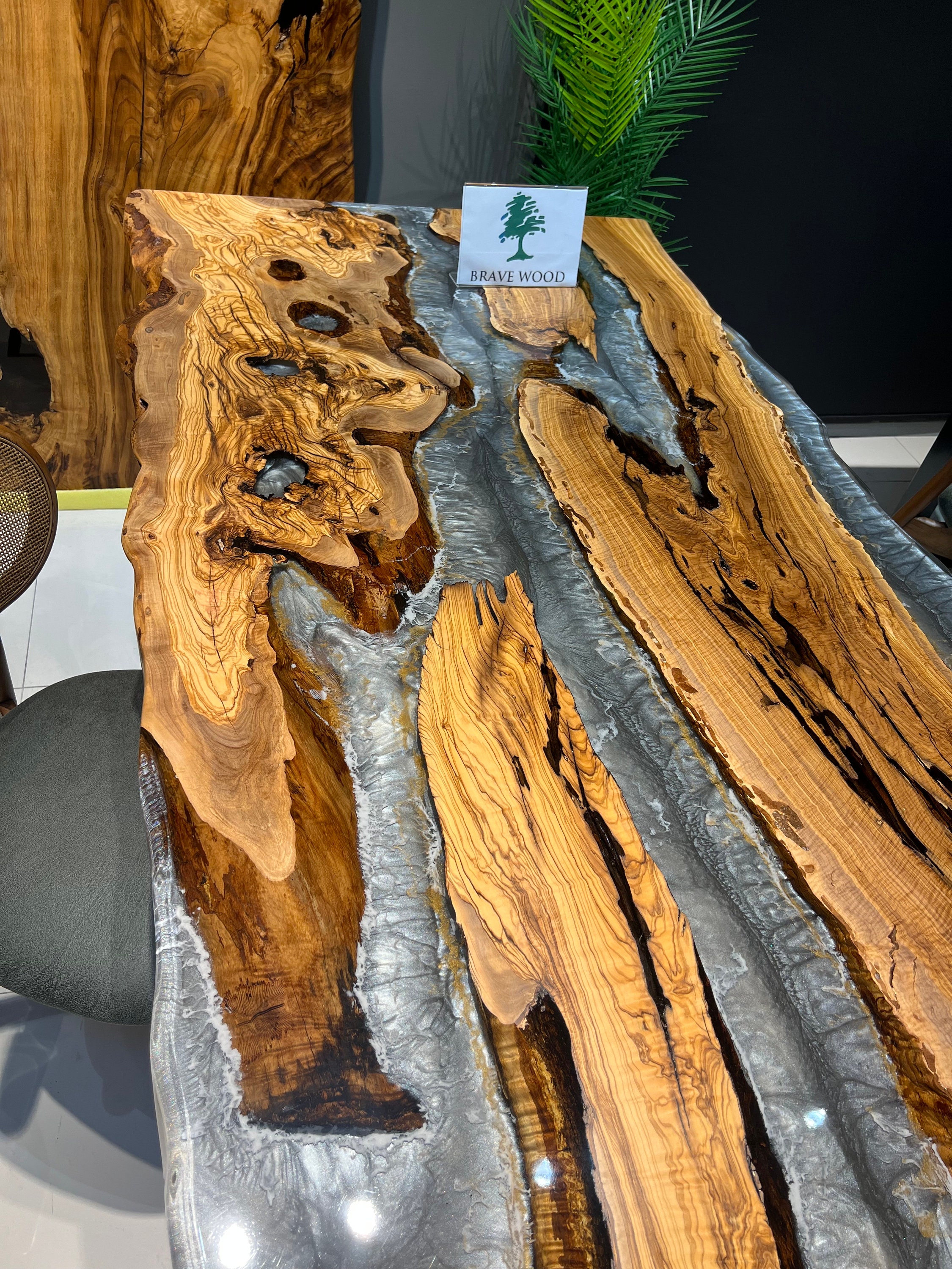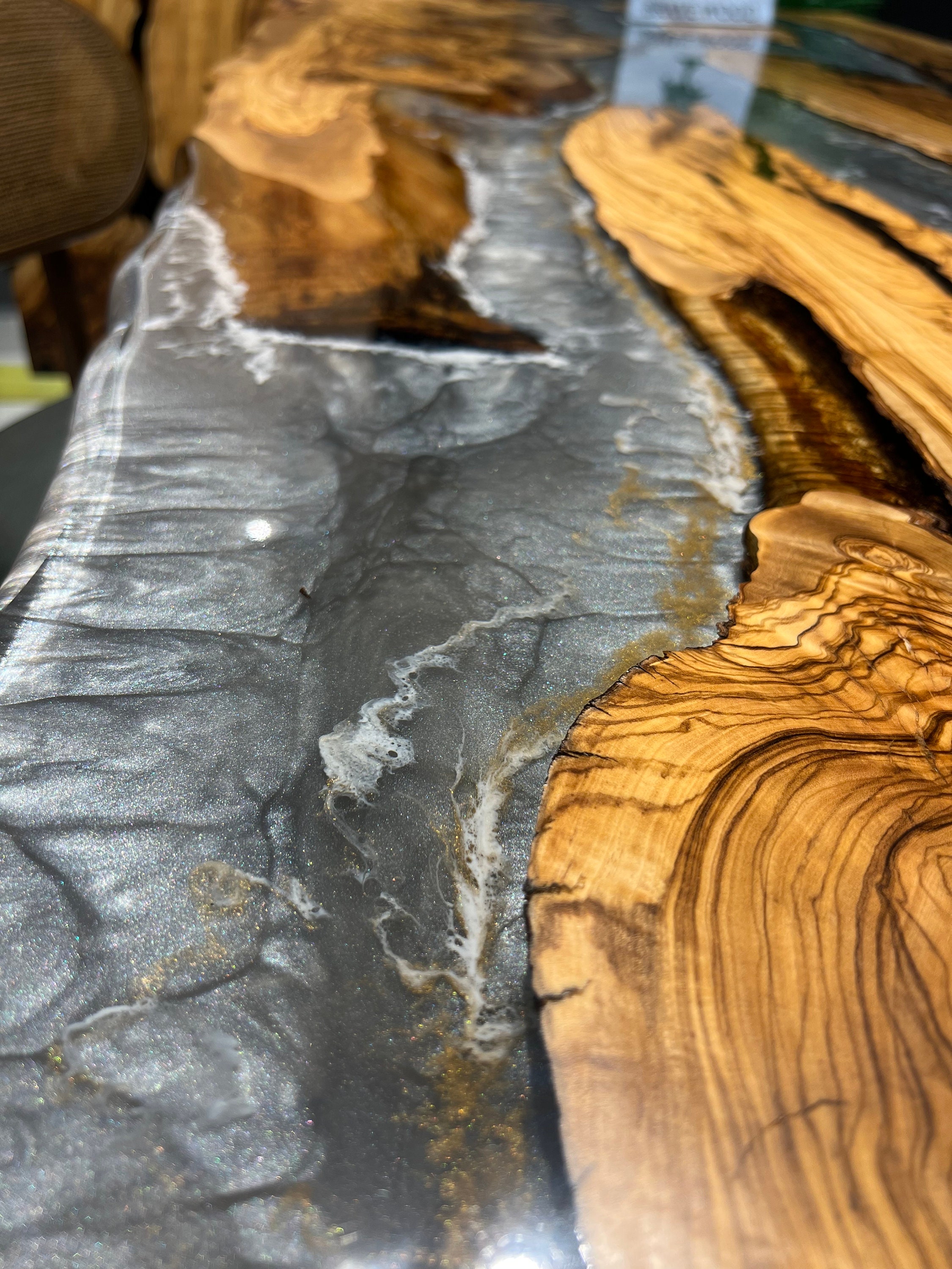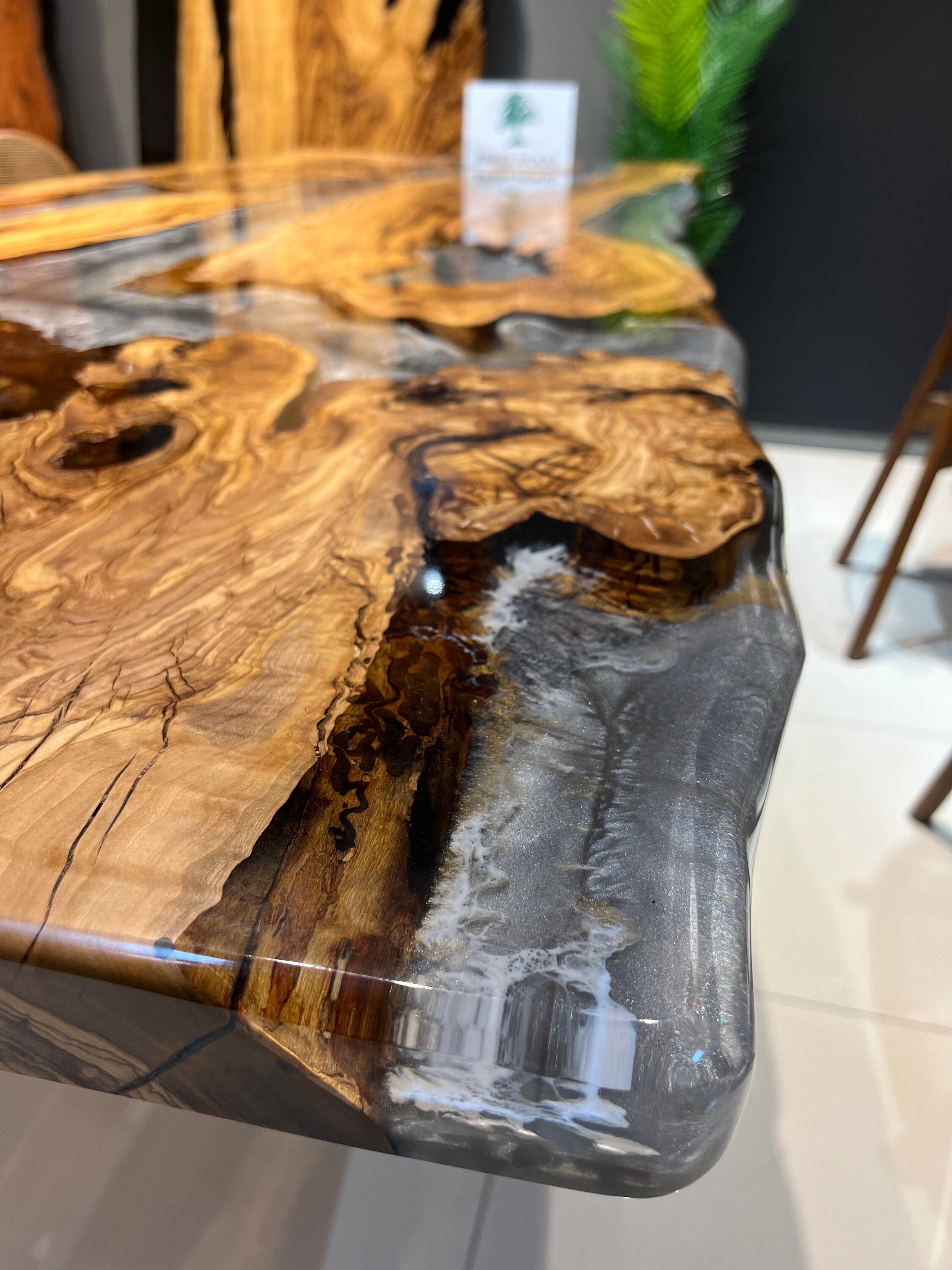 Olive Dining Table for your living room or kitchen. Custom made olive wood dining table with blue or green epoxy like river pattern. Unique, special design with soft edges and handmade production just for you, your home and your kitchen.
