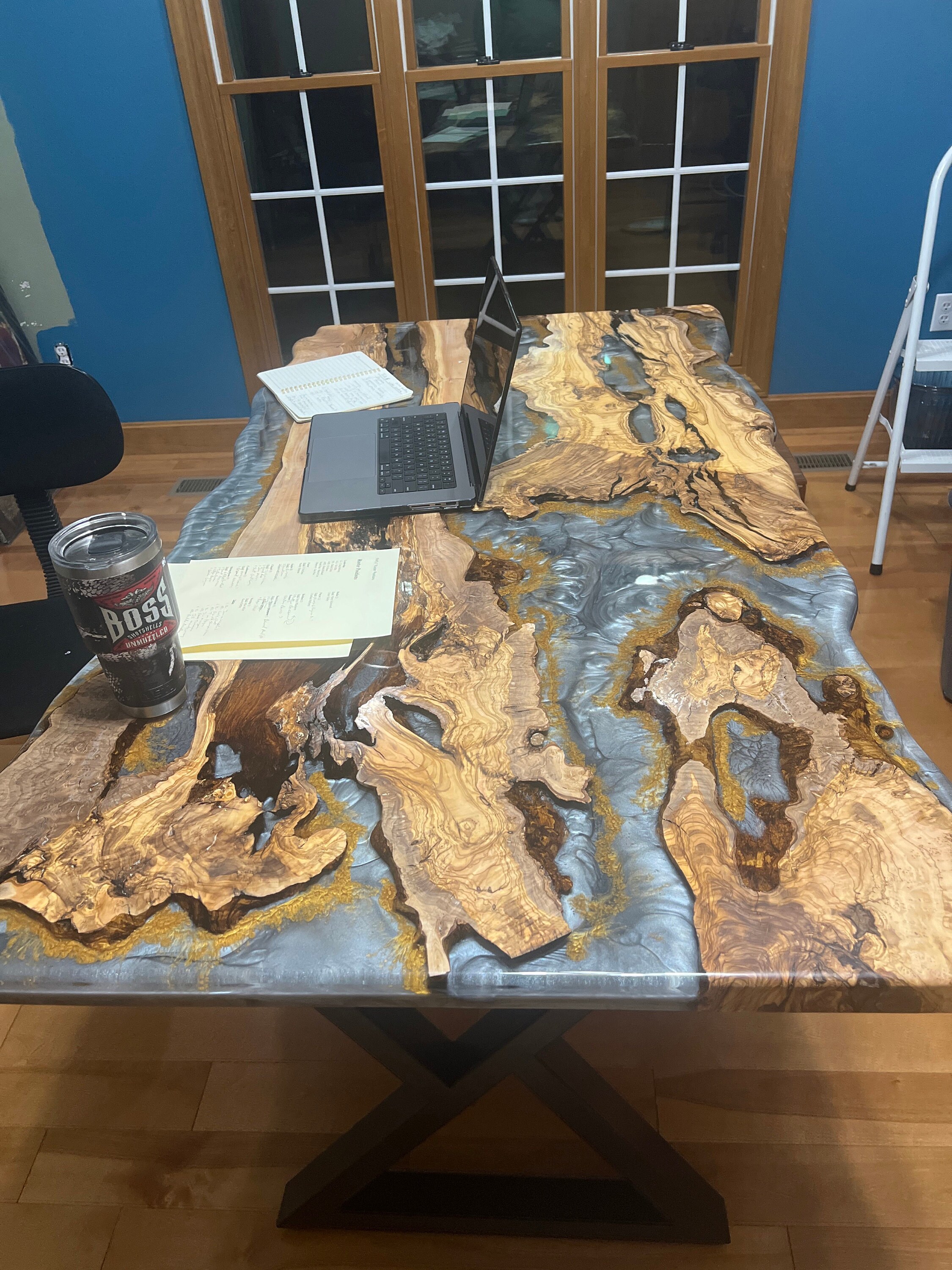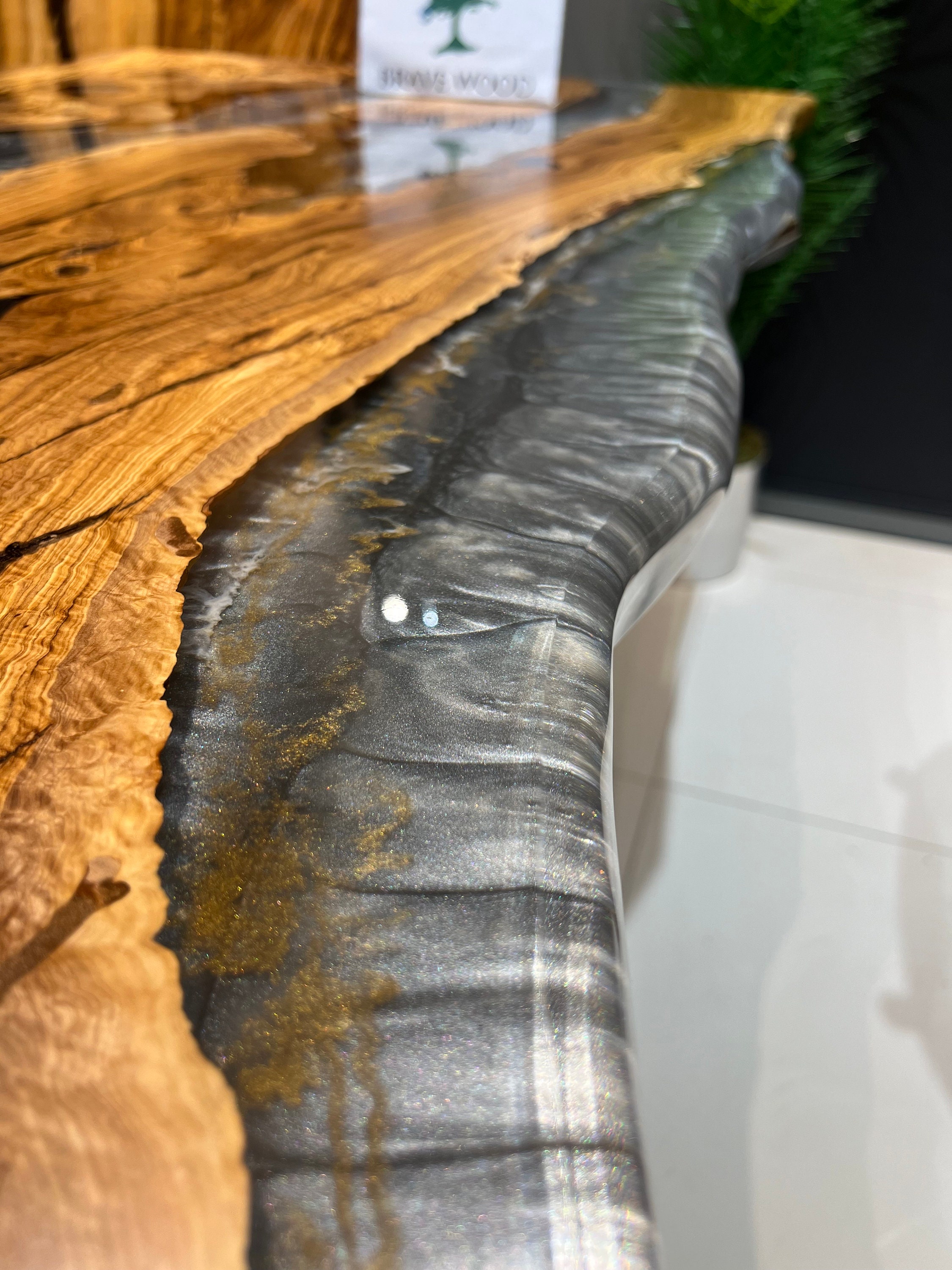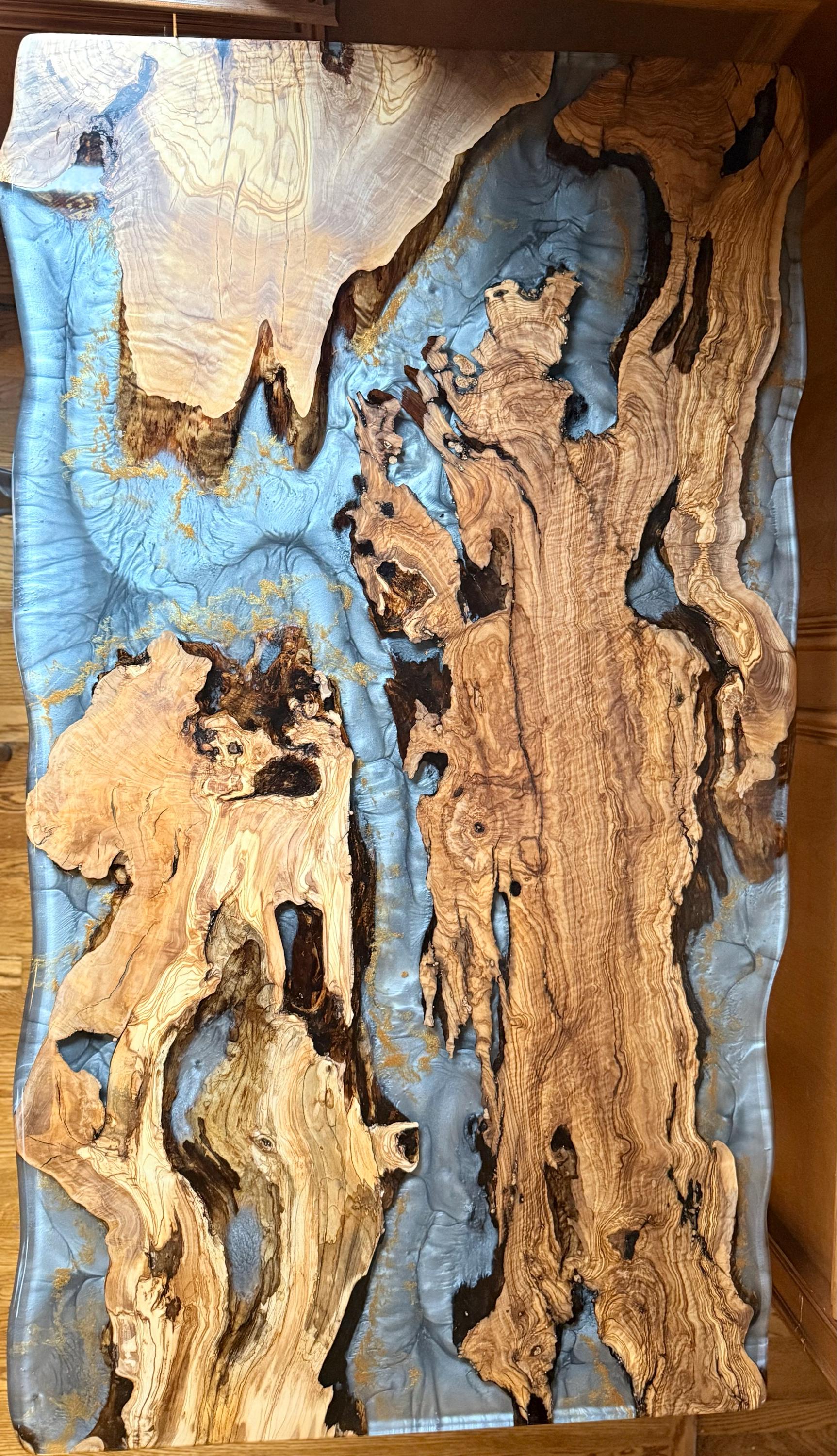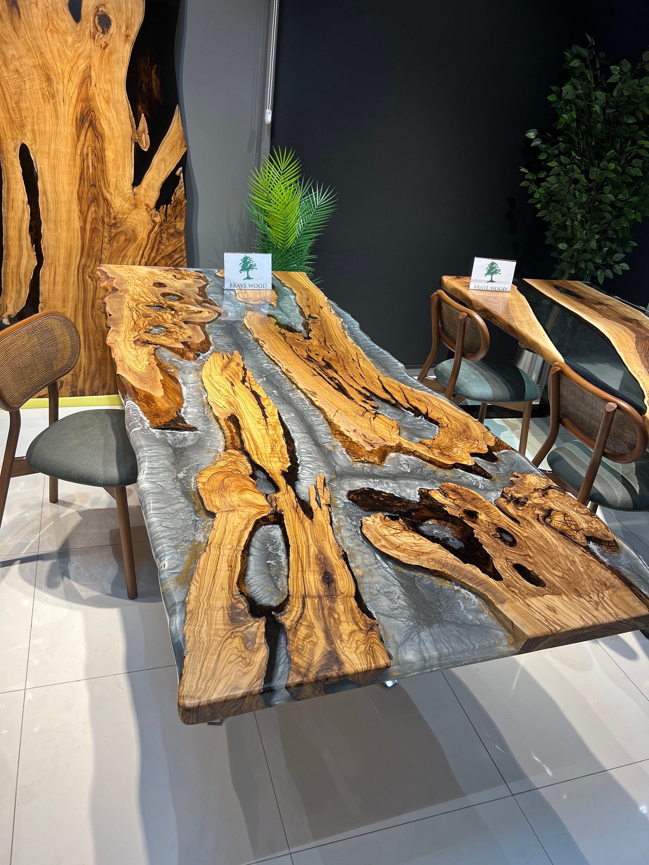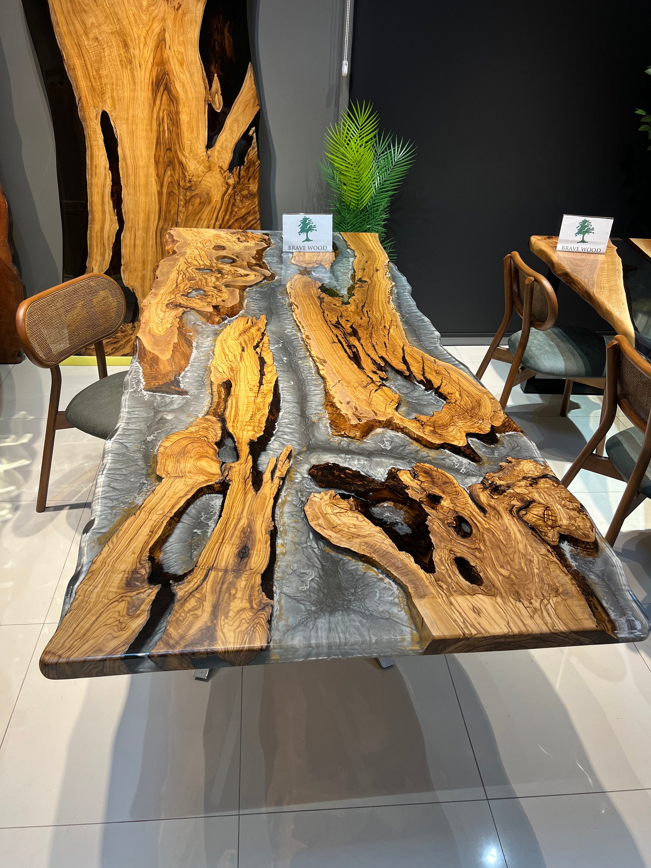 Olive Dining Table for your living room or kitchen. Custom made olive wood dining table with blue or green epoxy like river pattern. Unique, special design with soft edges and handmade production just for you, your home and your kitchen.