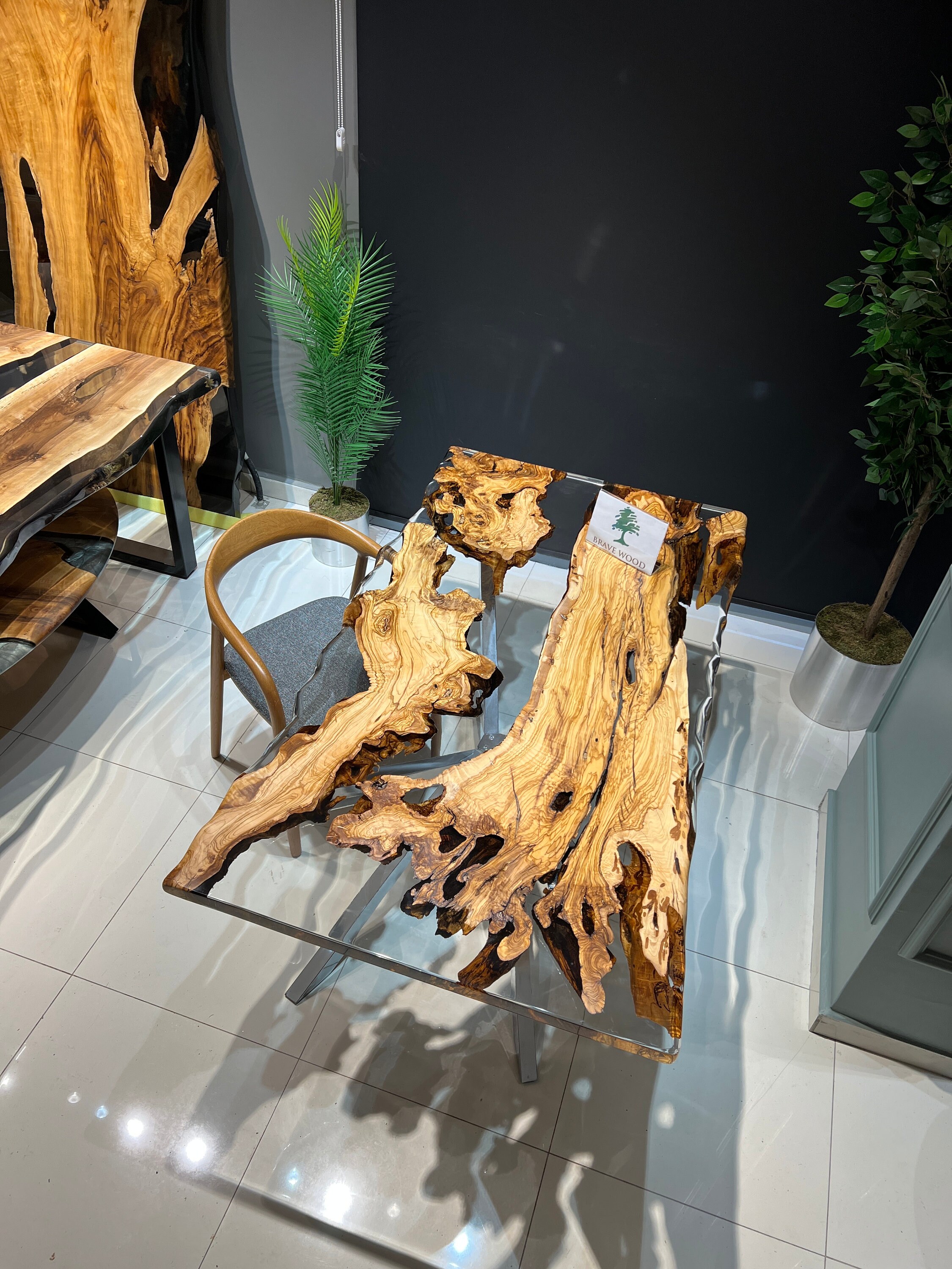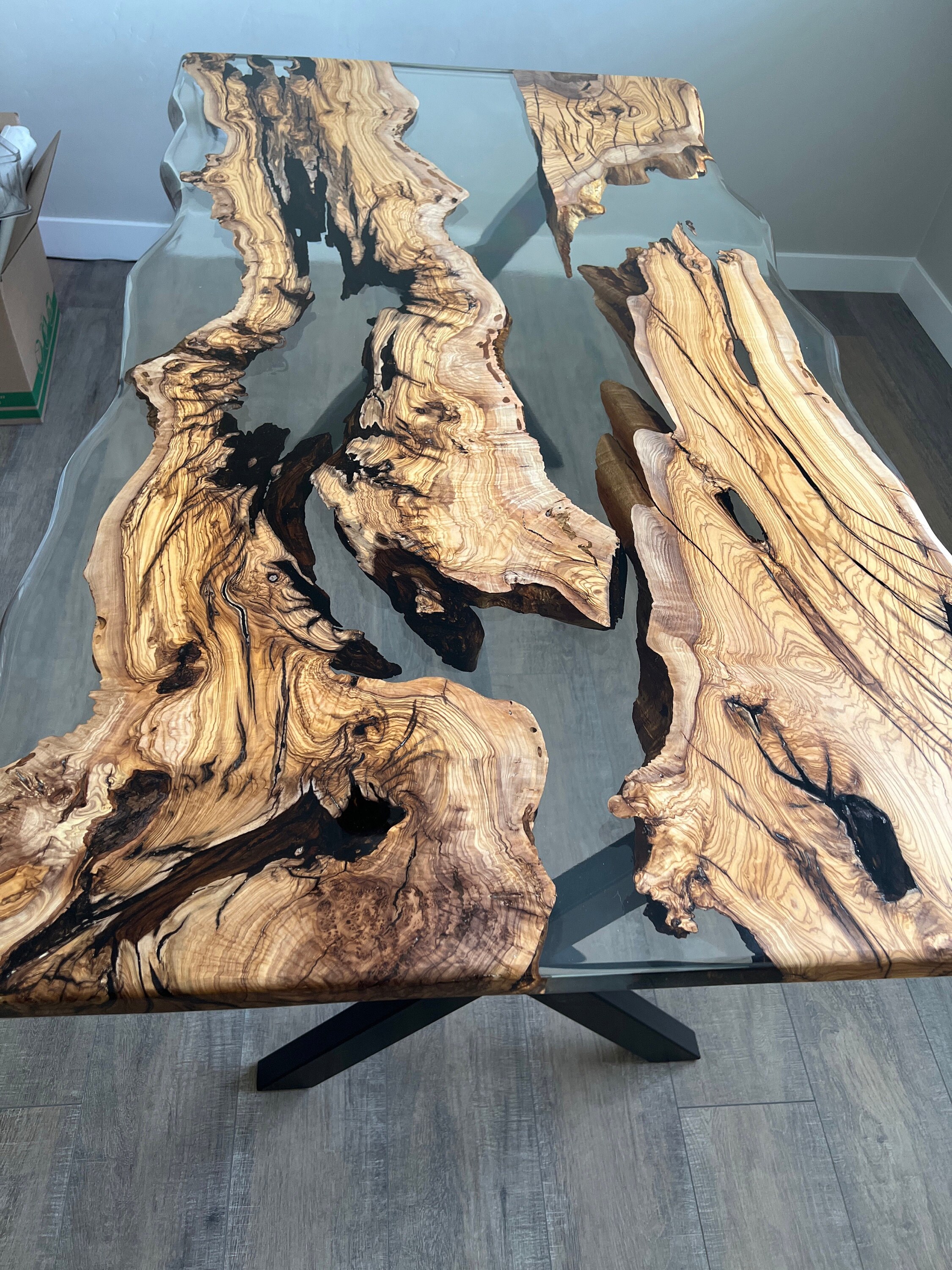 Olive Dining Table for your living room or kitchen. Custom made olive wood dining table with clear epoxy like river pattern. Unique, special design with soft edges and handmade production just for you, your home and your kitchen.
