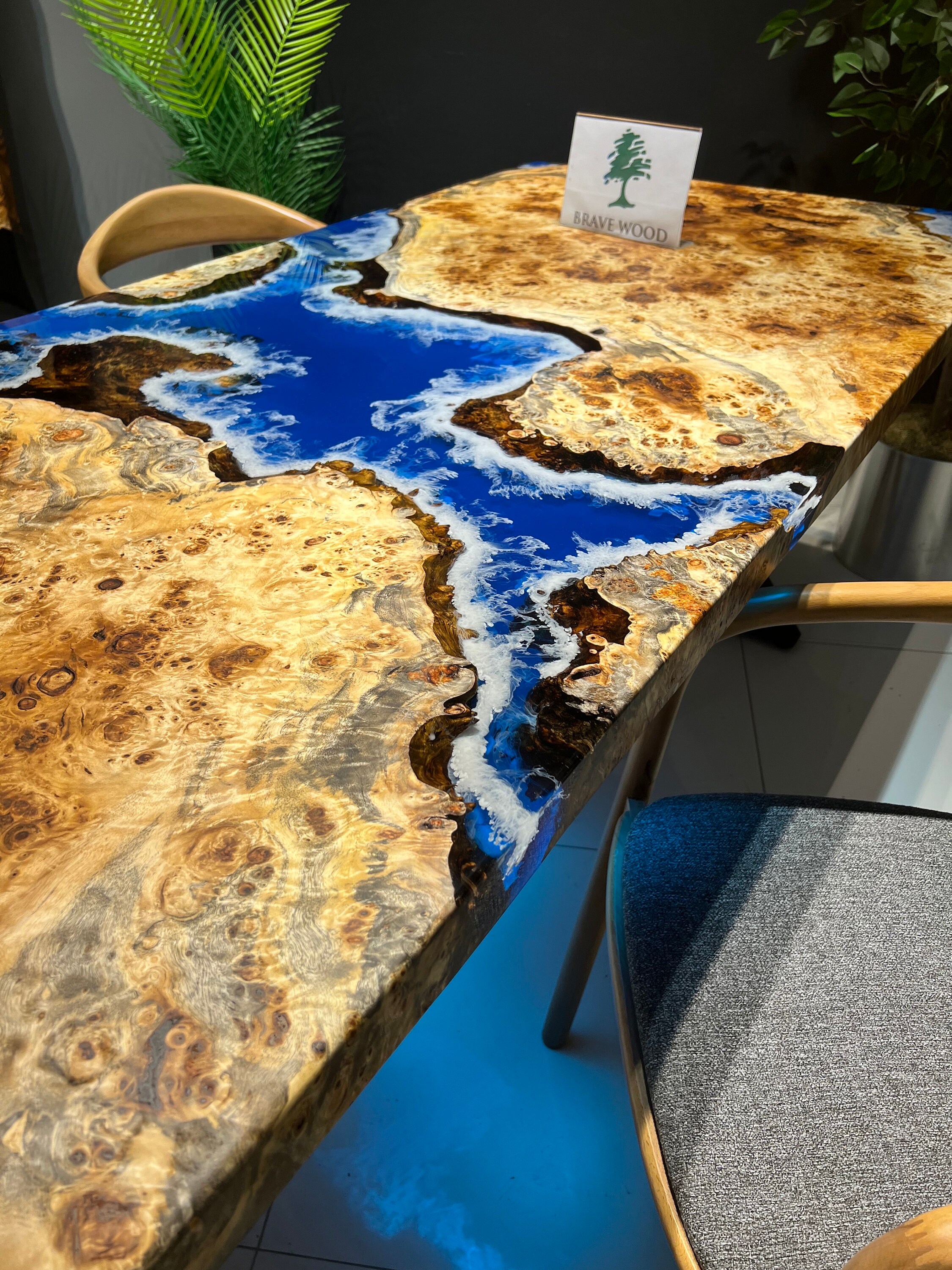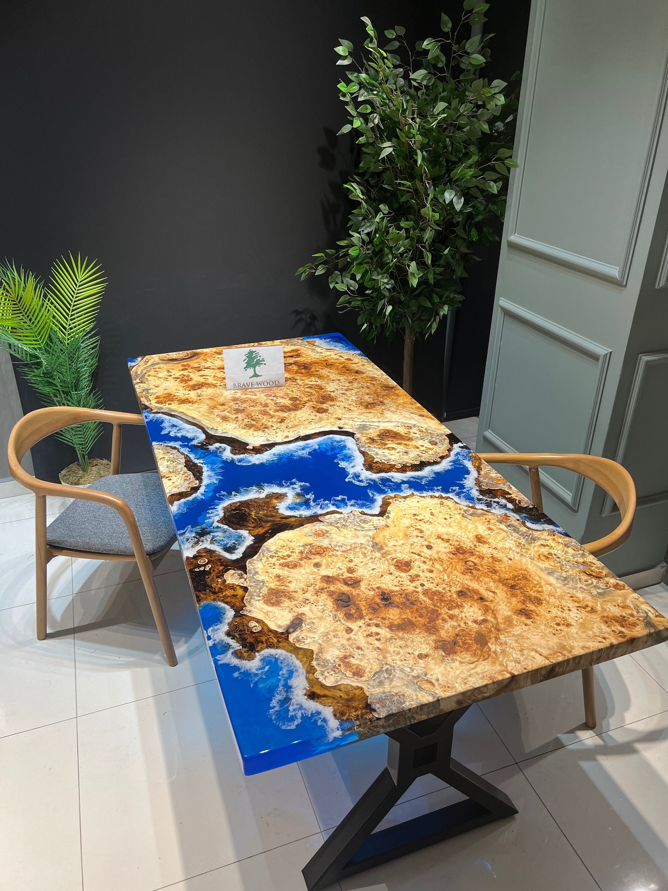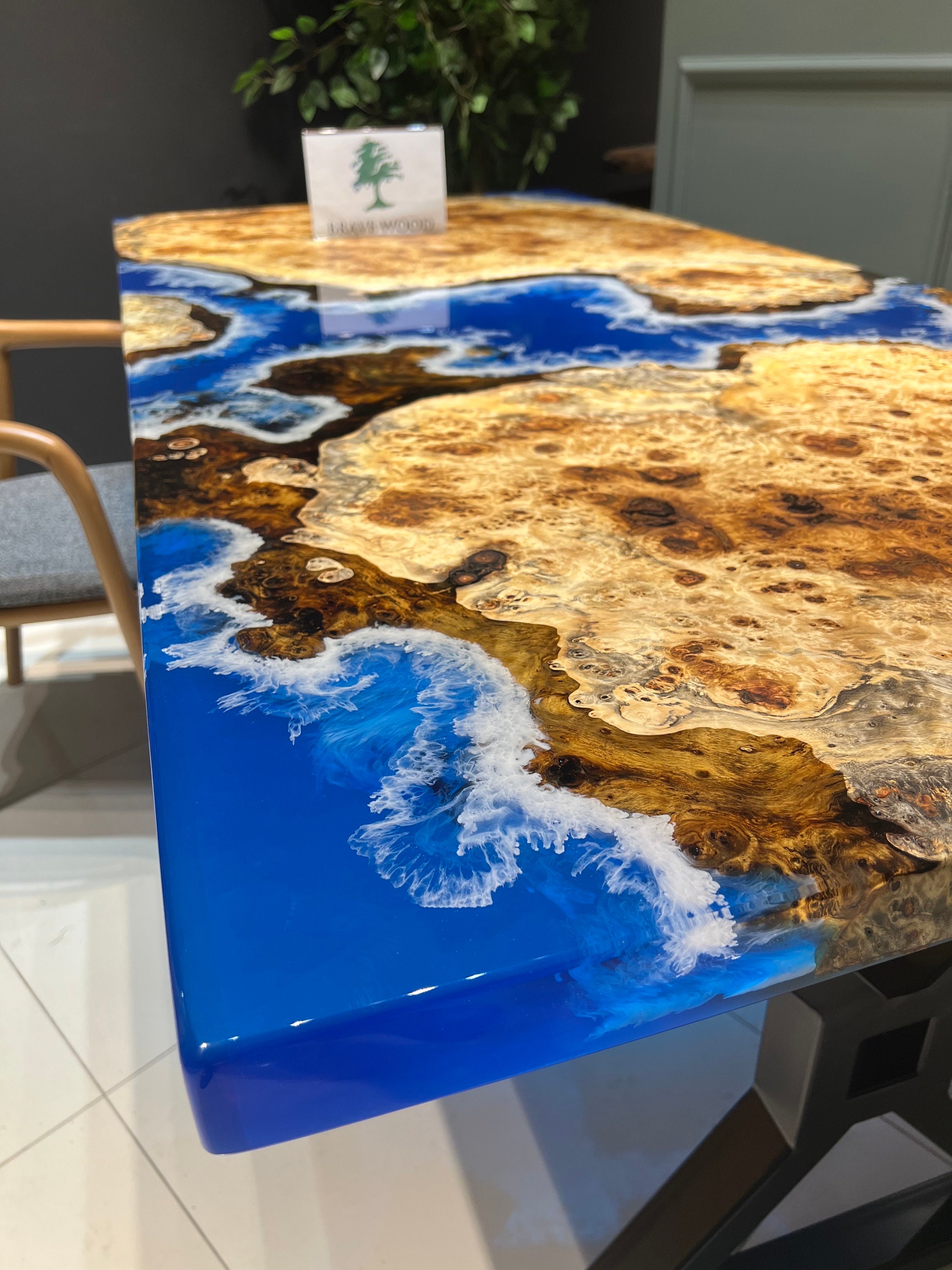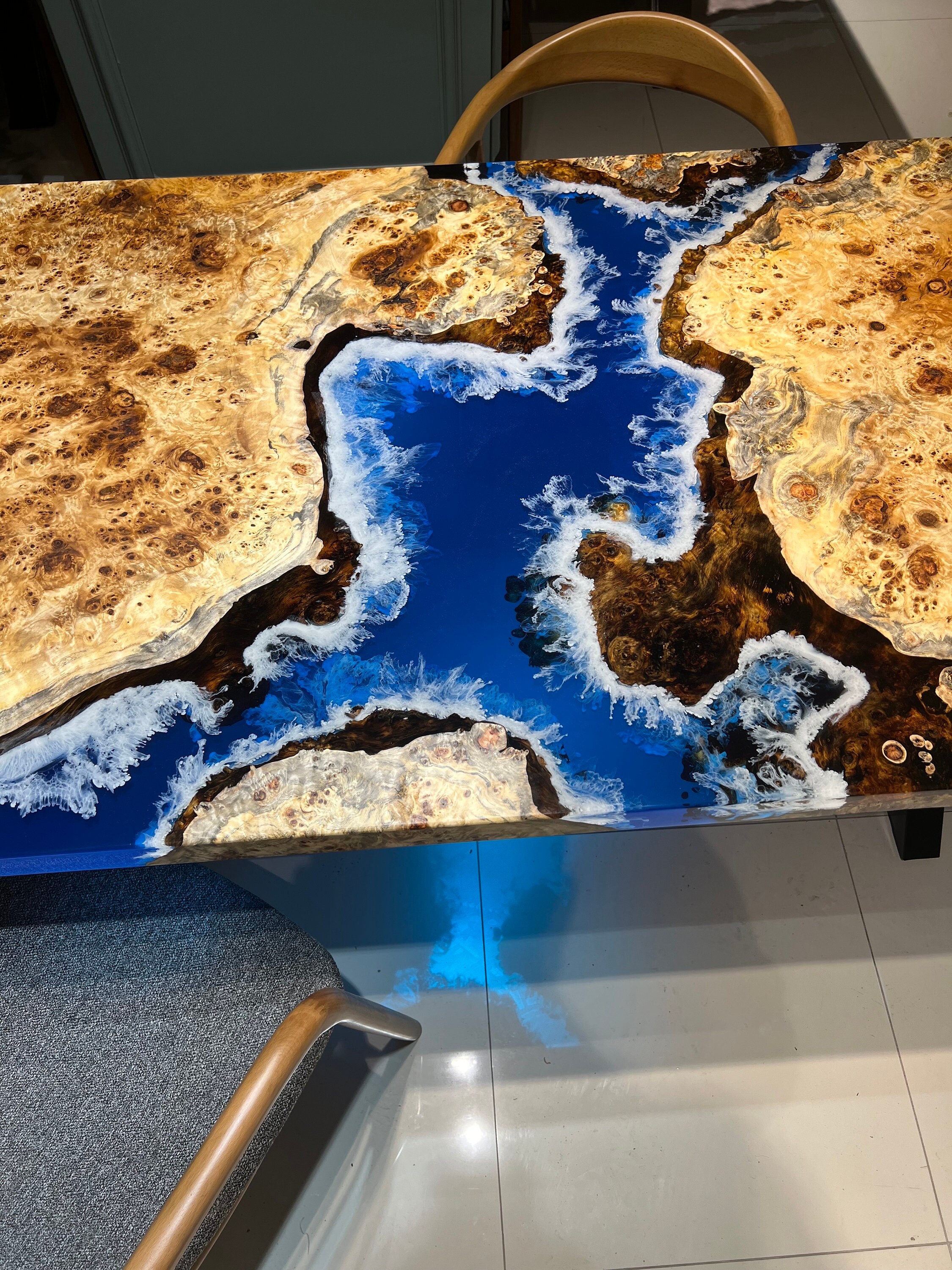 Mazel Dining Table for your living room or kitchen. Custom made mazel wood dining table with clear epoxy like river pattern. Unique, special design with soft edges and handmade production just for you, your home and your kitchen.