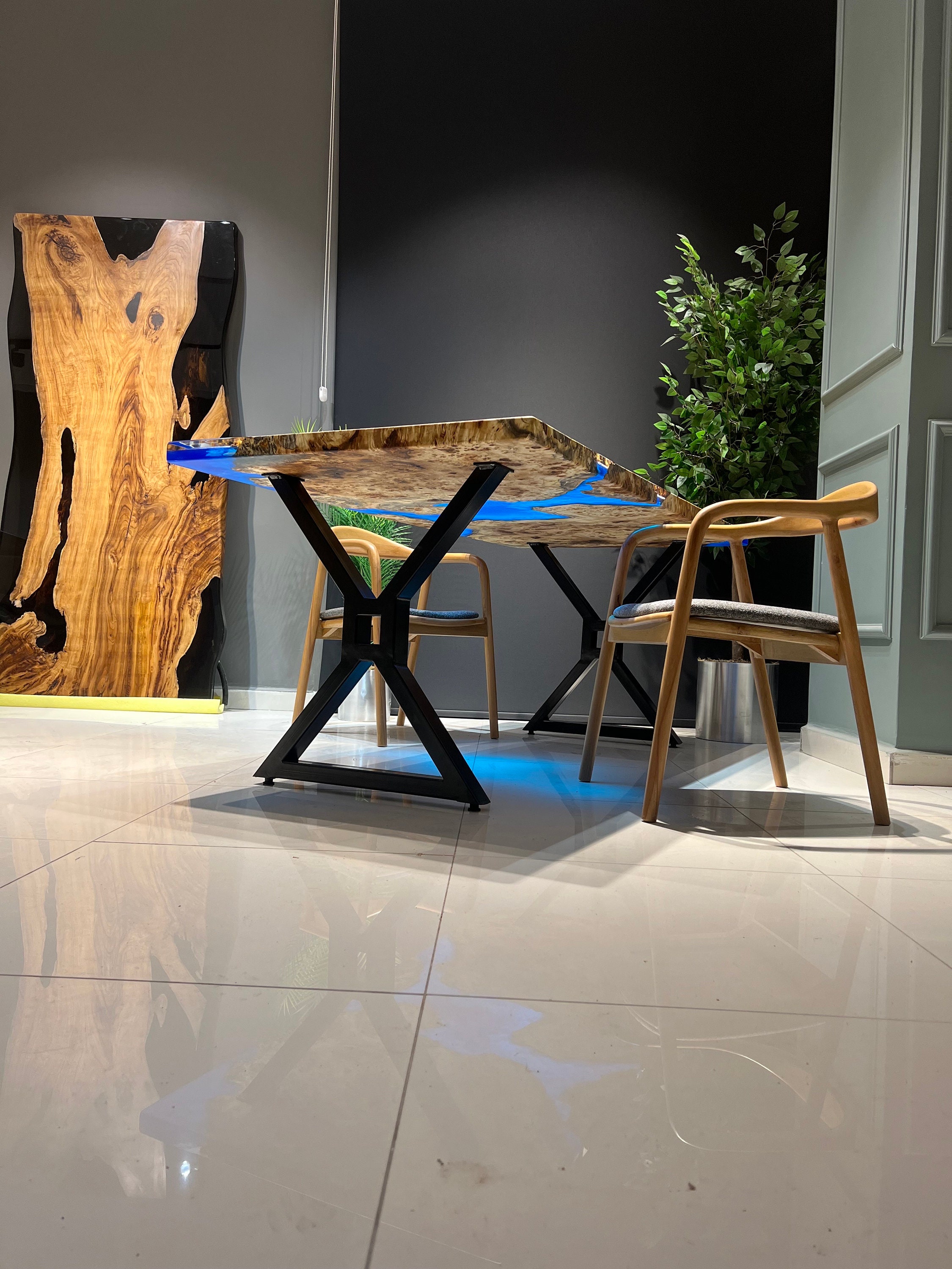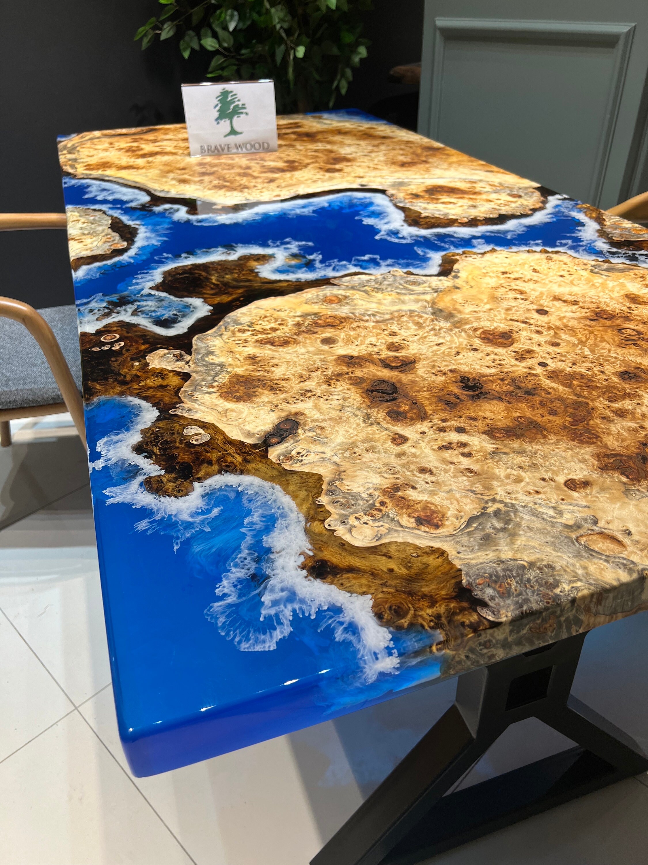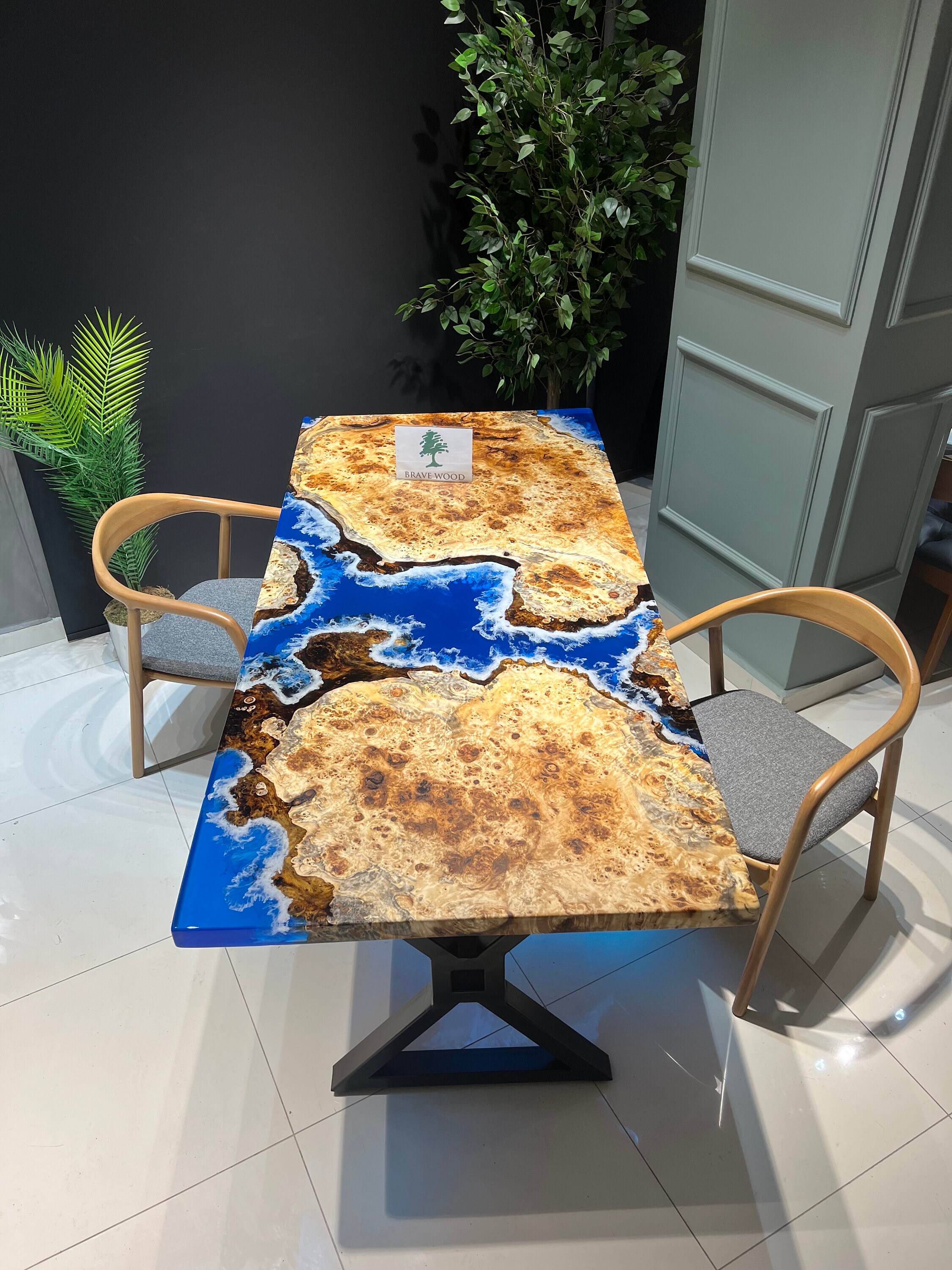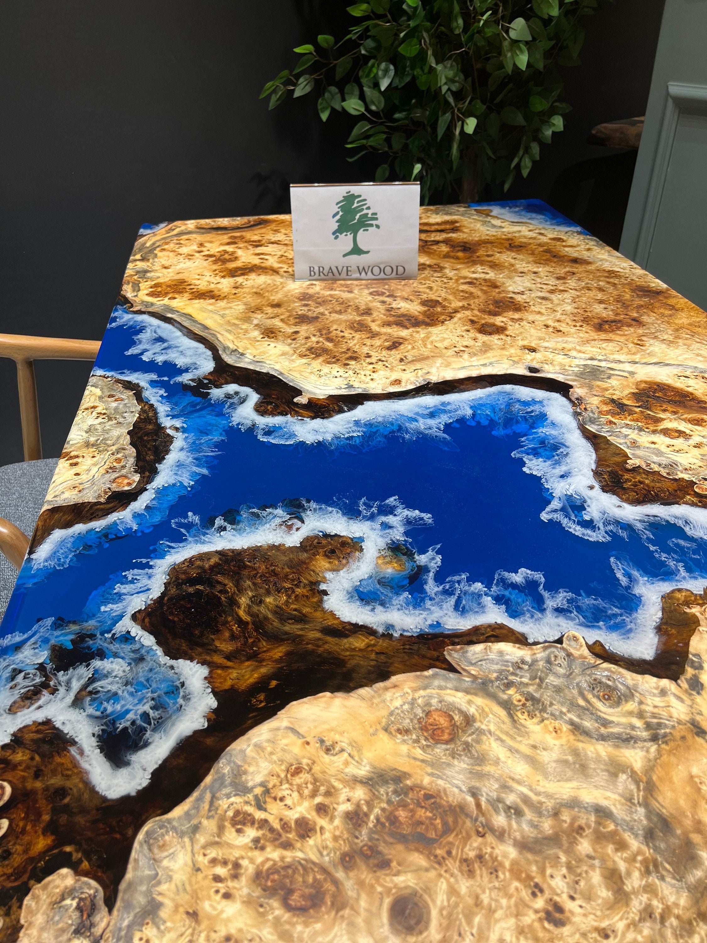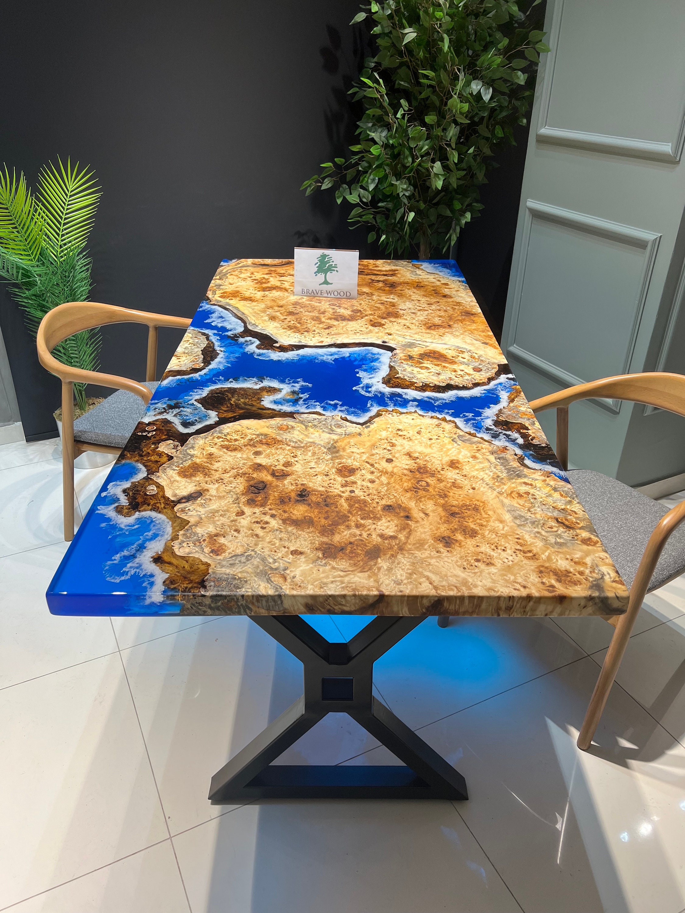 Mazel Dining Table for your living room or kitchen. Custom made mazel wood dining table with clear epoxy like river pattern. Unique, special design with soft edges and handmade production just for you, your home and your kitchen.
