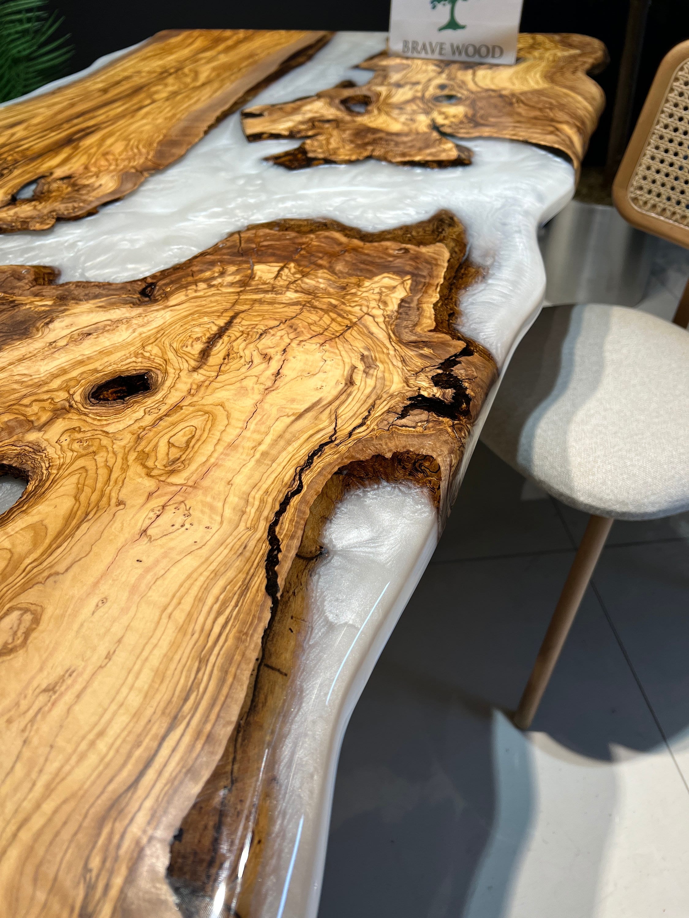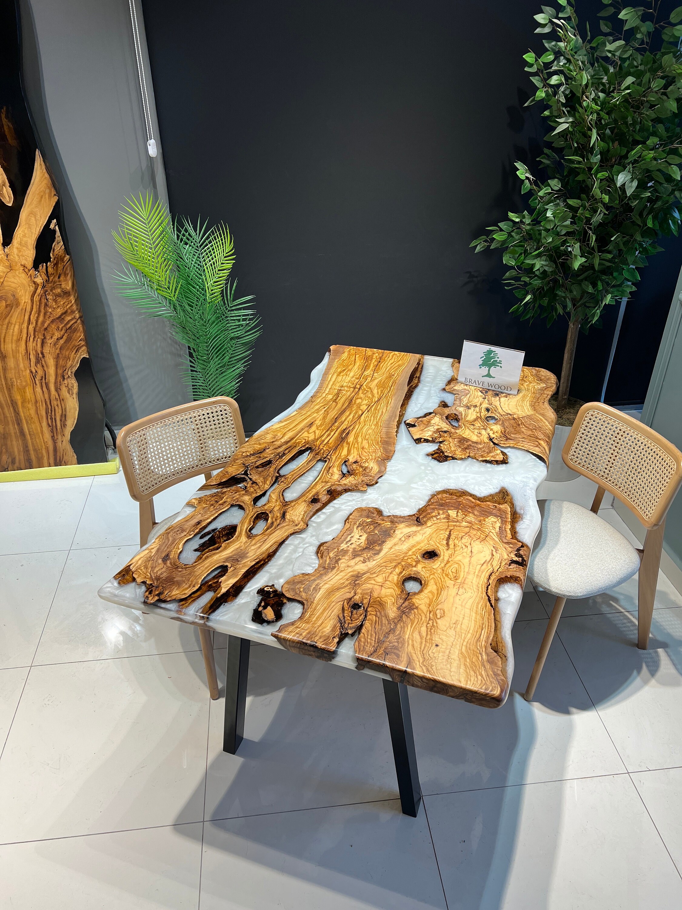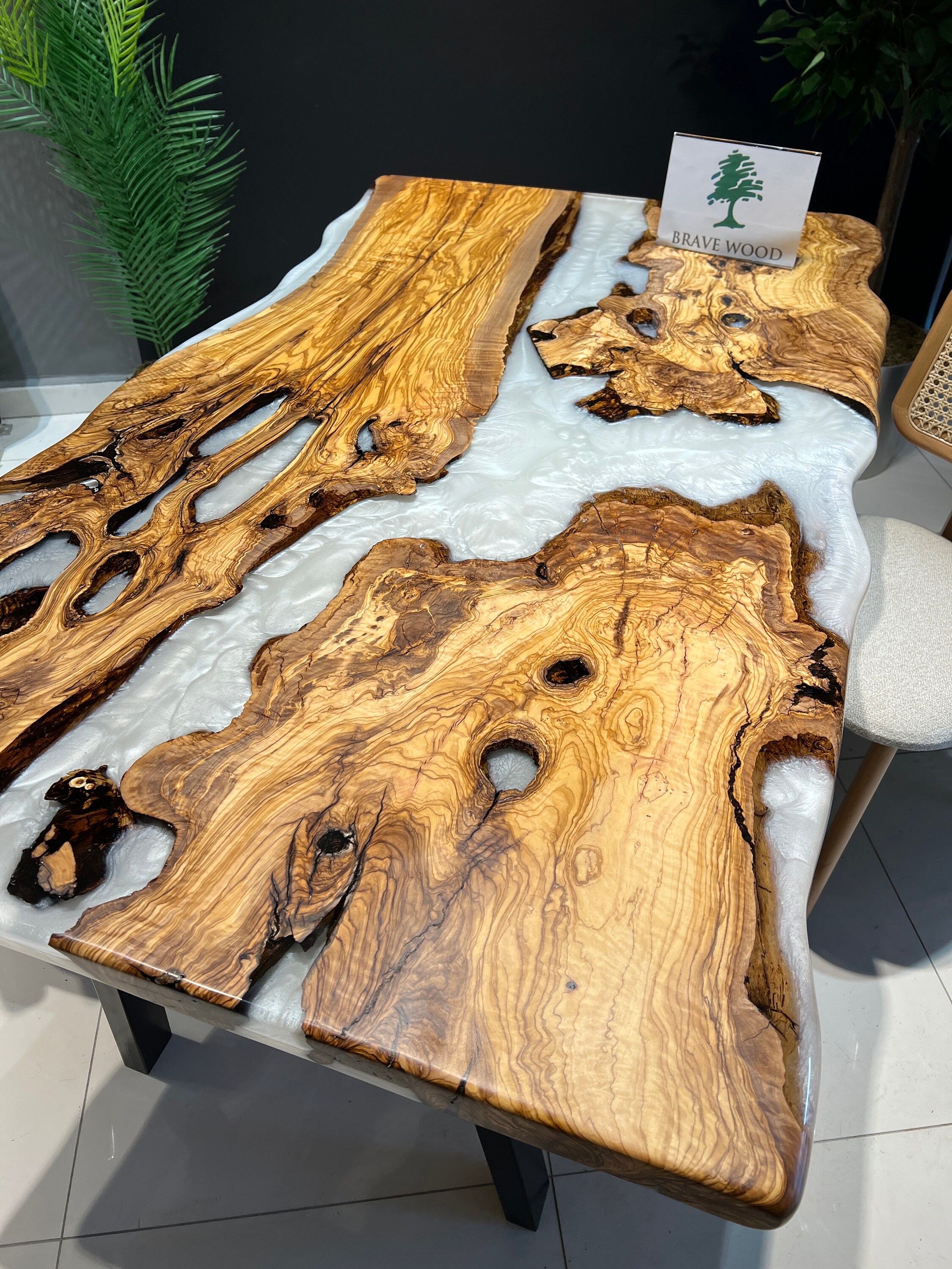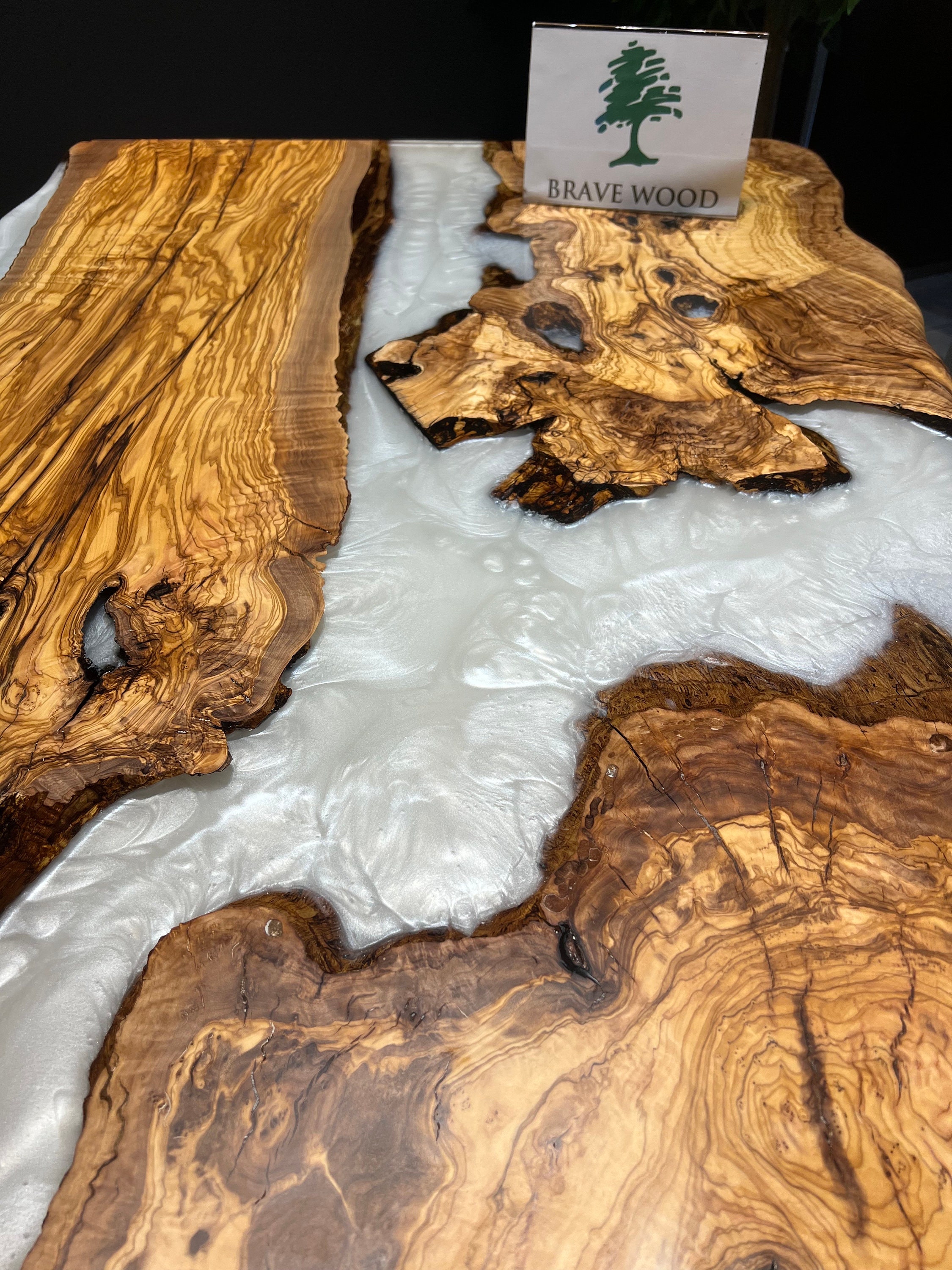 Olive Dining Table for your living room or kitchen. Custom made olive wood dining table with blue or green epoxy like river pattern. Unique, special design with soft edges and handmade production just for you, your home and your kitchen.