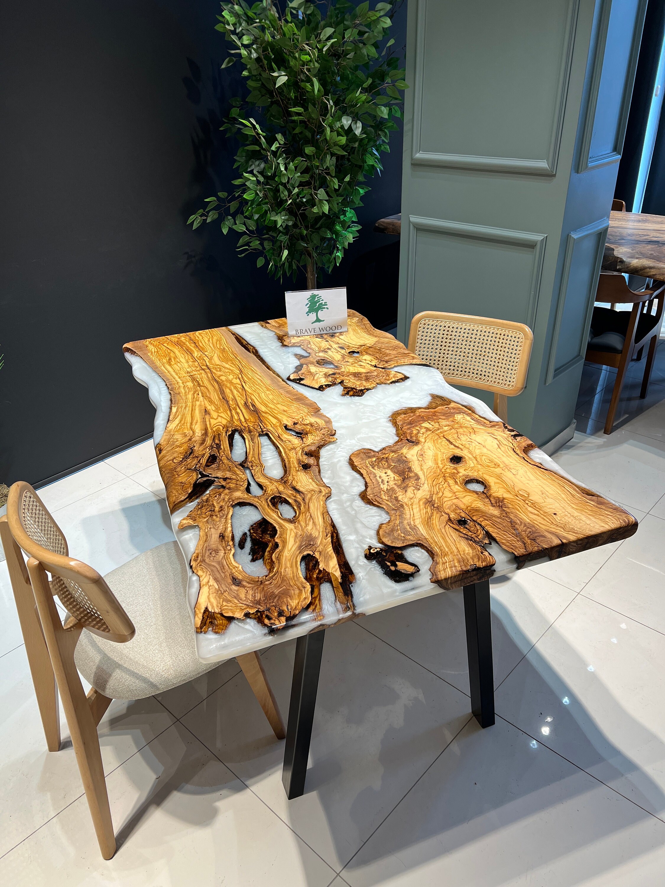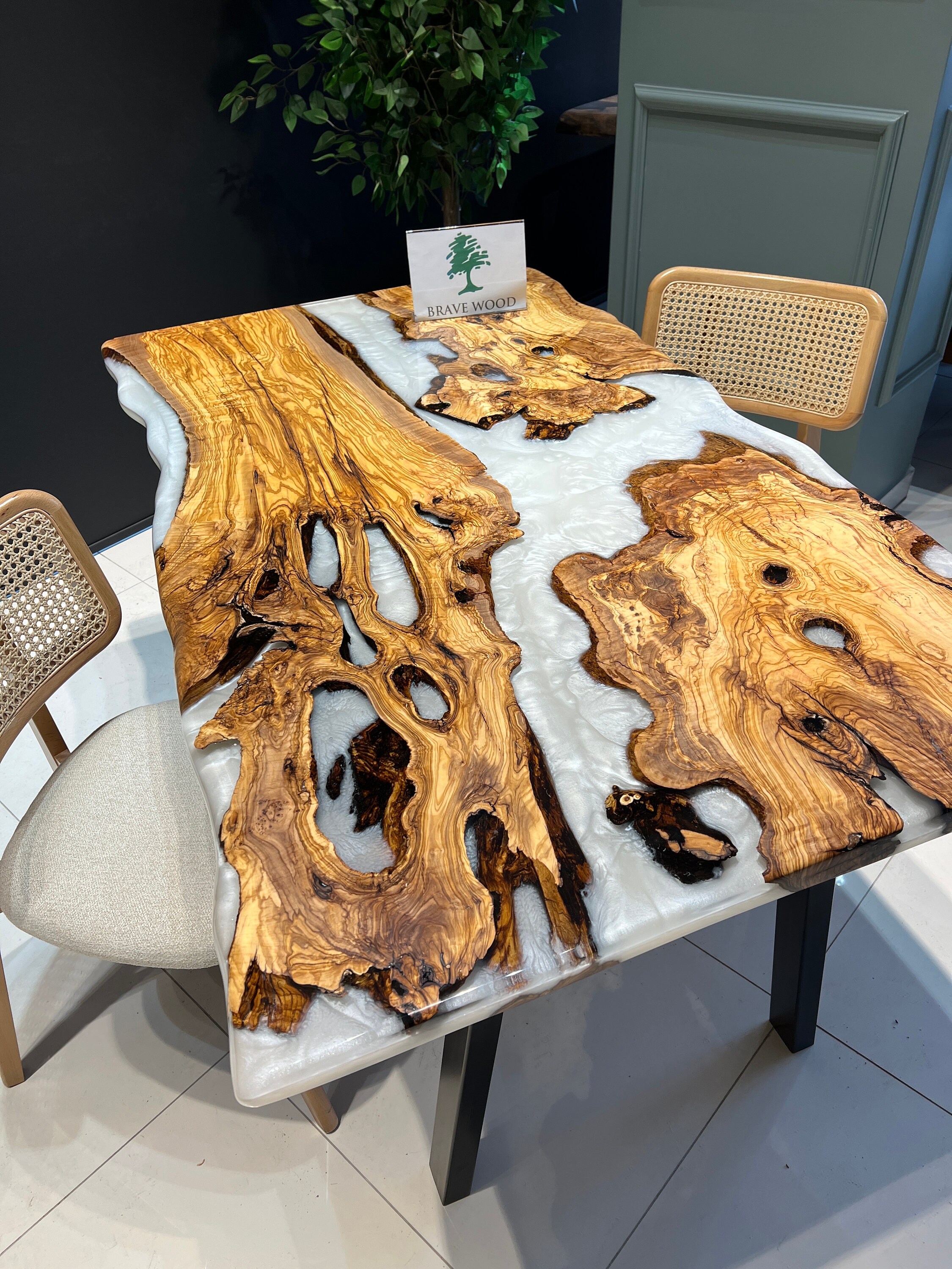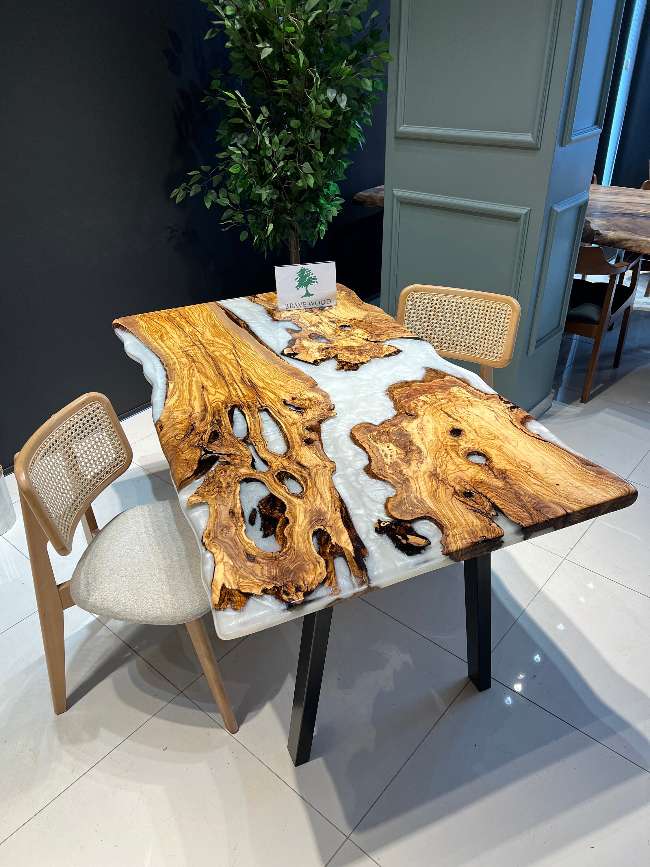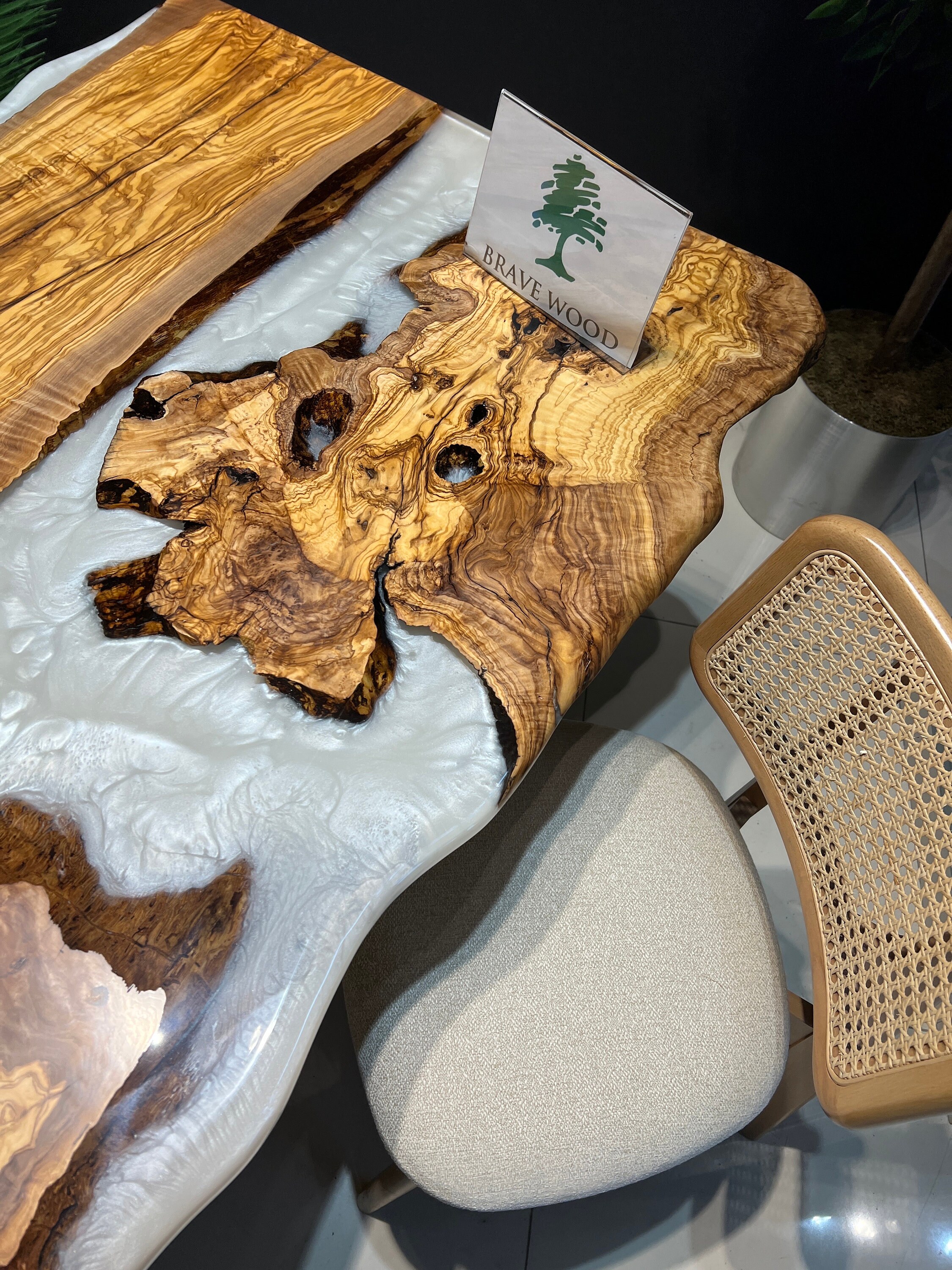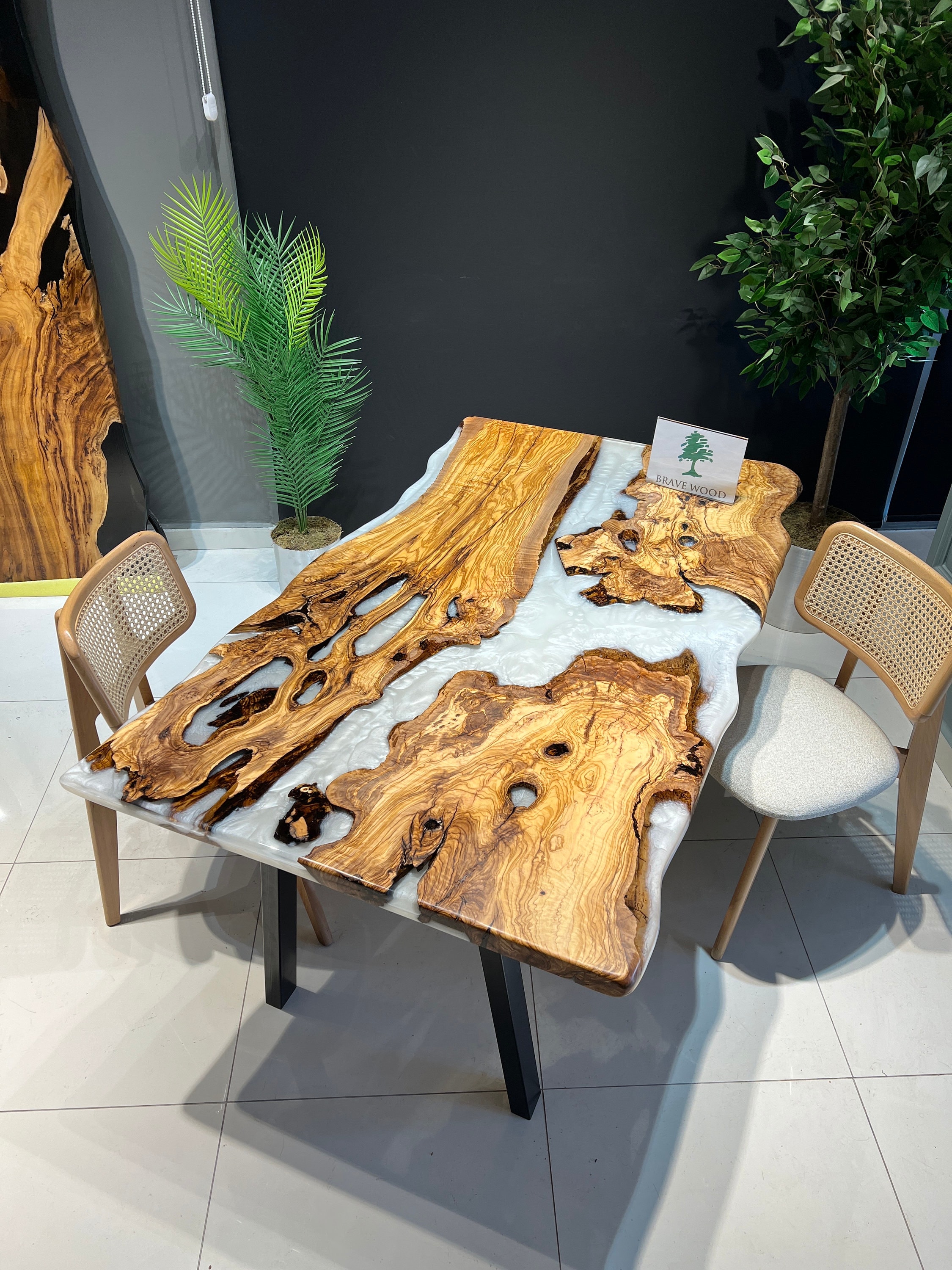 Olive Dining Table for your living room or kitchen. Custom made olive wood dining table with blue or green epoxy like river pattern. Unique, special design with soft edges and handmade production just for you, your home and your kitchen.