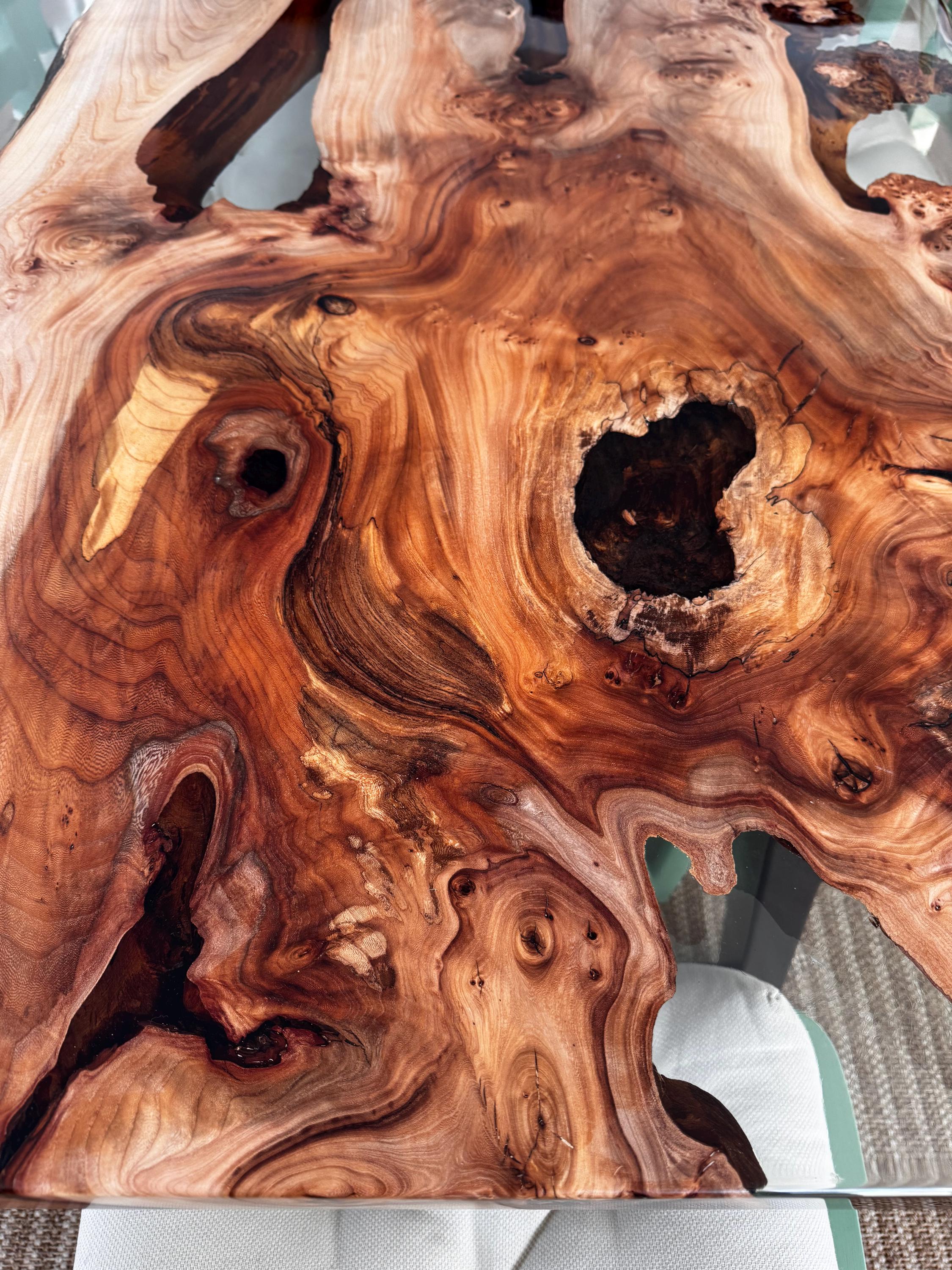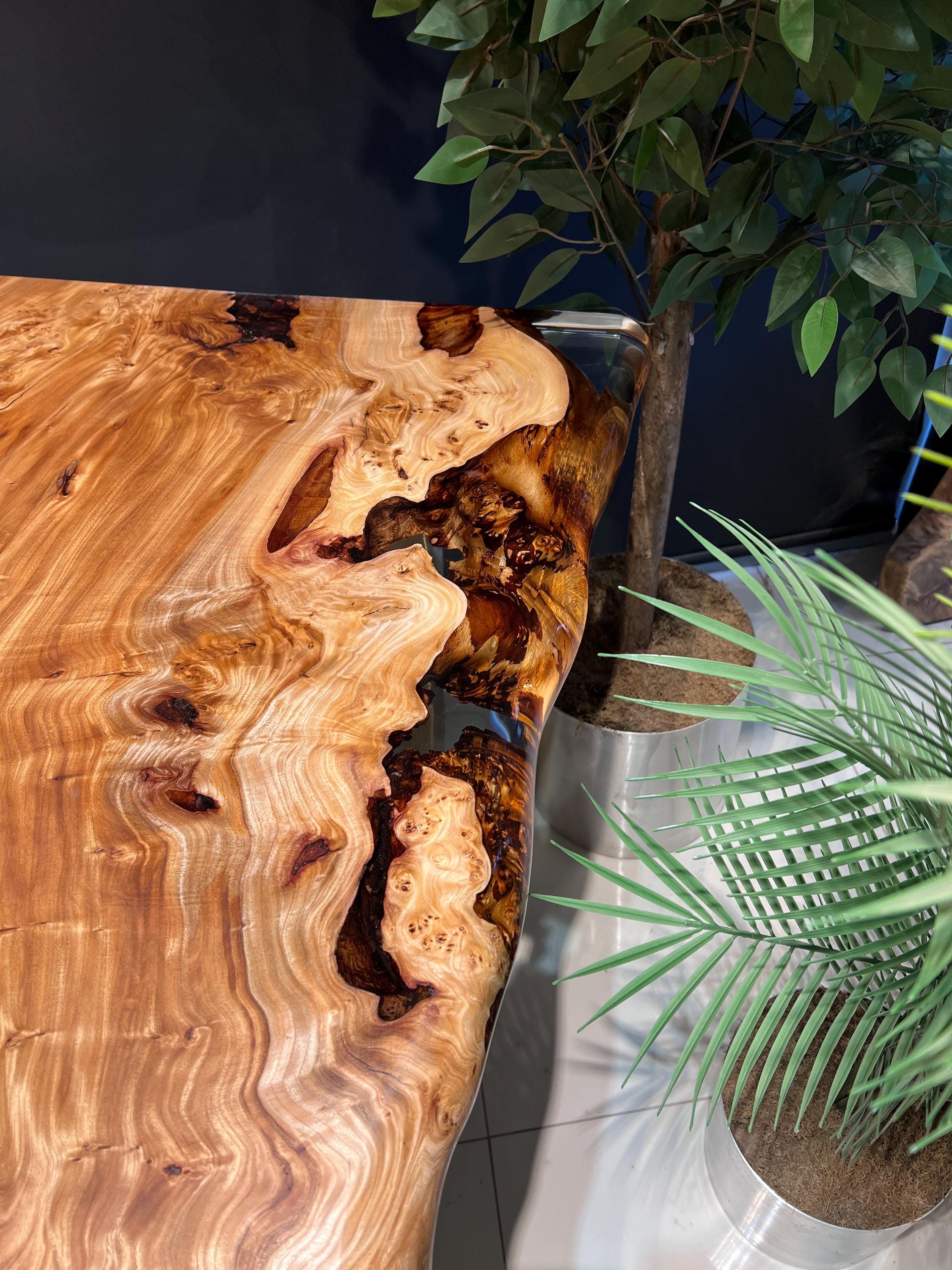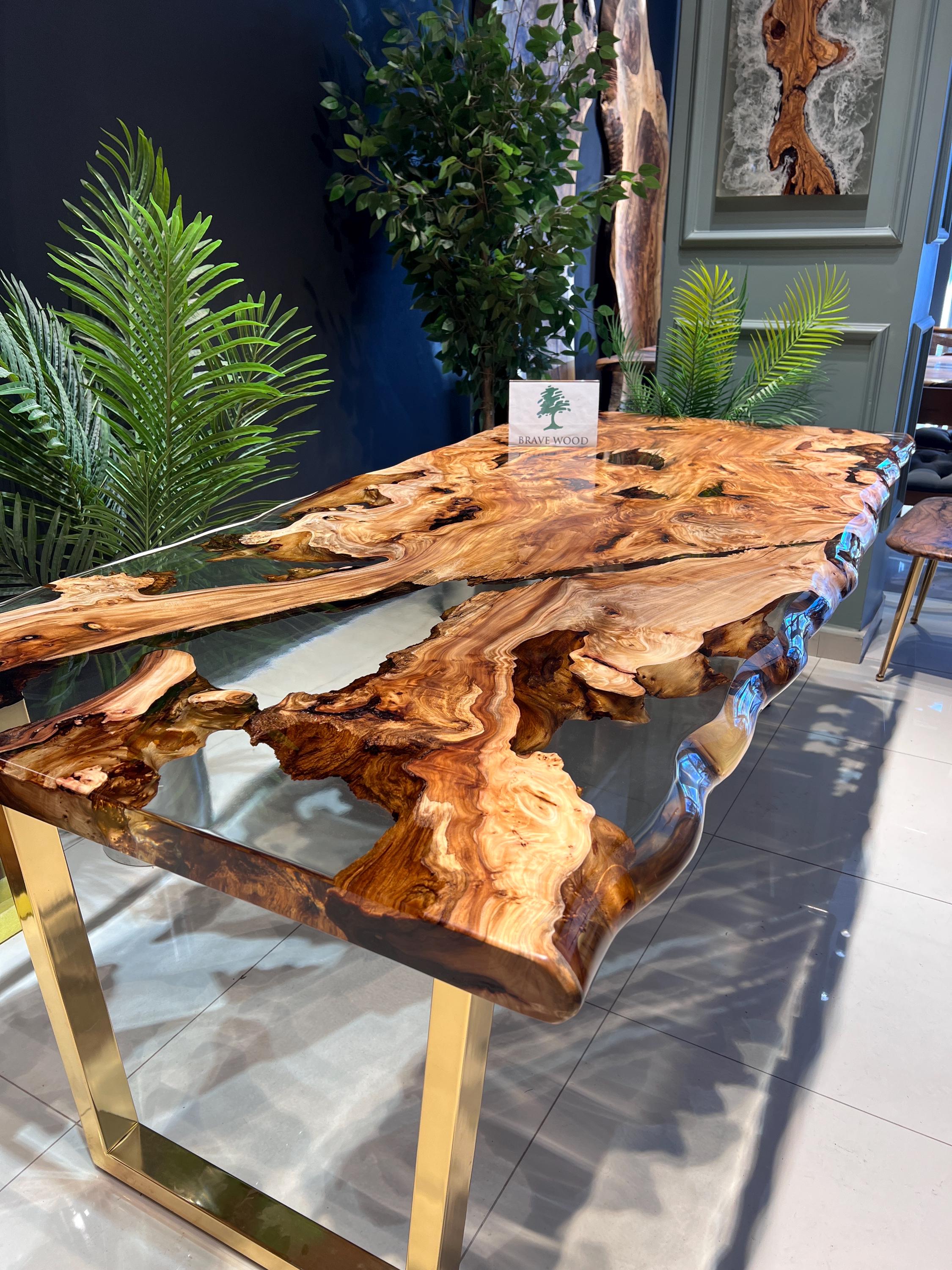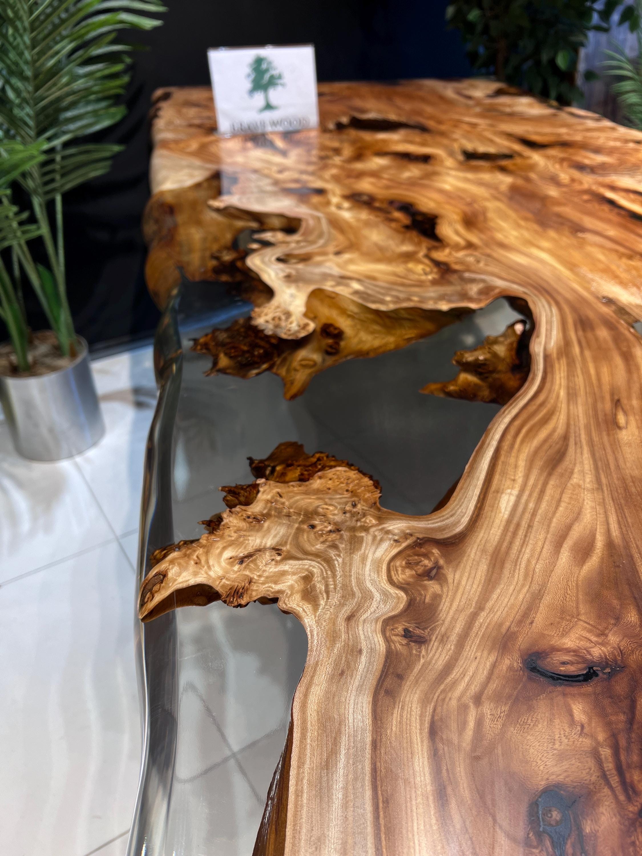 The natural edges of the tree are unique with ultra-transparent epoxy