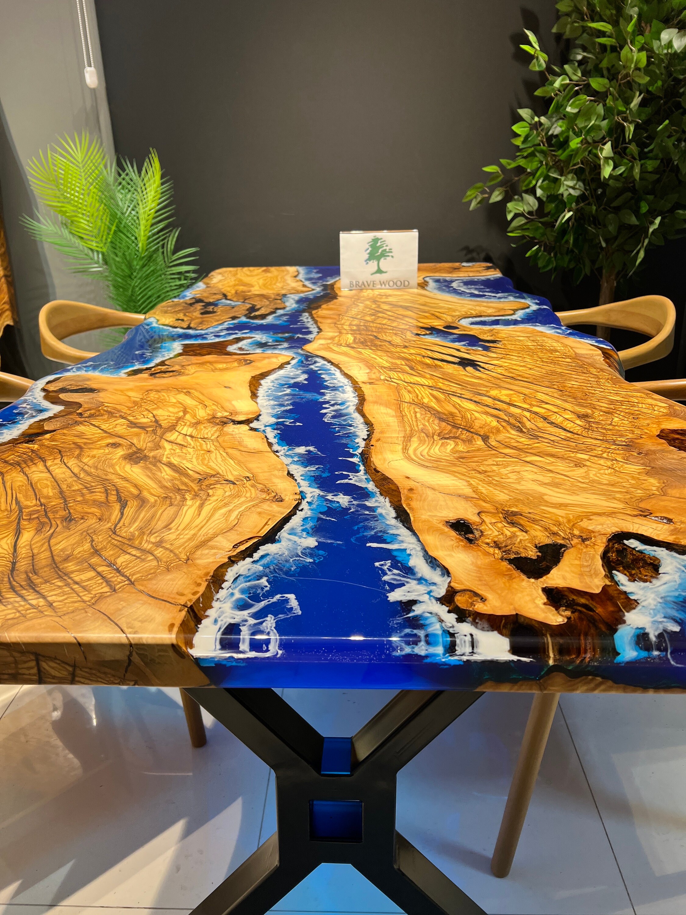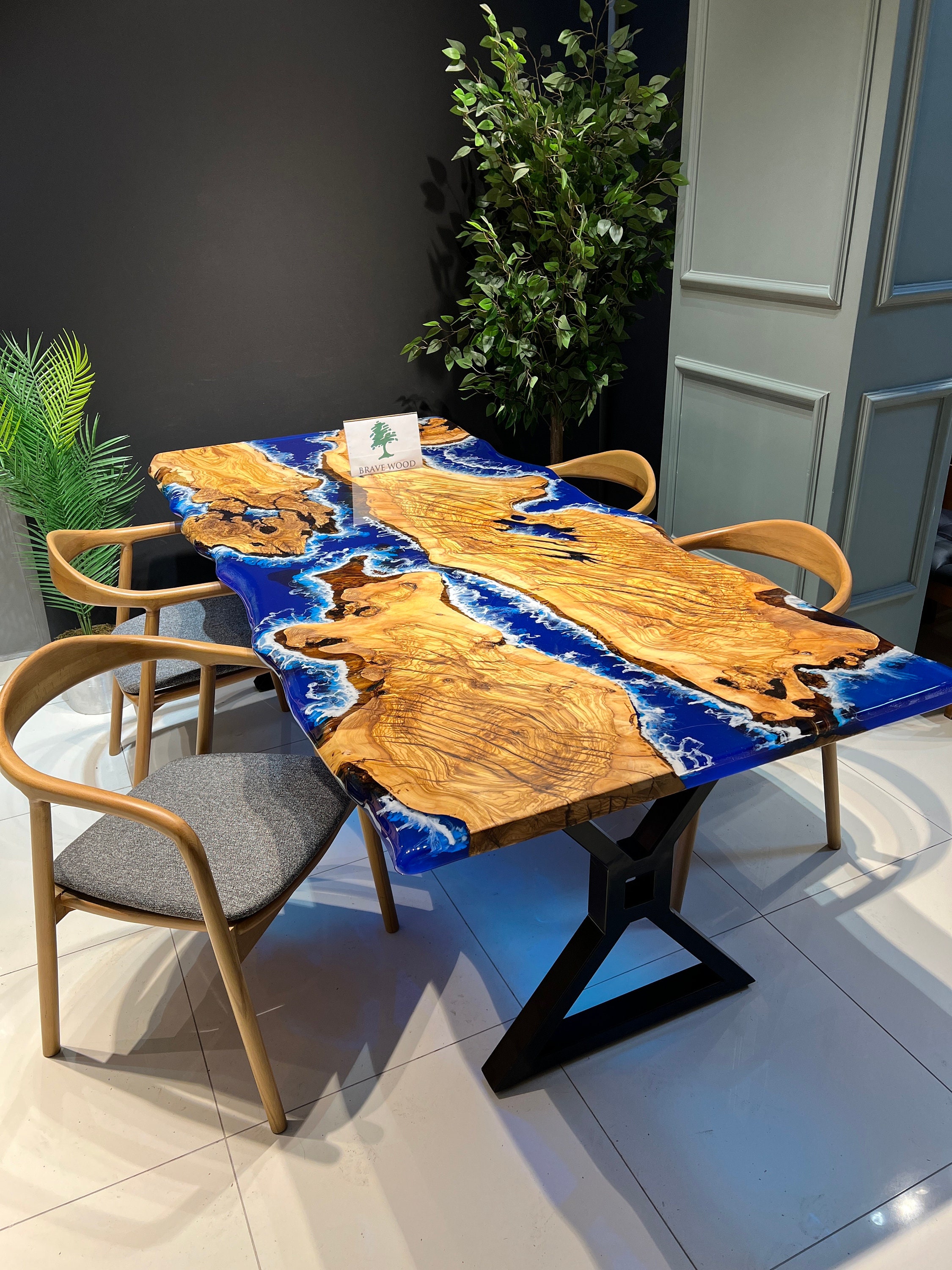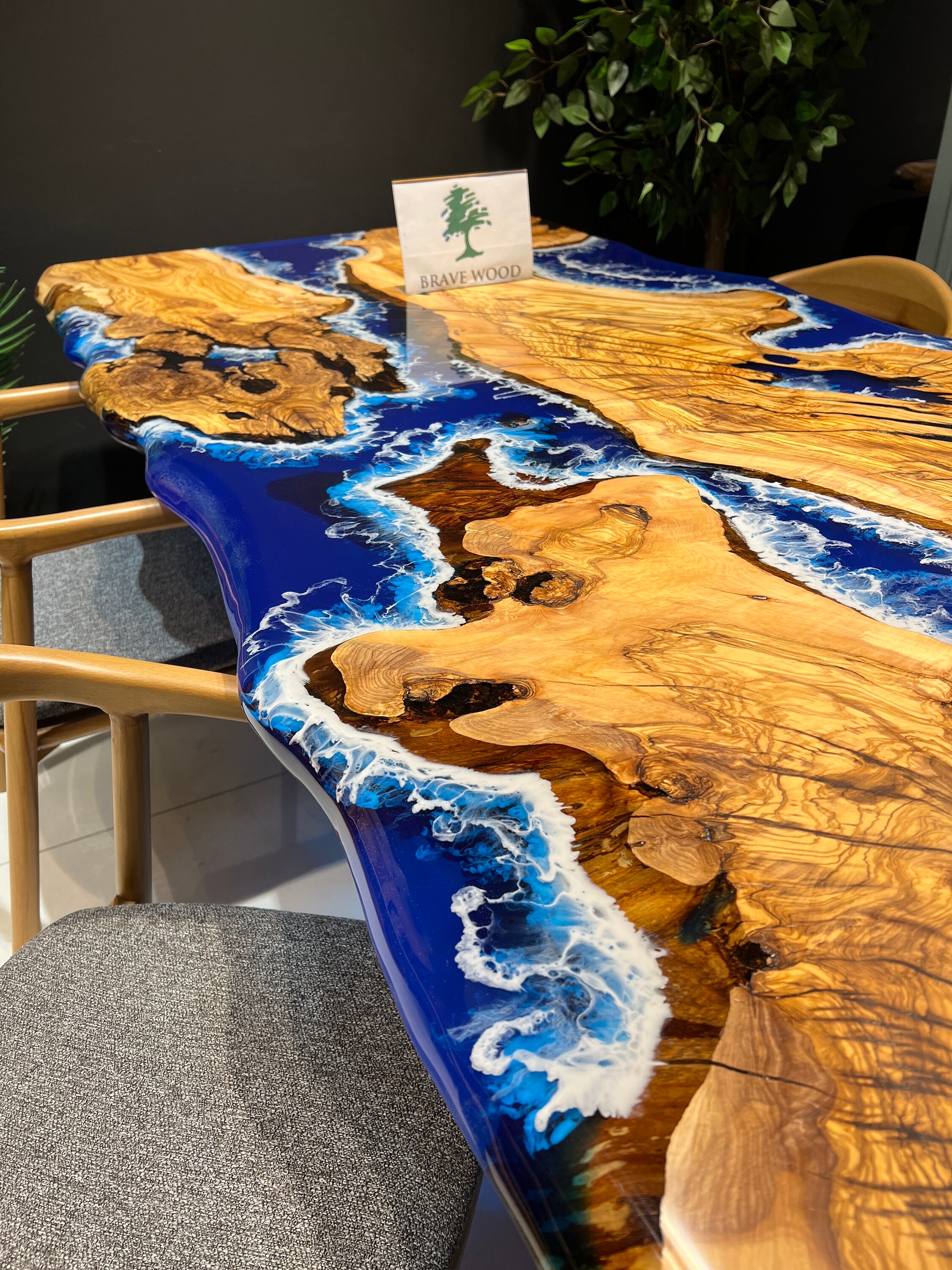 Olive Dining Table for your living room or kitchen. Custom made olive wood dining table with clear epoxy like river pattern. Unique, special design with soft edges and handmade production just for you, your home and your kitchen.