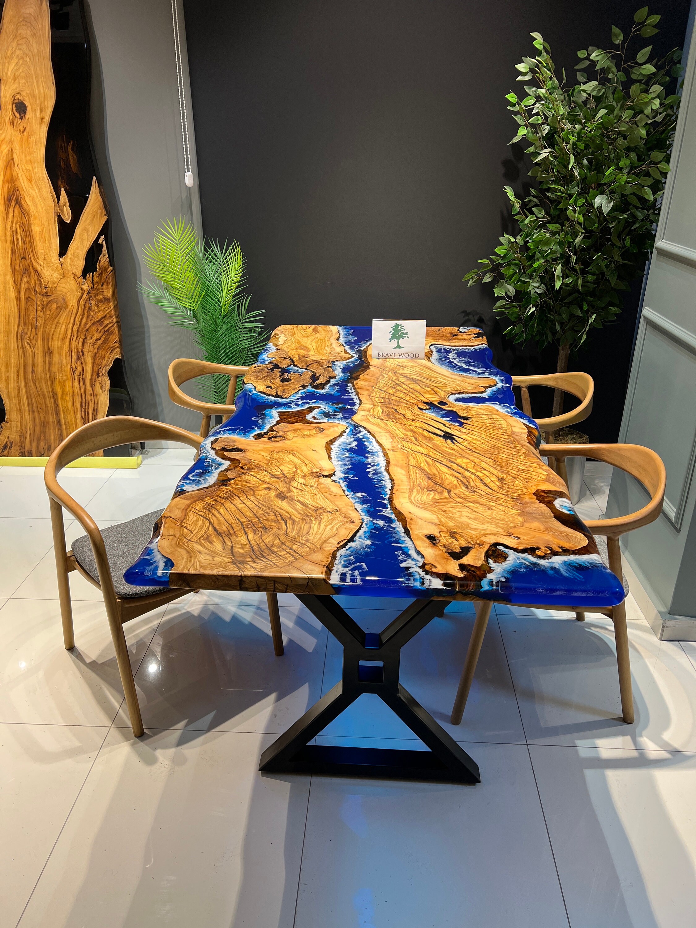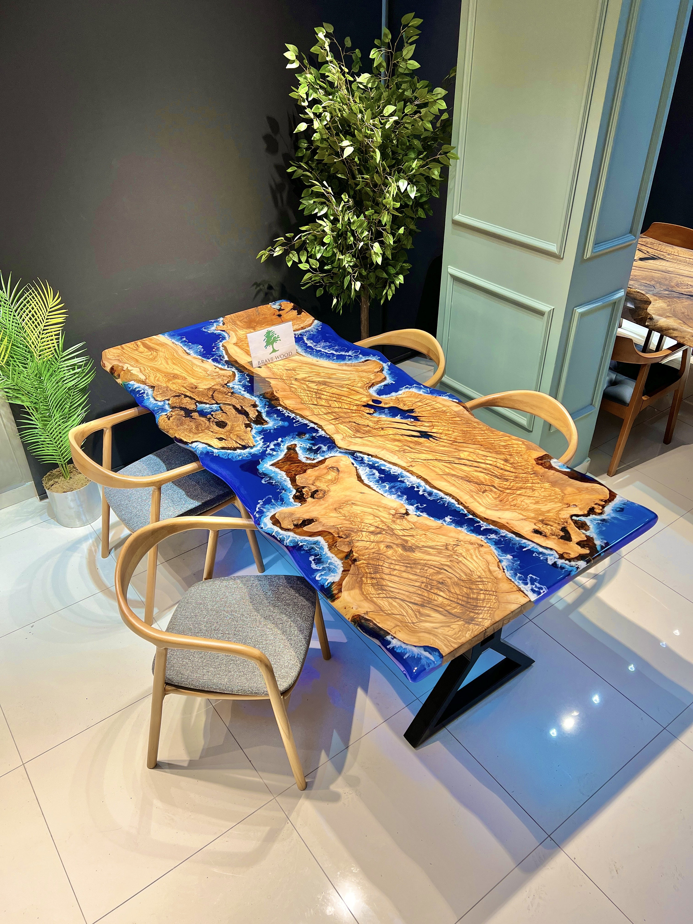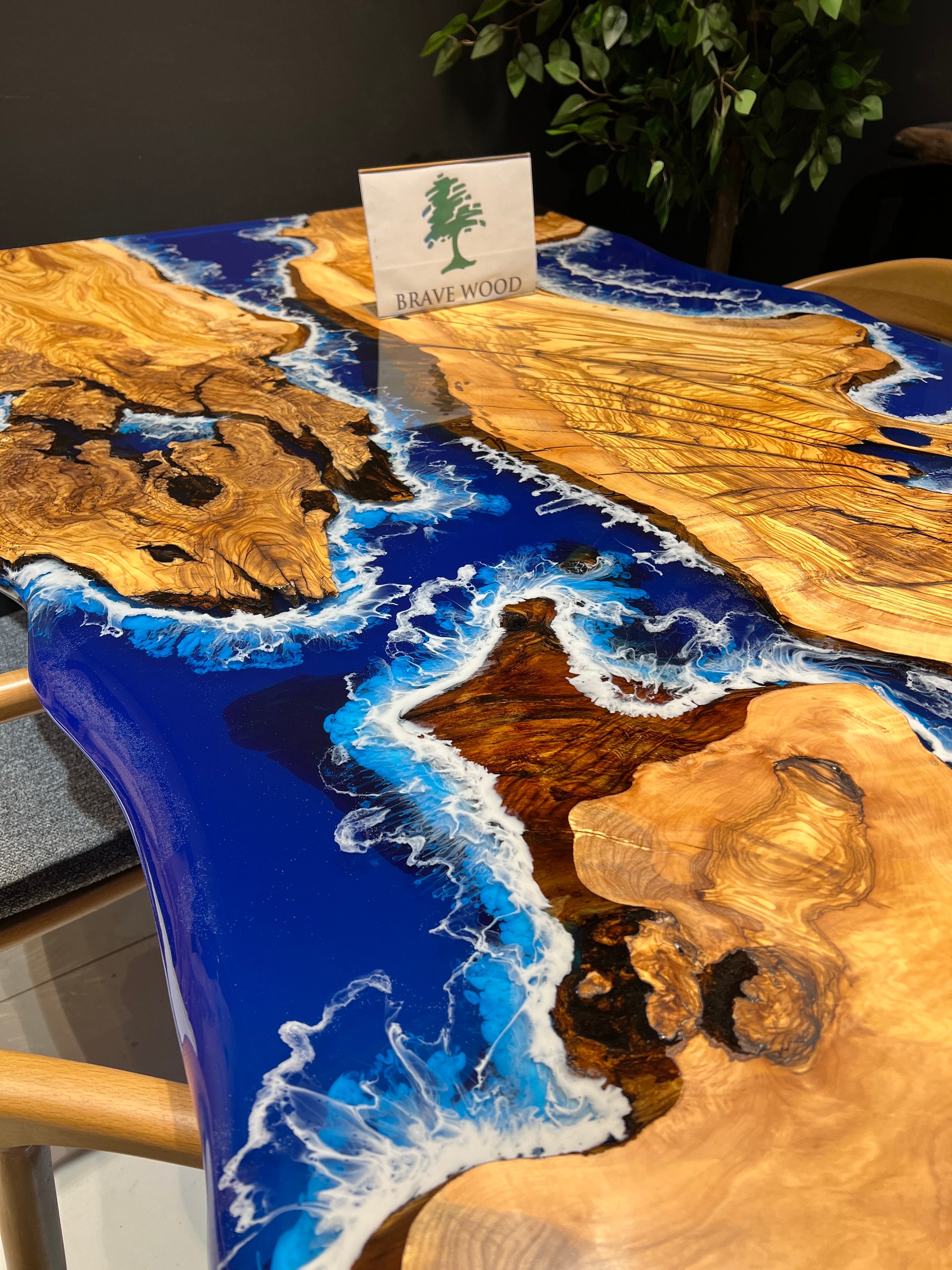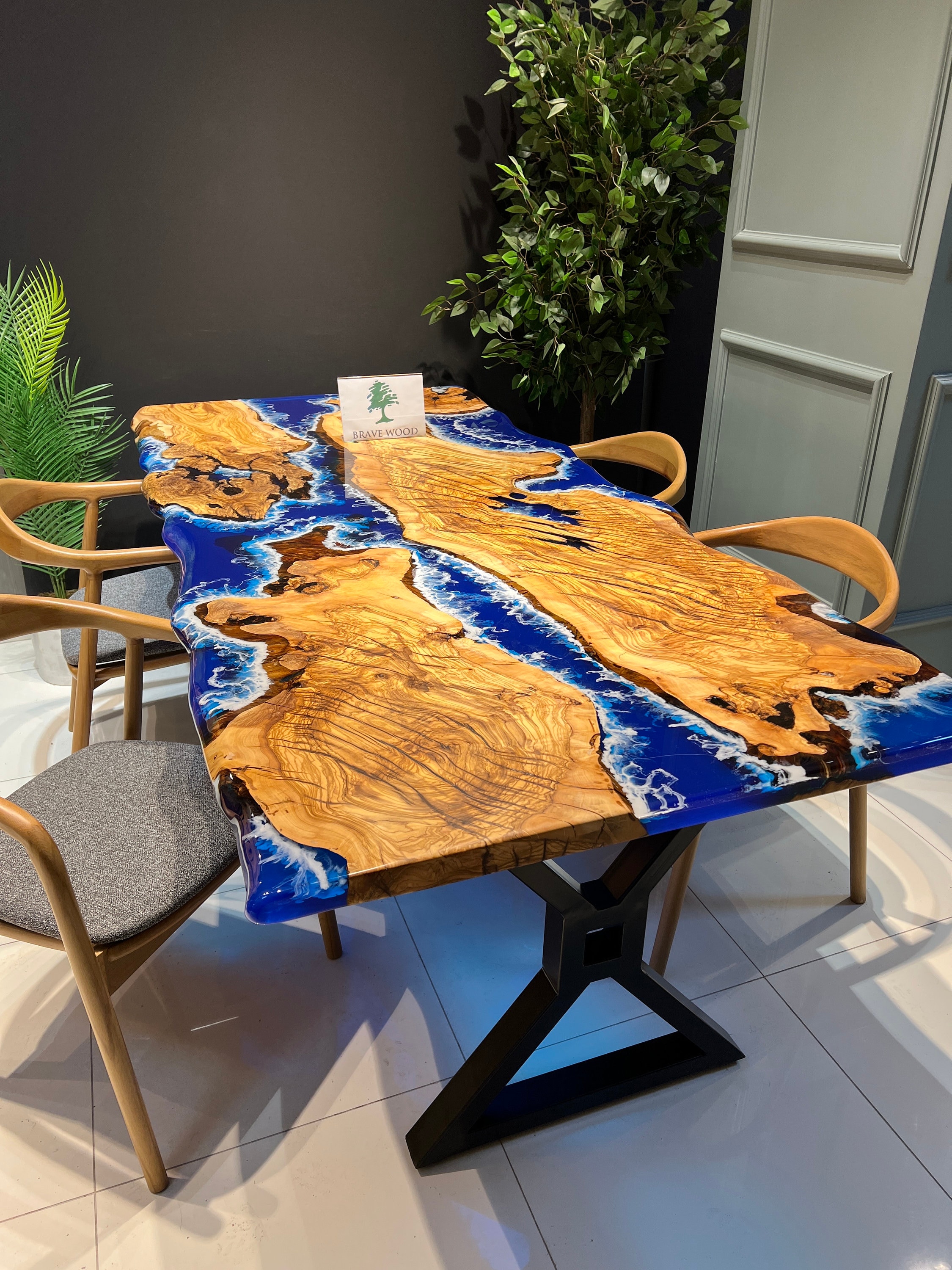 Olive Dining Table for your living room or kitchen. Custom made olive wood dining table with clear epoxy like river pattern. Unique, special design with soft edges and handmade production just for you, your home and your kitchen.