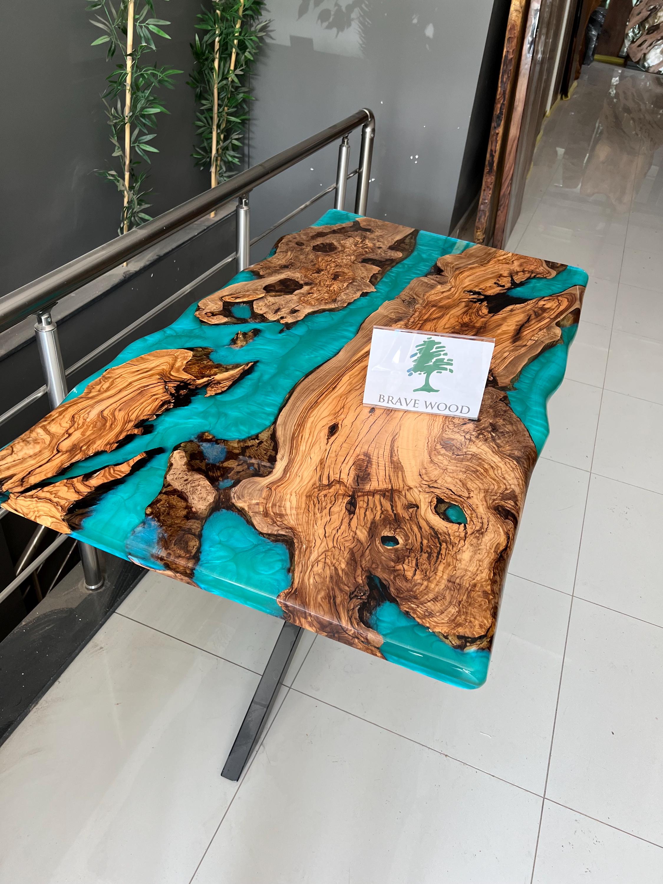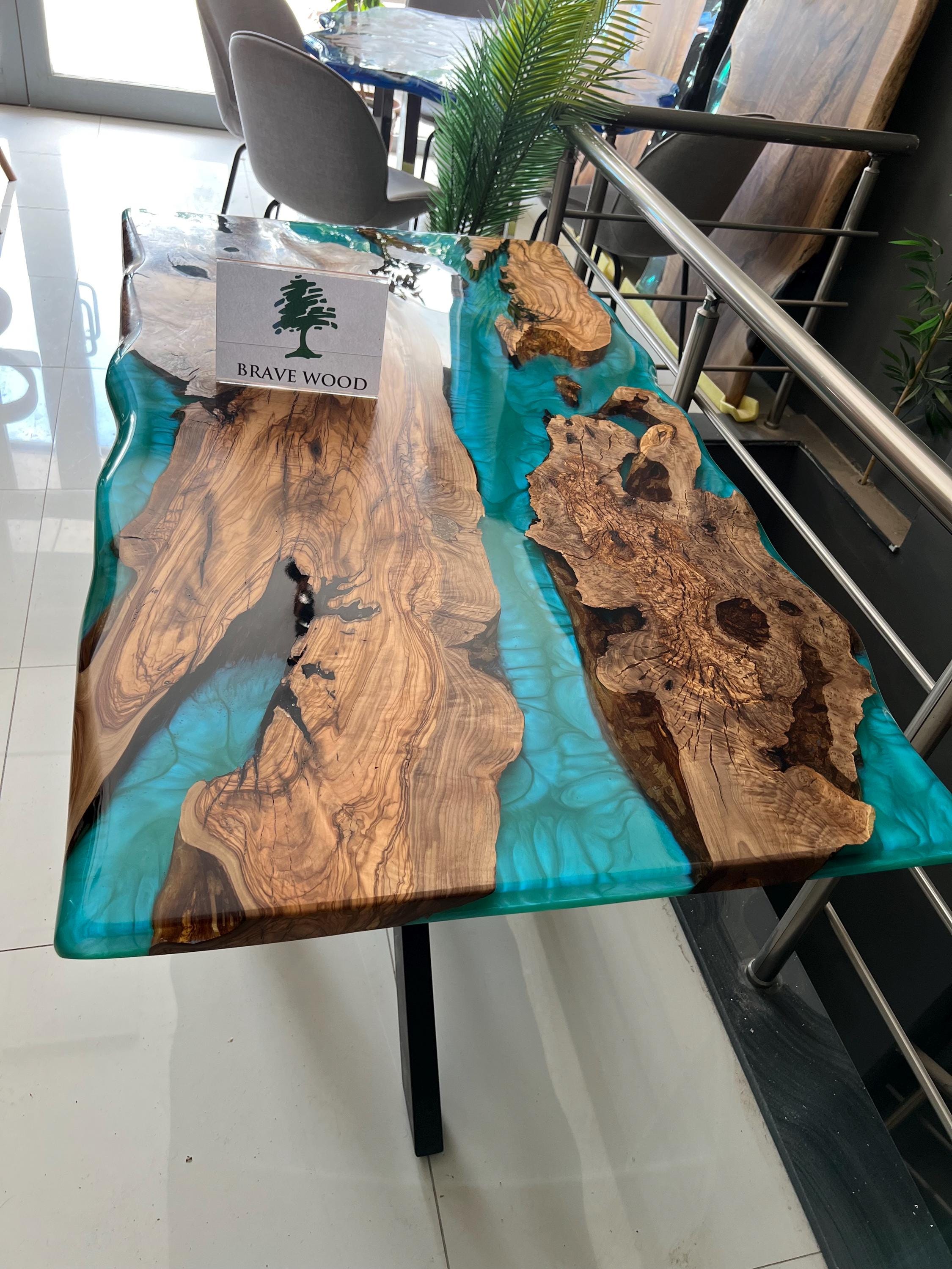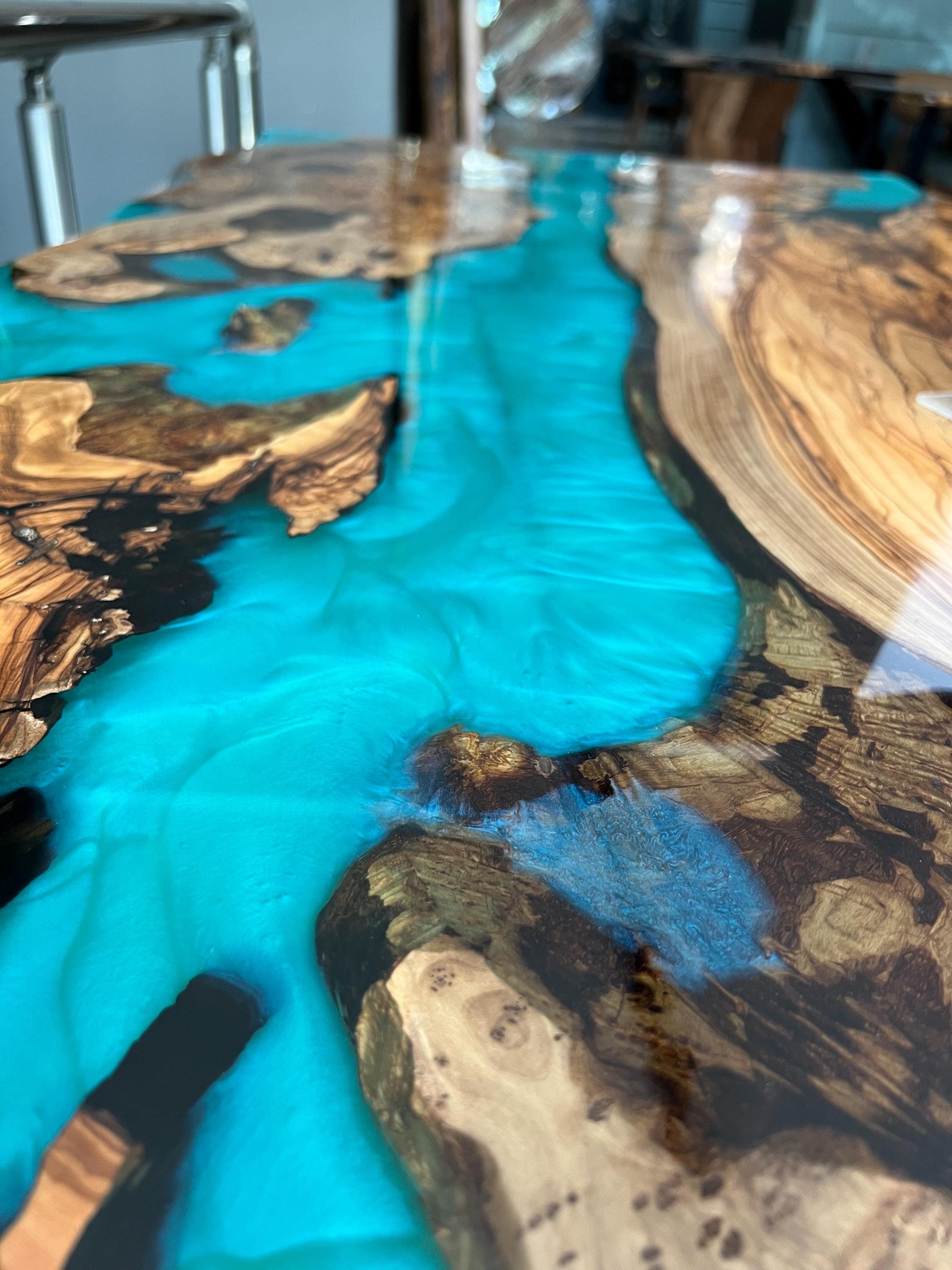 Olive Dining Table for your living room or kitchen. Custom made olive wood dining table with blue or green epoxy like river pattern. Unique, special design with soft edges and handmade production just for you, your home and your kitchen.