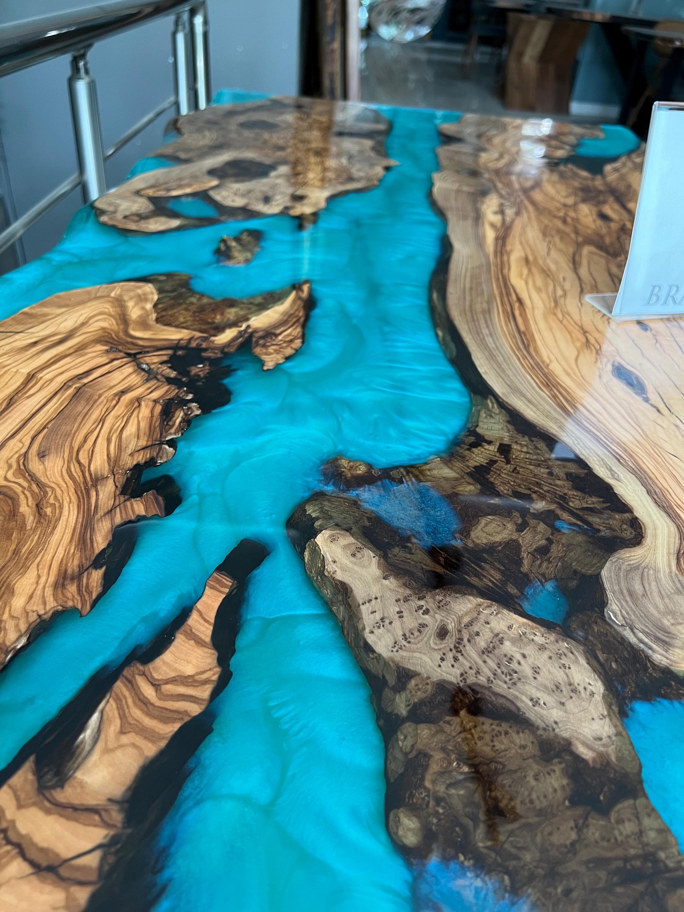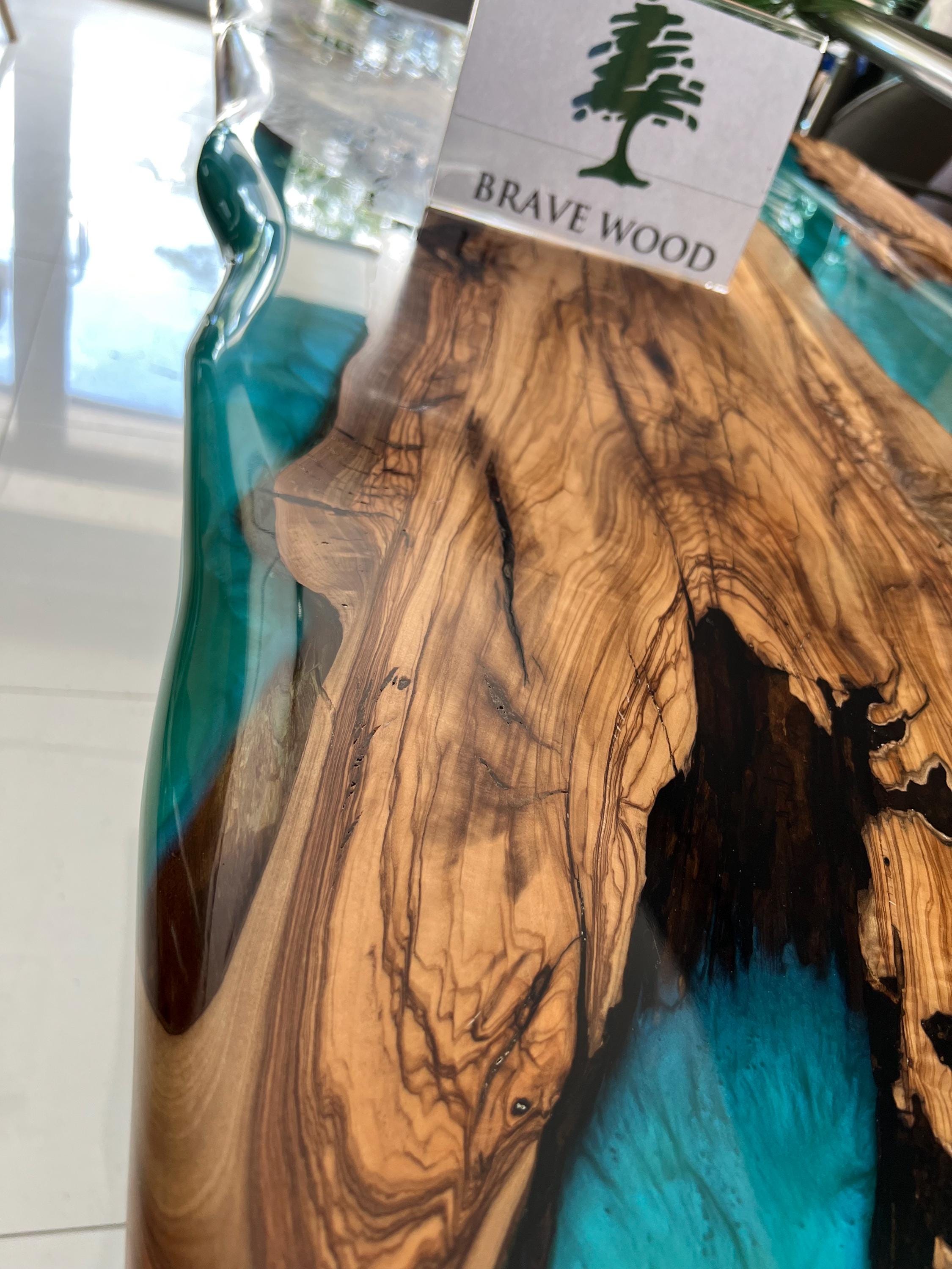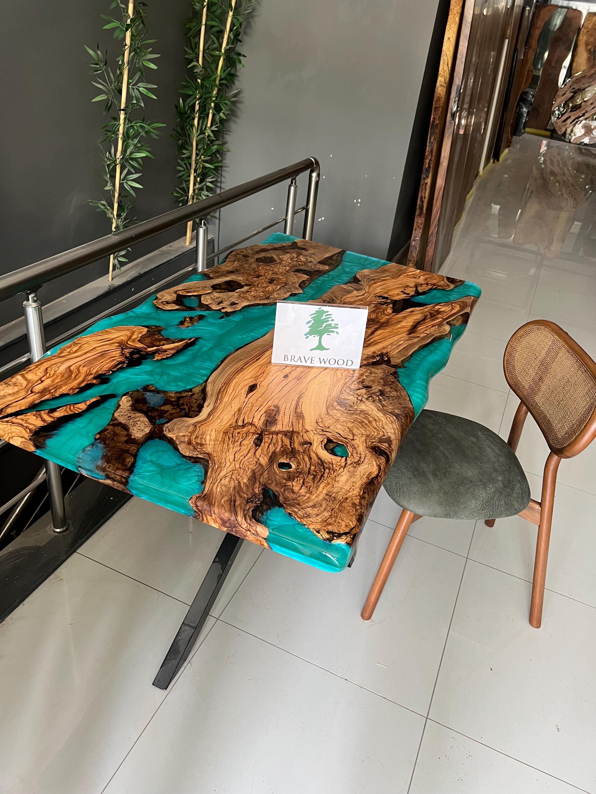 Olive Dining Table for your living room or kitchen. Custom made olive wood dining table with blue or green epoxy like river pattern. Unique, special design with soft edges and handmade production just for you, your home and your kitchen.