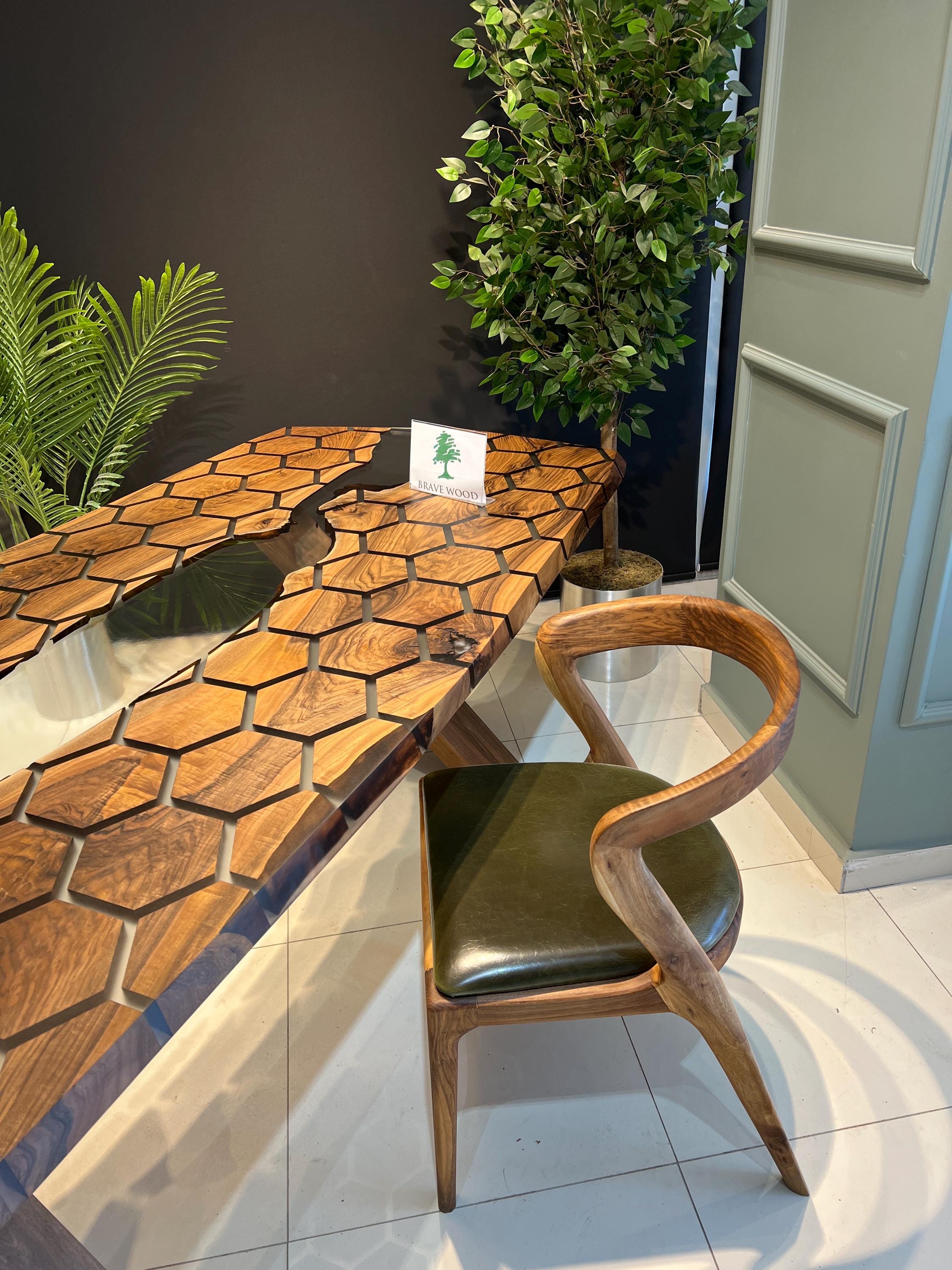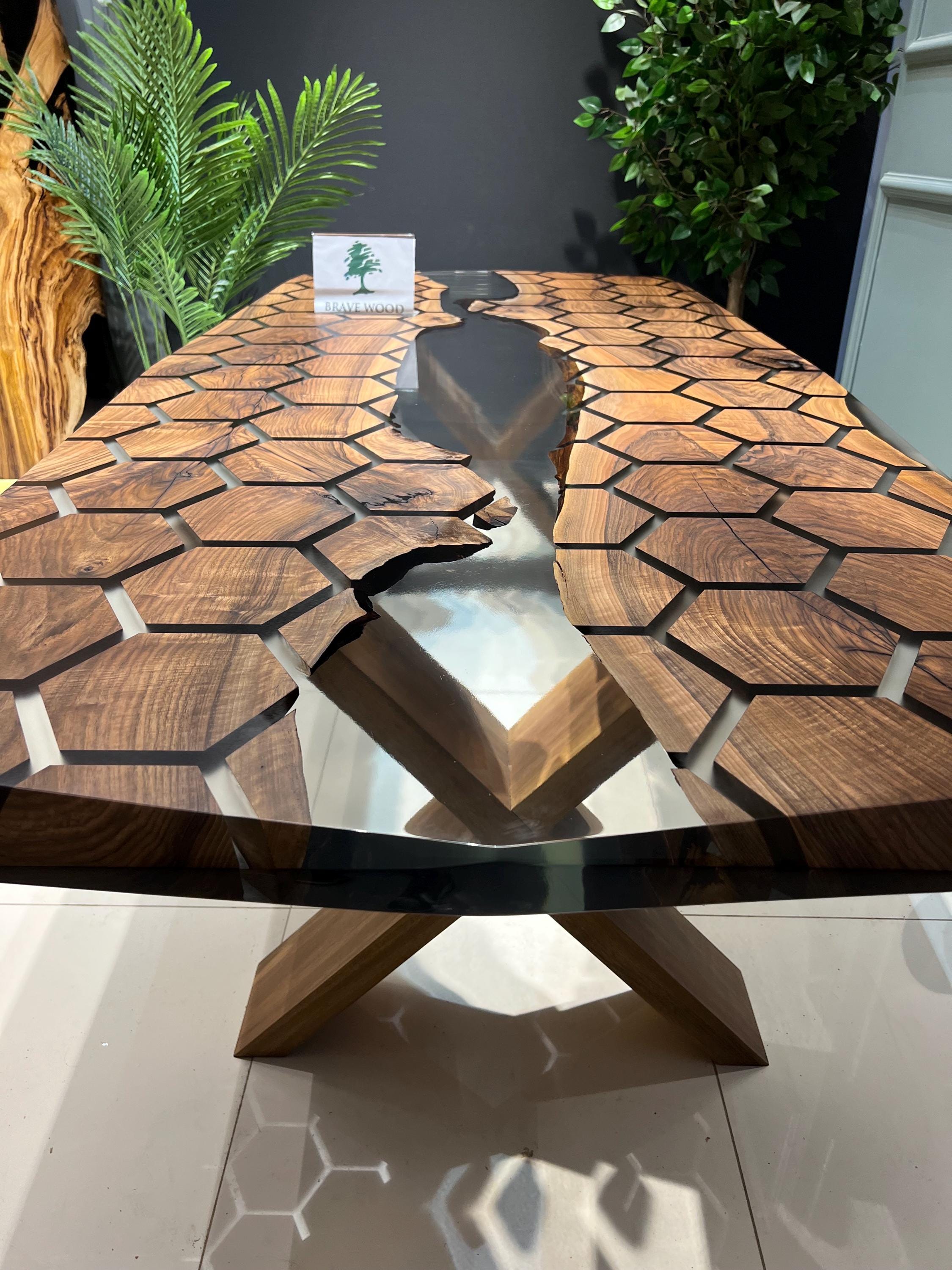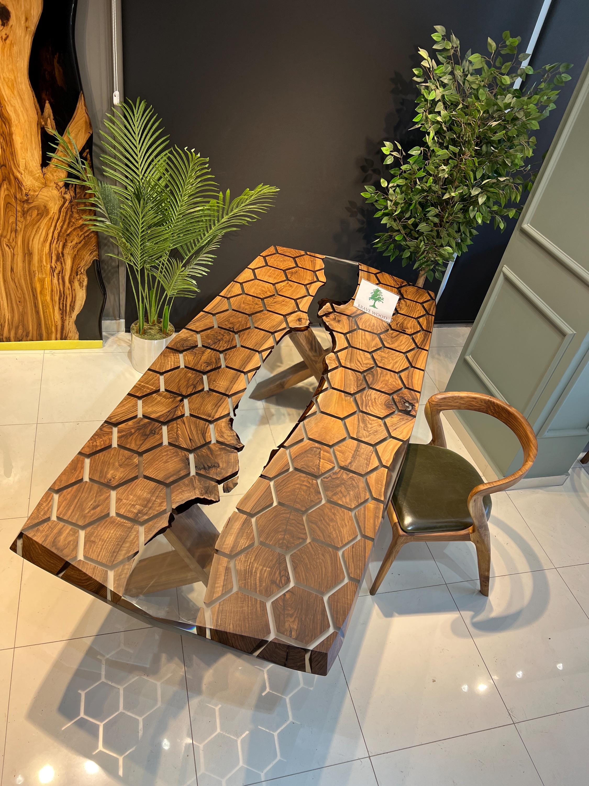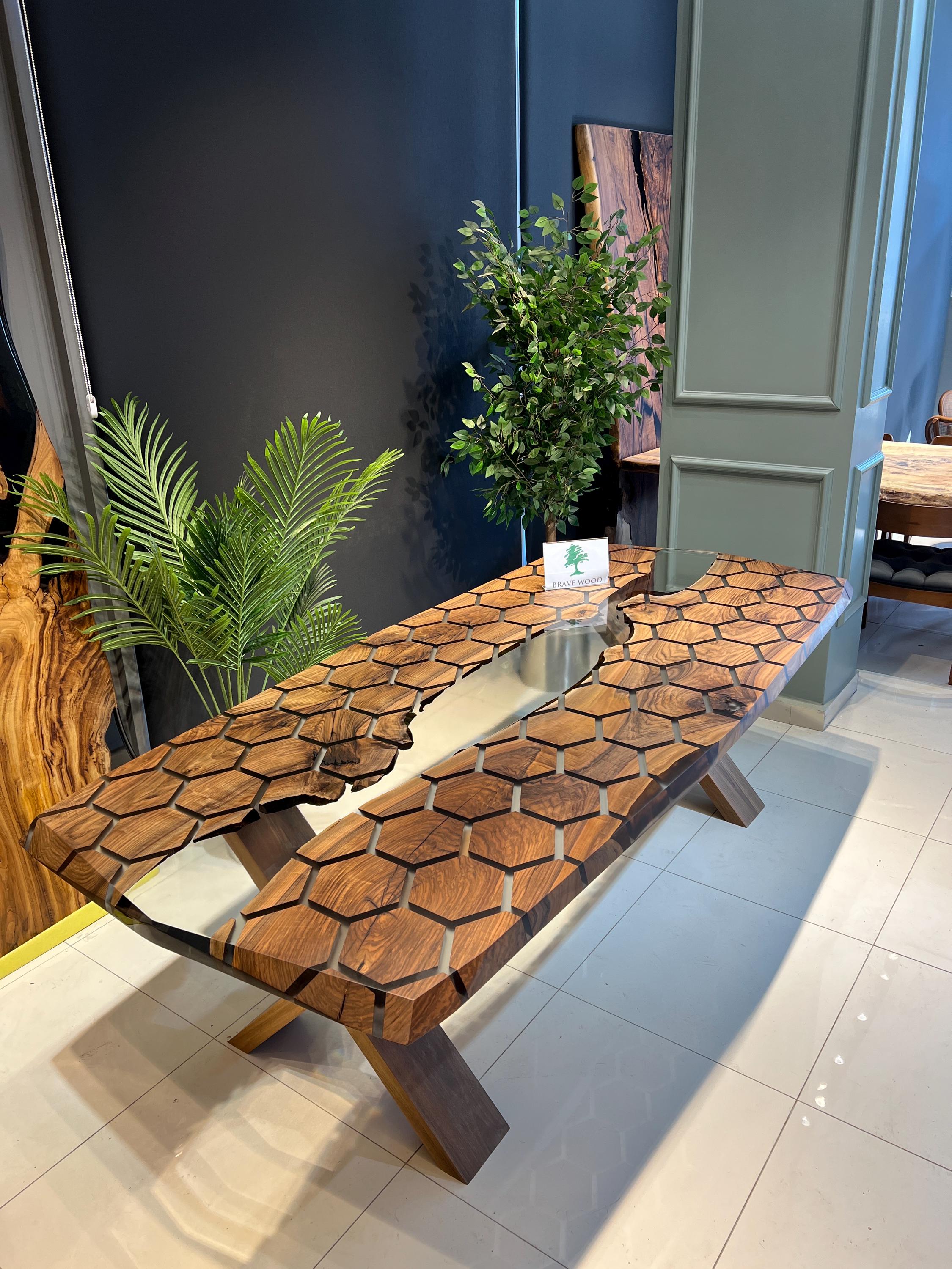 Honeycomb Epoxy Walnut Dining Table: Clear Resin Inlay