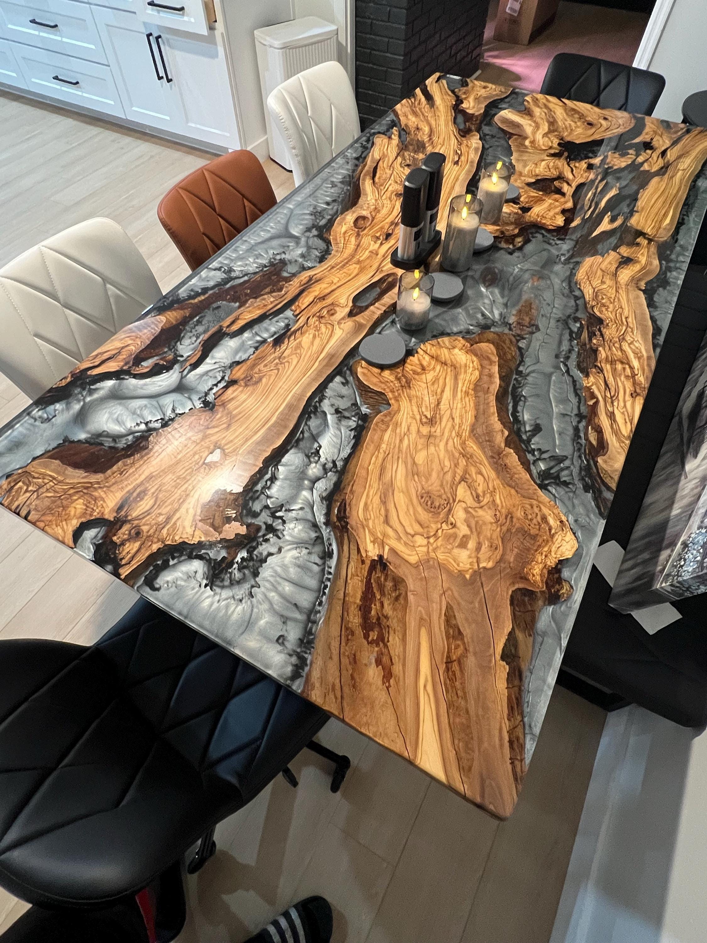 Olive Dining Table for your living room or kitchen. Custom made olive wood dining table with blue or green epoxy like river pattern. Unique, special design with soft edges and handmade production just for you, your home and your kitchen.