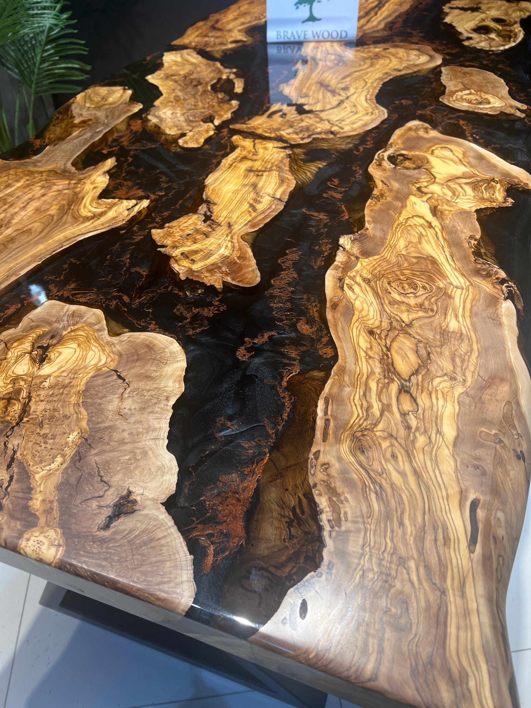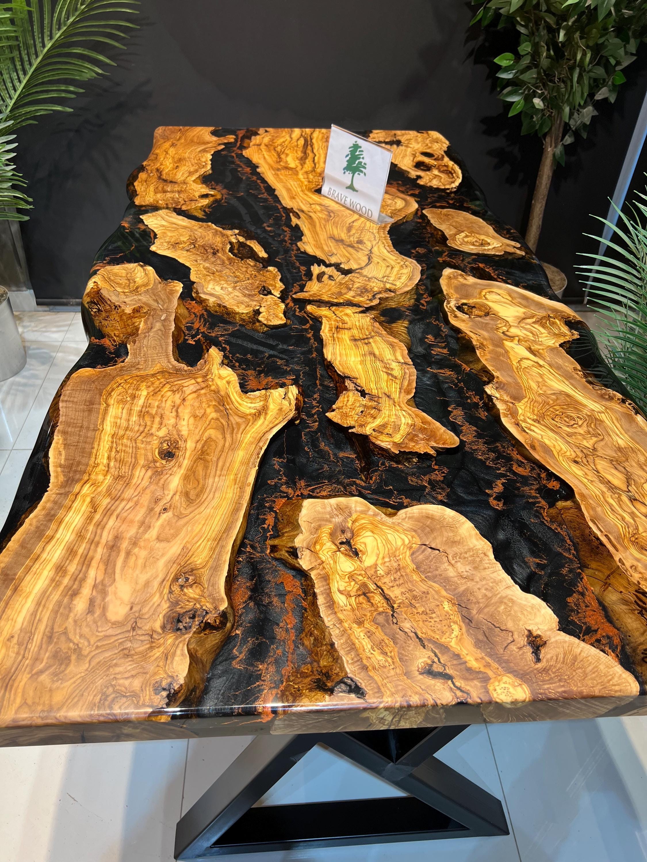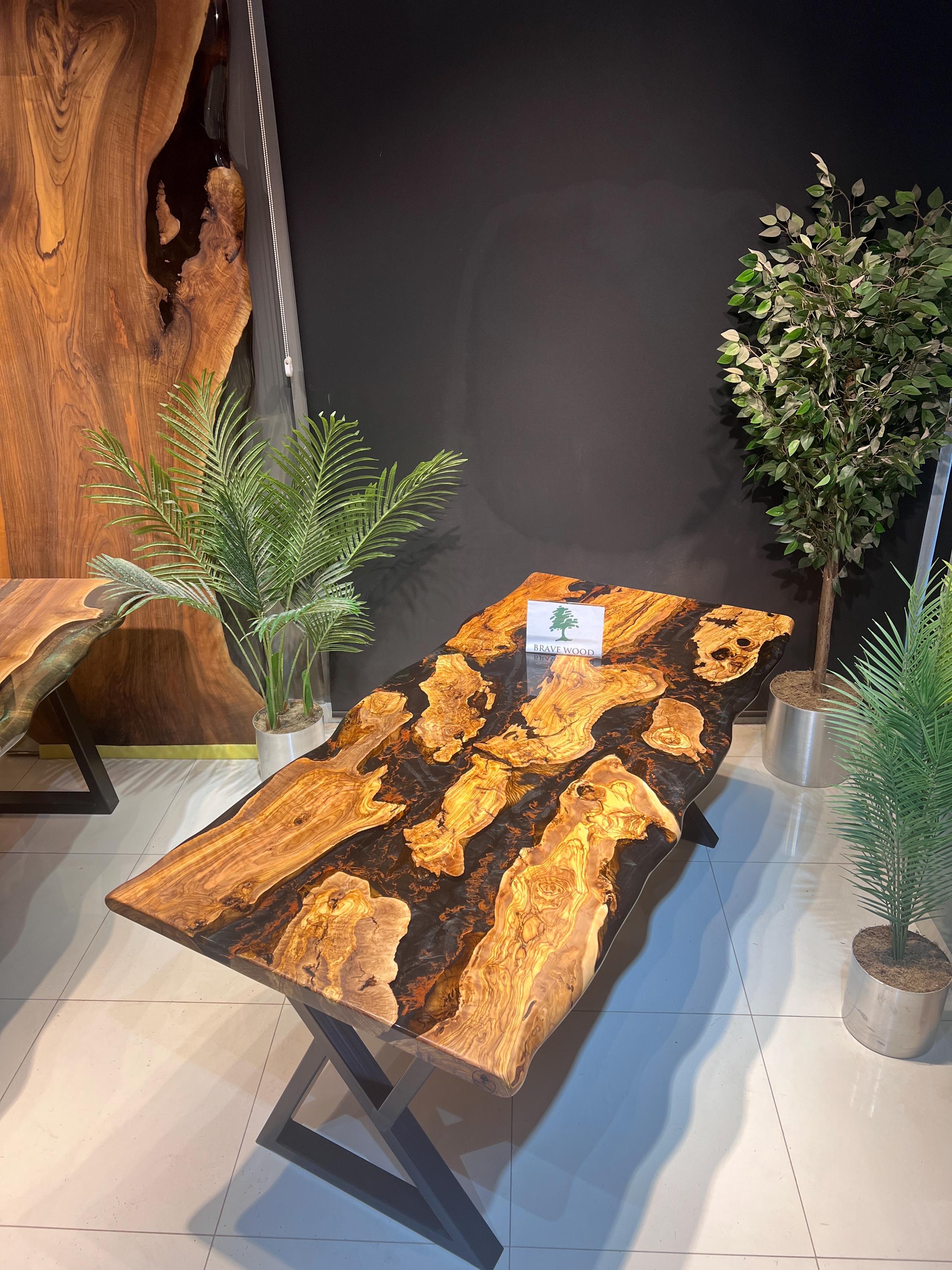 Olive Dining Table for your living room or kitchen. Custom made olive wood dining table with blue or green epoxy like river pattern. Unique, special design with soft edges and handmade production just for you, your home and your kitchen.