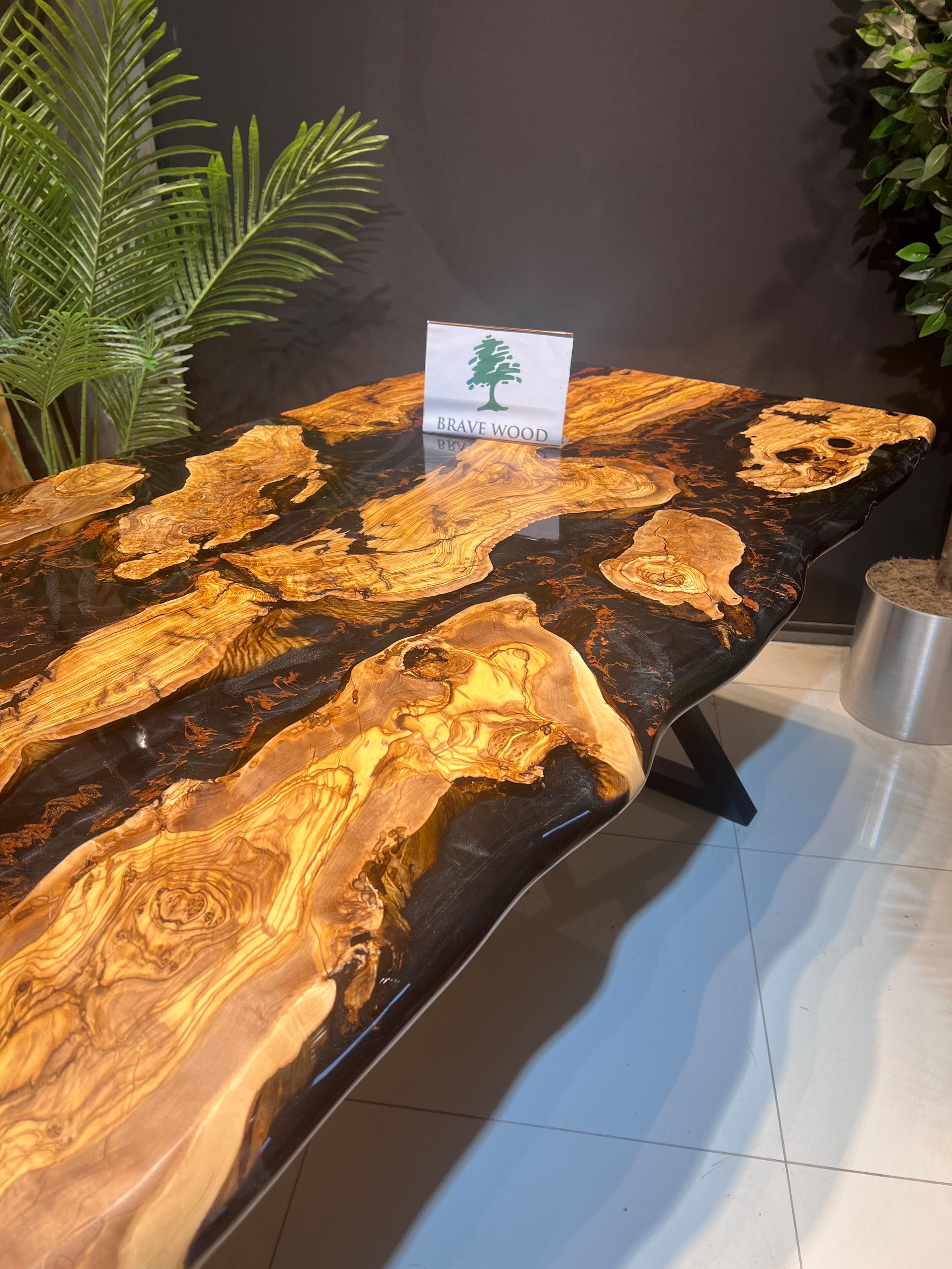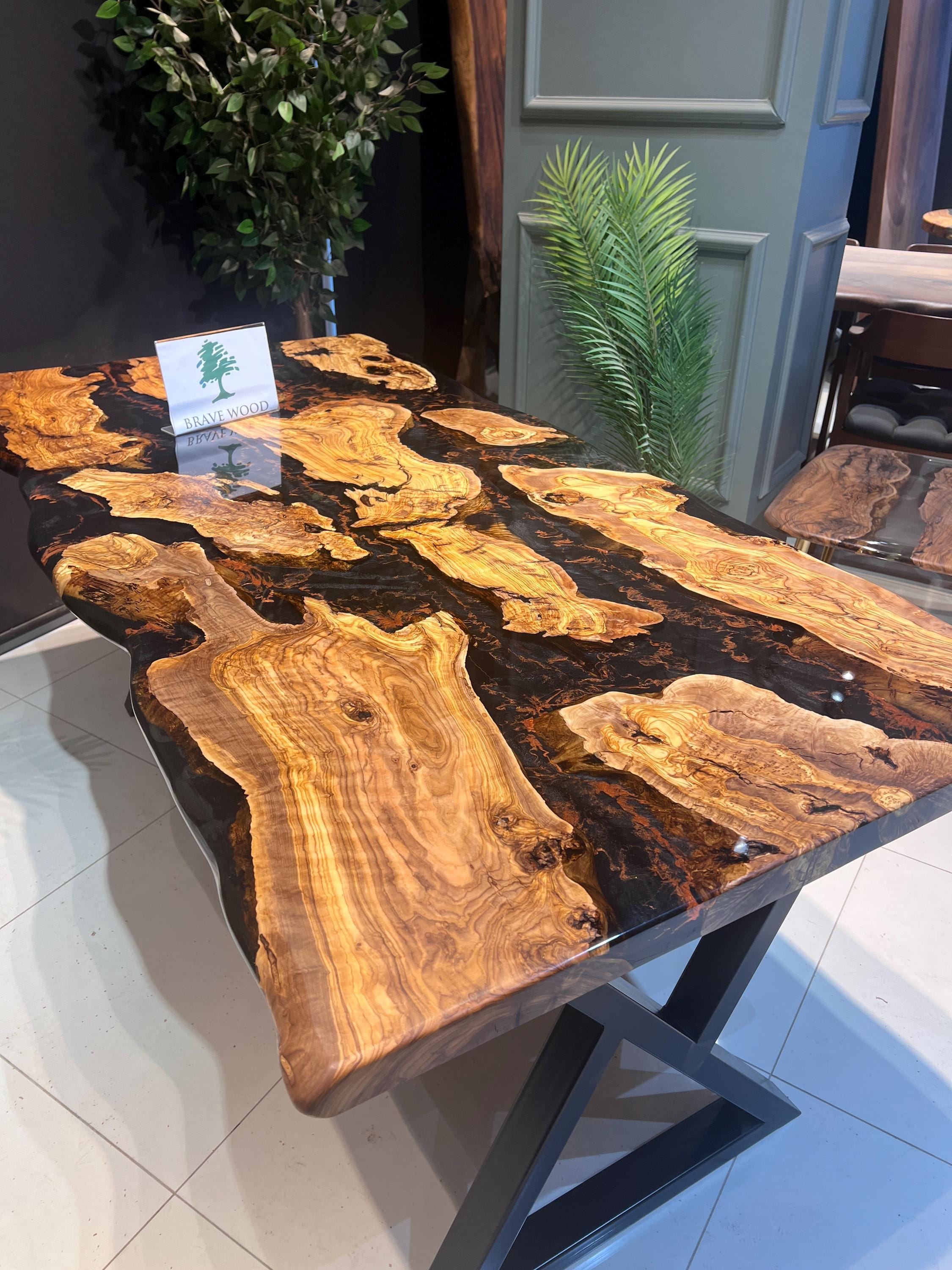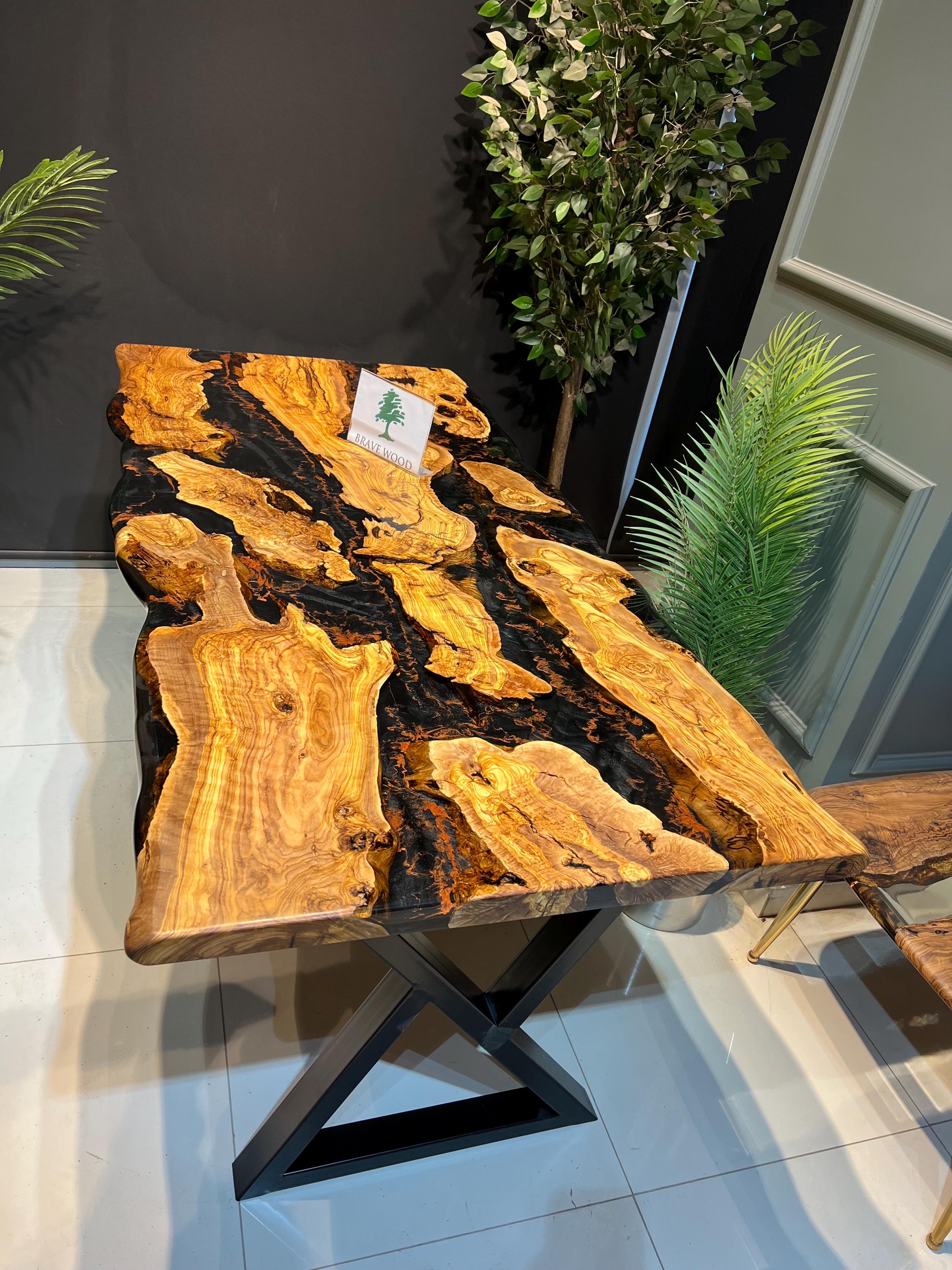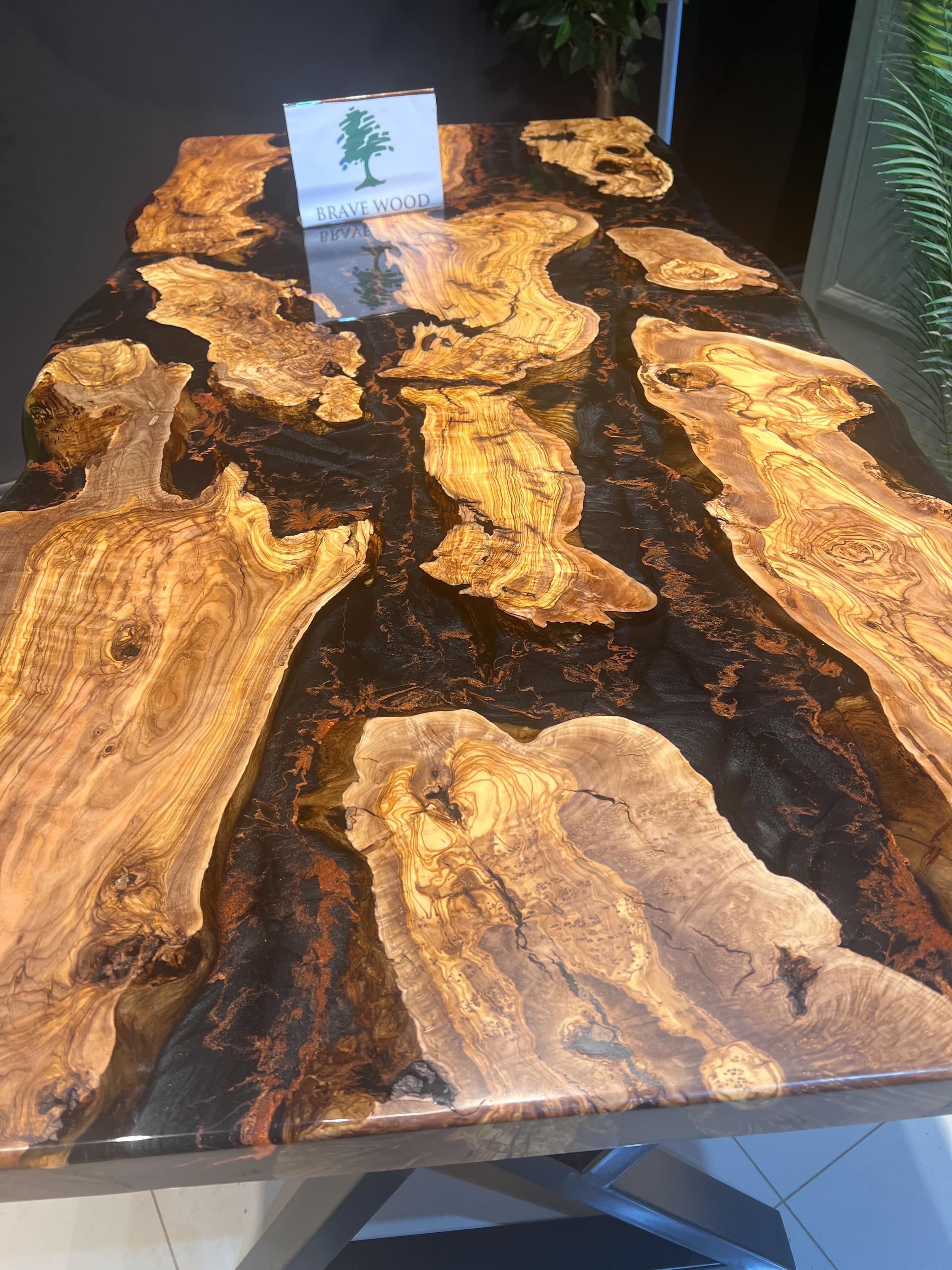 Olive Dining Table for your living room or kitchen. Custom made olive wood dining table with blue or green epoxy like river pattern. Unique, special design with soft edges and handmade production just for you, your home and your kitchen.