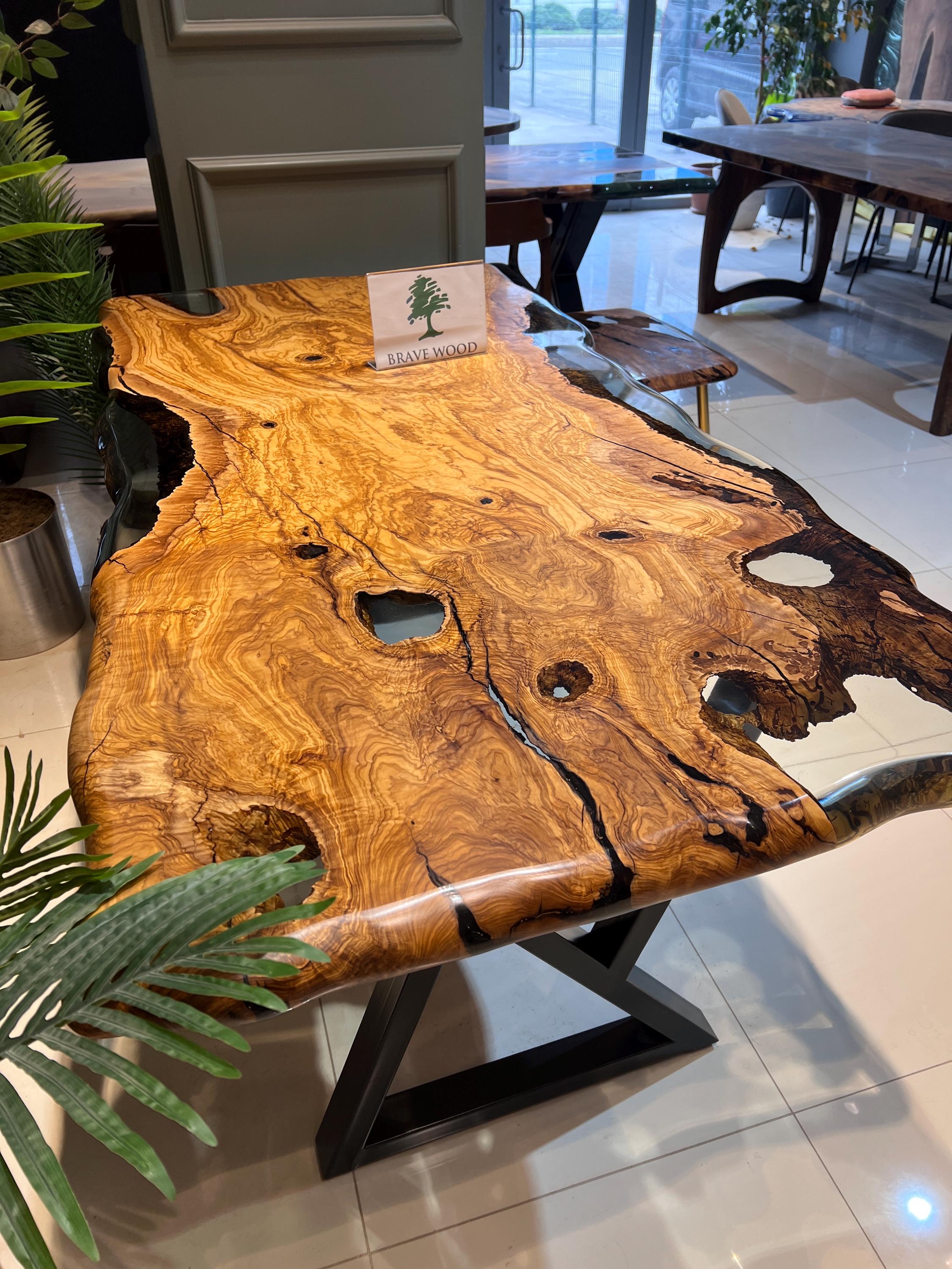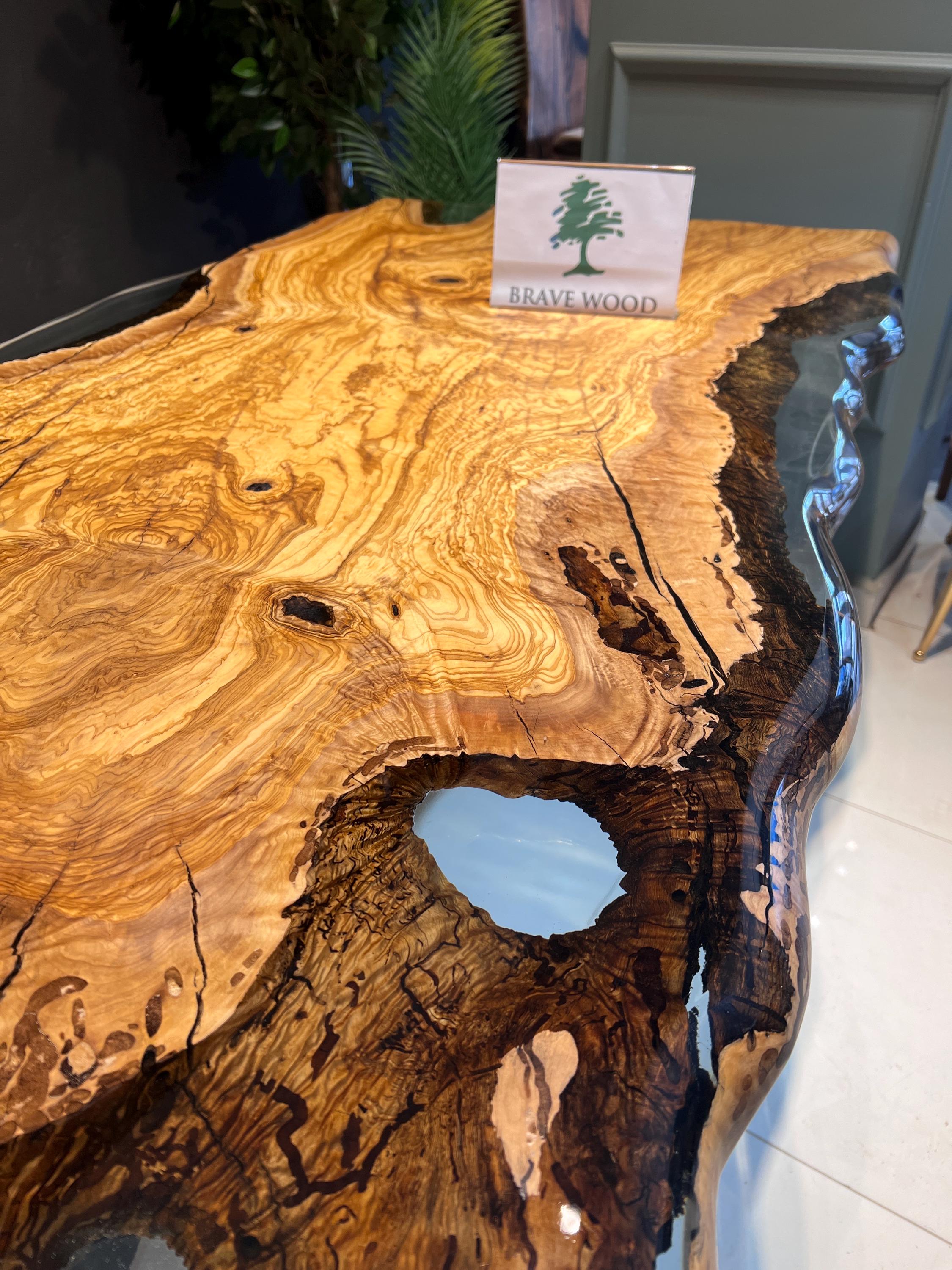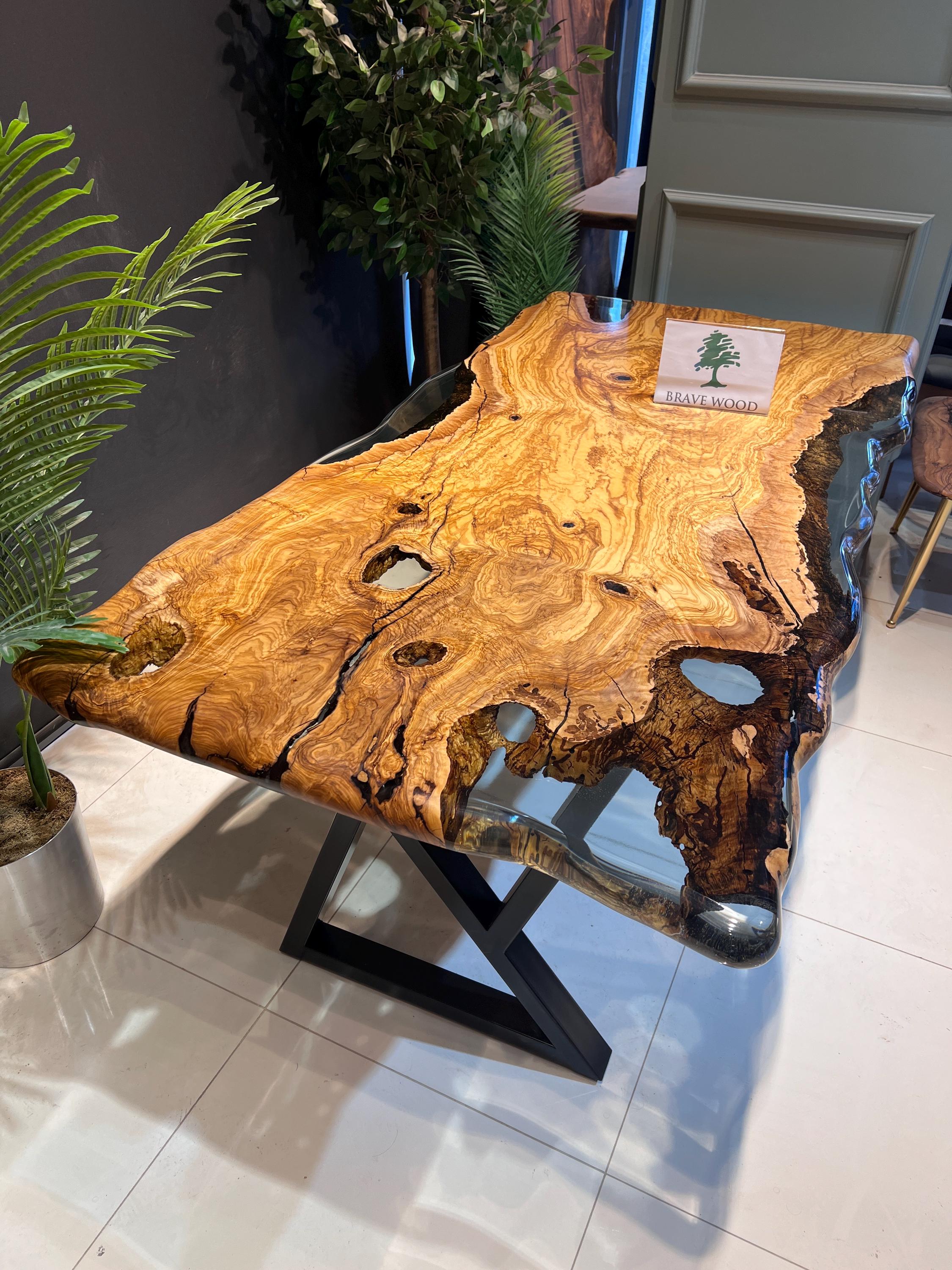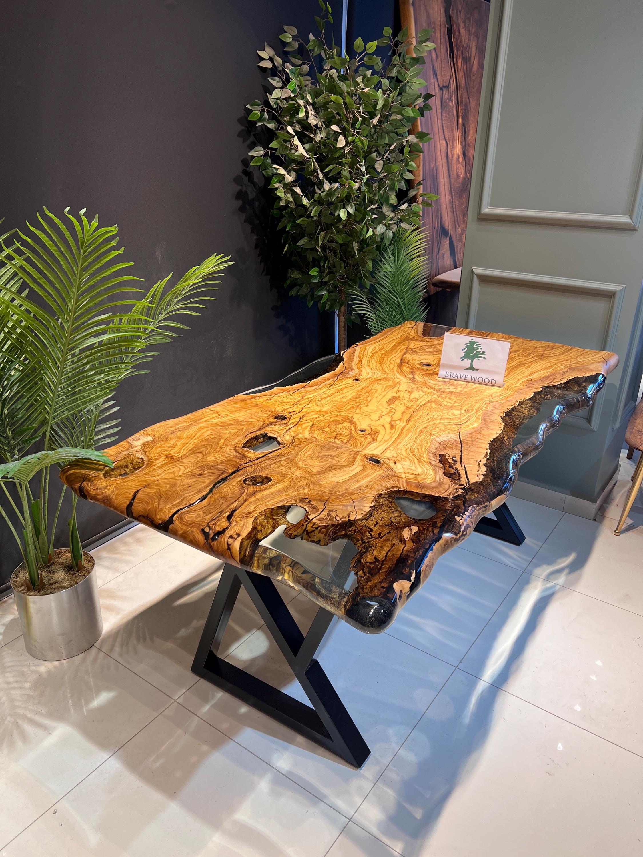 Olive Dining Table for your living room or kitchen. Custom made olive wood dining table with clear epoxy like river pattern. Unique, special design with soft edges and handmade production just for you, your home and your kitchen.