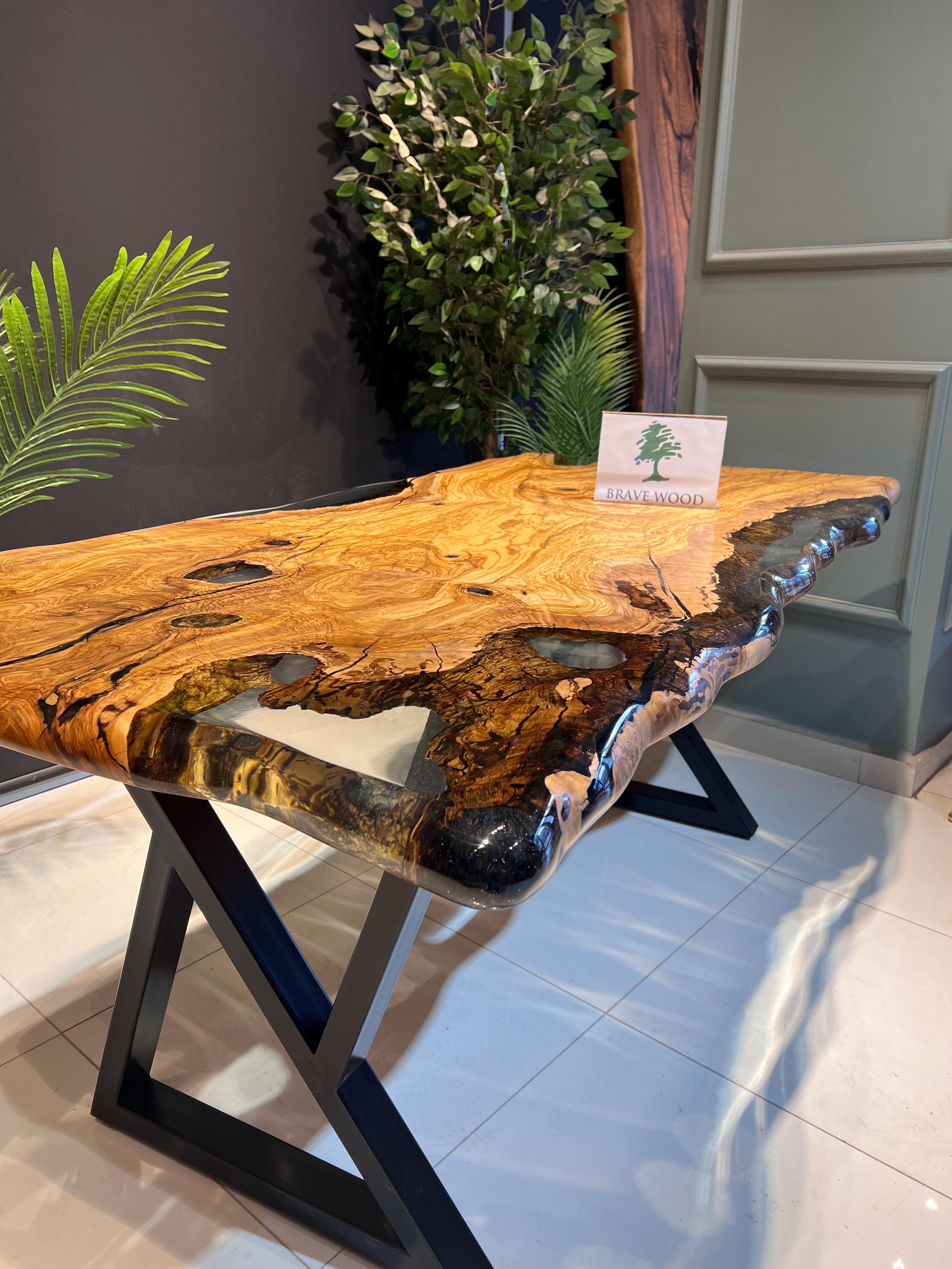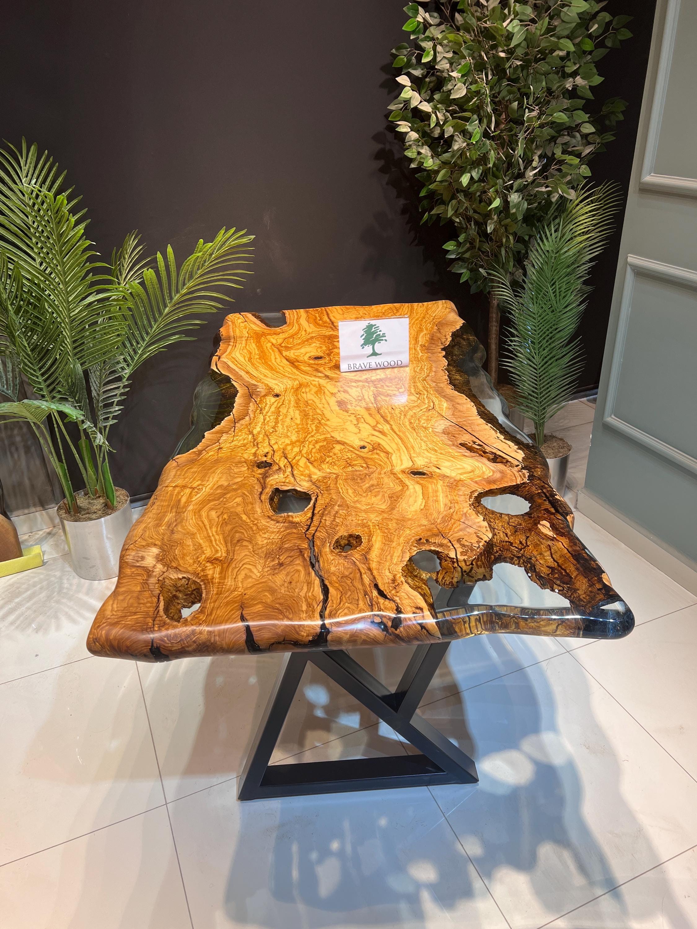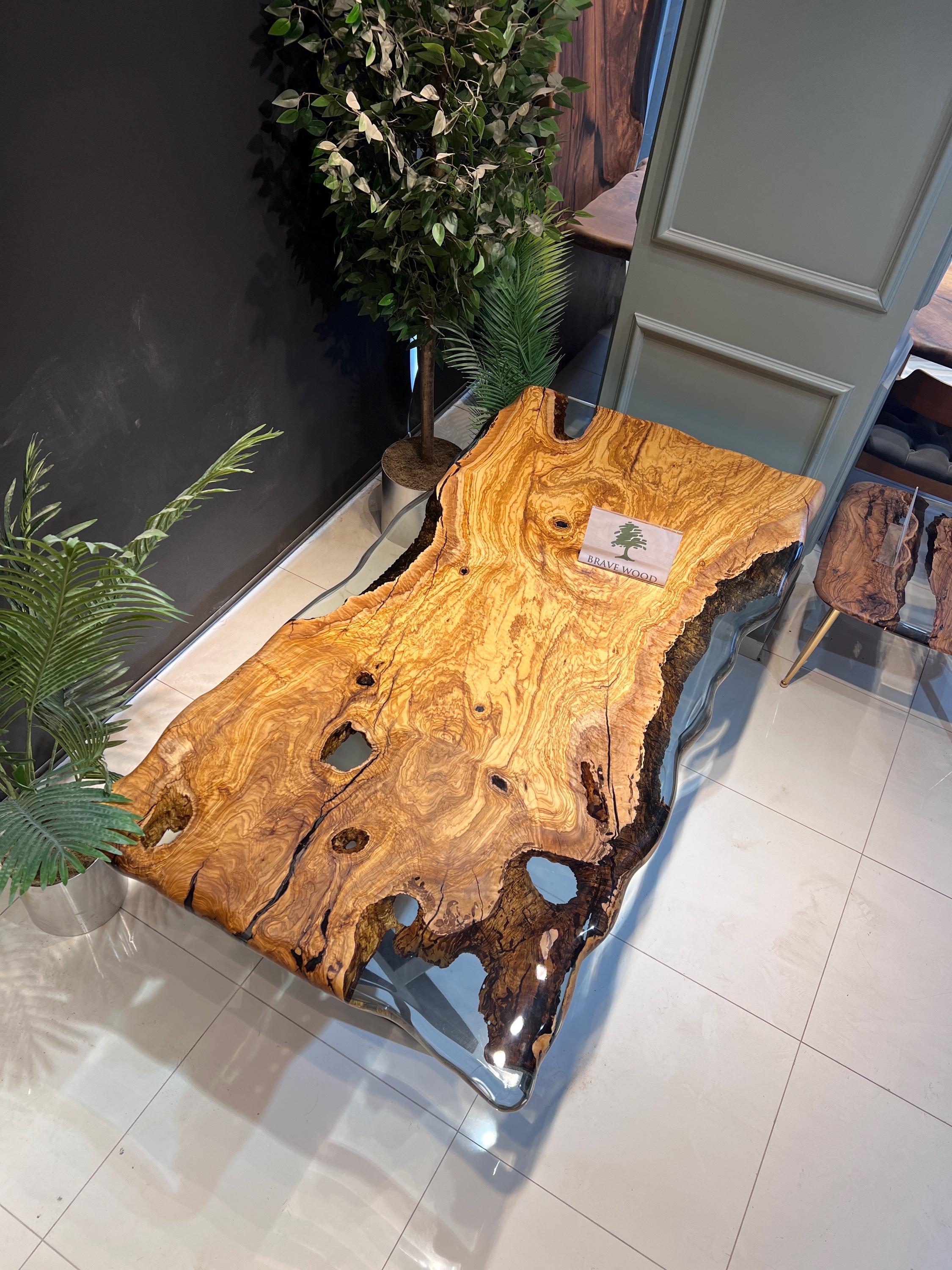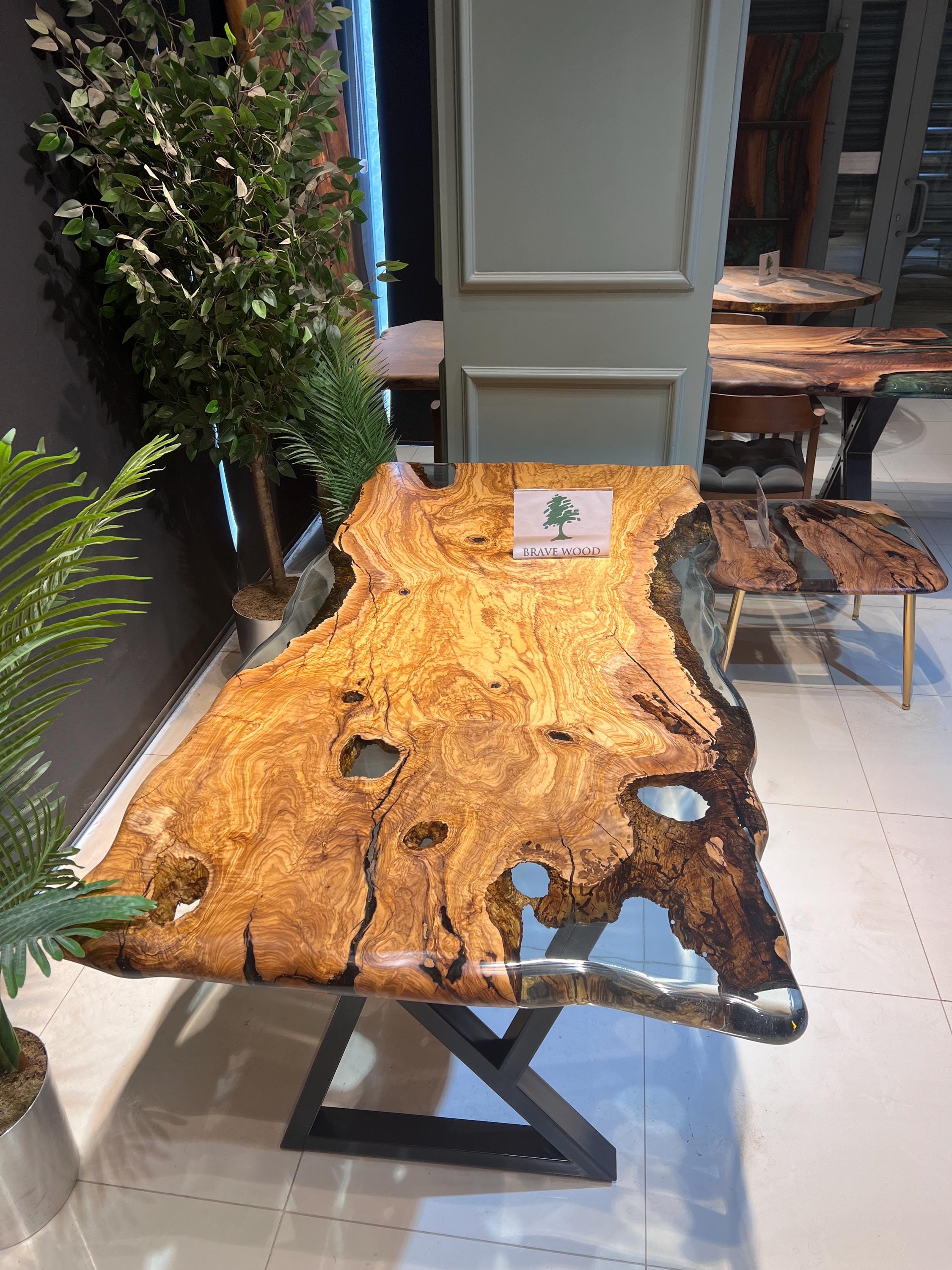 Olive Dining Table for your living room or kitchen. Custom made olive wood dining table with clear epoxy like river pattern. Unique, special design with soft edges and handmade production just for you, your home and your kitchen.