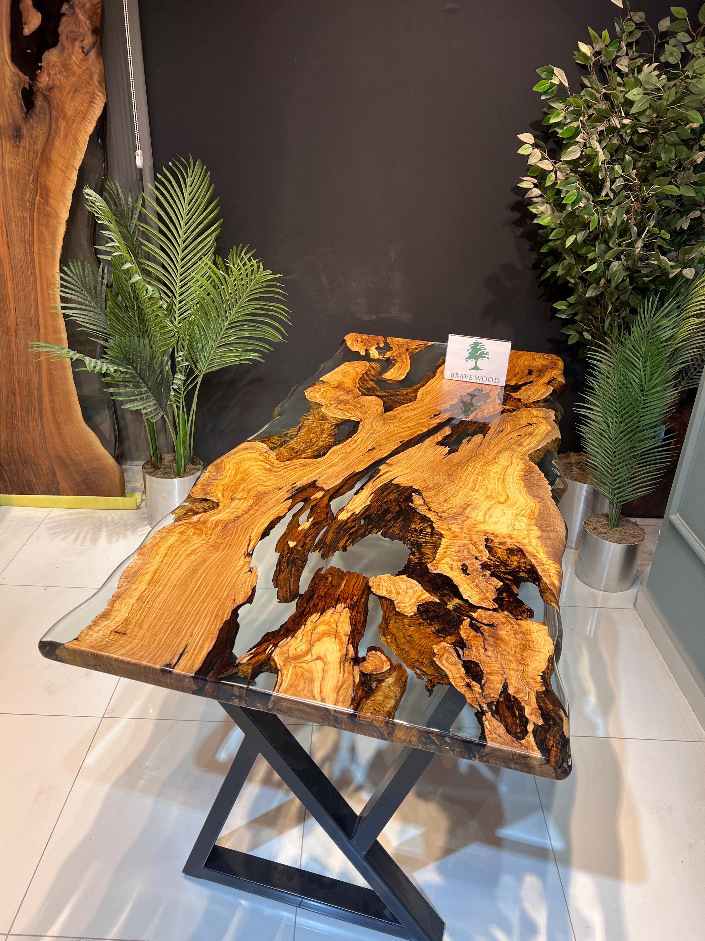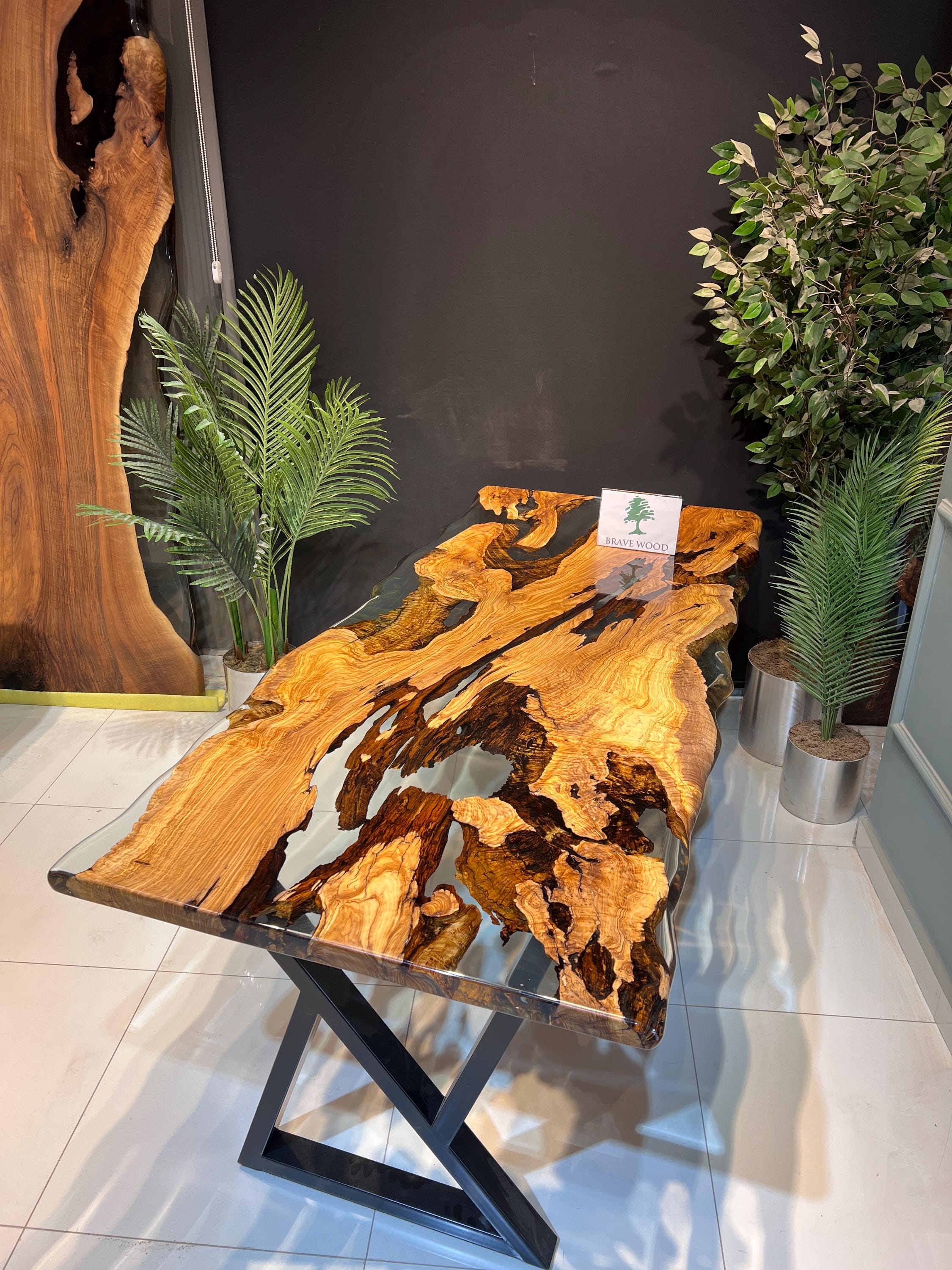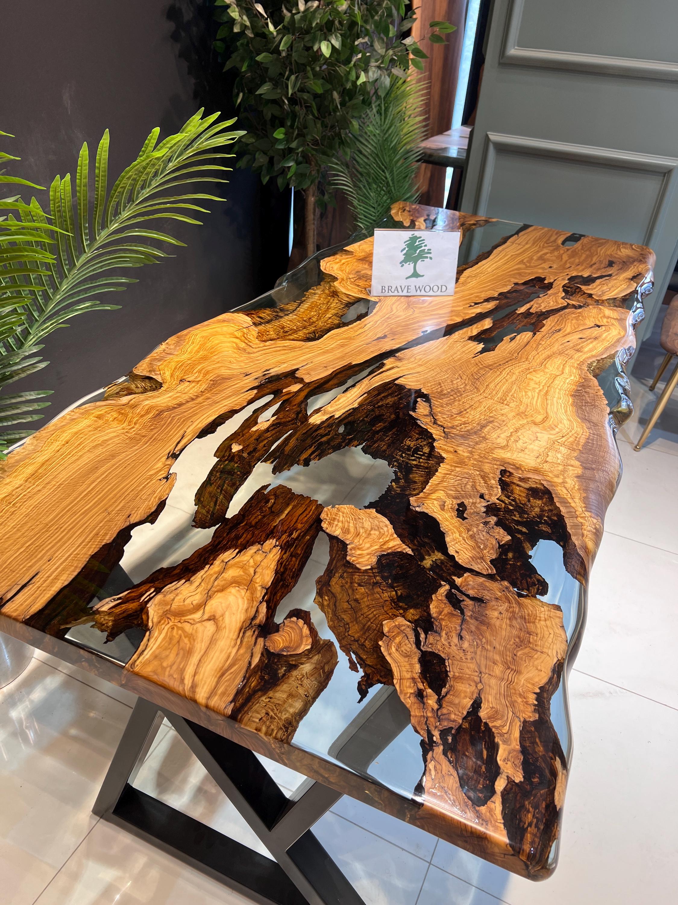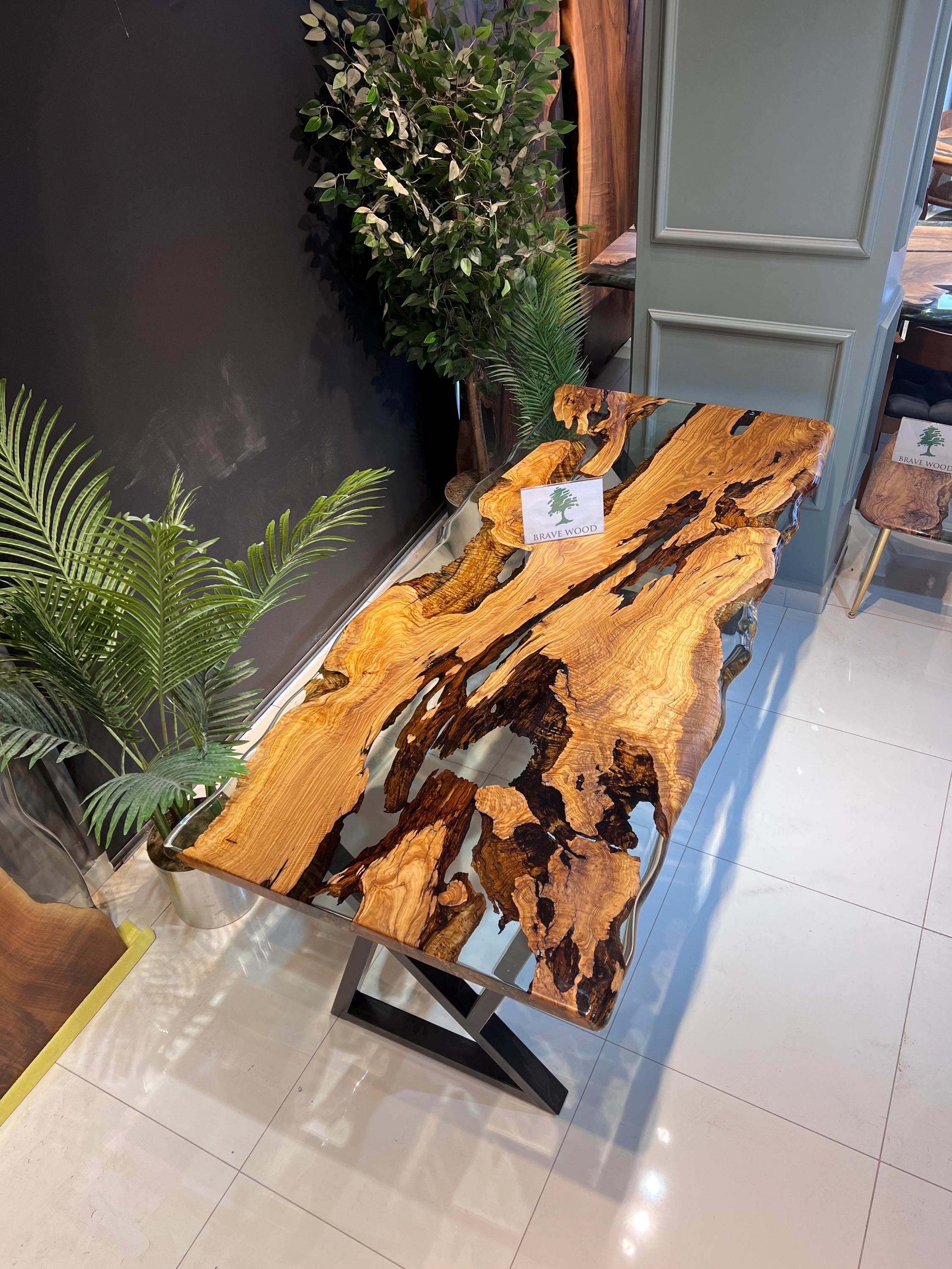 Olive Dining Table for your living room or kitchen. Custom made olive wood dining table with clear epoxy like river pattern. Unique, special design with soft edges and handmade production just for you, your home and your kitchen.