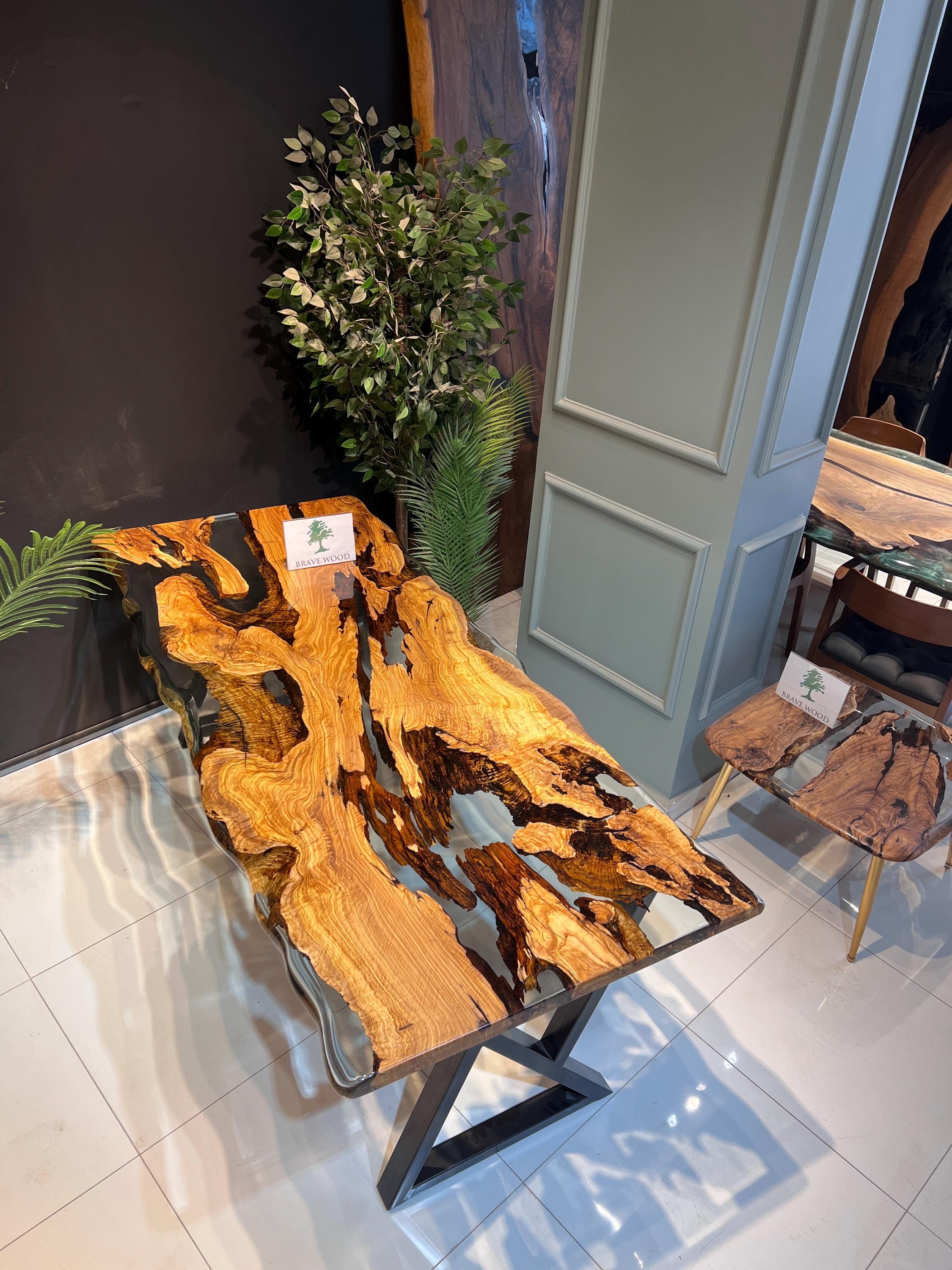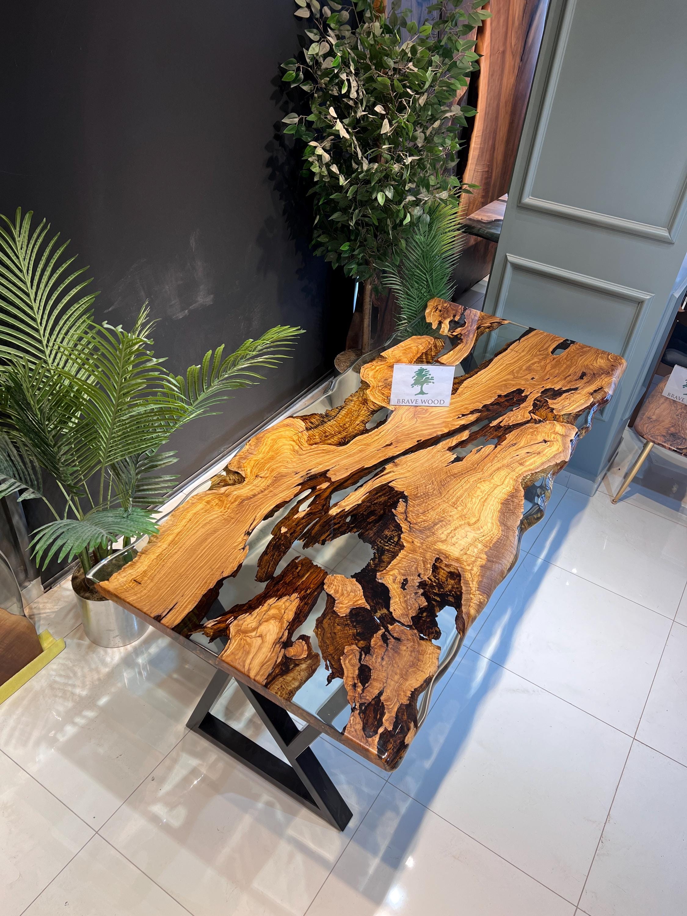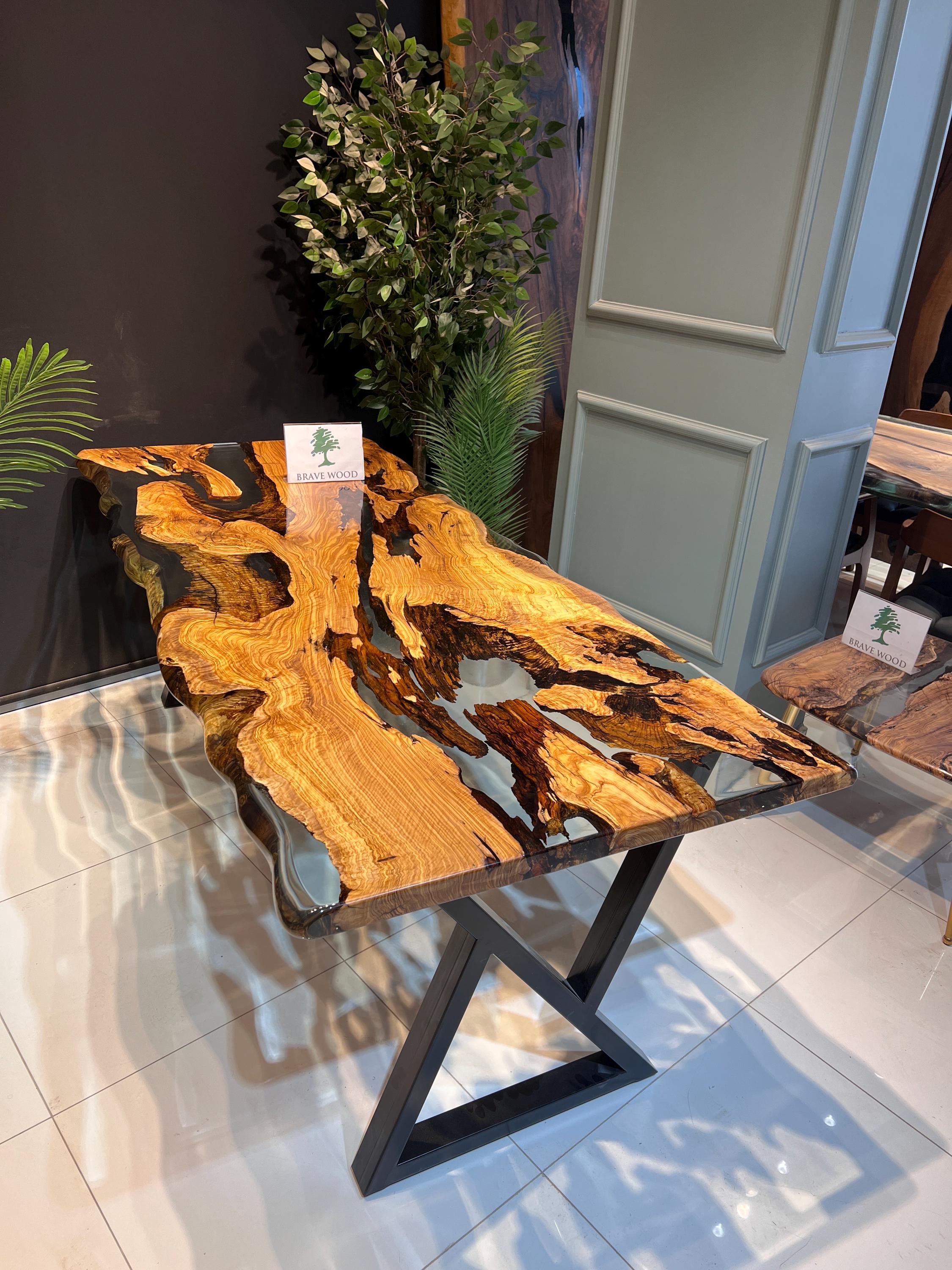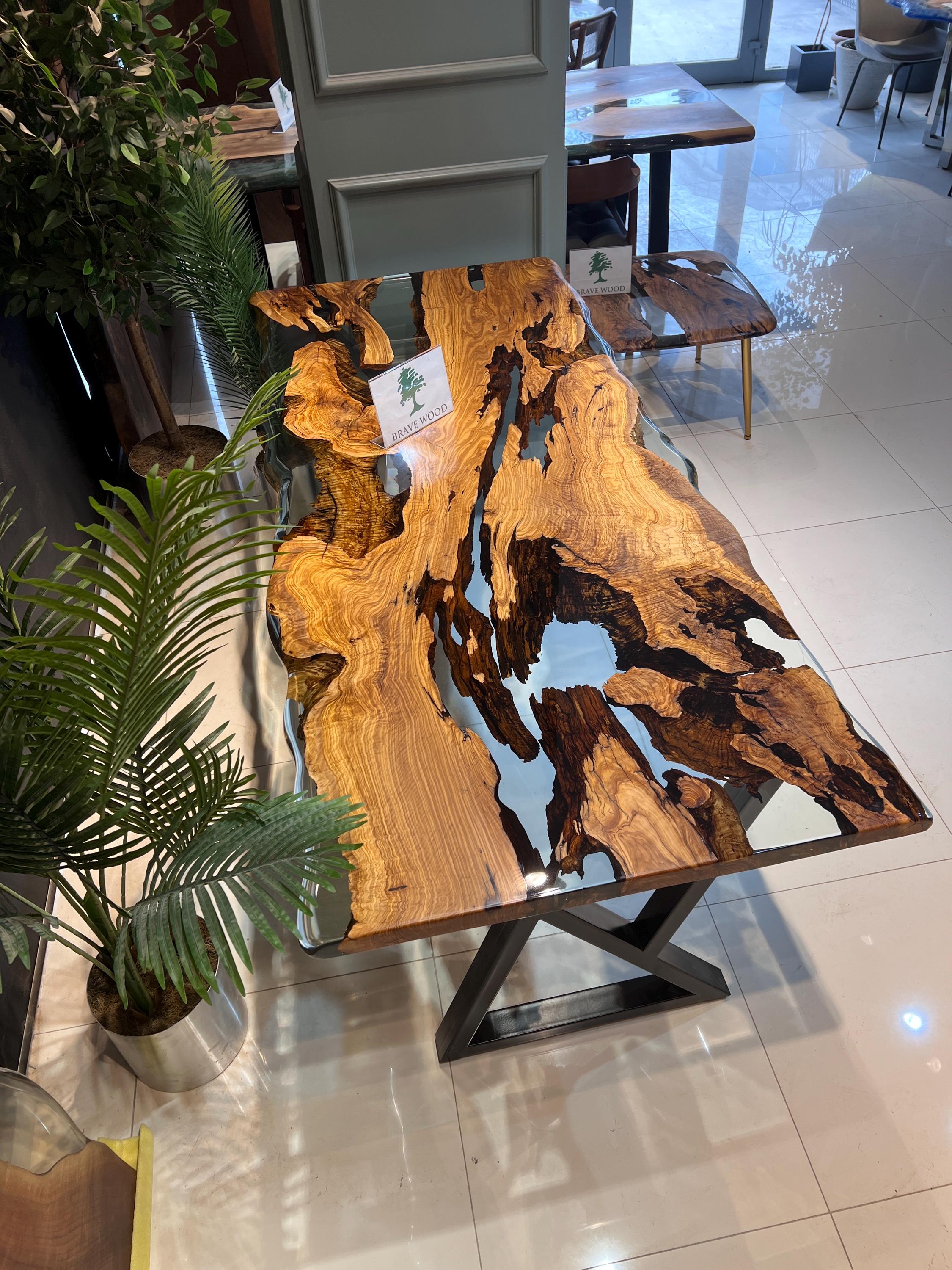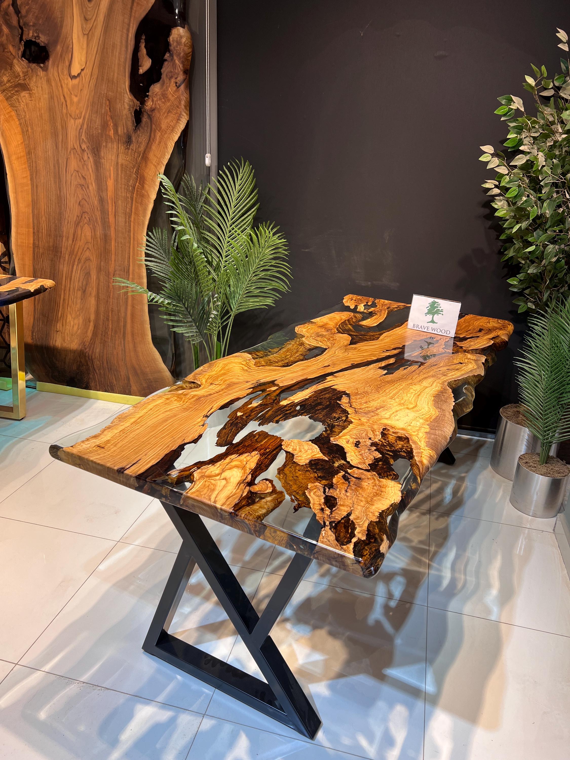 Olive Dining Table for your living room or kitchen. Custom made olive wood dining table with clear epoxy like river pattern. Unique, special design with soft edges and handmade production just for you, your home and your kitchen.