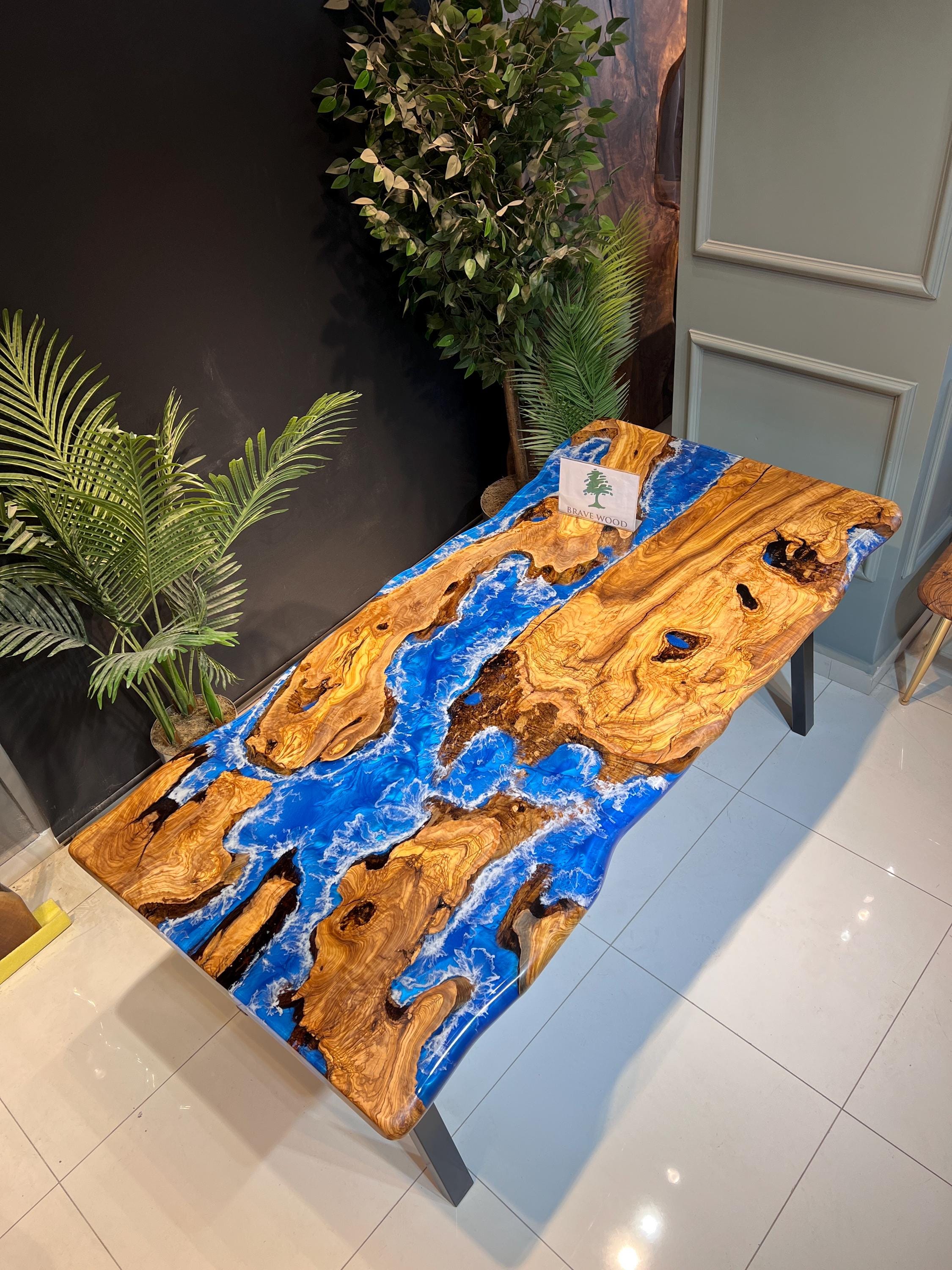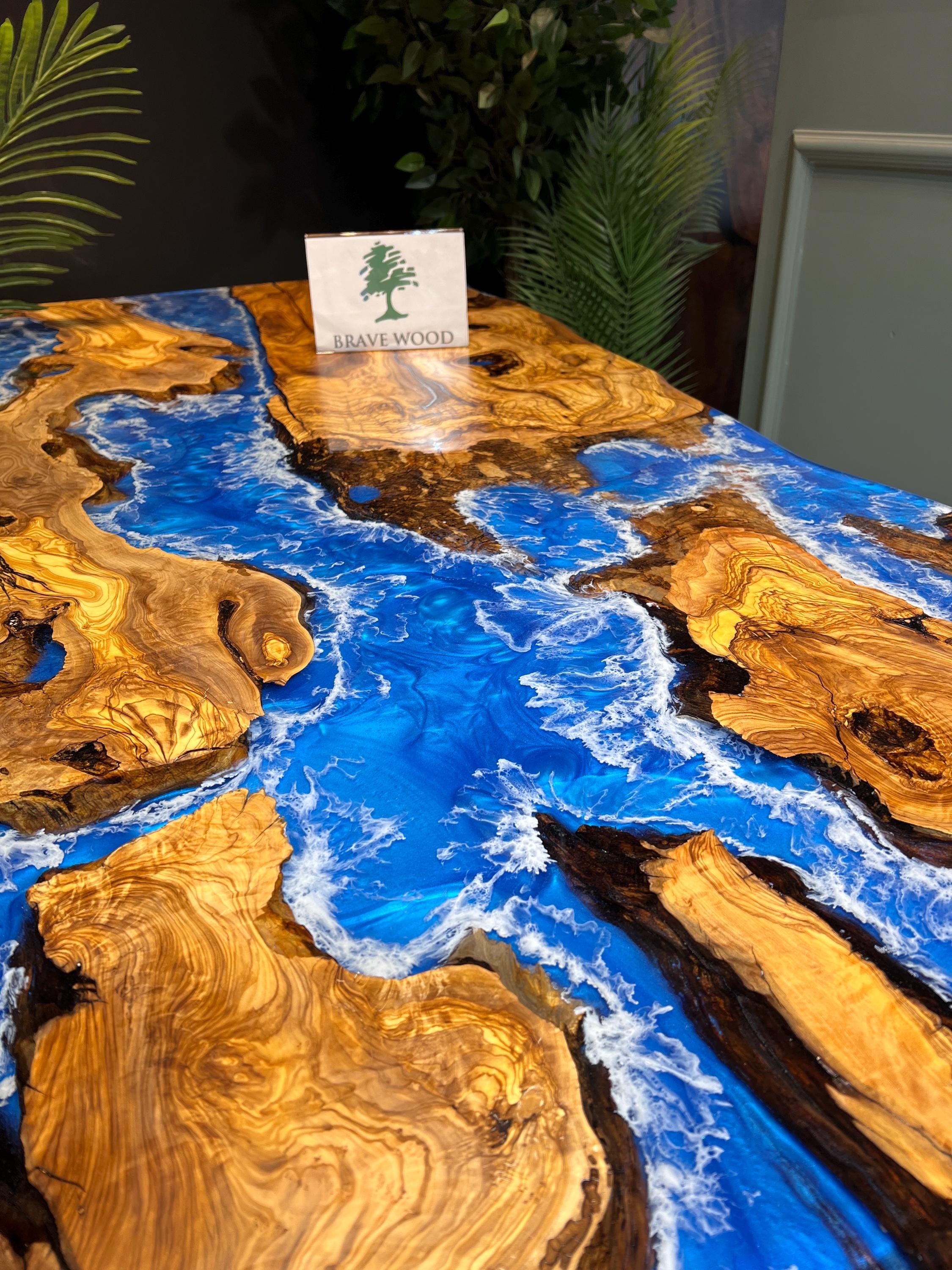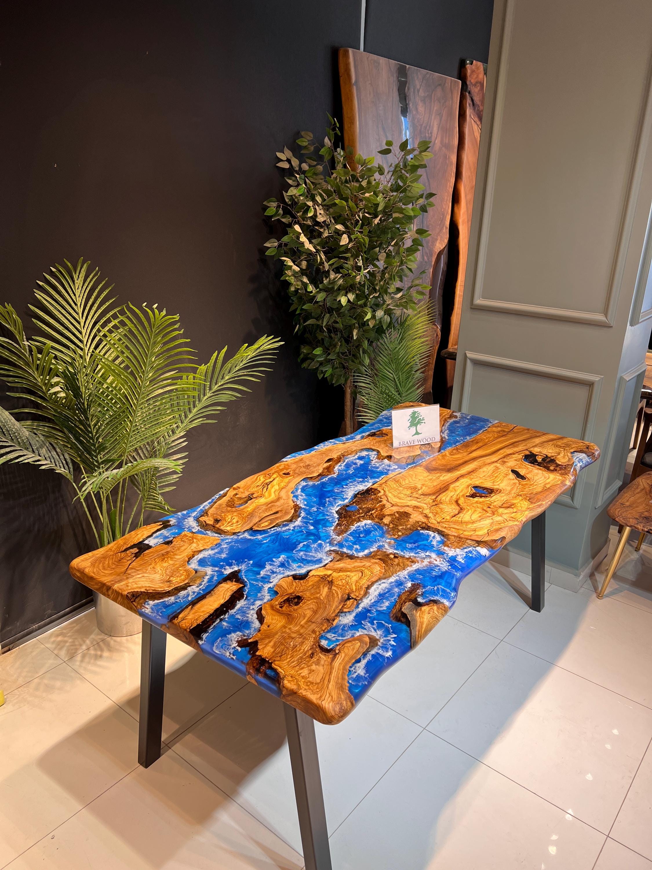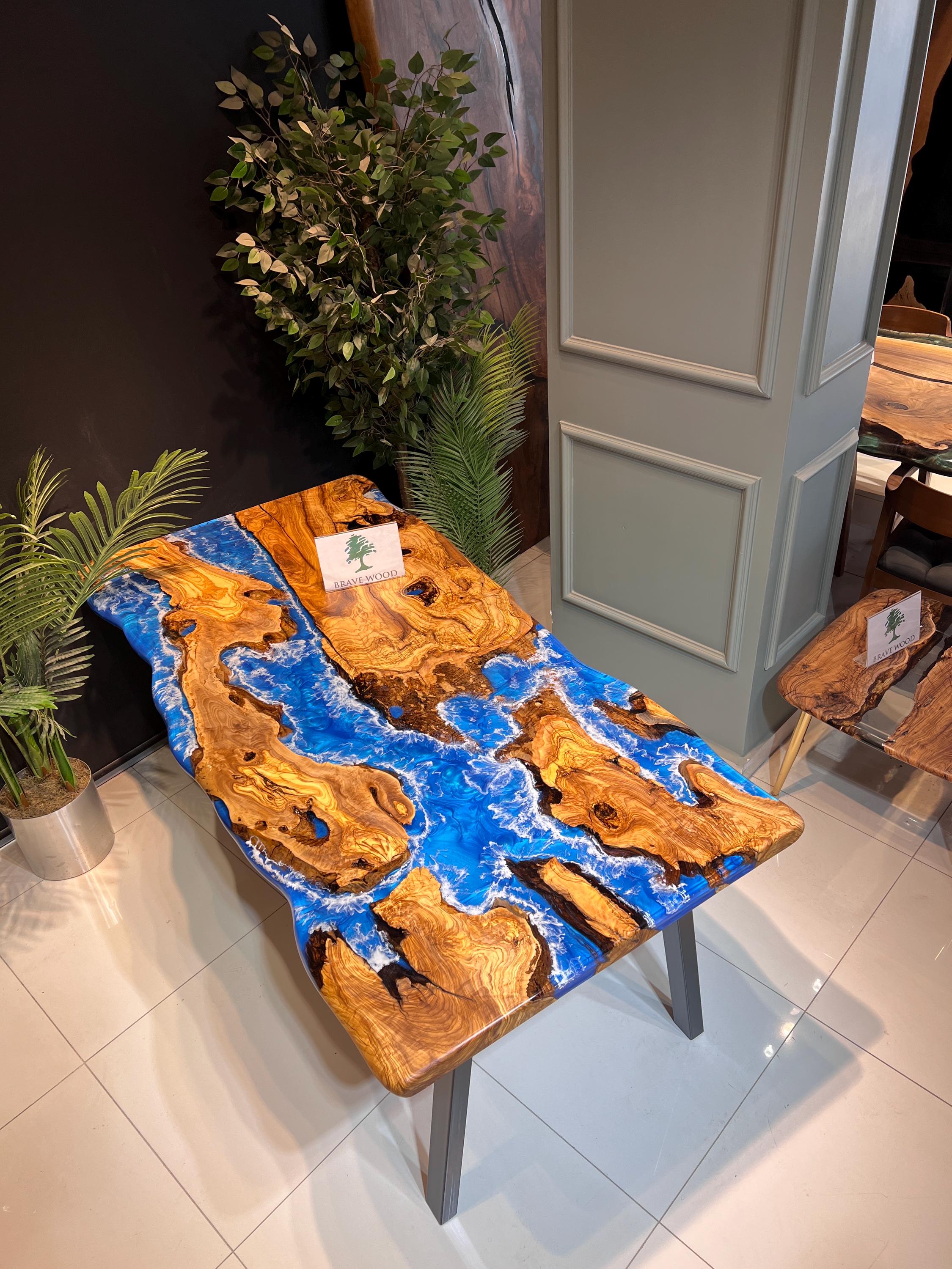 Olive Dining Table for your living room or kitchen. Custom made olive wood dining table with blue or green epoxy like river pattern. Unique, special design with soft edges and handmade production just for you, your home and your kitchen.