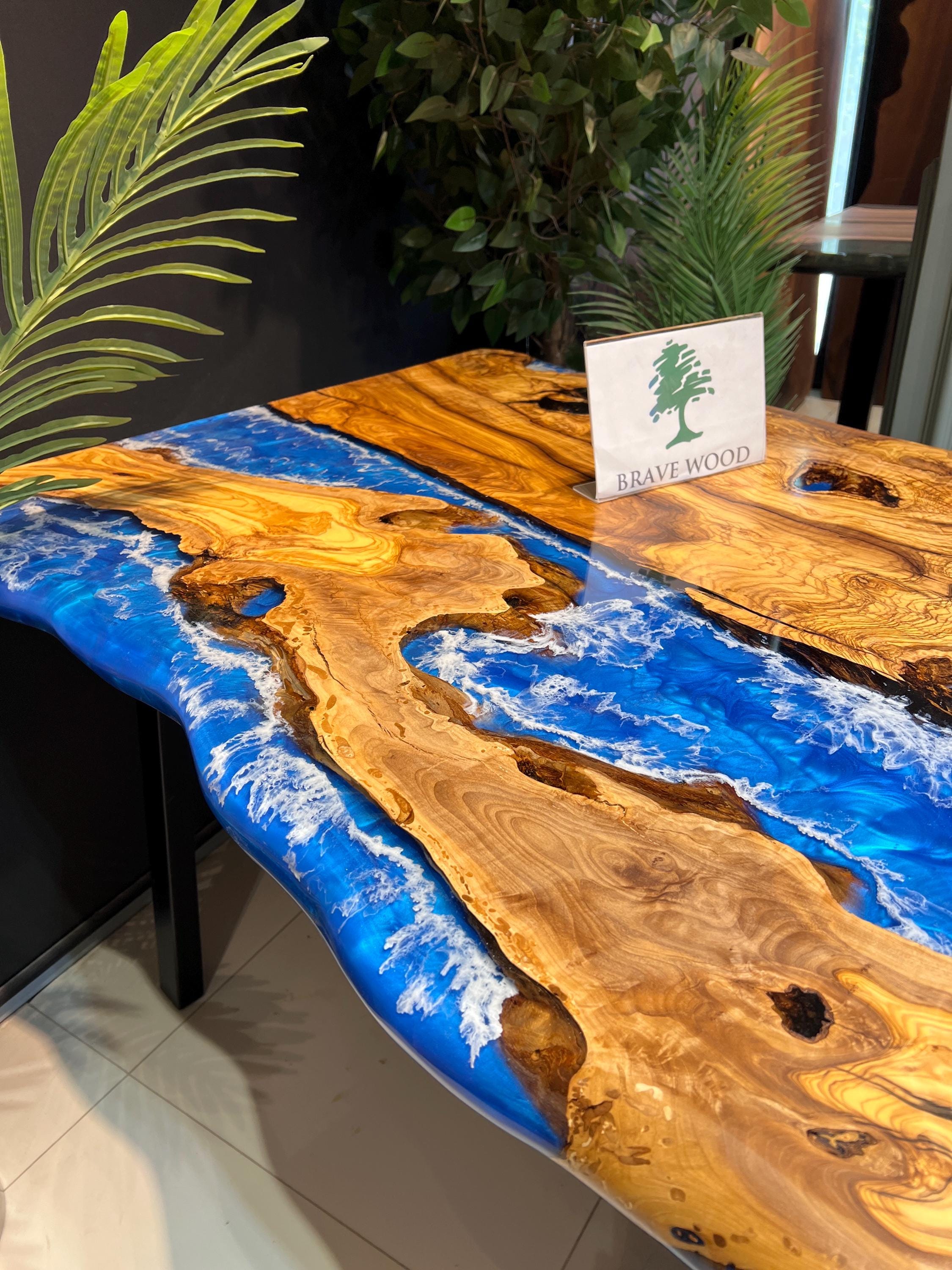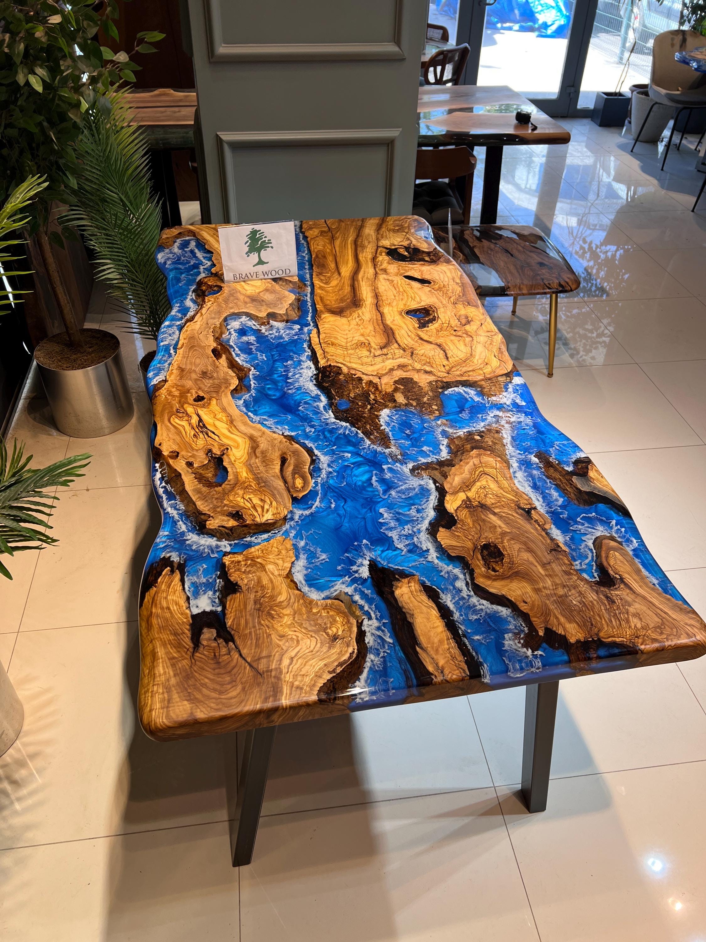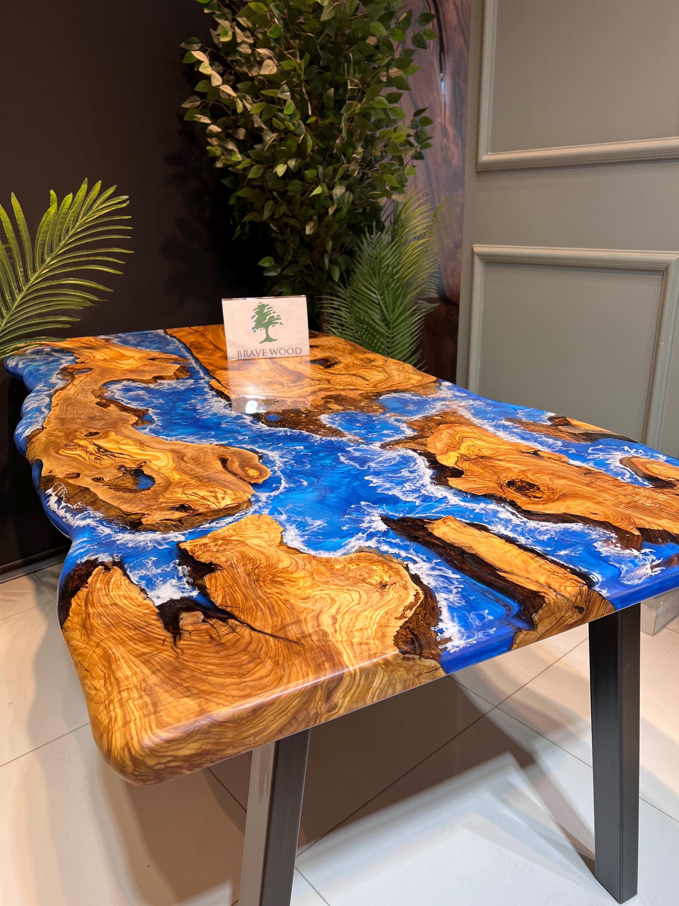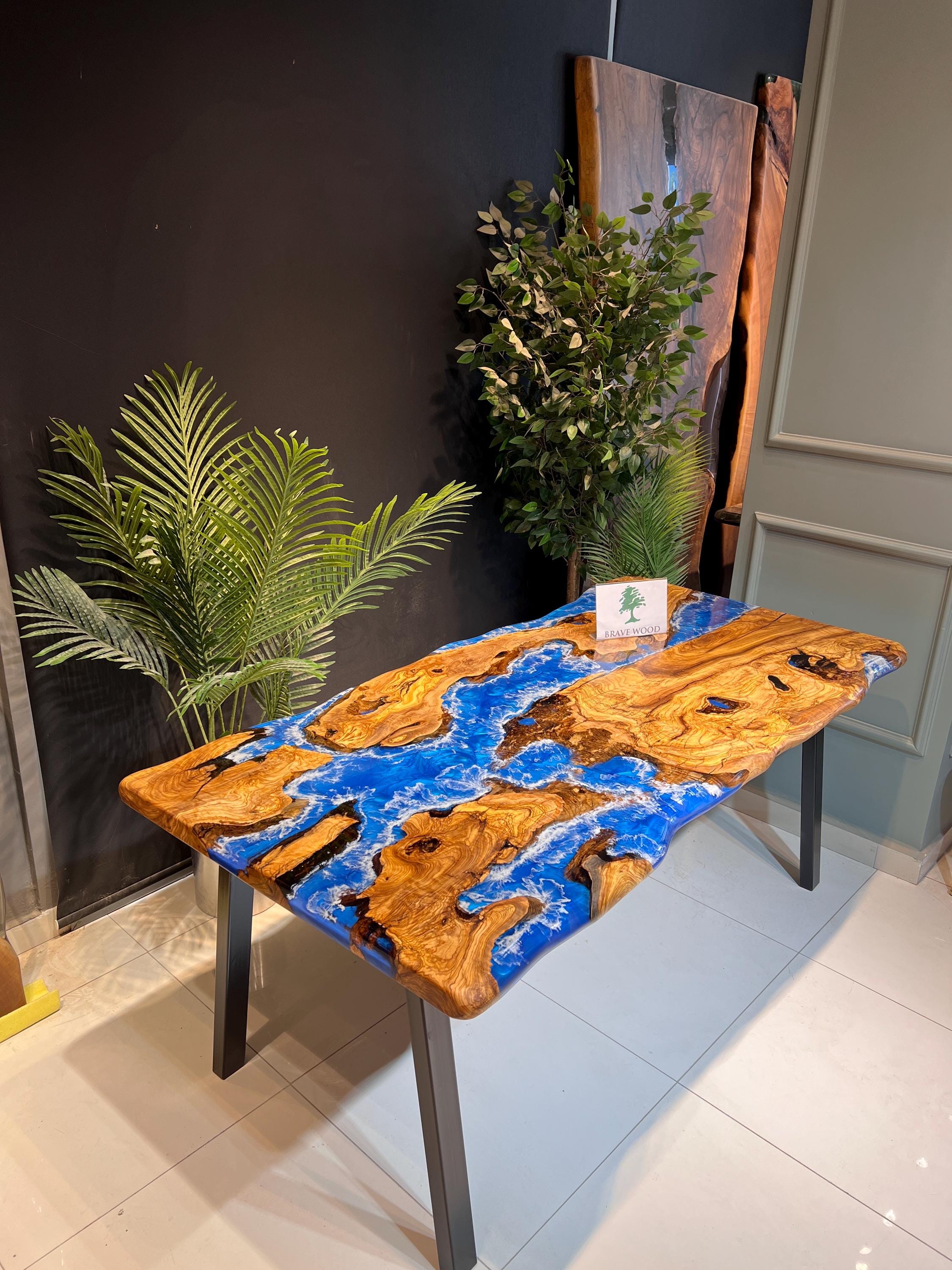 Olive Dining Table for your living room or kitchen. Custom made olive wood dining table with blue or green epoxy like river pattern. Unique, special design with soft edges and handmade production just for you, your home and your kitchen.