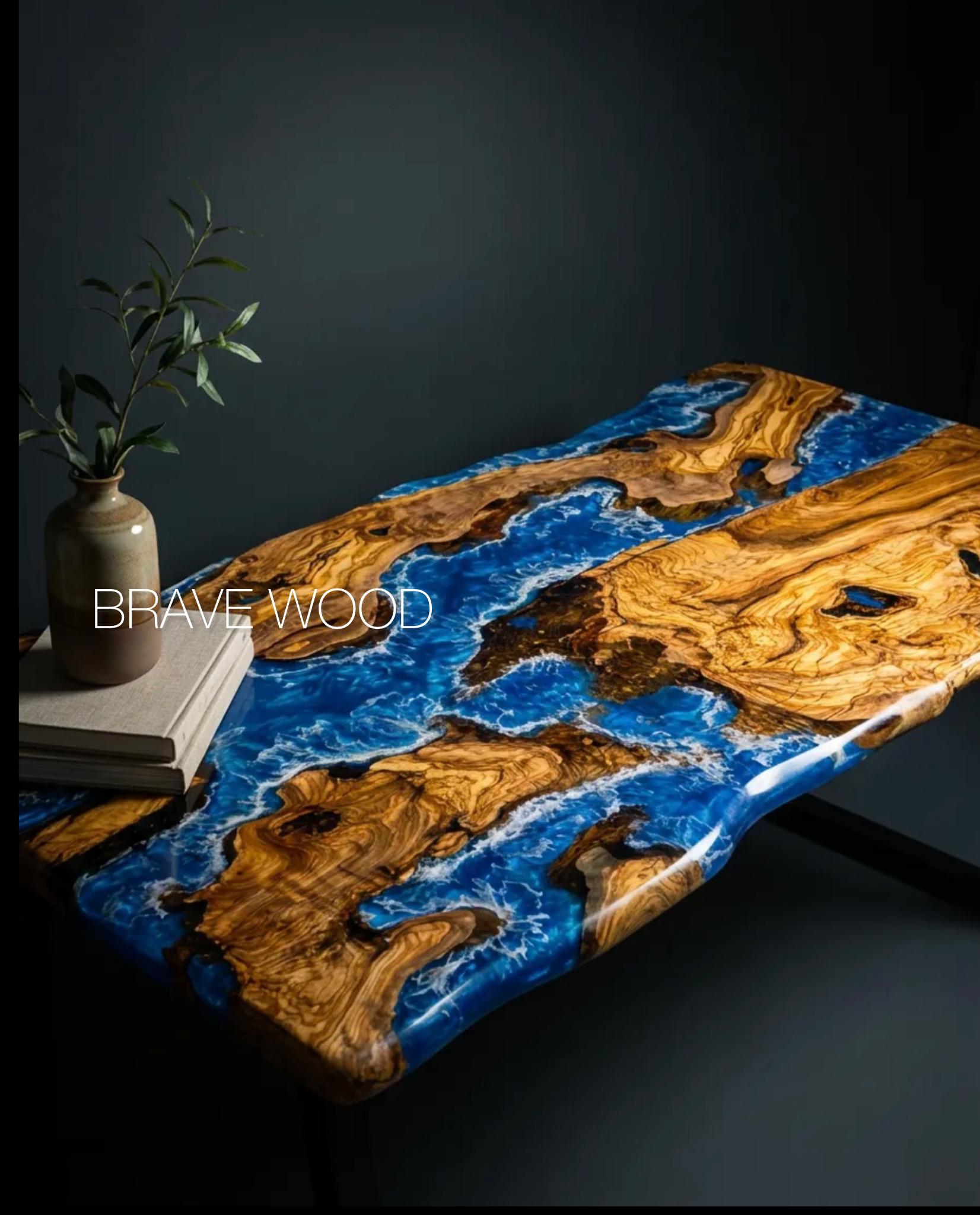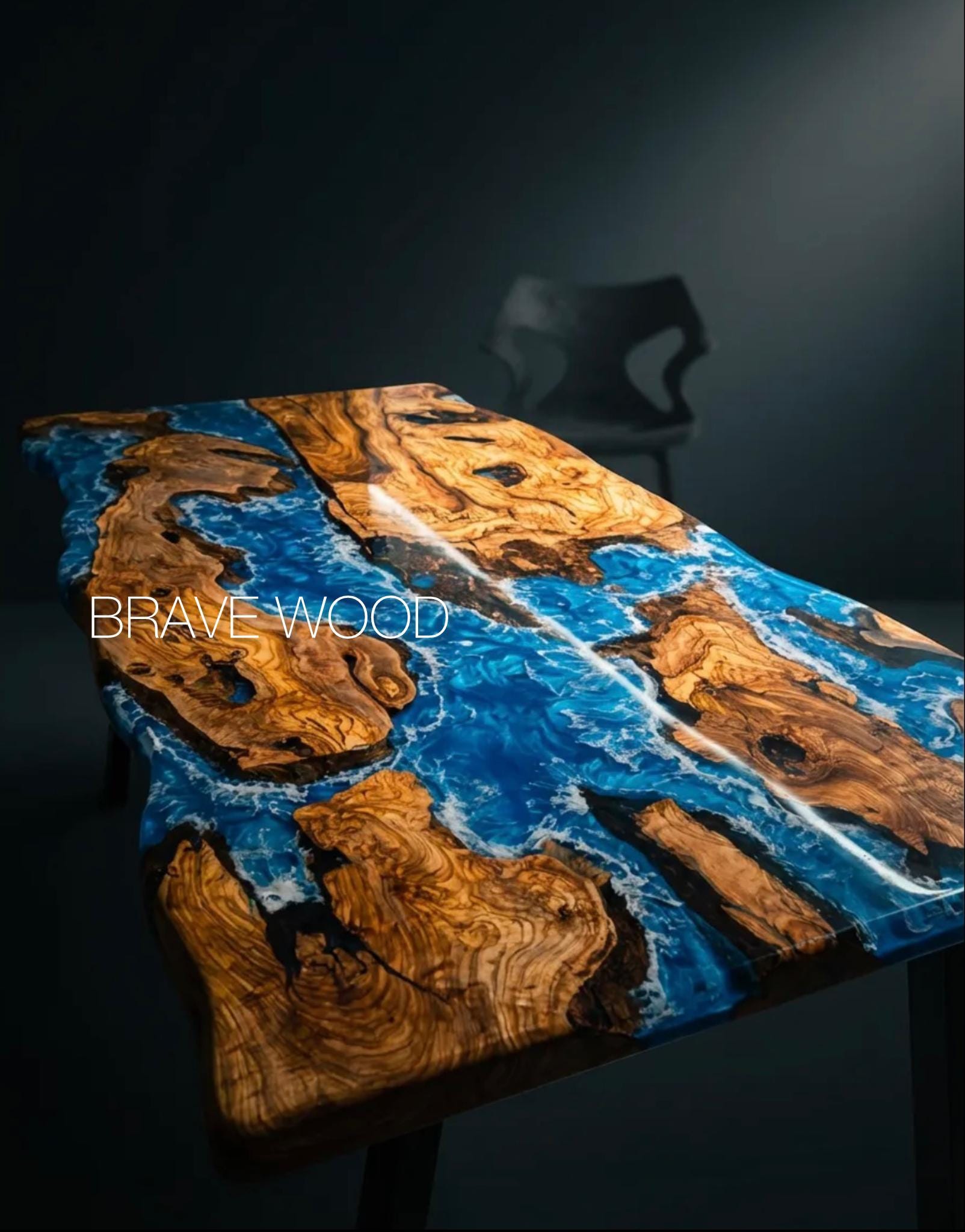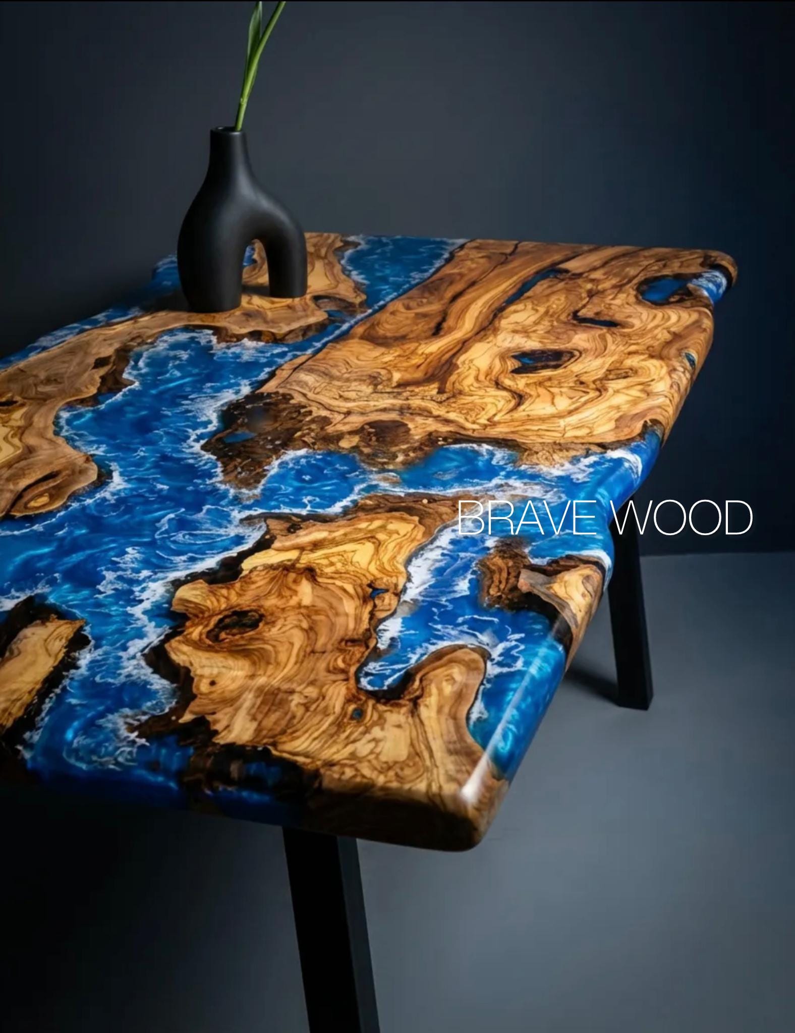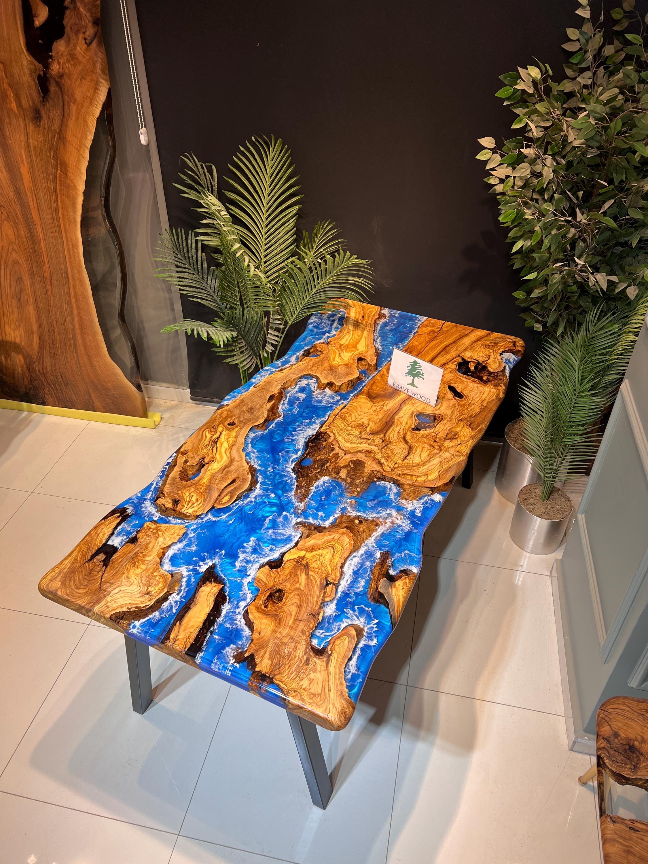 Olive Dining Table for your living room or kitchen. Custom made olive wood dining table with blue or green epoxy like river pattern. Unique, special design with soft edges and handmade production just for you, your home and your kitchen.
