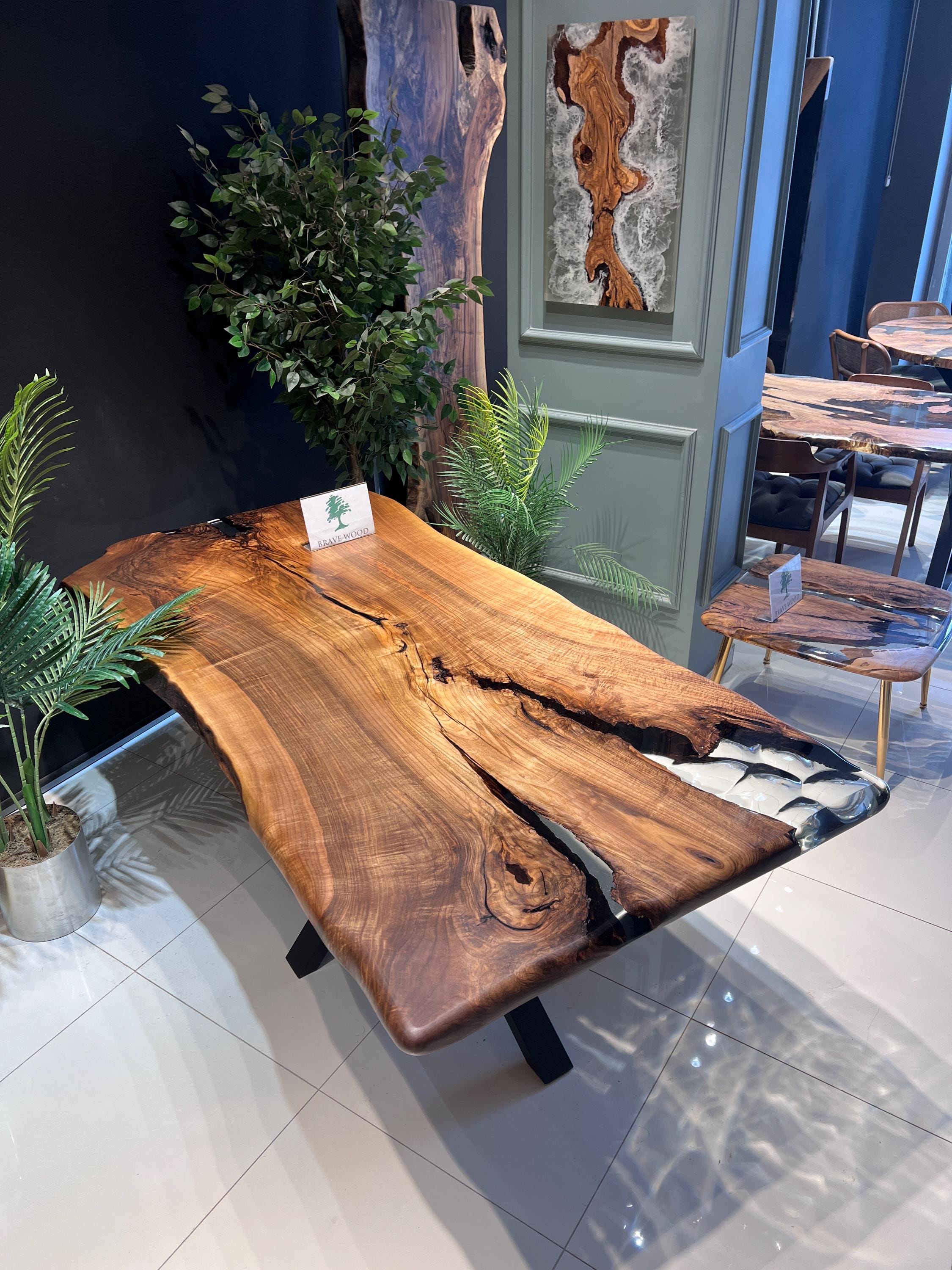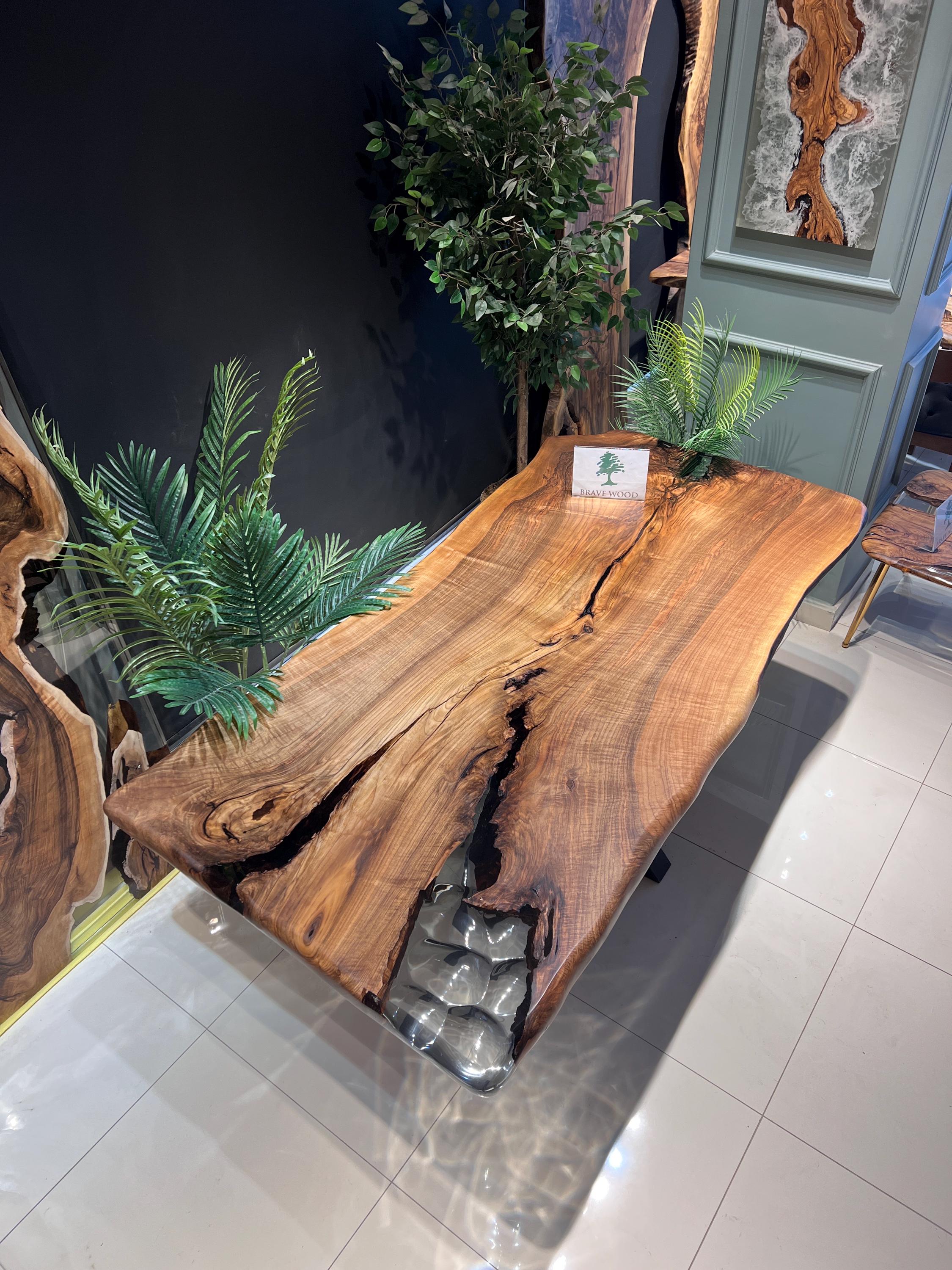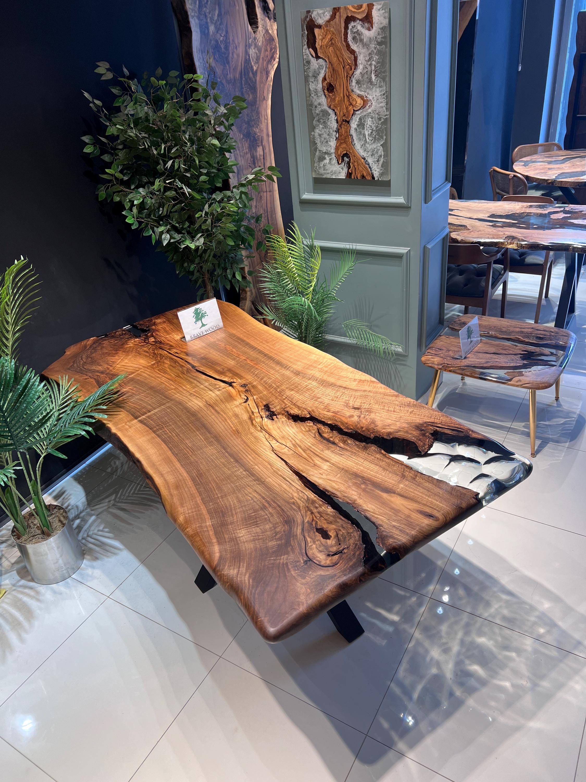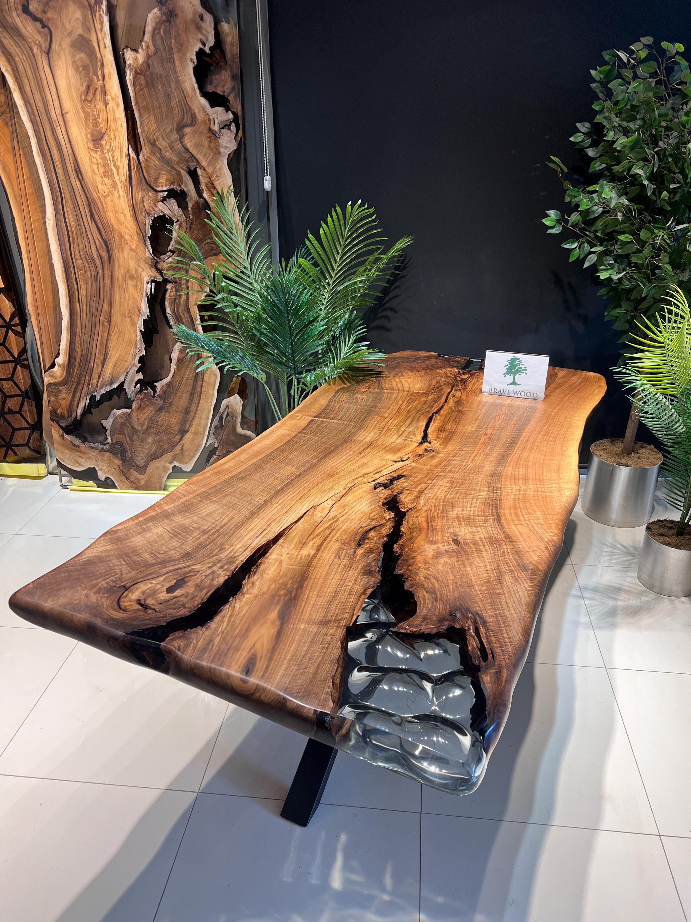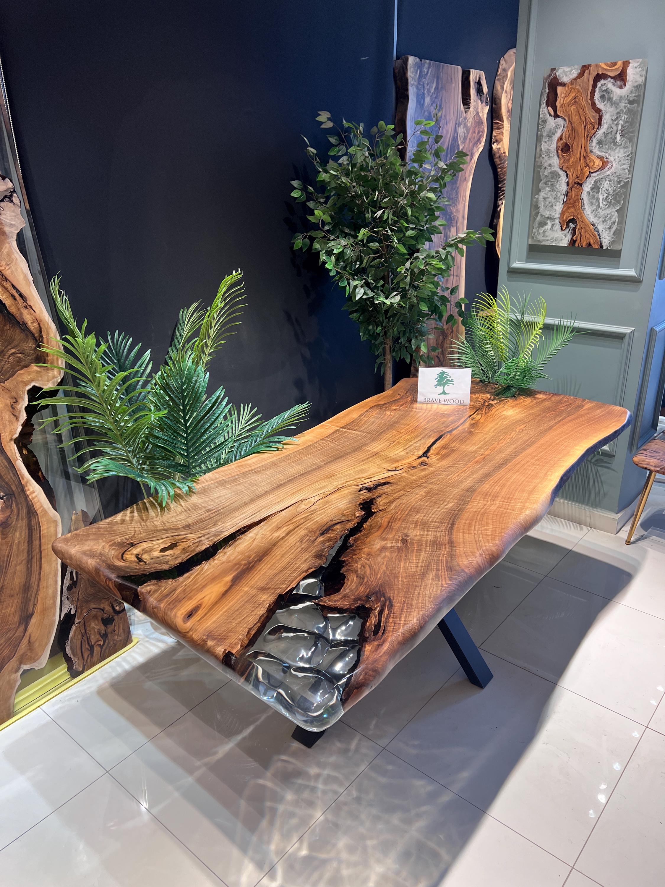 It is a special dark patterned walnut tree. It has been designed by preserving the natural appearance with a transparent epoxy around it.