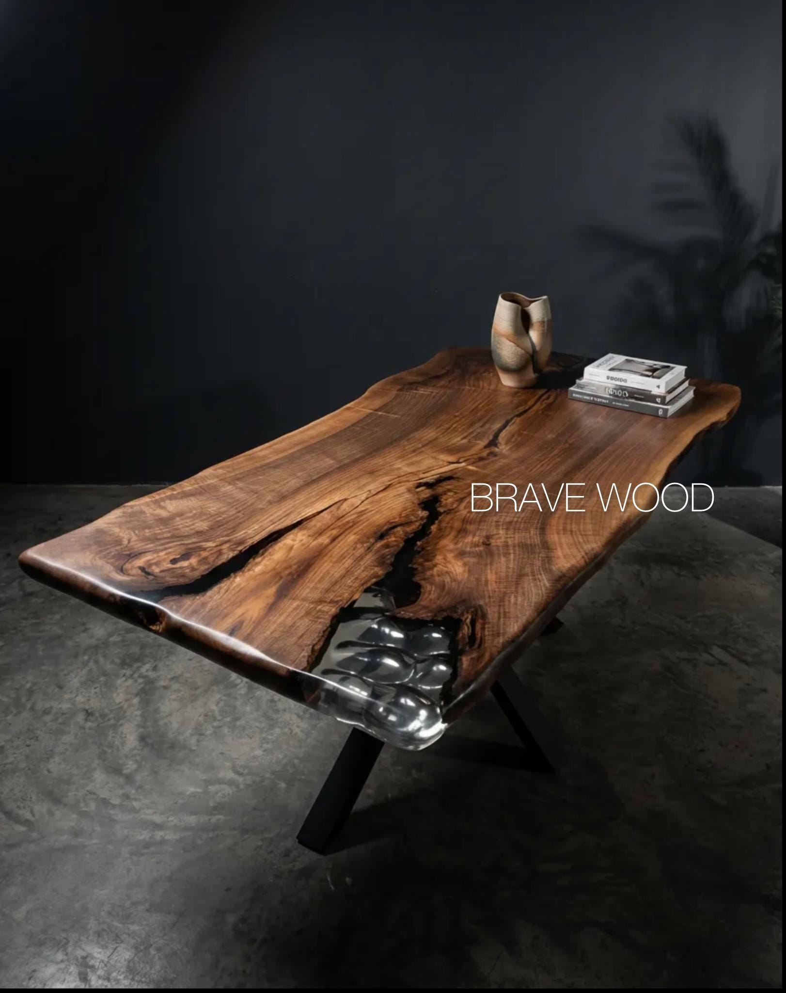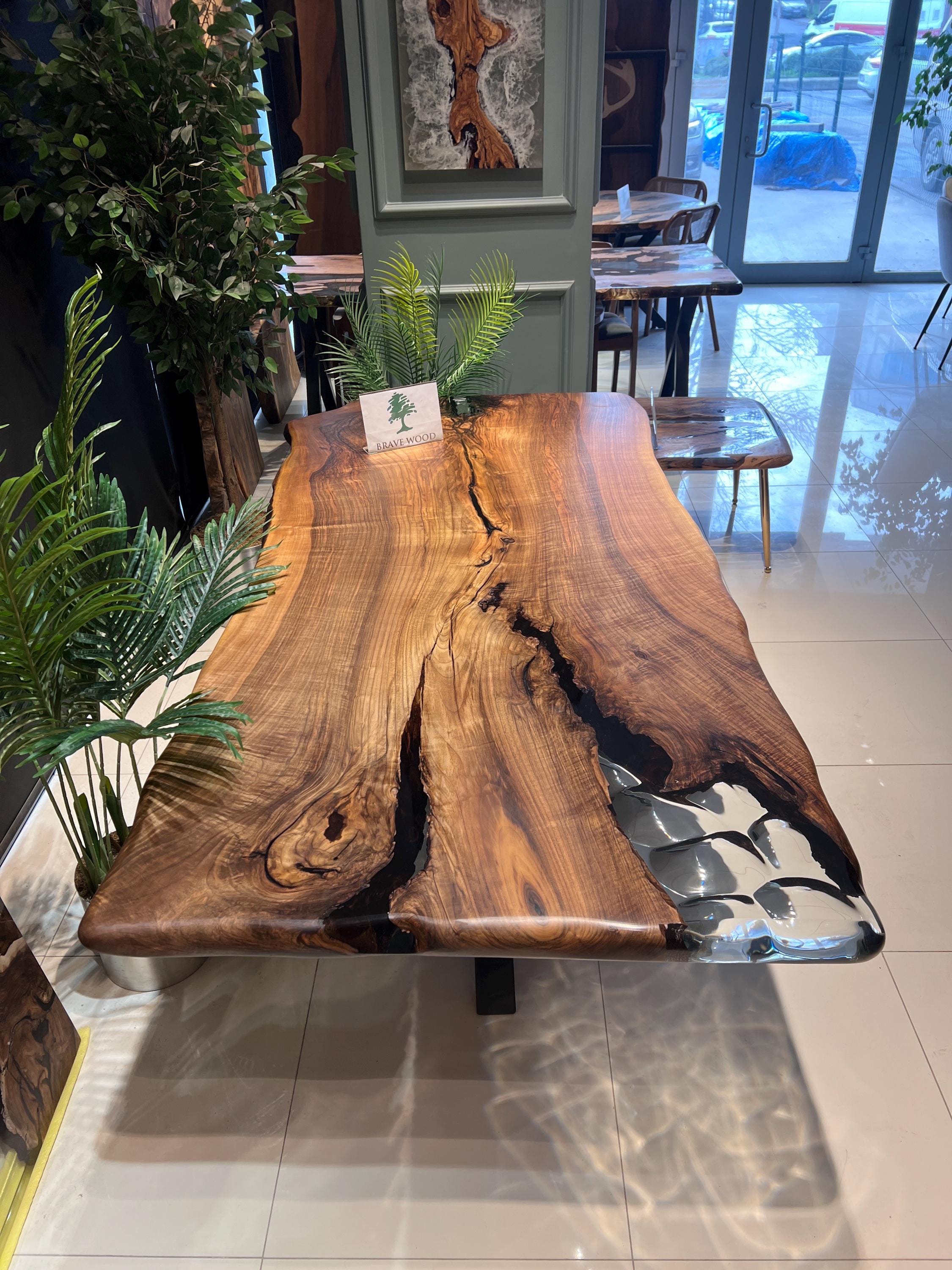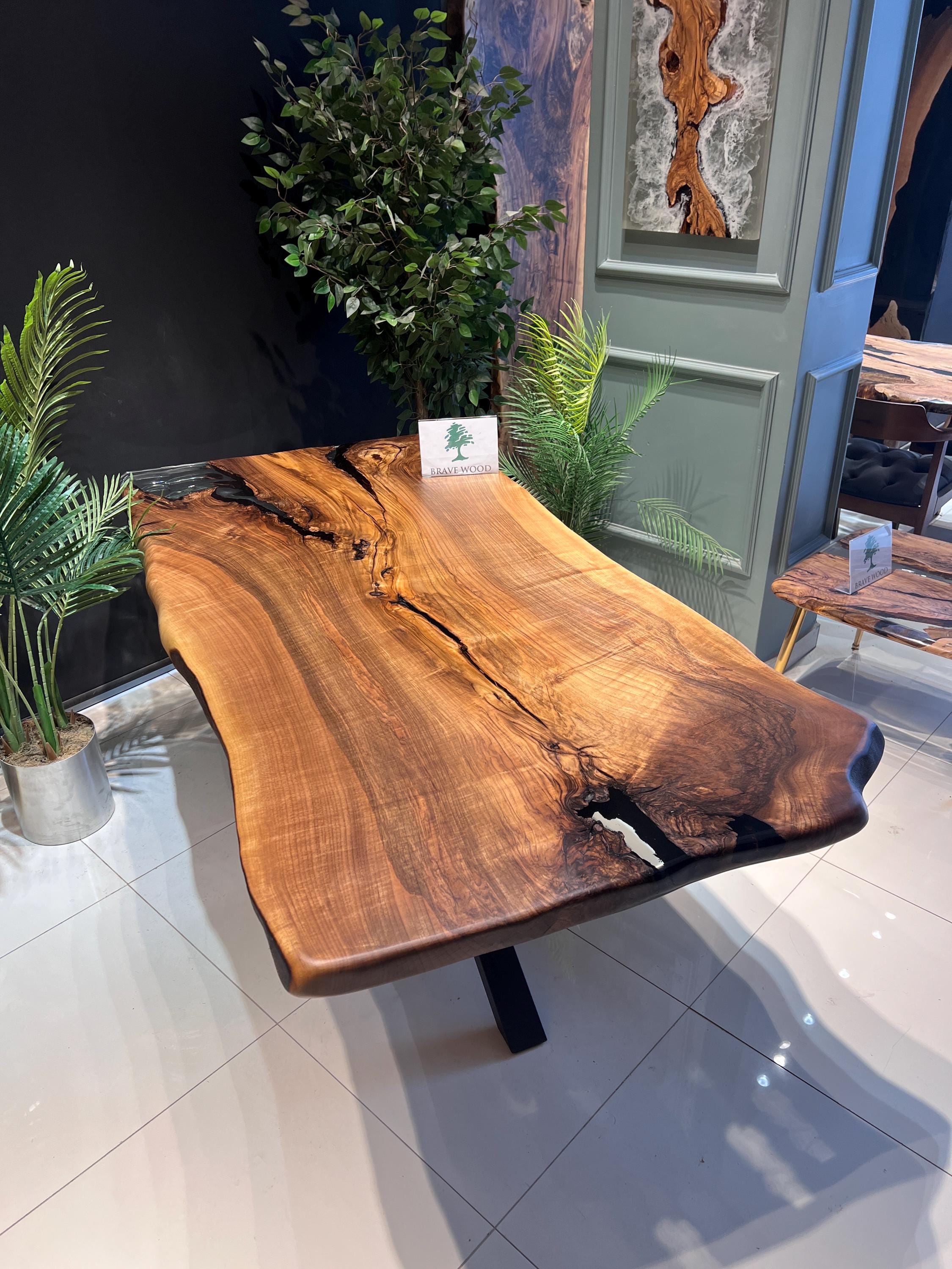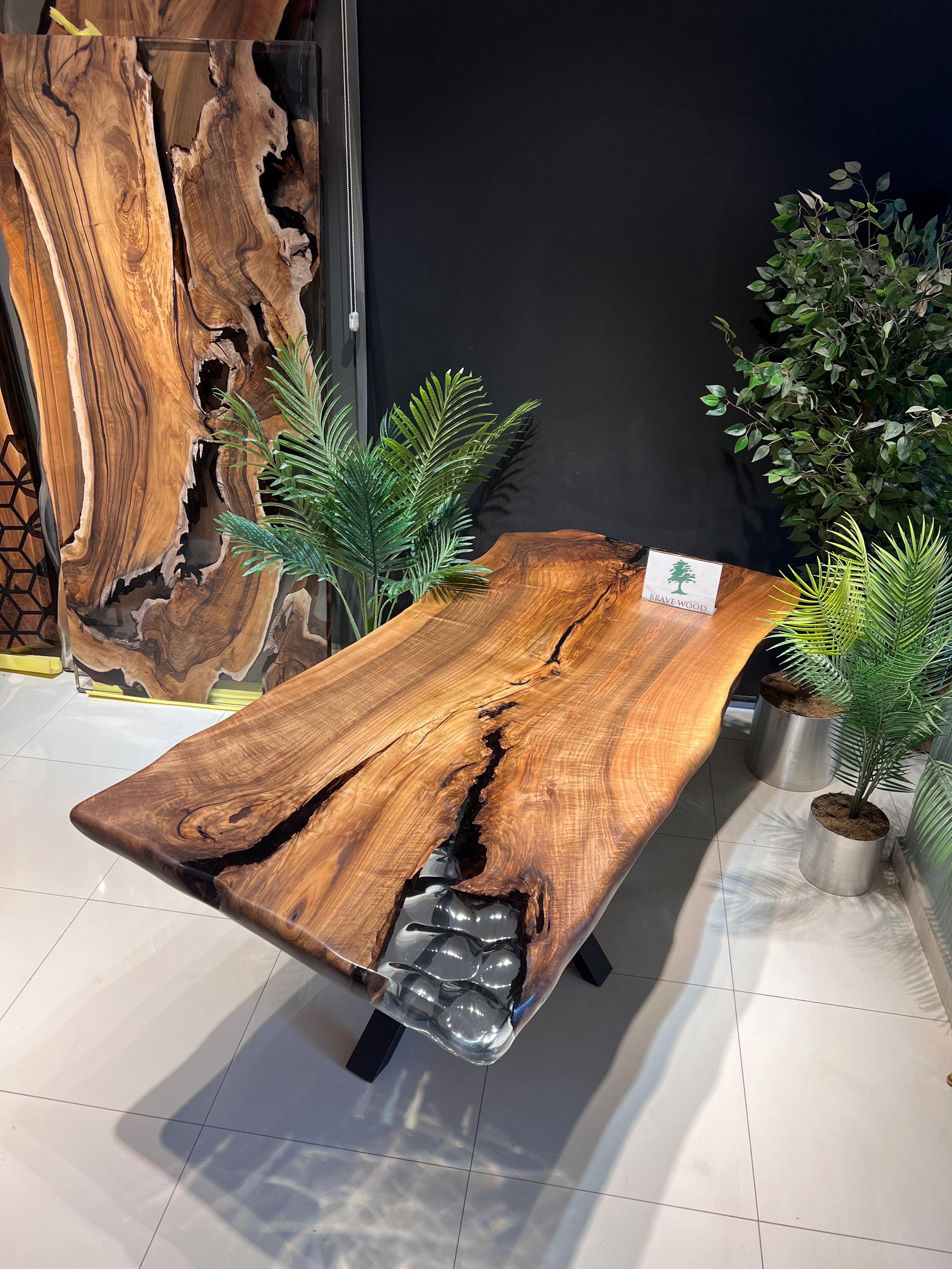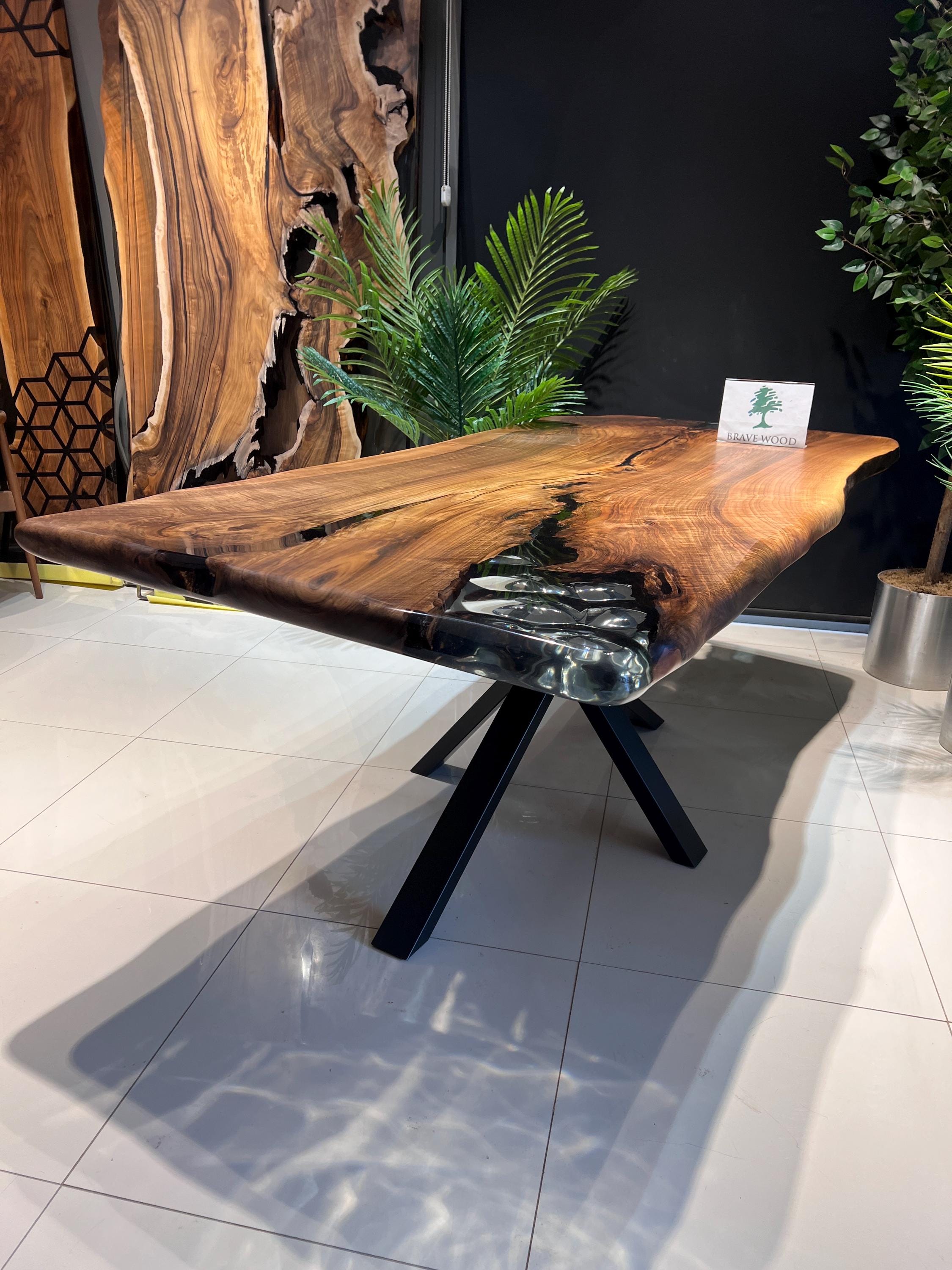 It is a special dark patterned walnut tree. It has been designed by preserving the natural appearance with a transparent epoxy around it.
