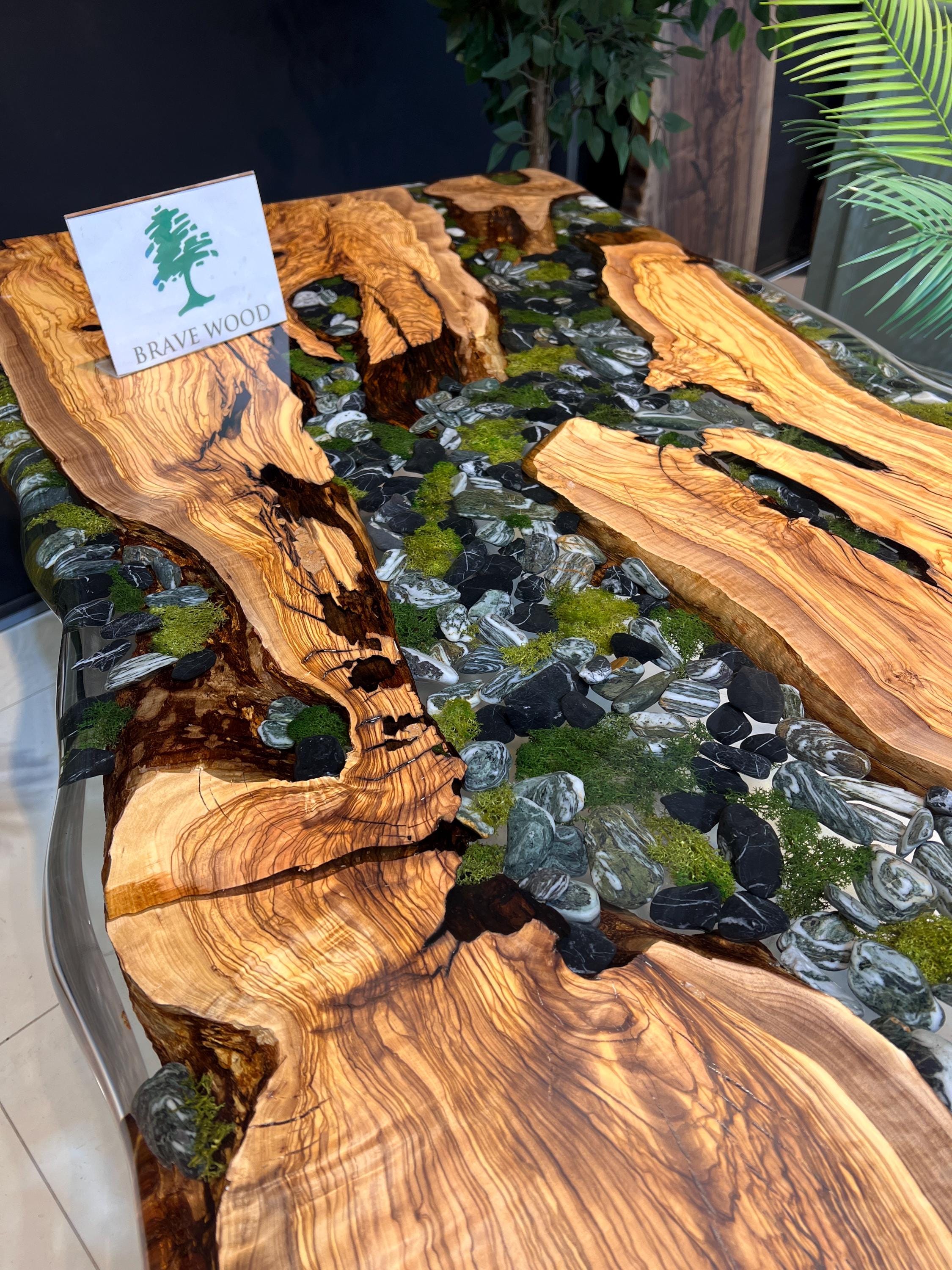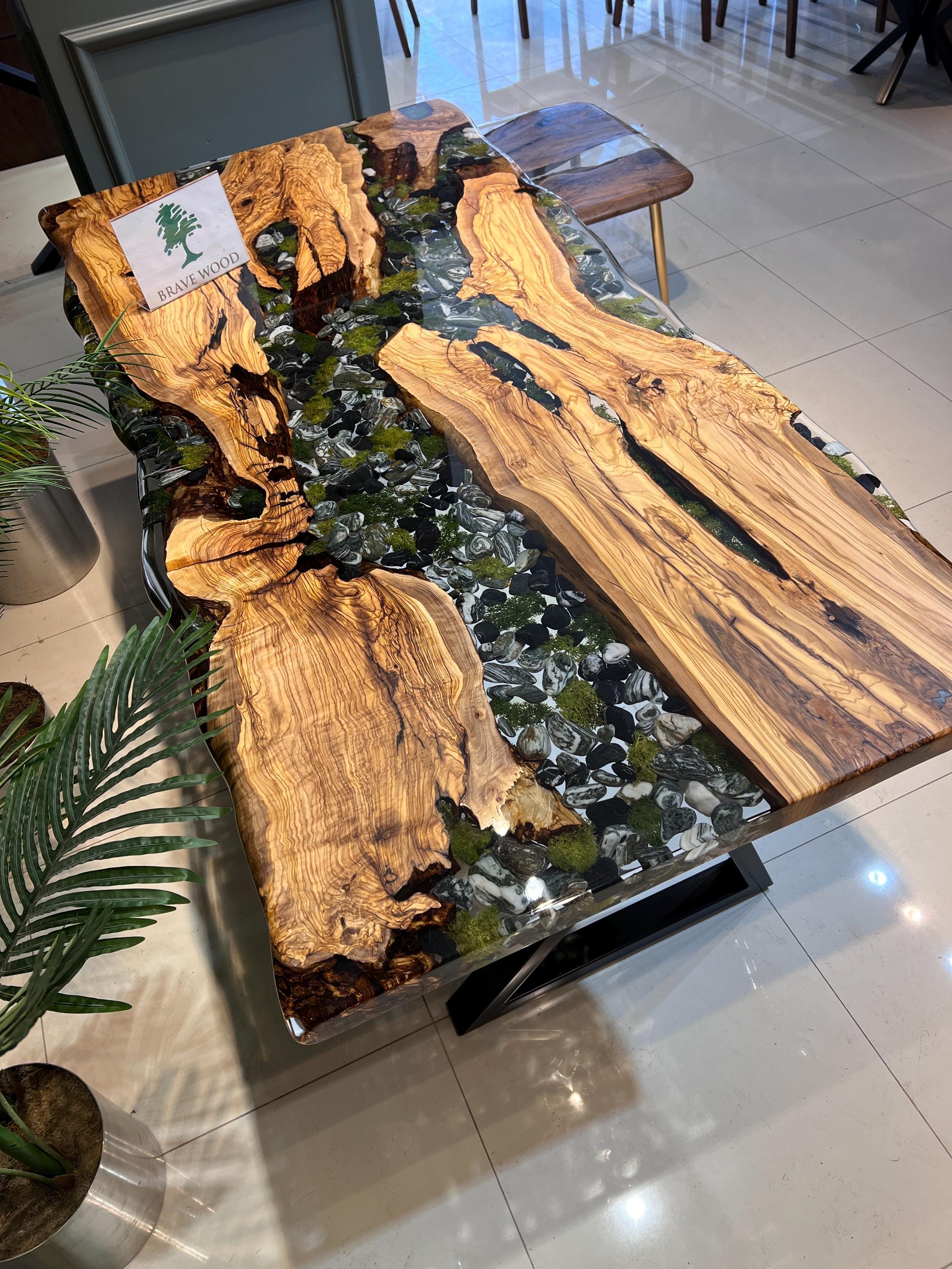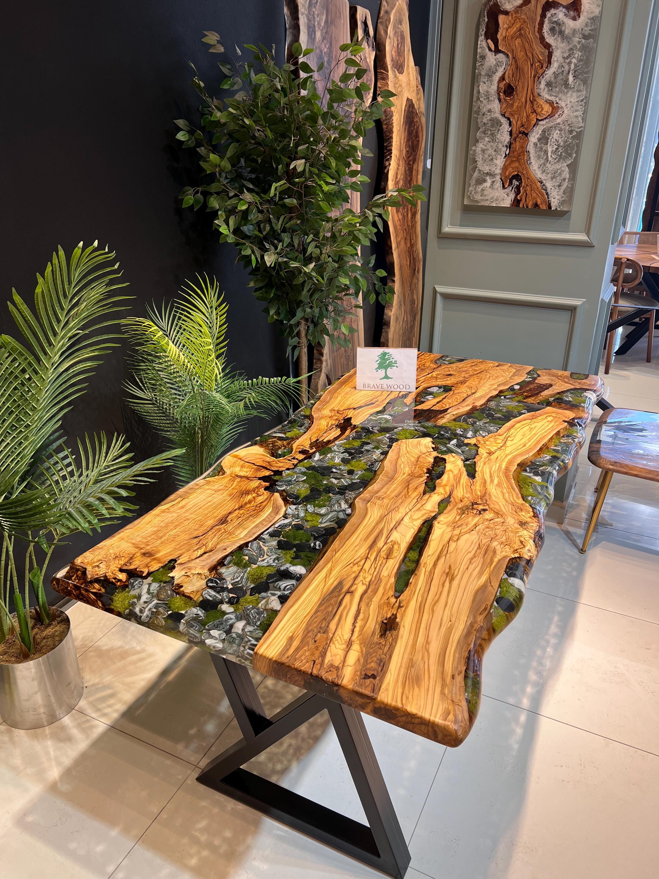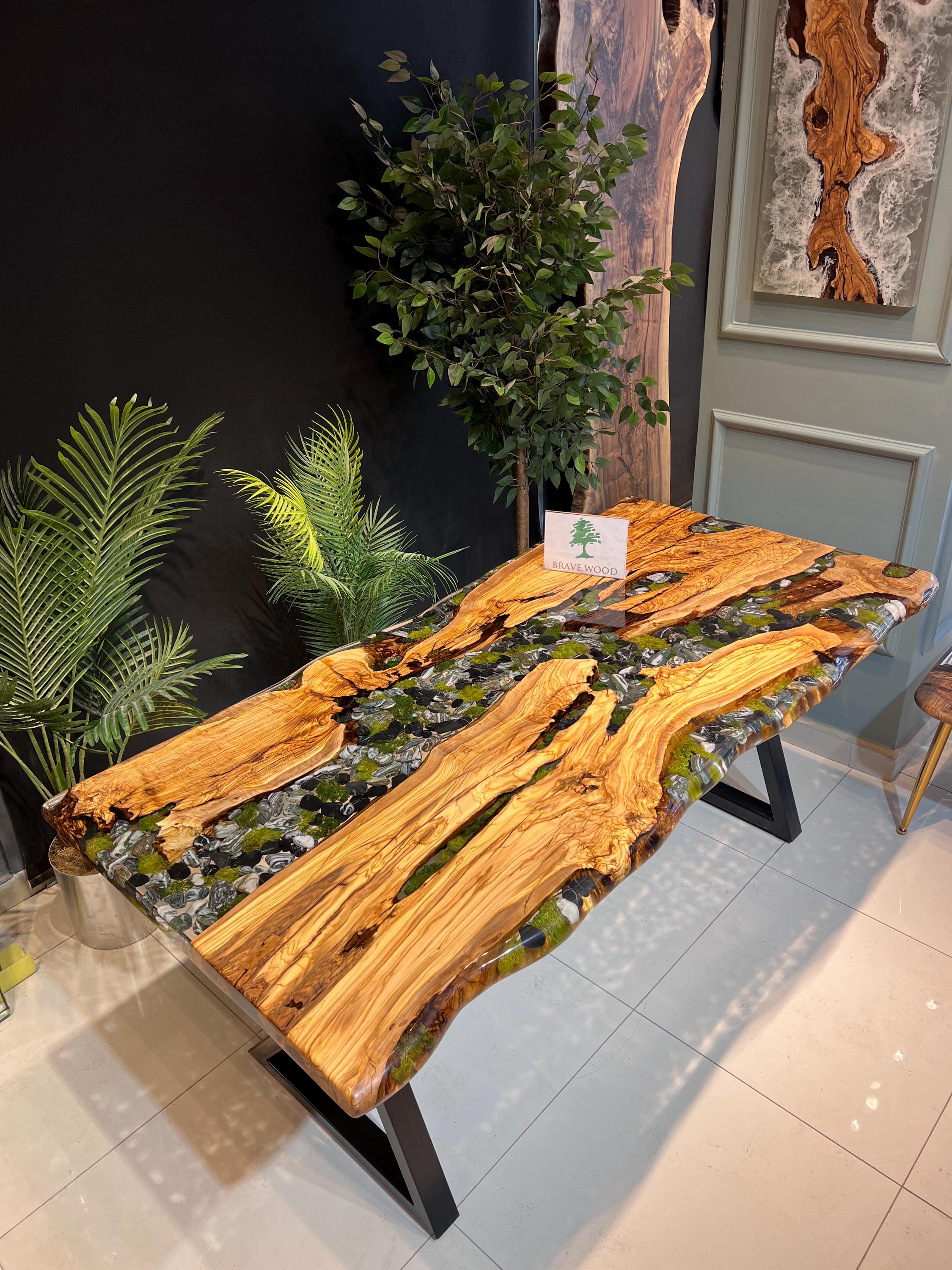 Stone epoxy table, Our custom-designed stone and moss-covered olive wood table