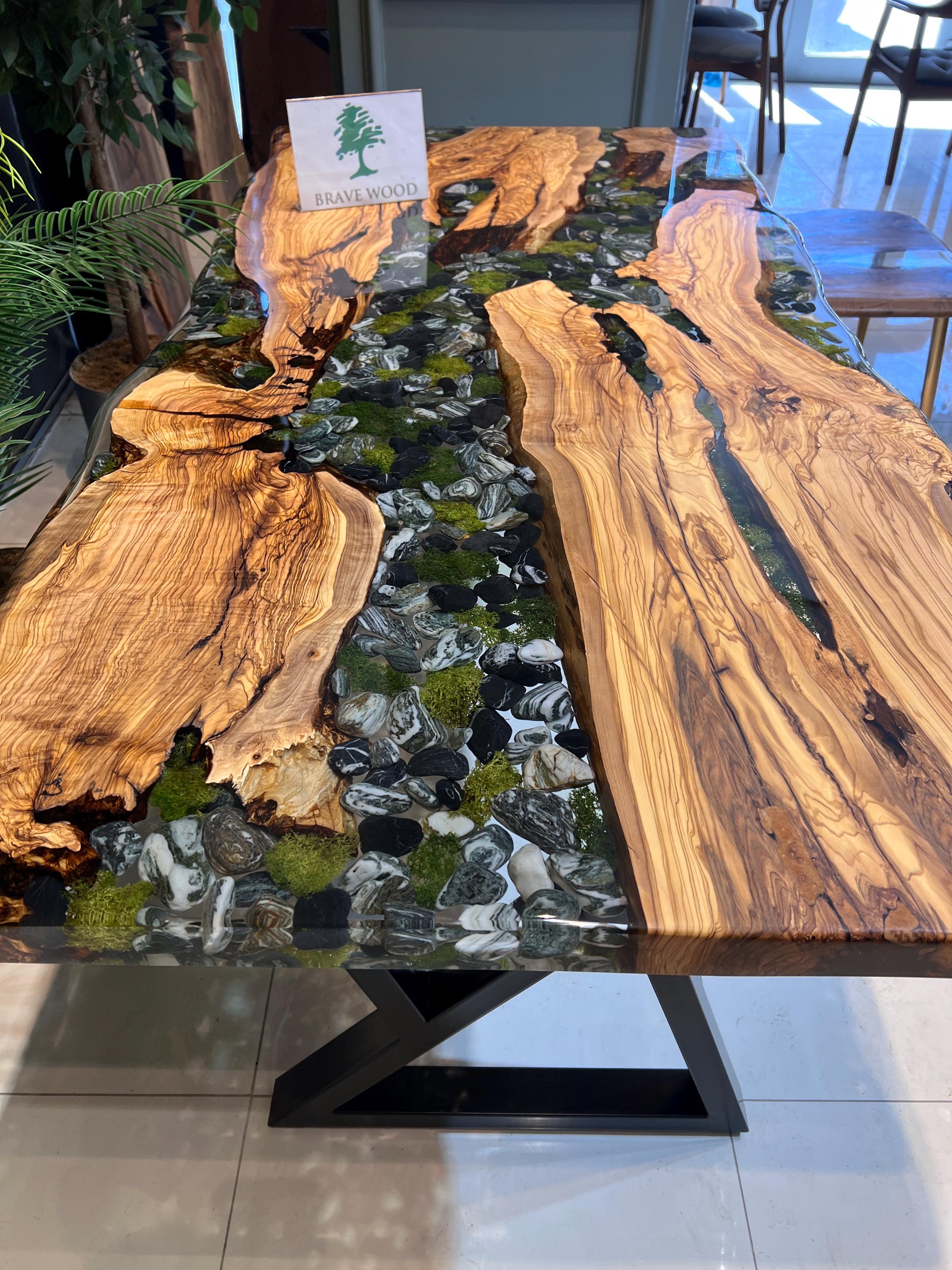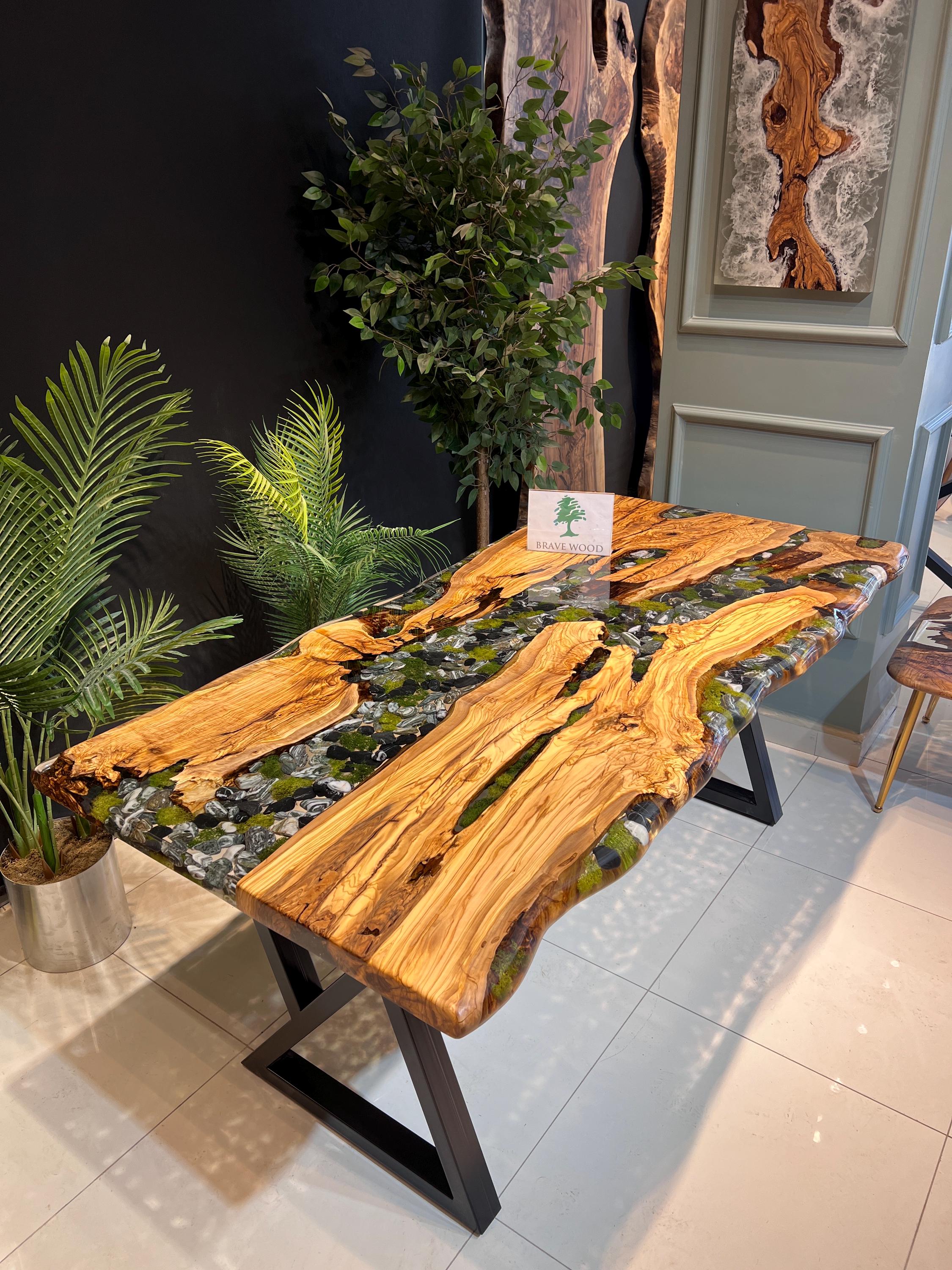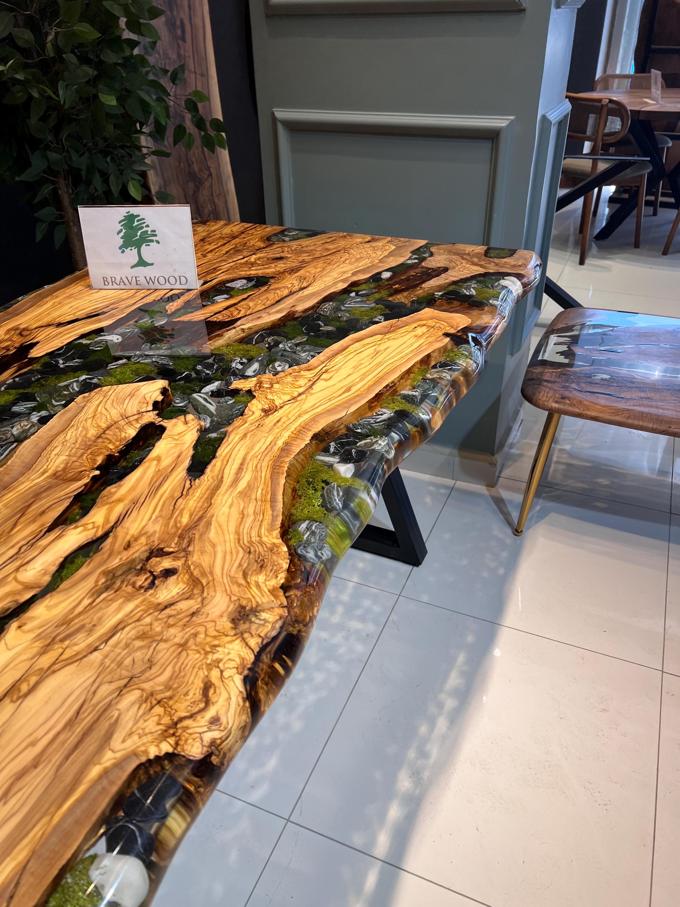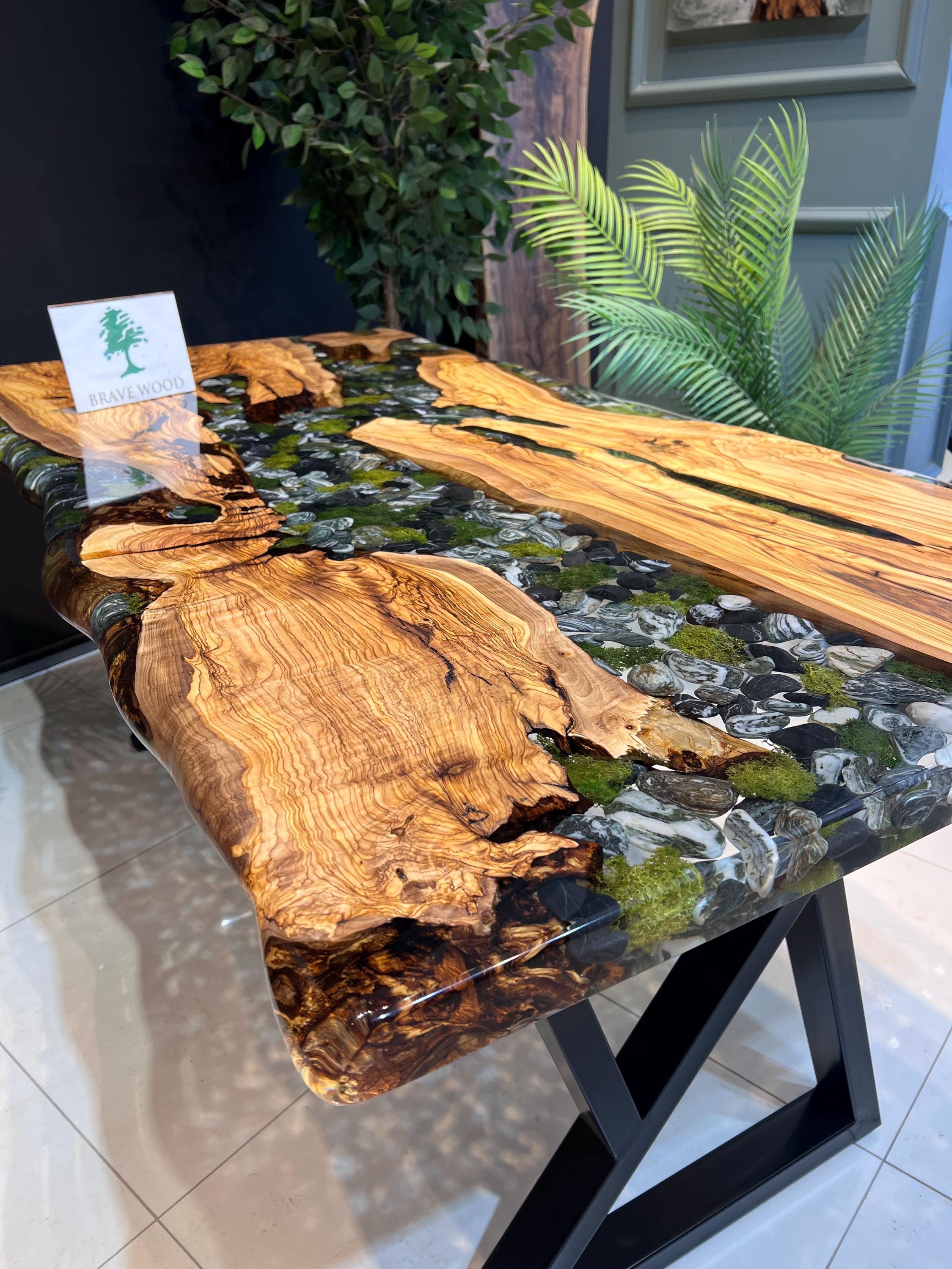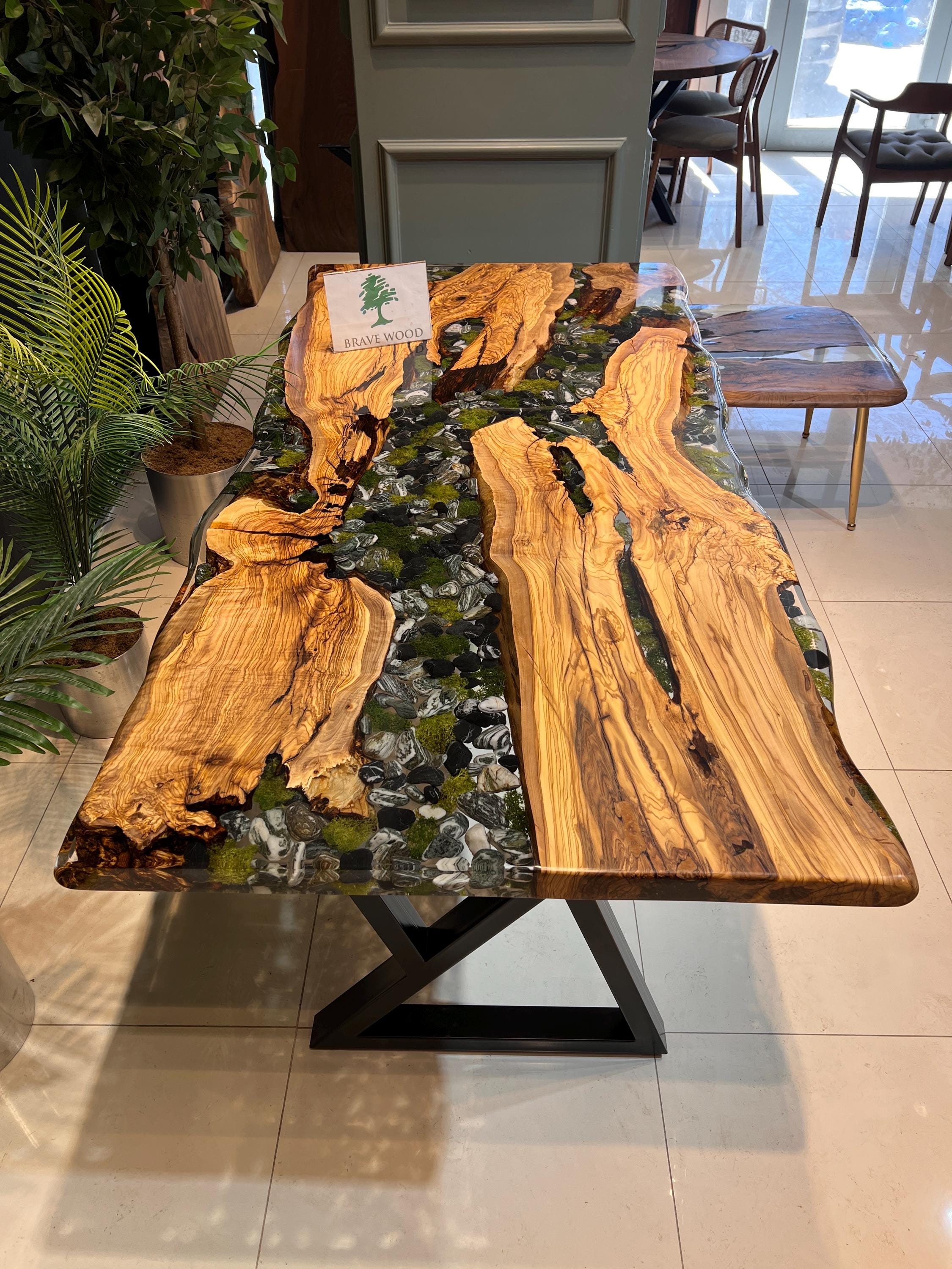 Stone epoxy table, Our custom-designed stone and moss-covered olive wood table