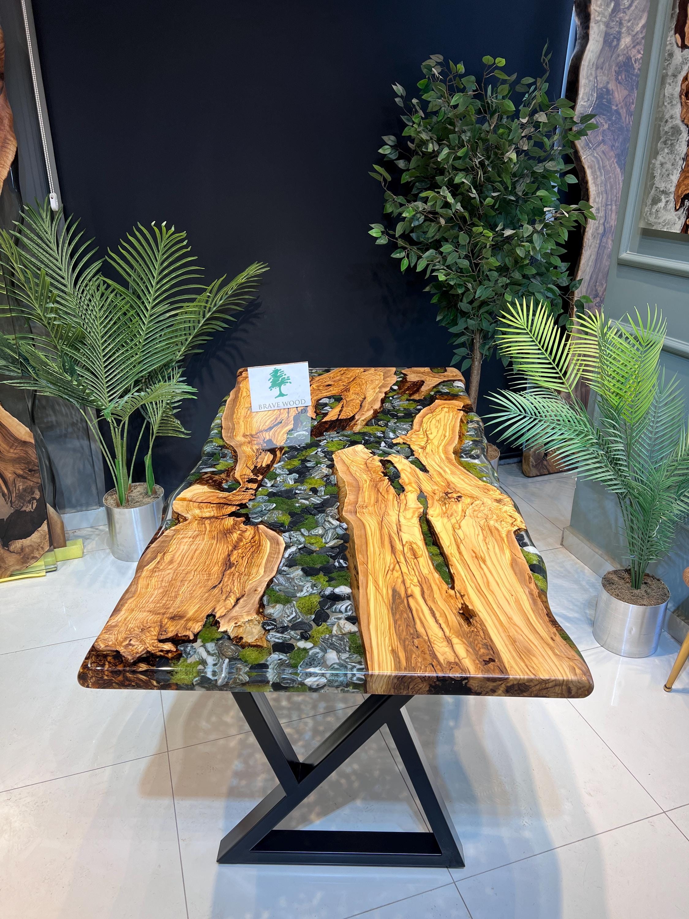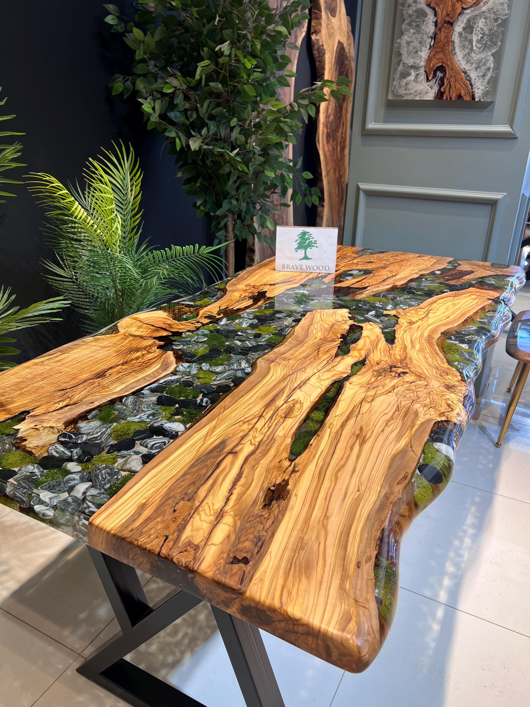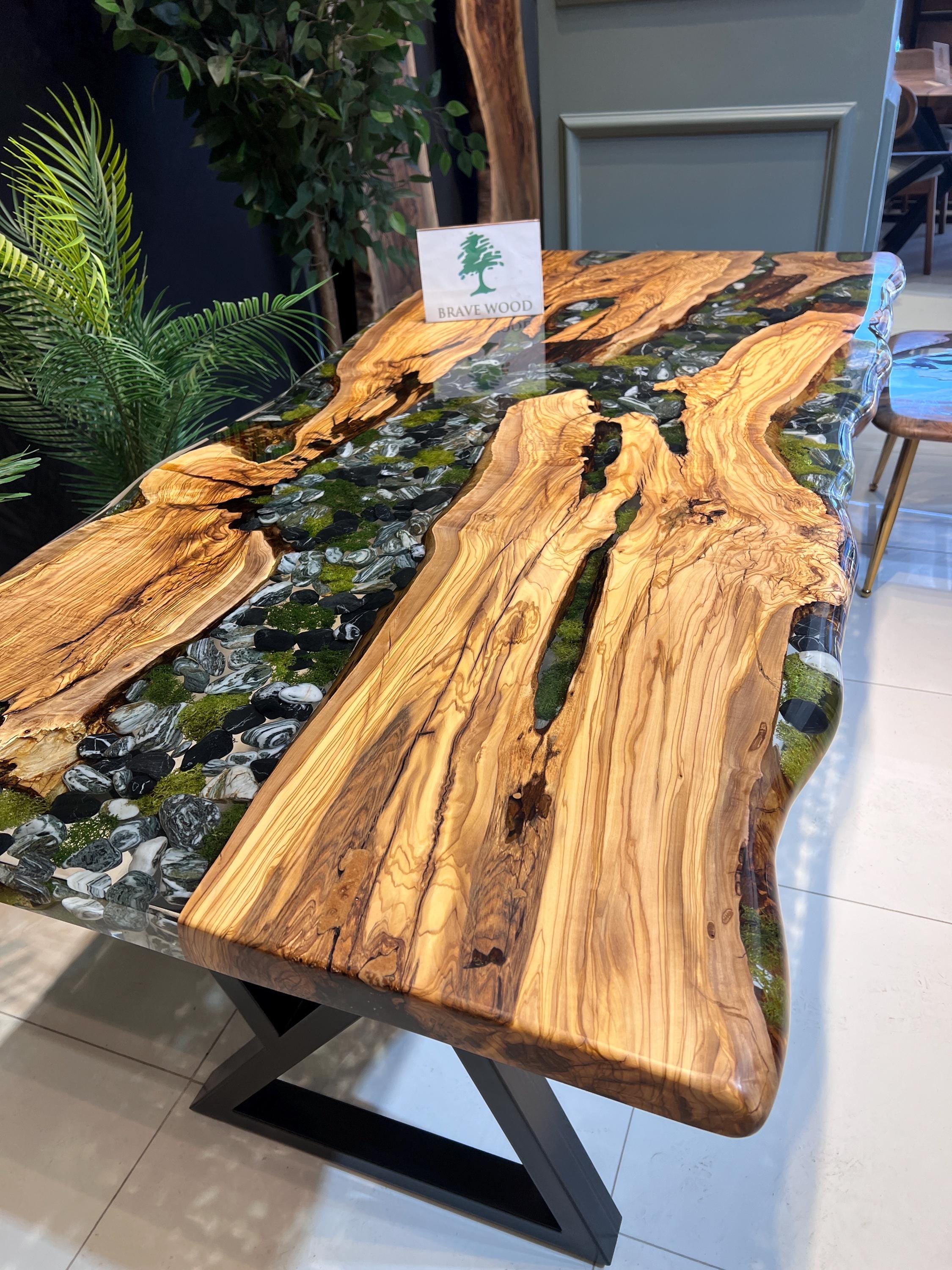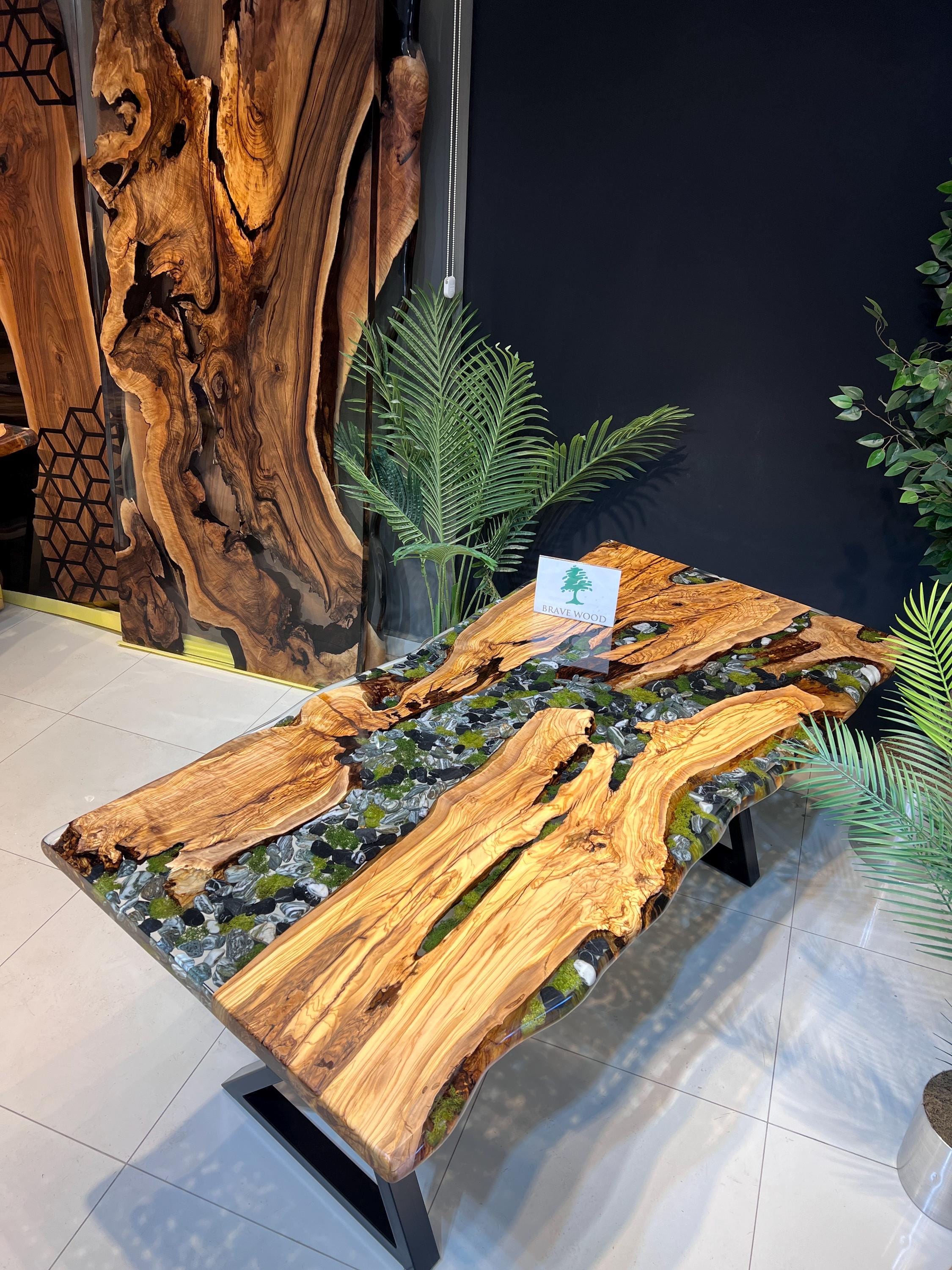 Stone epoxy table, Our custom-designed stone and moss-covered olive wood table