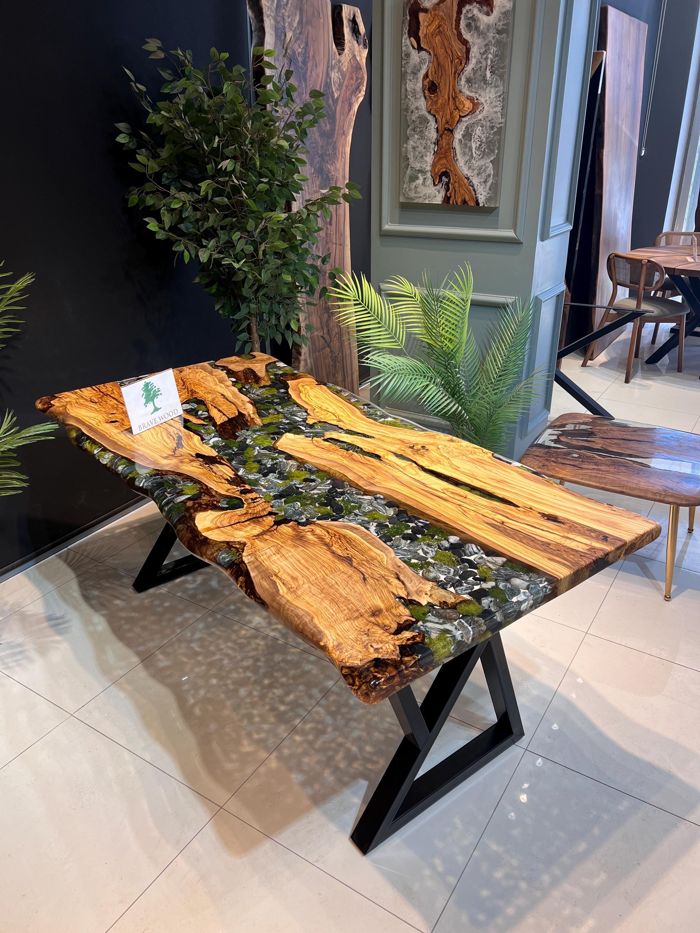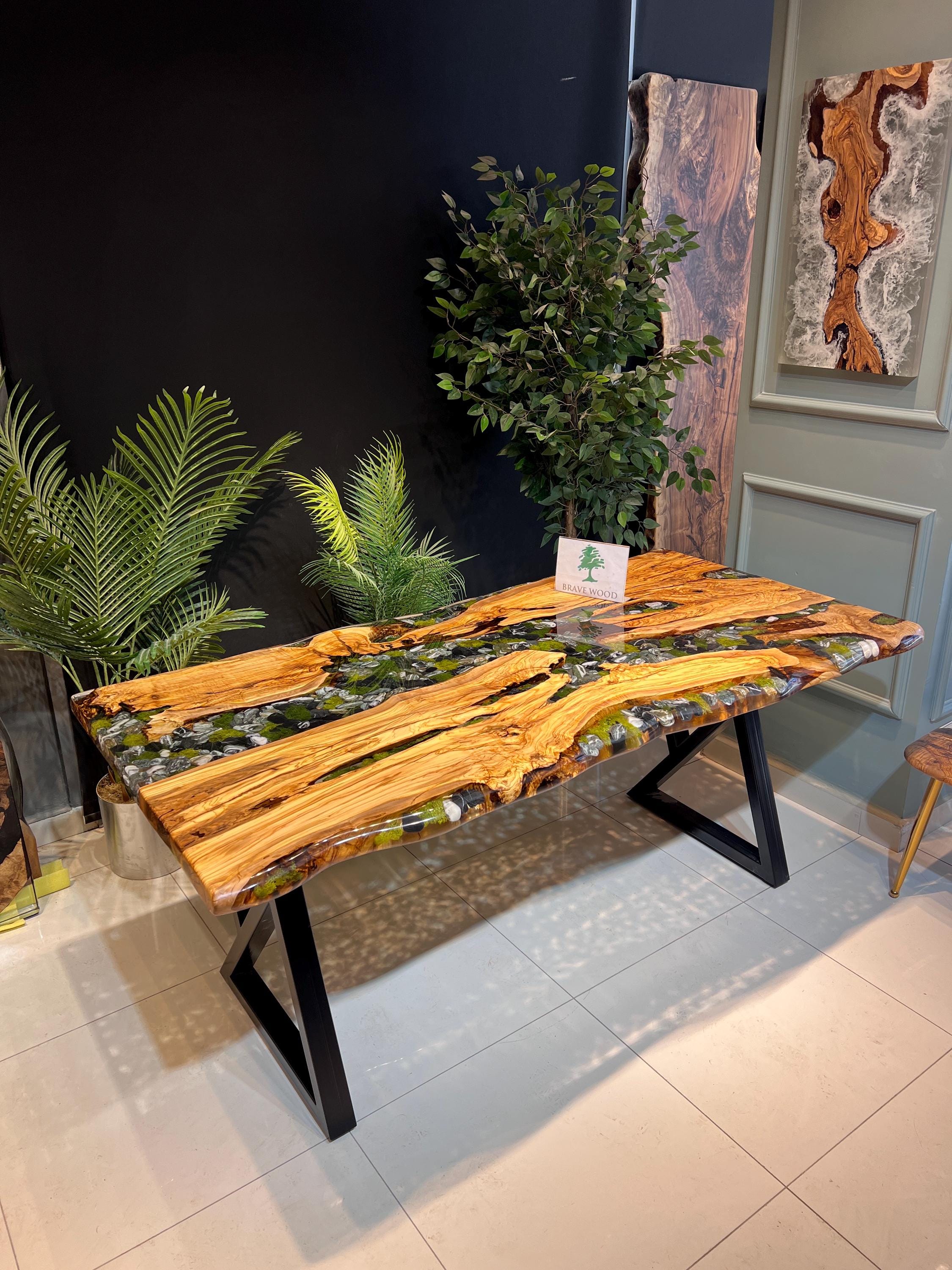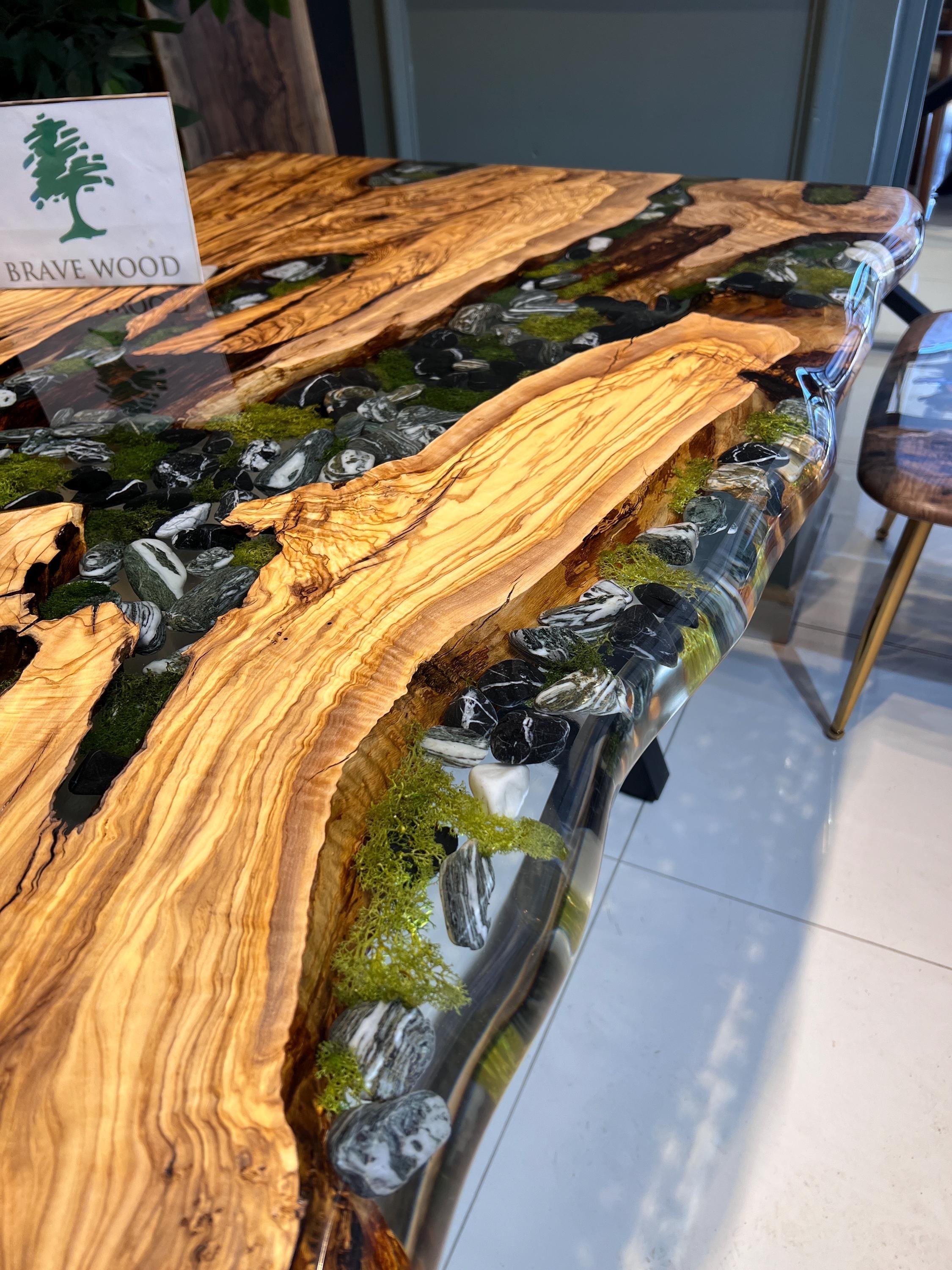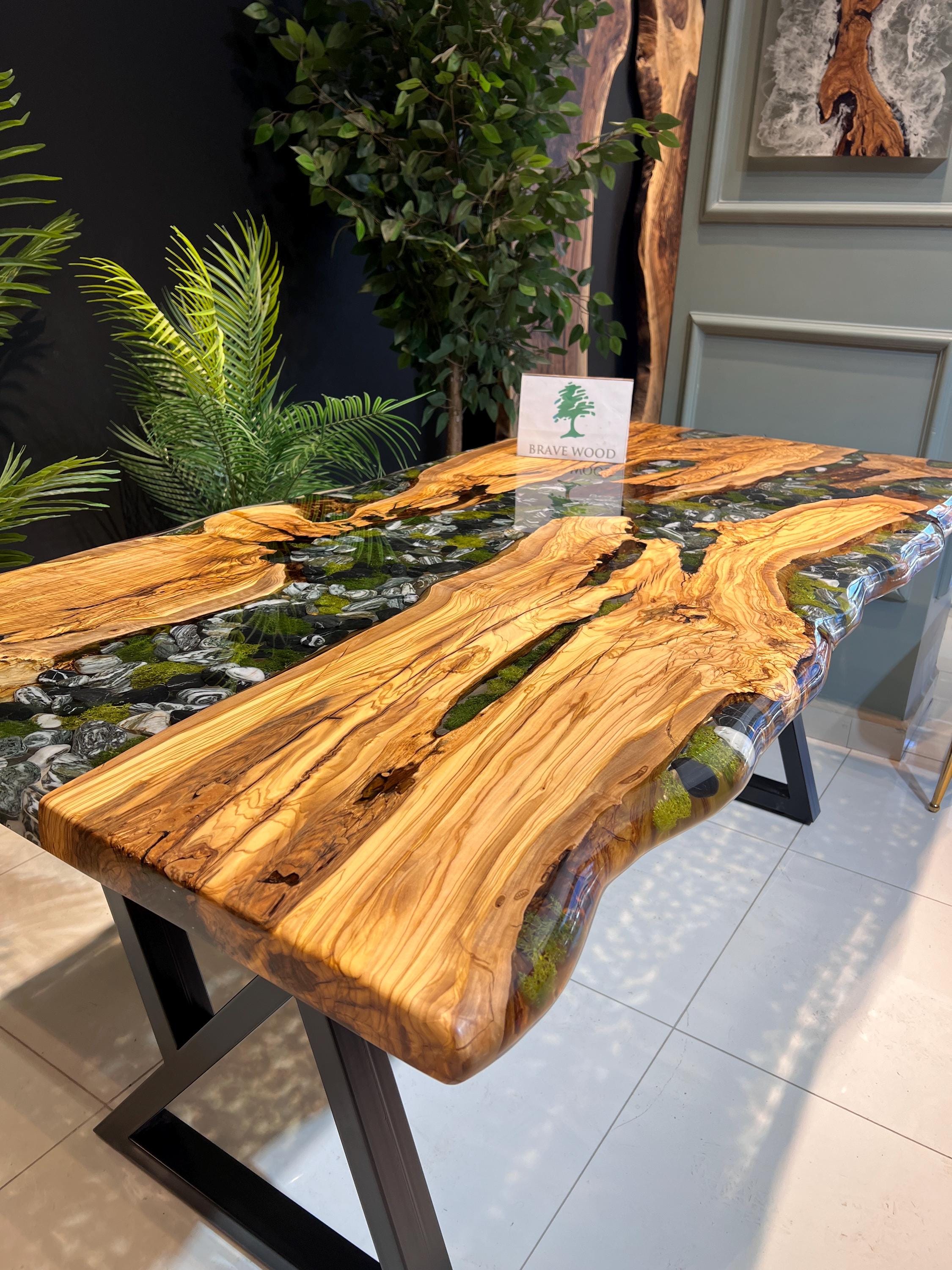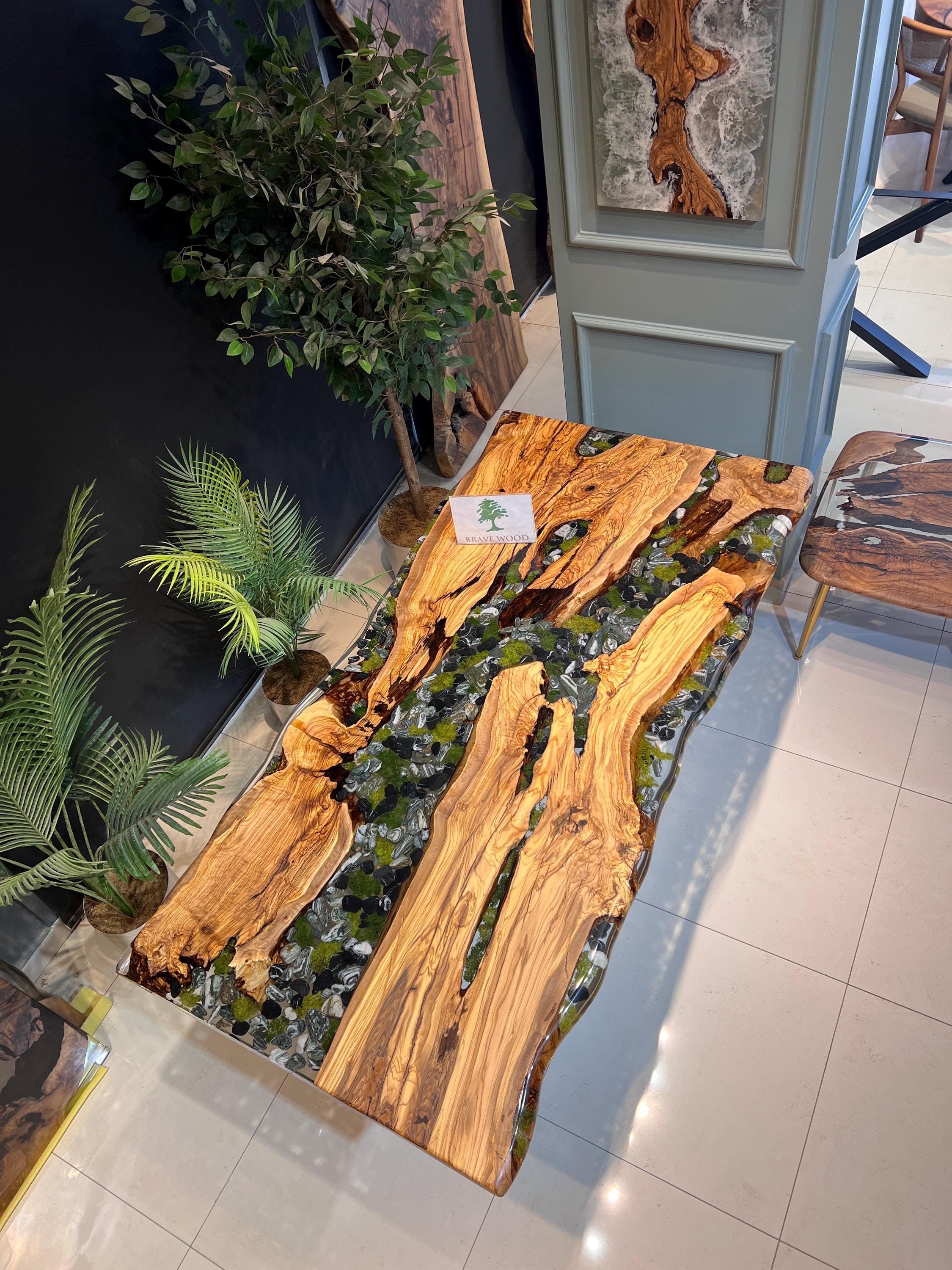 Stone epoxy table, Our custom-designed stone and moss-covered olive wood table