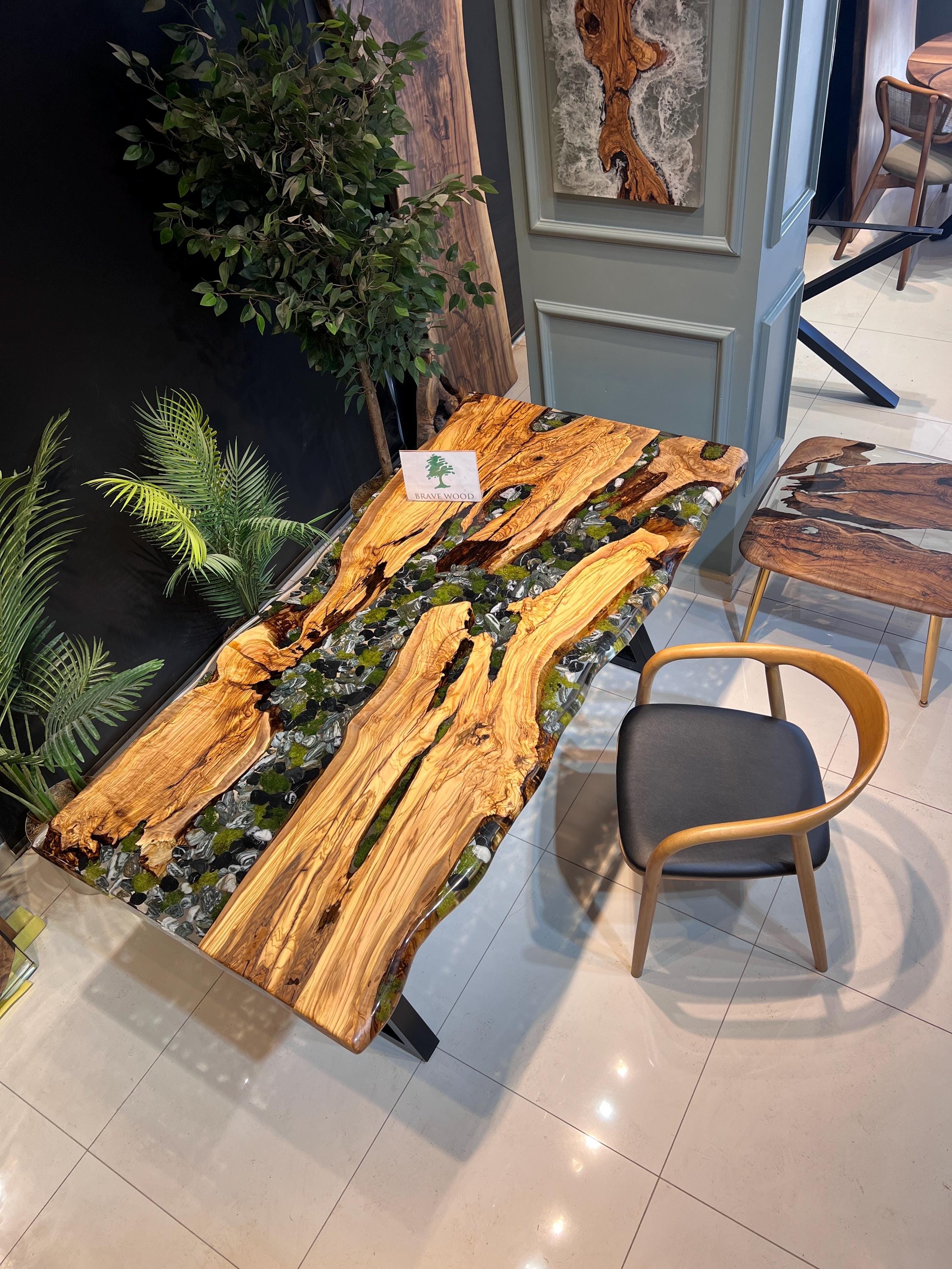 Olive Dining Table for your living room or kitchen. Custom made olive wood dining table with clear epoxy like river pattern. Unique, special design with soft edges and handmade production just for you, your home and your kitchen.